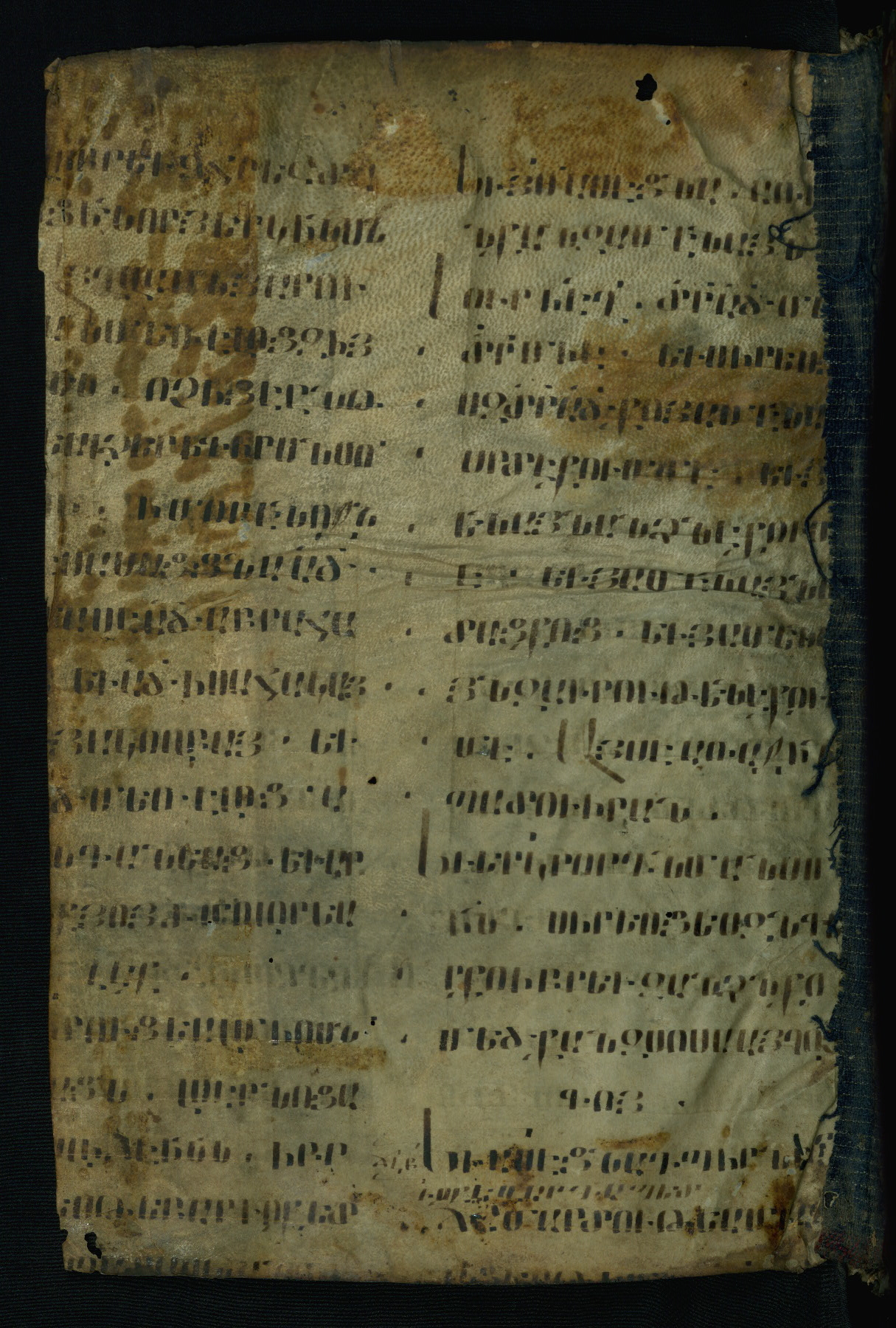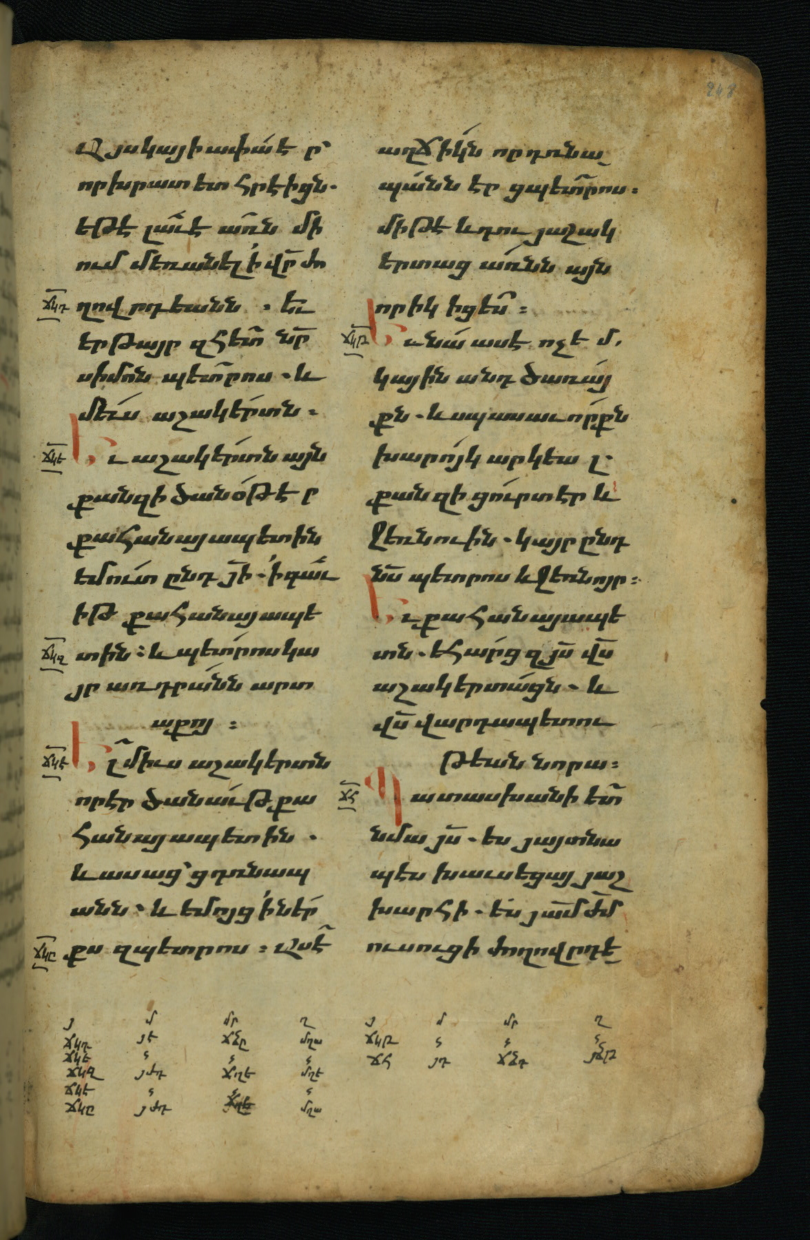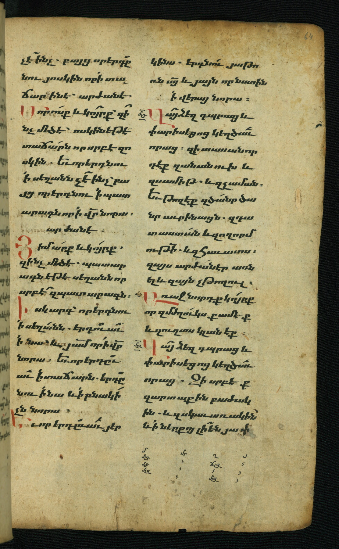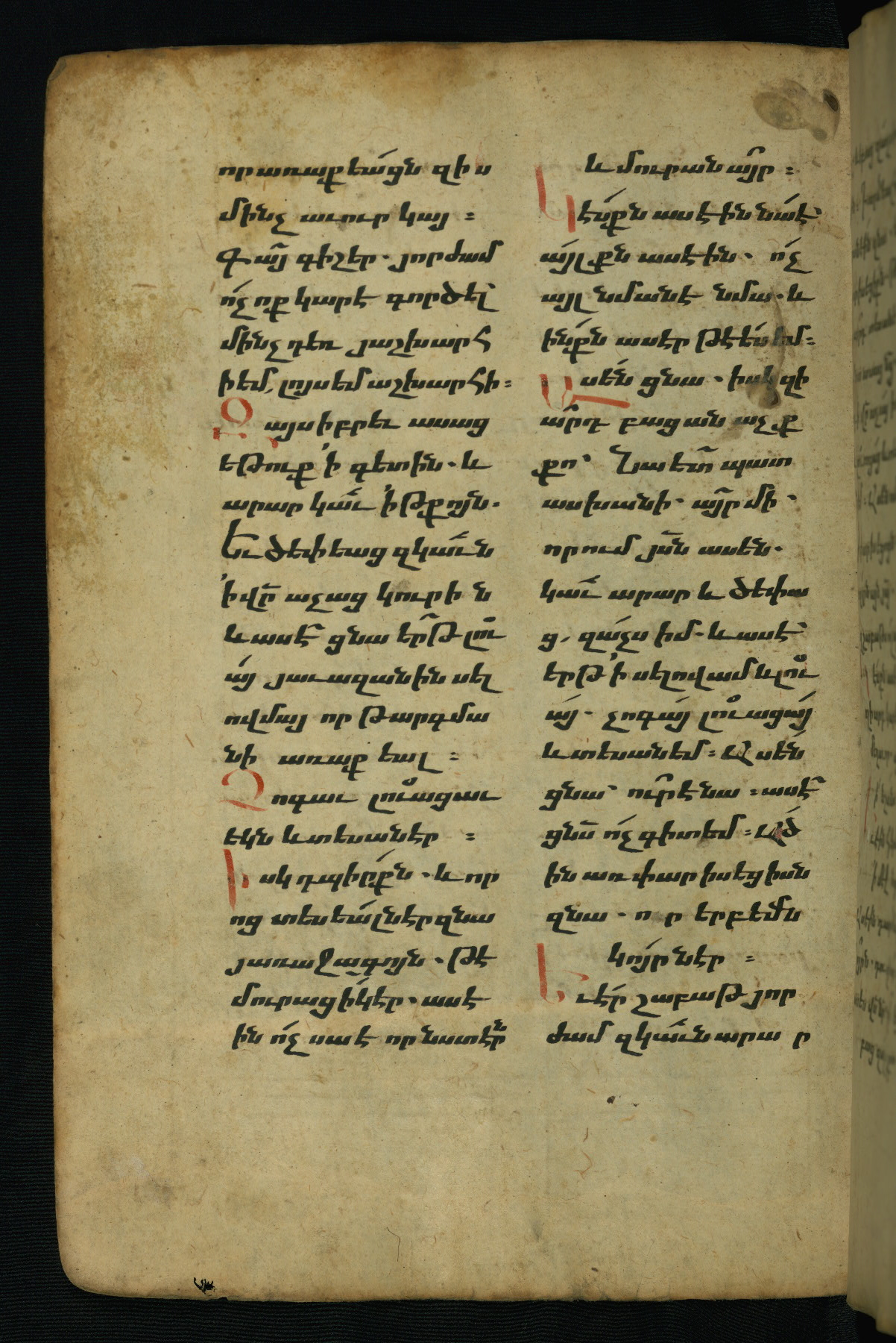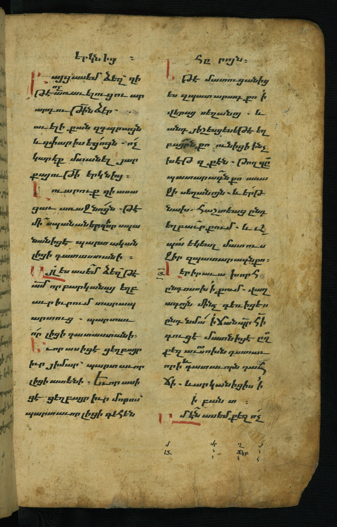 This manuscript was executed in 1475 CE by a scribe identified as Aristakes for a priest named Hakob. It contains a series of sixteen images on the life of Christ preceding the text of the Gospels, as well as the traditional Evangelist portraits, and there are marginal illustrations throughout. The style of the miniatures, which employ brilliant colors and emphasize decorative patterns, is characteristic of manuscript production in the region around Lake Van during the fifteenth century. The style of Lake Van has often been described in relation to schools of Islamic arts of the book. Numerous inscriptions (on fols. 258-260) spanning a few centuries attest to the manuscript's long history of use and revered preservation. The codex's later history included a rebinding with silver covers from Kayseri that date to approximately 1700. This jeweled and enameled silver binding bears a composition of the Adoration of the Magi on the front and the Ascension on the back.