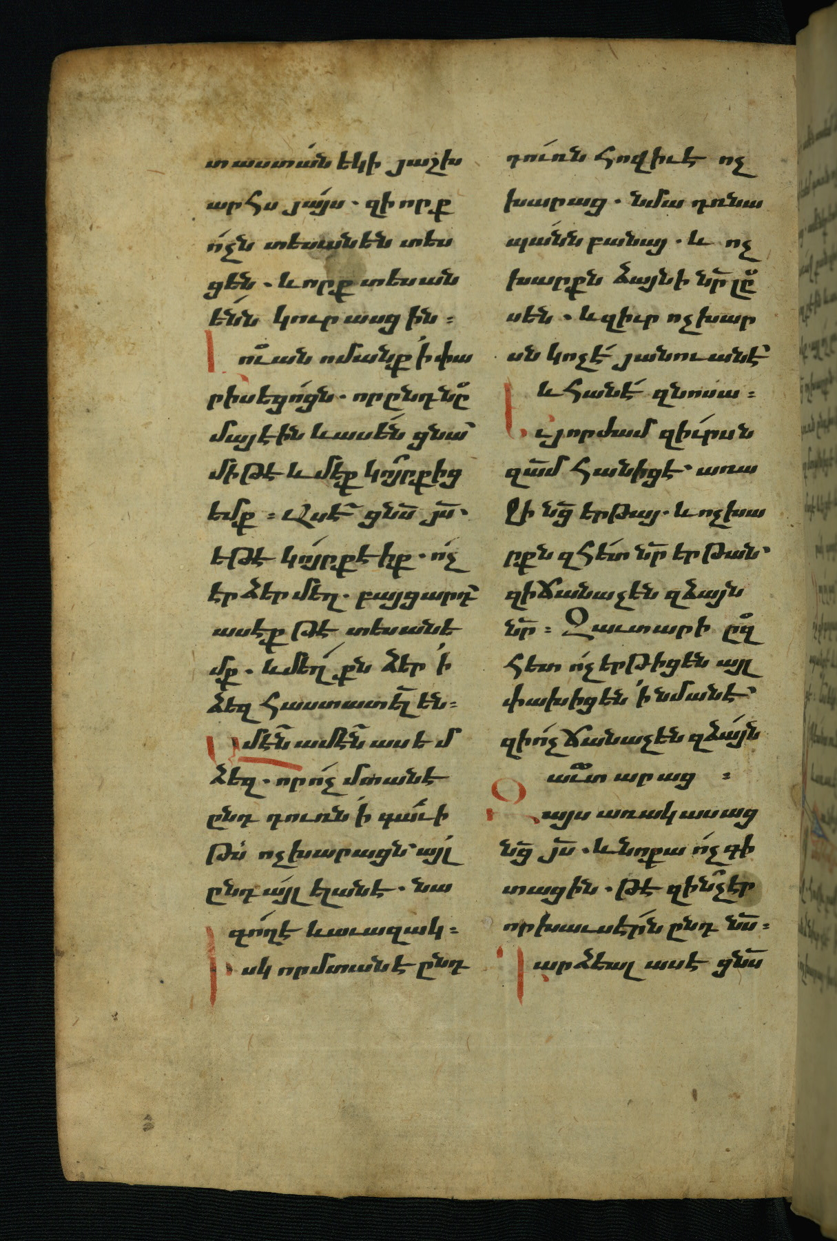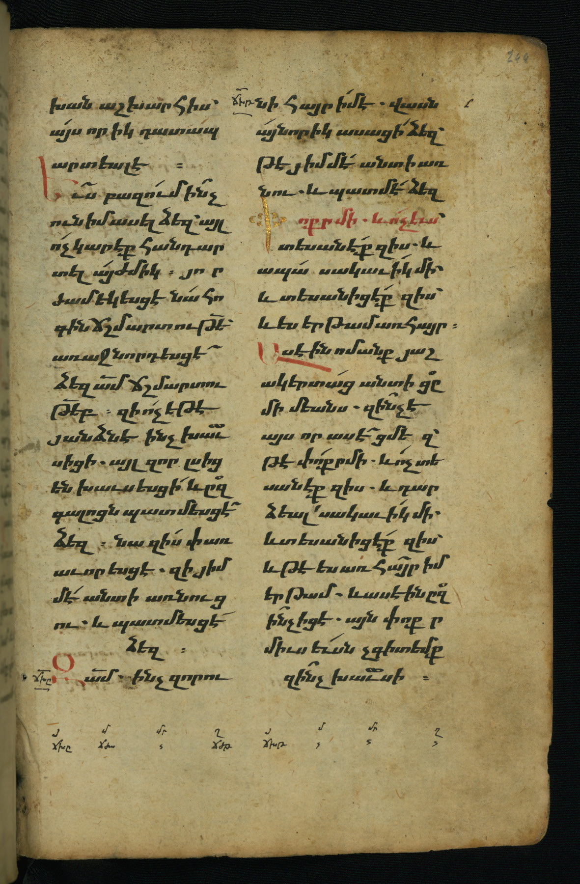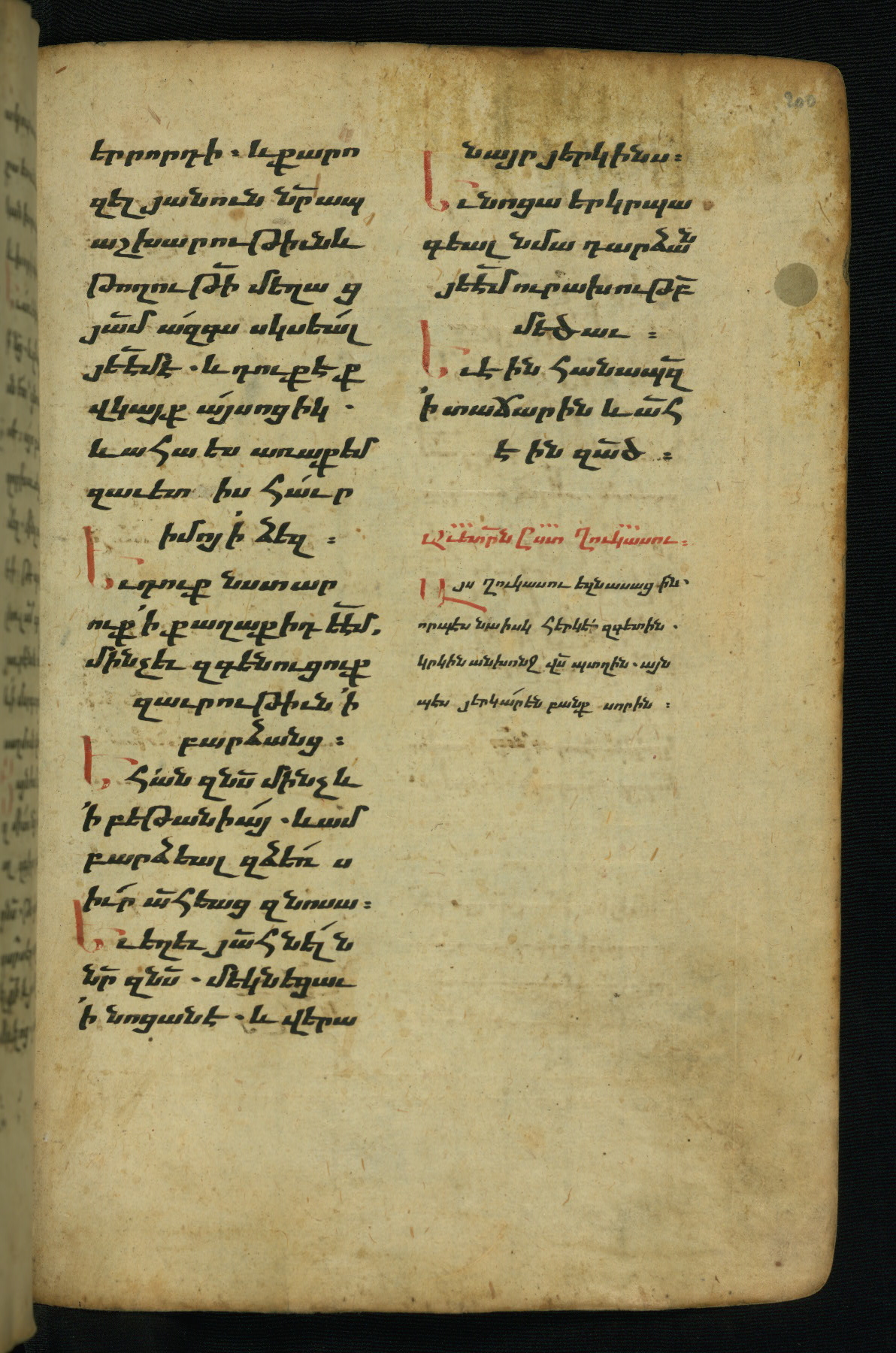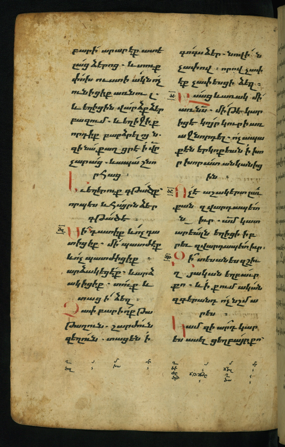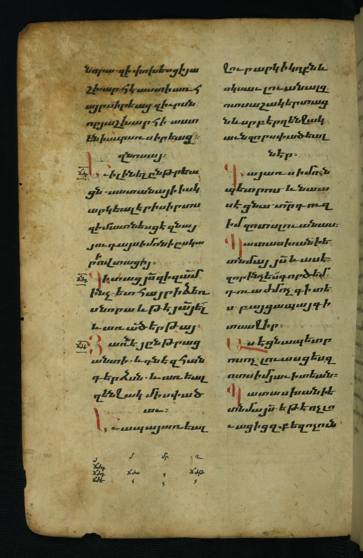 This manuscript was executed in 1475 CE by a scribe identified as Aristakes for a priest named Hakob. It contains a series of sixteen images on the life of Christ preceding the text of the Gospels, as well as the traditional Evangelist portraits, and there are marginal illustrations throughout. The style of the miniatures, which employ brilliant colors and emphasize decorative patterns, is characteristic of manuscript production in the region around Lake Van during the fifteenth century. The style of Lake Van has often been described in relation to schools of Islamic arts of the book. Numerous inscriptions (on fols. 258-260) spanning a few centuries attest to the manuscript's long history of use and revered preservation. The codex's later history included a rebinding with silver covers from Kayseri that date to approximately 1700. This jeweled and enameled silver binding bears a composition of the Adoration of the Magi on the front and the Ascension on the back.