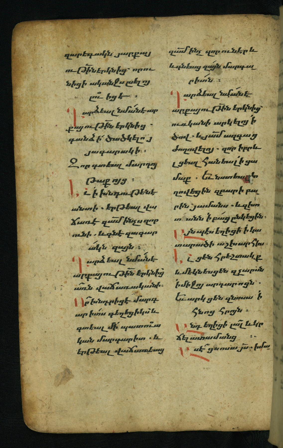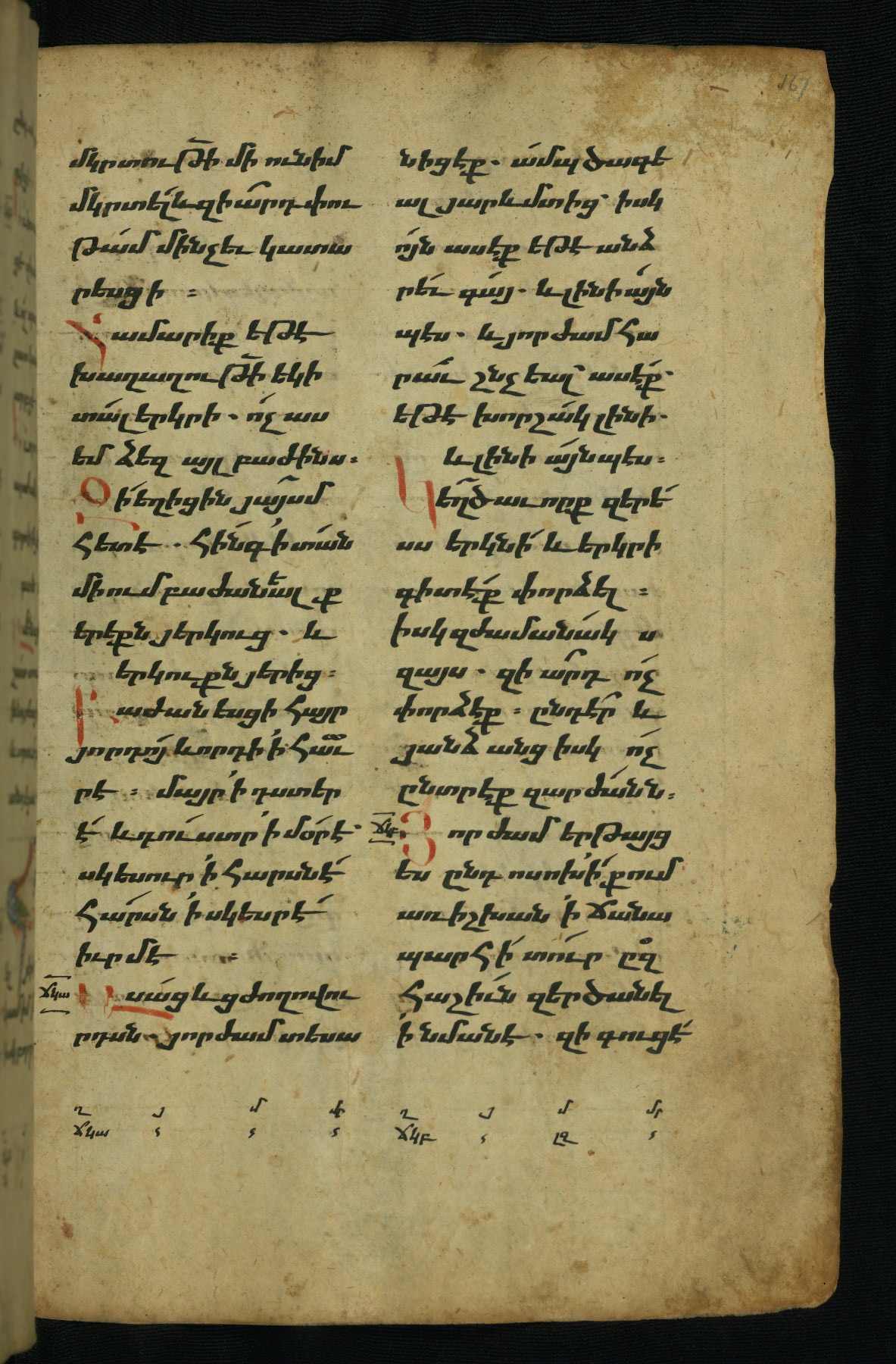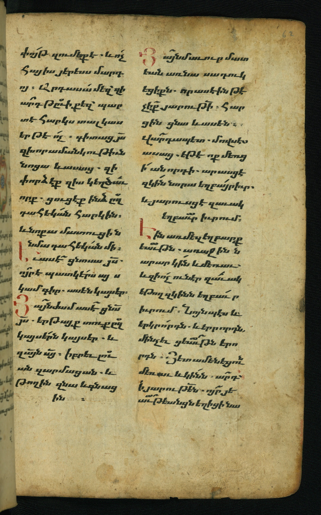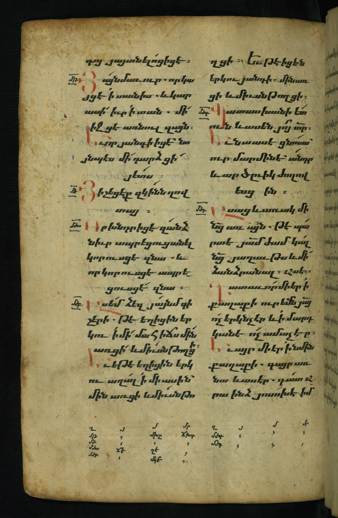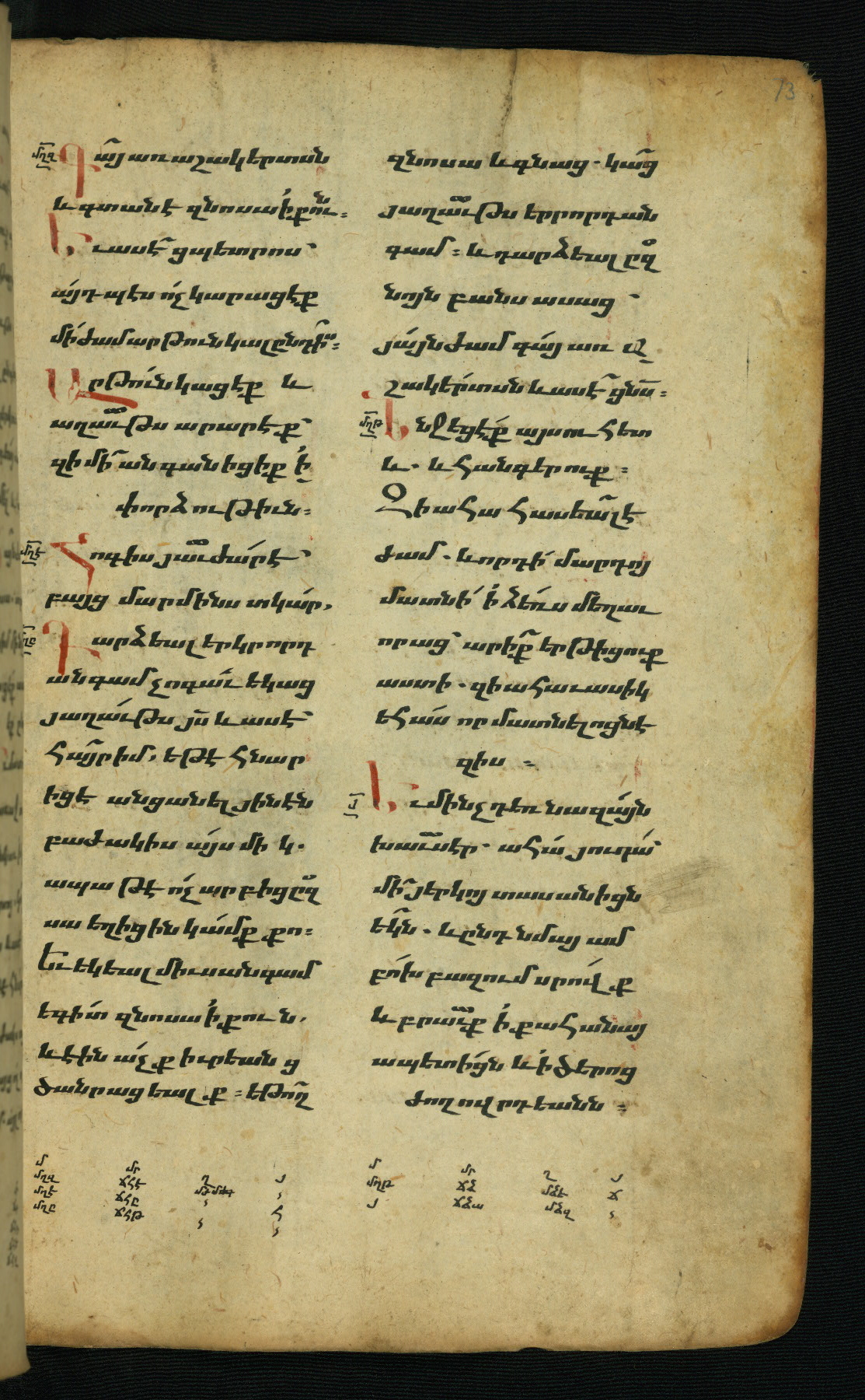 This manuscript was executed in 1475 CE by a scribe identified as Aristakes for a priest named Hakob. It contains a series of sixteen images on the life of Christ preceding the text of the Gospels, as well as the traditional Evangelist portraits, and there are marginal illustrations throughout. The style of the miniatures, which employ brilliant colors and emphasize decorative patterns, is characteristic of manuscript production in the region around Lake Van during the fifteenth century. The style of Lake Van has often been described in relation to schools of Islamic arts of the book. Numerous inscriptions (on fols. 258-260) spanning a few centuries attest to the manuscript's long history of use and revered preservation. The codex's later history included a rebinding with silver covers from Kayseri that date to approximately 1700. This jeweled and enameled silver binding bears a composition of the Adoration of the Magi on the front and the Ascension on the back.