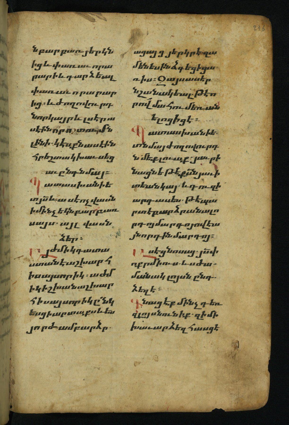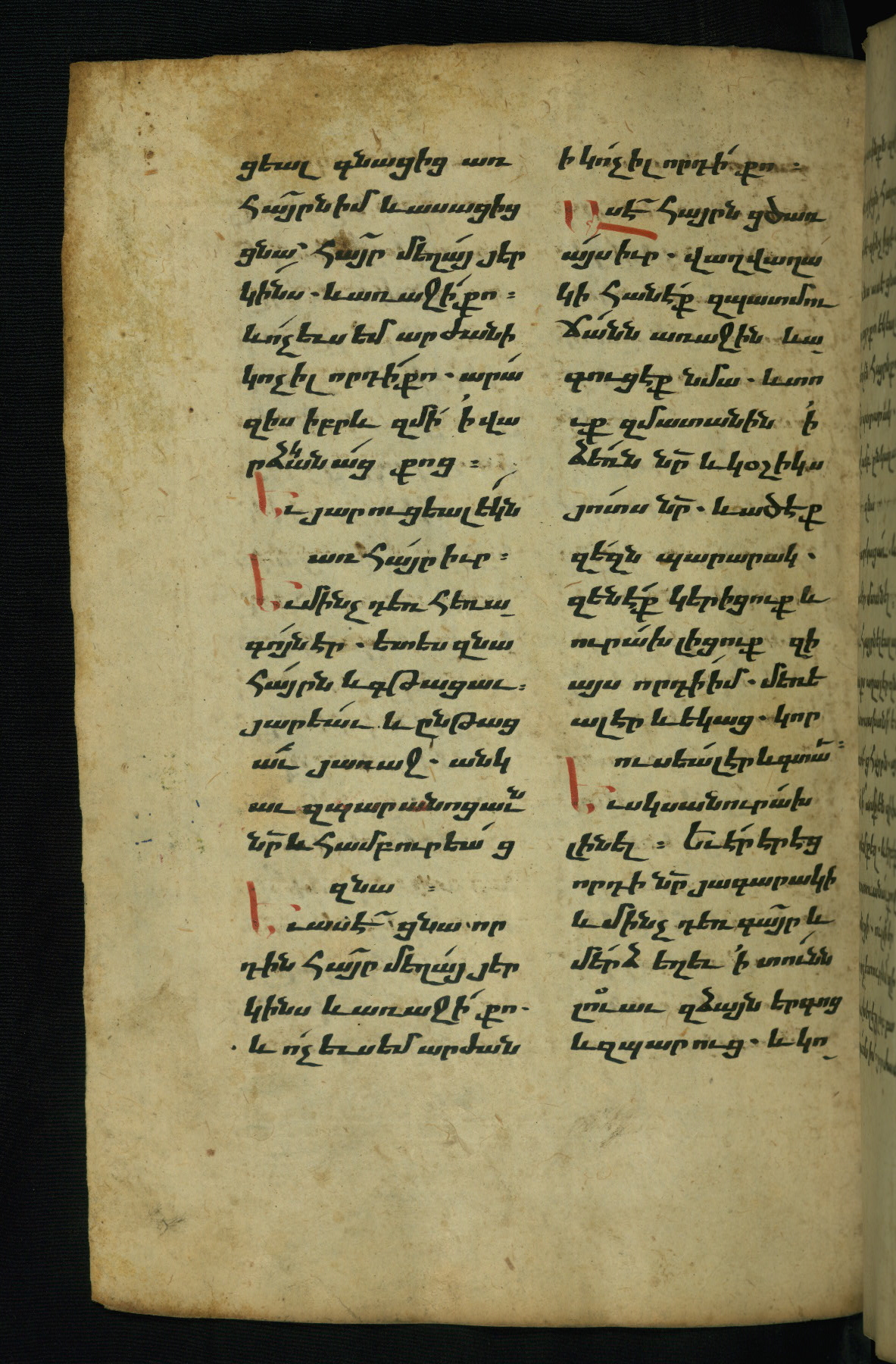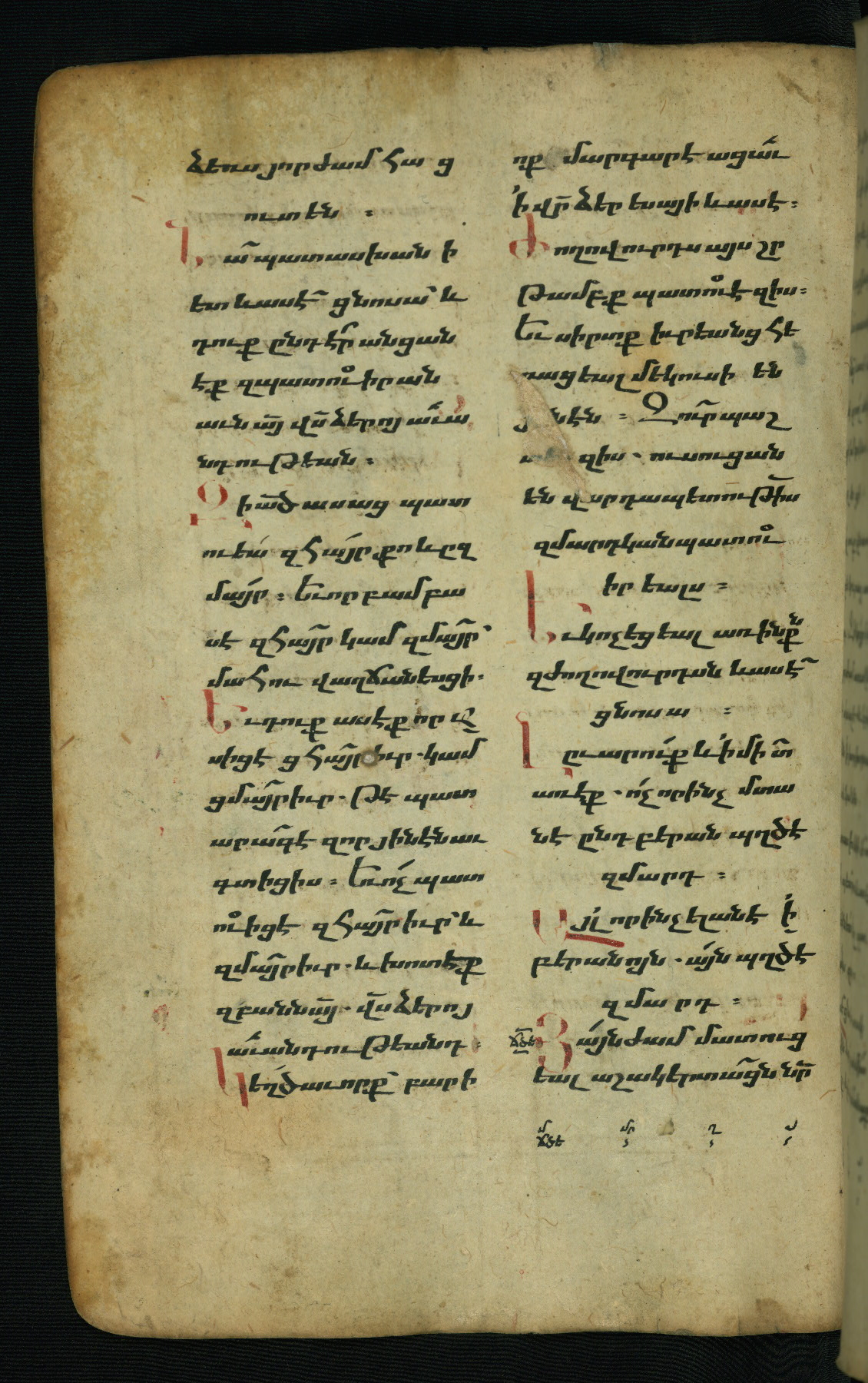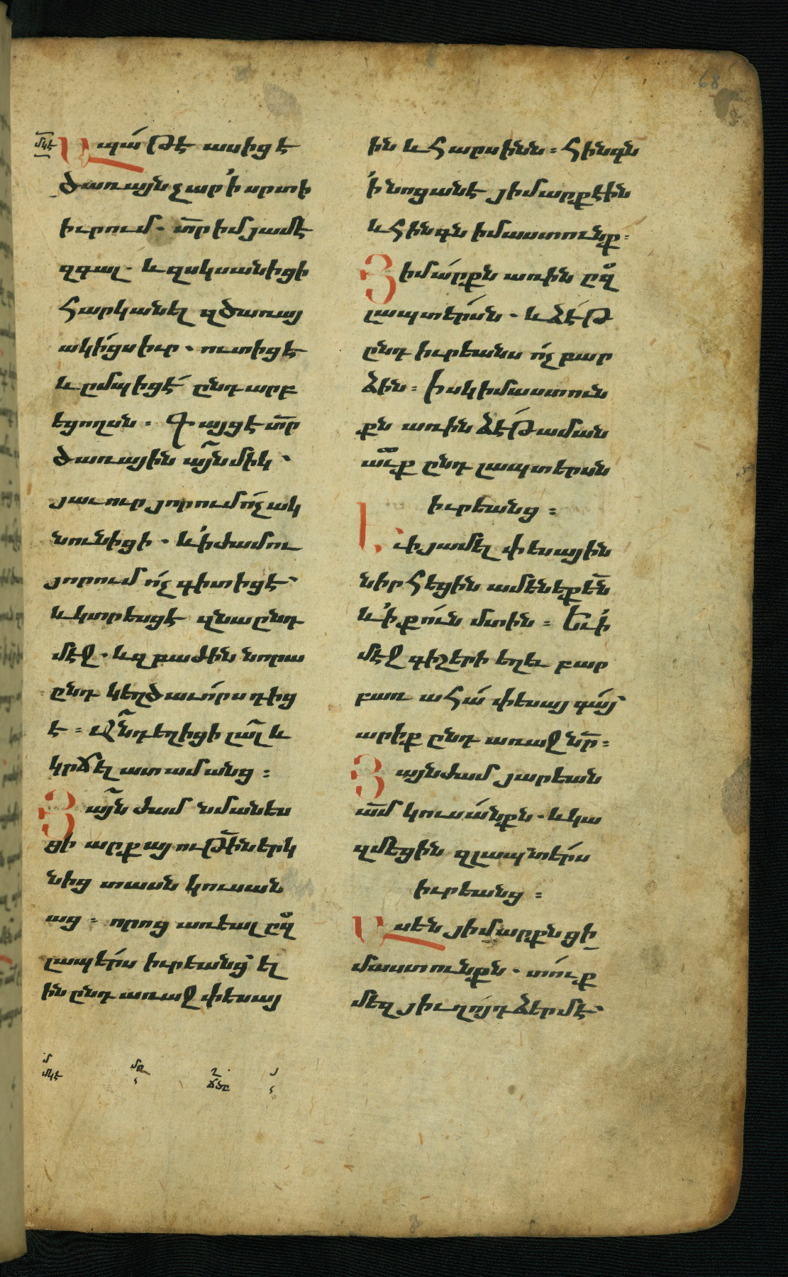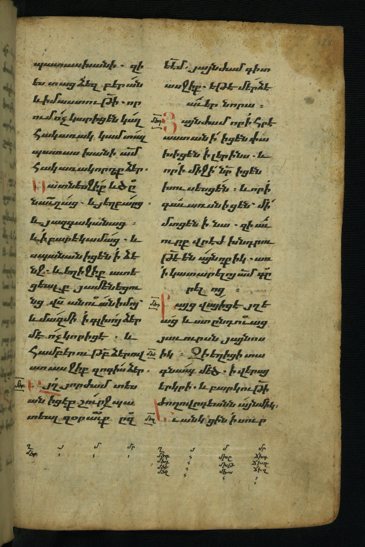 This manuscript was executed in 1475 CE by a scribe identified as Aristakes for a priest named Hakob. It contains a series of sixteen images on the life of Christ preceding the text of the Gospels, as well as the traditional Evangelist portraits, and there are marginal illustrations throughout. The style of the miniatures, which employ brilliant colors and emphasize decorative patterns, is characteristic of manuscript production in the region around Lake Van during the fifteenth century. The style of Lake Van has often been described in relation to schools of Islamic arts of the book. Numerous inscriptions (on fols. 258-260) spanning a few centuries attest to the manuscript's long history of use and revered preservation. The codex's later history included a rebinding with silver covers from Kayseri that date to approximately 1700. This jeweled and enameled silver binding bears a composition of the Adoration of the Magi on the front and the Ascension on the back.