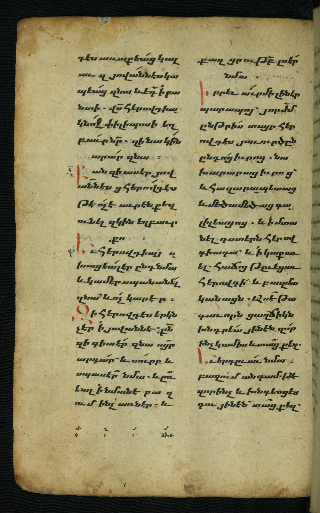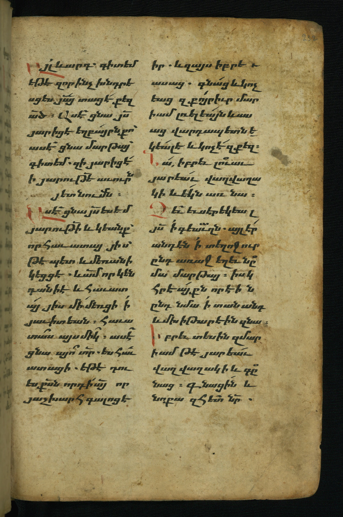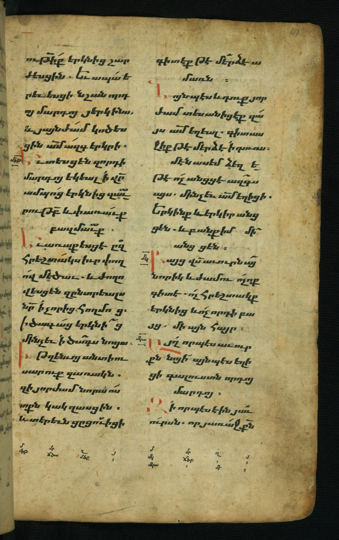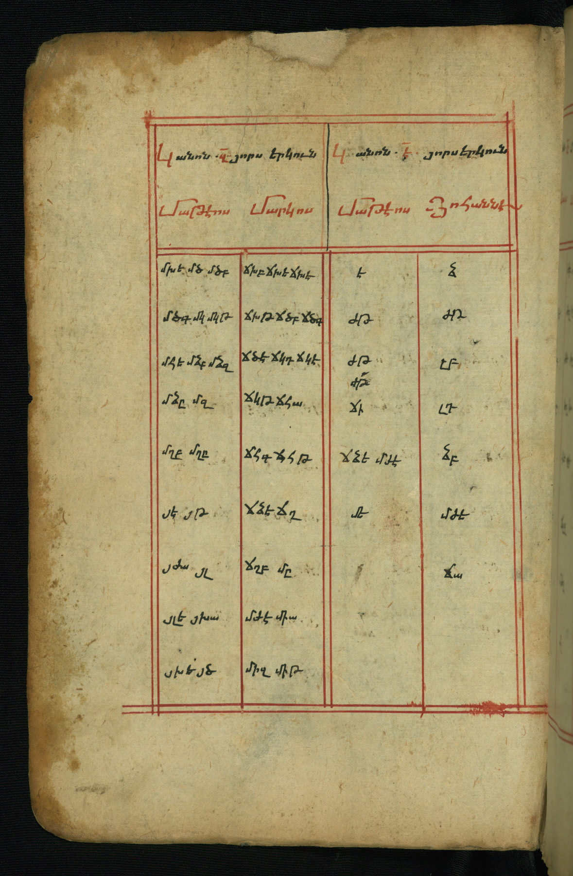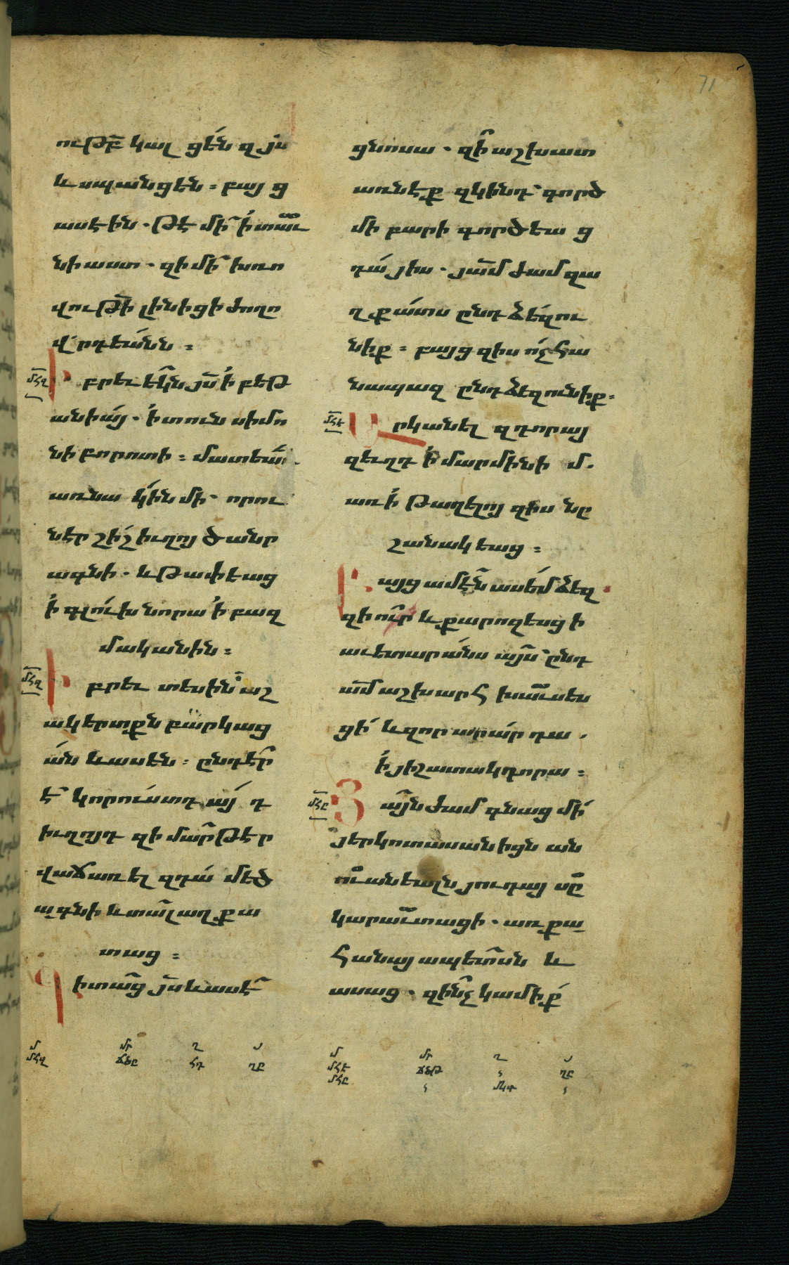 This manuscript was executed in 1475 CE by a scribe identified as Aristakes for a priest named Hakob. It contains a series of sixteen images on the life of Christ preceding the text of the Gospels, as well as the traditional Evangelist portraits, and there are marginal illustrations throughout. The style of the miniatures, which employ brilliant colors and emphasize decorative patterns, is characteristic of manuscript production in the region around Lake Van during the fifteenth century. The style of Lake Van has often been described in relation to schools of Islamic arts of the book. Numerous inscriptions (on fols. 258-260) spanning a few centuries attest to the manuscript's long history of use and revered preservation. The codex's later history included a rebinding with silver covers from Kayseri that date to approximately 1700. This jeweled and enameled silver binding bears a composition of the Adoration of the Magi on the front and the Ascension on the back.