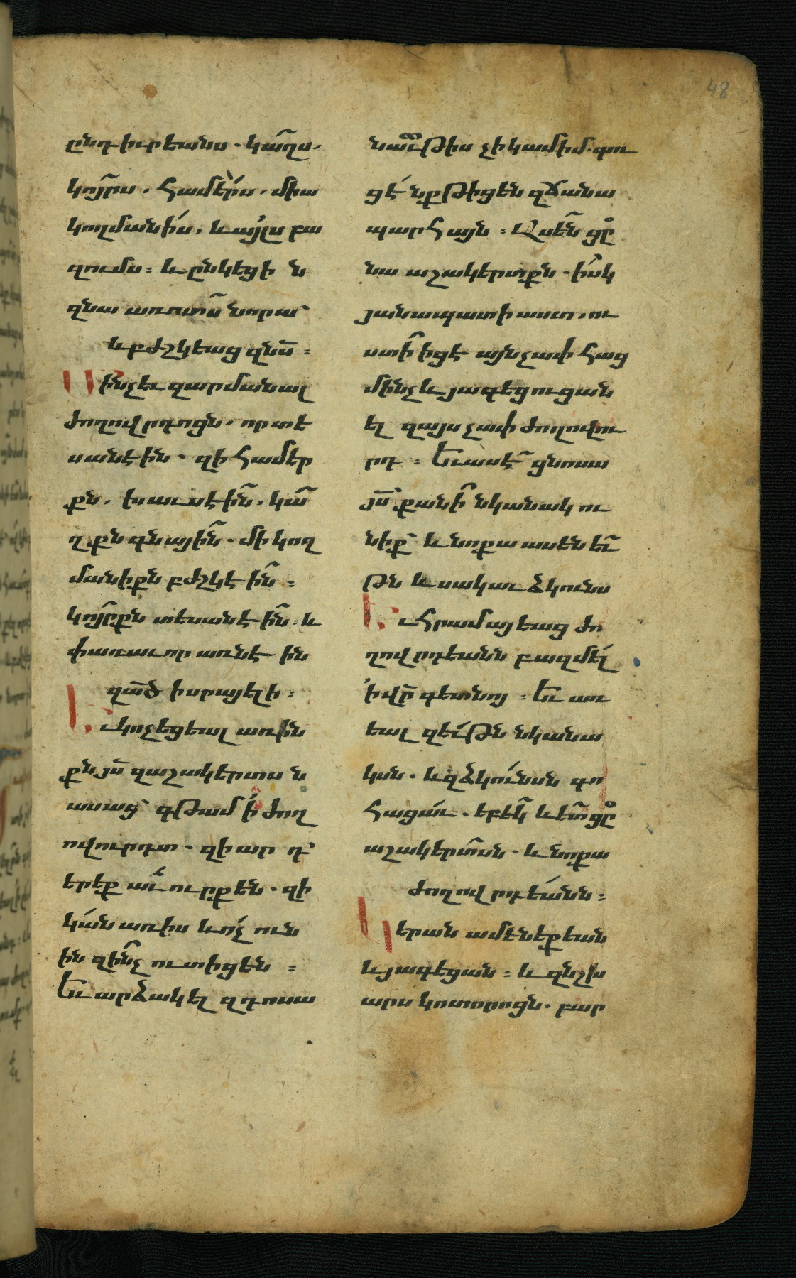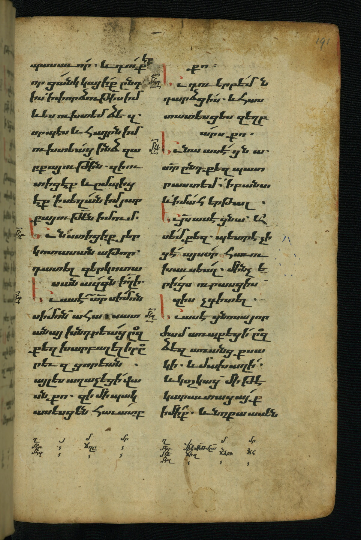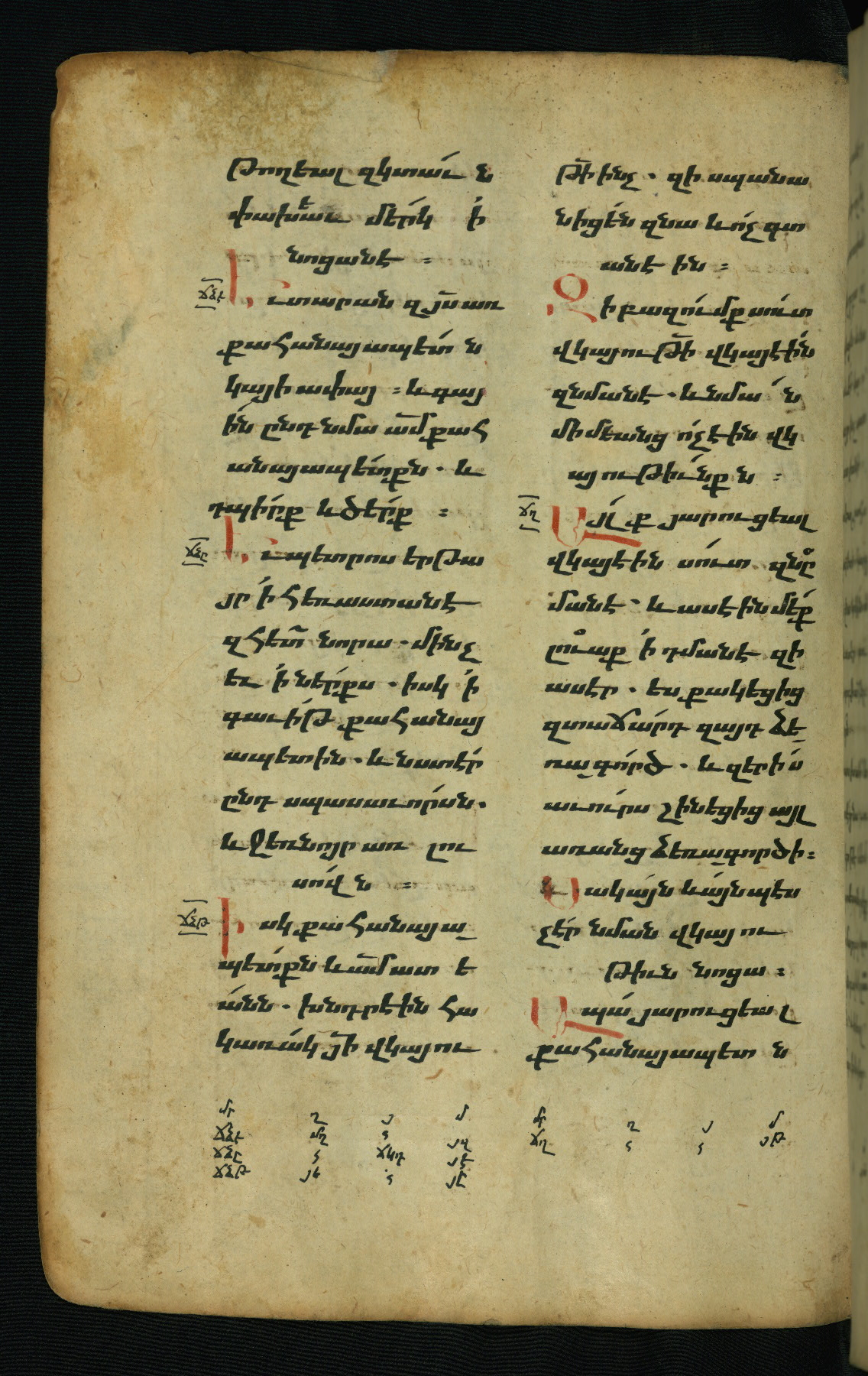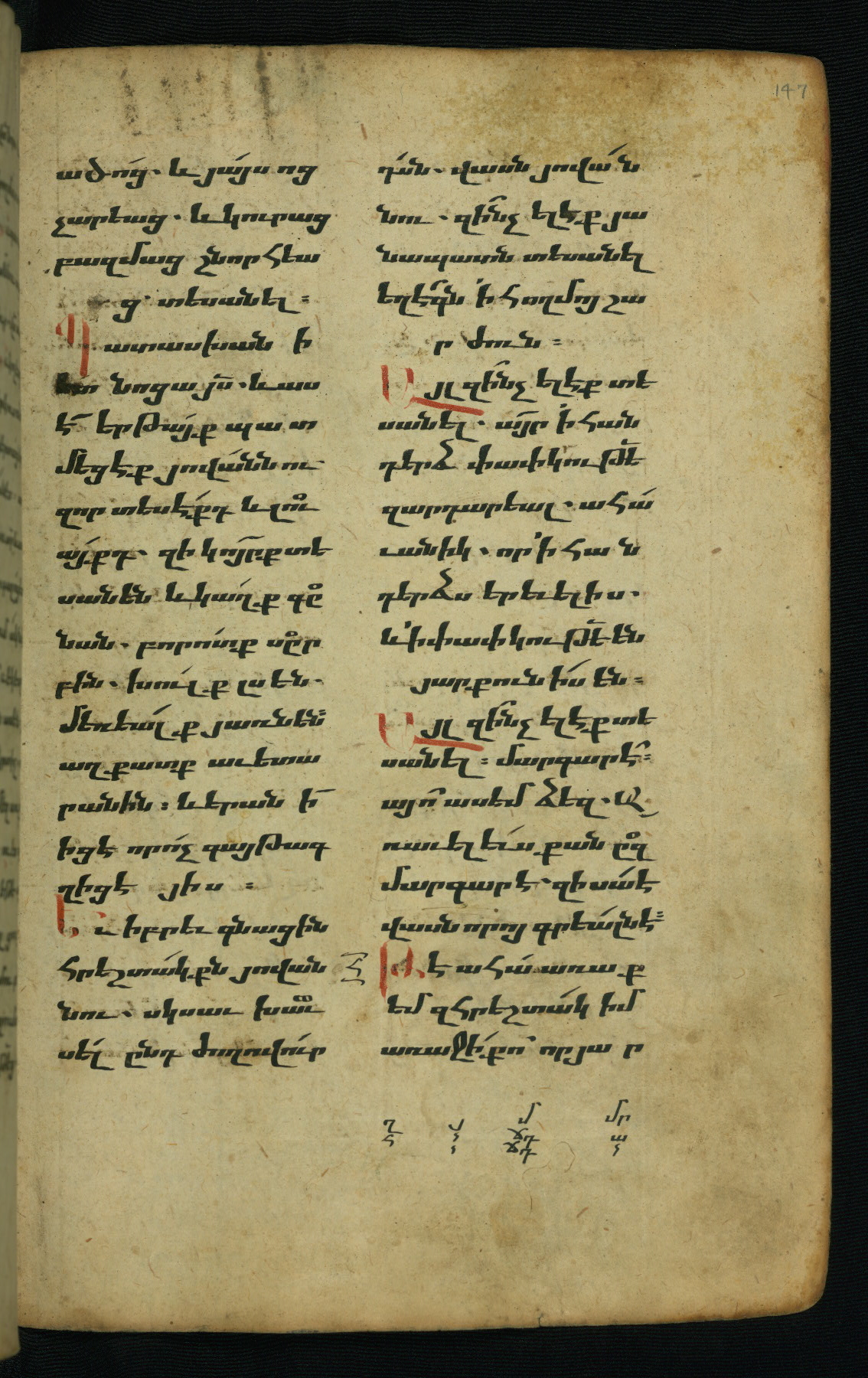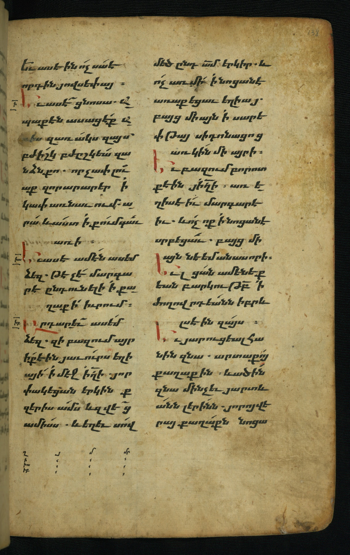 This manuscript was executed in 1475 CE by a scribe identified as Aristakes for a priest named Hakob. It contains a series of sixteen images on the life of Christ preceding the text of the Gospels, as well as the traditional Evangelist portraits, and there are marginal illustrations throughout. The style of the miniatures, which employ brilliant colors and emphasize decorative patterns, is characteristic of manuscript production in the region around Lake Van during the fifteenth century. The style of Lake Van has often been described in relation to schools of Islamic arts of the book. Numerous inscriptions (on fols. 258-260) spanning a few centuries attest to the manuscript's long history of use and revered preservation. The codex's later history included a rebinding with silver covers from Kayseri that date to approximately 1700. This jeweled and enameled silver binding bears a composition of the Adoration of the Magi on the front and the Ascension on the back.