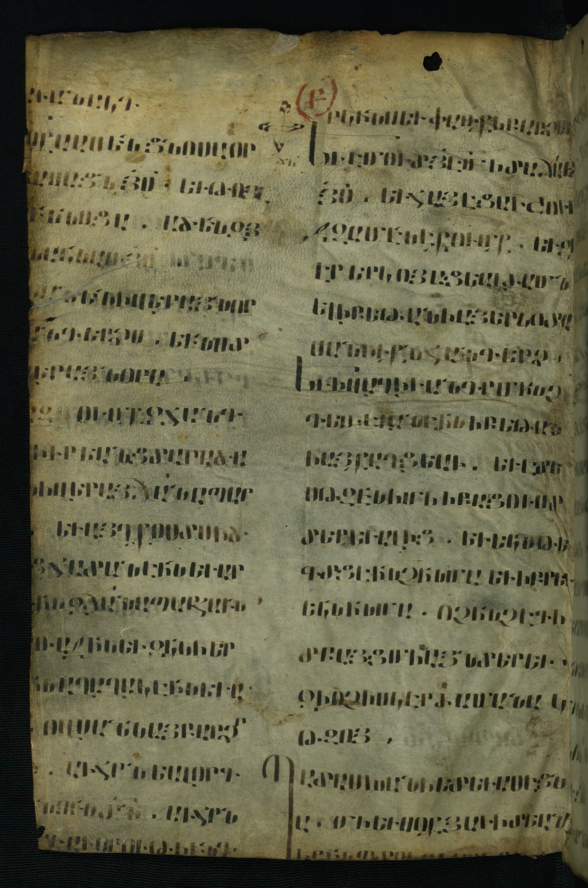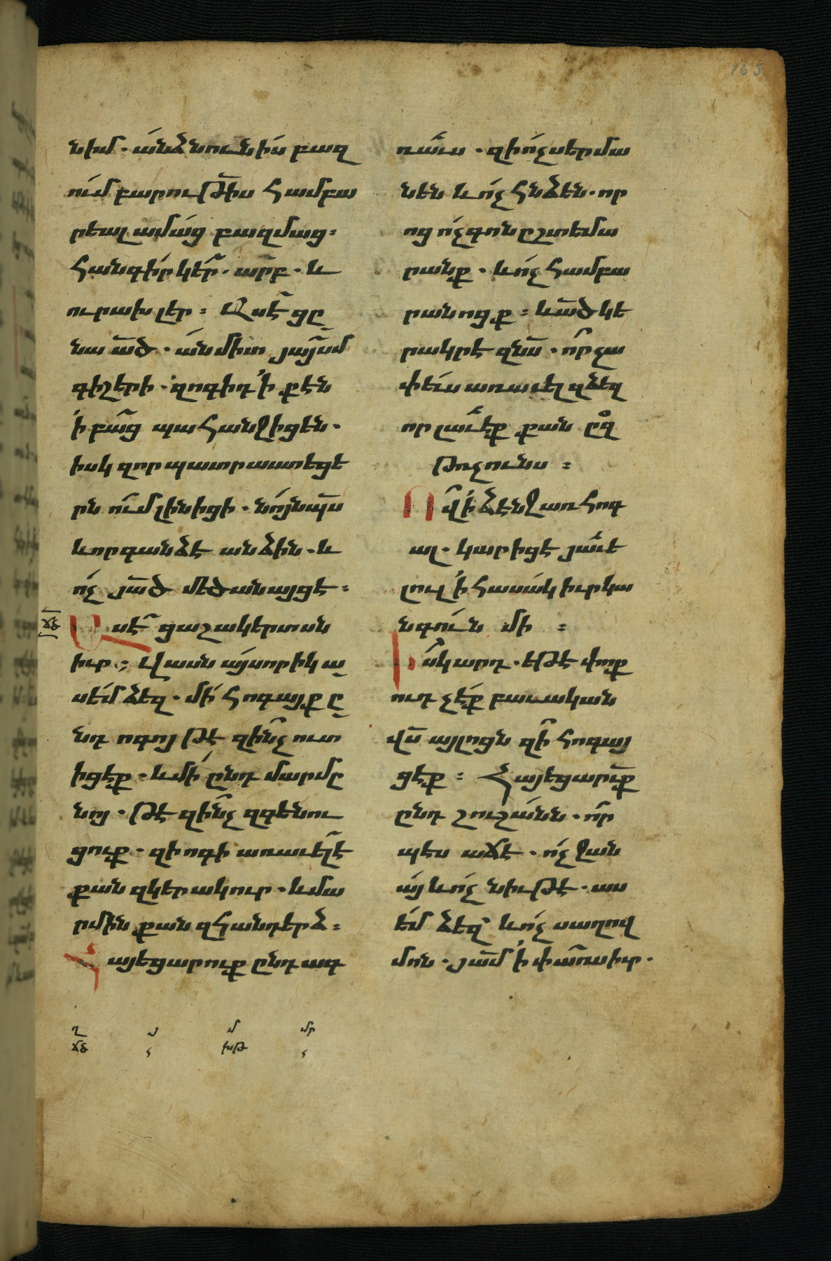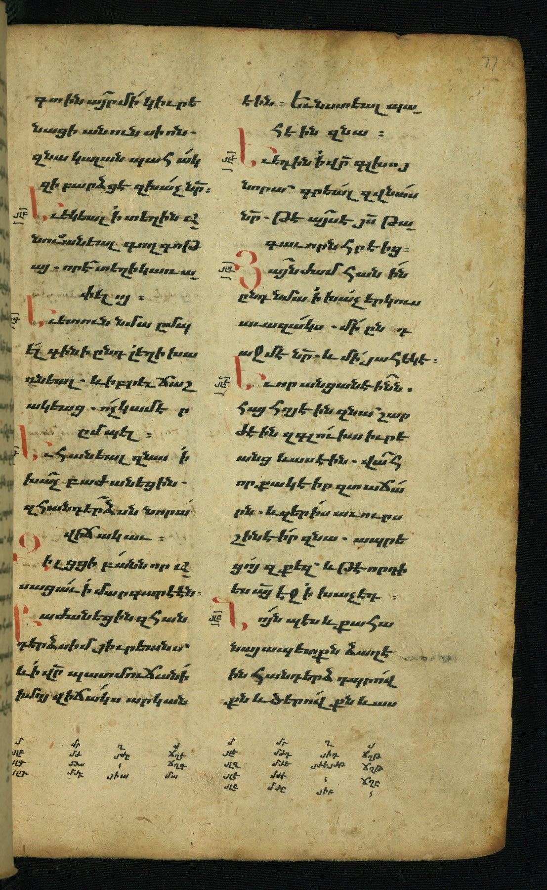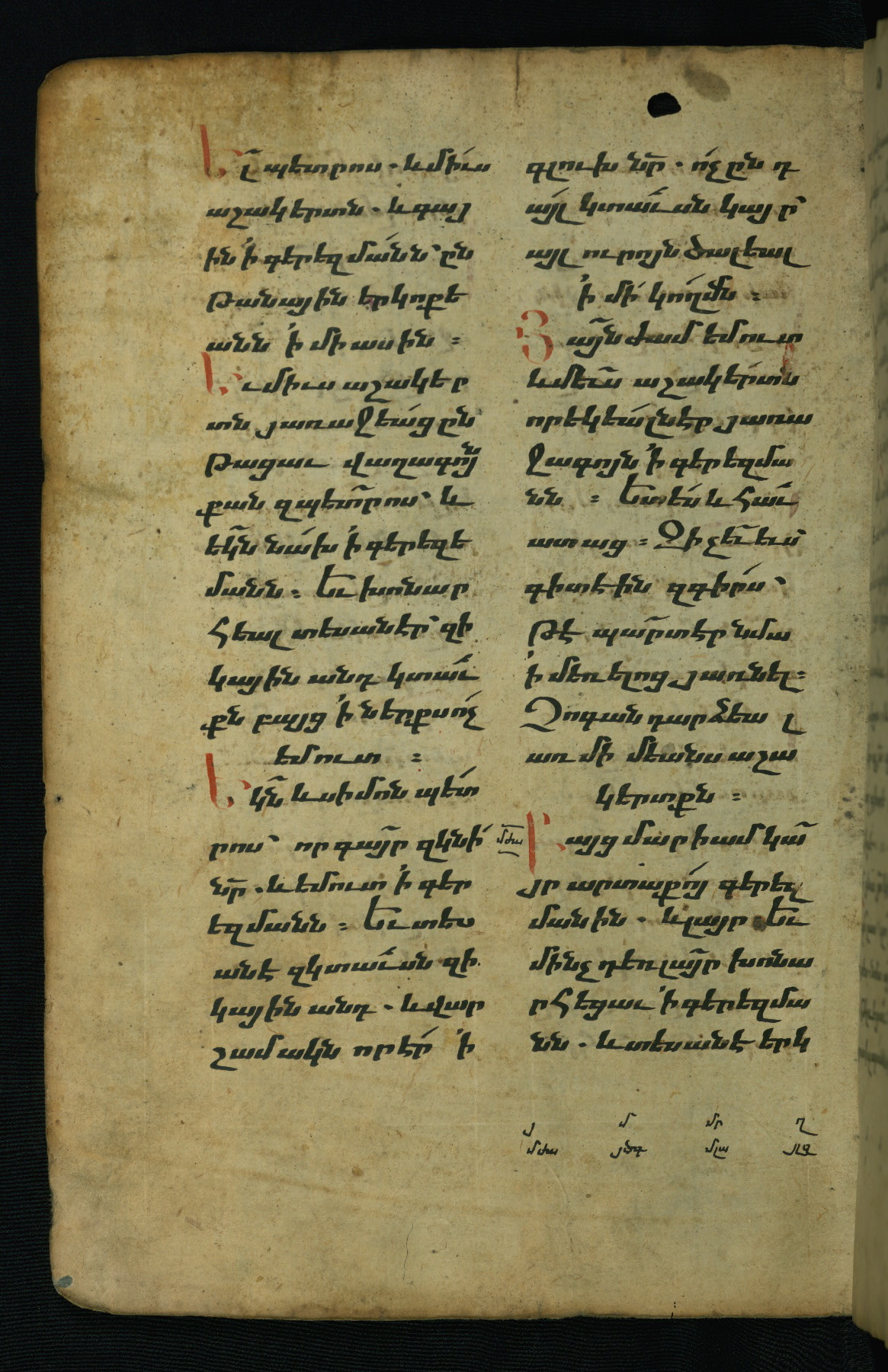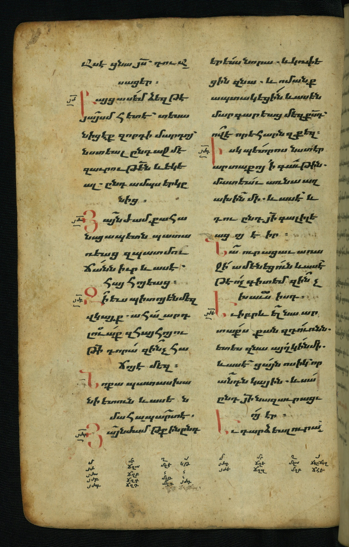 This manuscript was executed in 1475 CE by a scribe identified as Aristakes for a priest named Hakob. It contains a series of sixteen images on the life of Christ preceding the text of the Gospels, as well as the traditional Evangelist portraits, and there are marginal illustrations throughout. The style of the miniatures, which employ brilliant colors and emphasize decorative patterns, is characteristic of manuscript production in the region around Lake Van during the fifteenth century. The style of Lake Van has often been described in relation to schools of Islamic arts of the book. Numerous inscriptions (on fols. 258-260) spanning a few centuries attest to the manuscript's long history of use and revered preservation. The codex's later history included a rebinding with silver covers from Kayseri that date to approximately 1700. This jeweled and enameled silver binding bears a composition of the Adoration of the Magi on the front and the Ascension on the back.