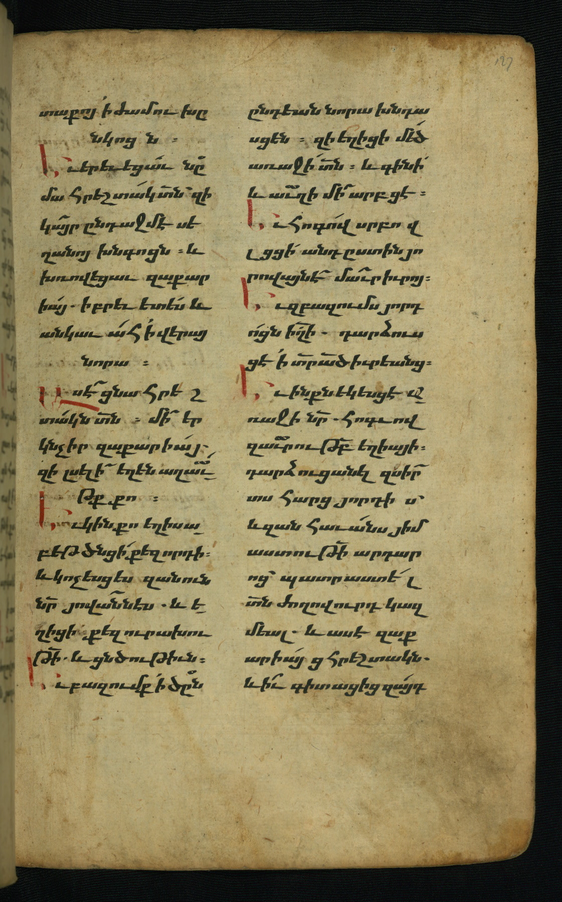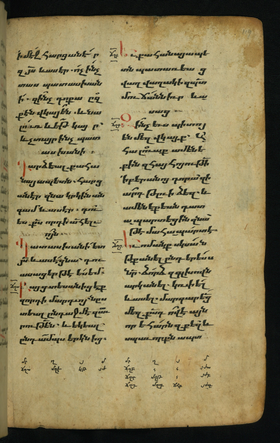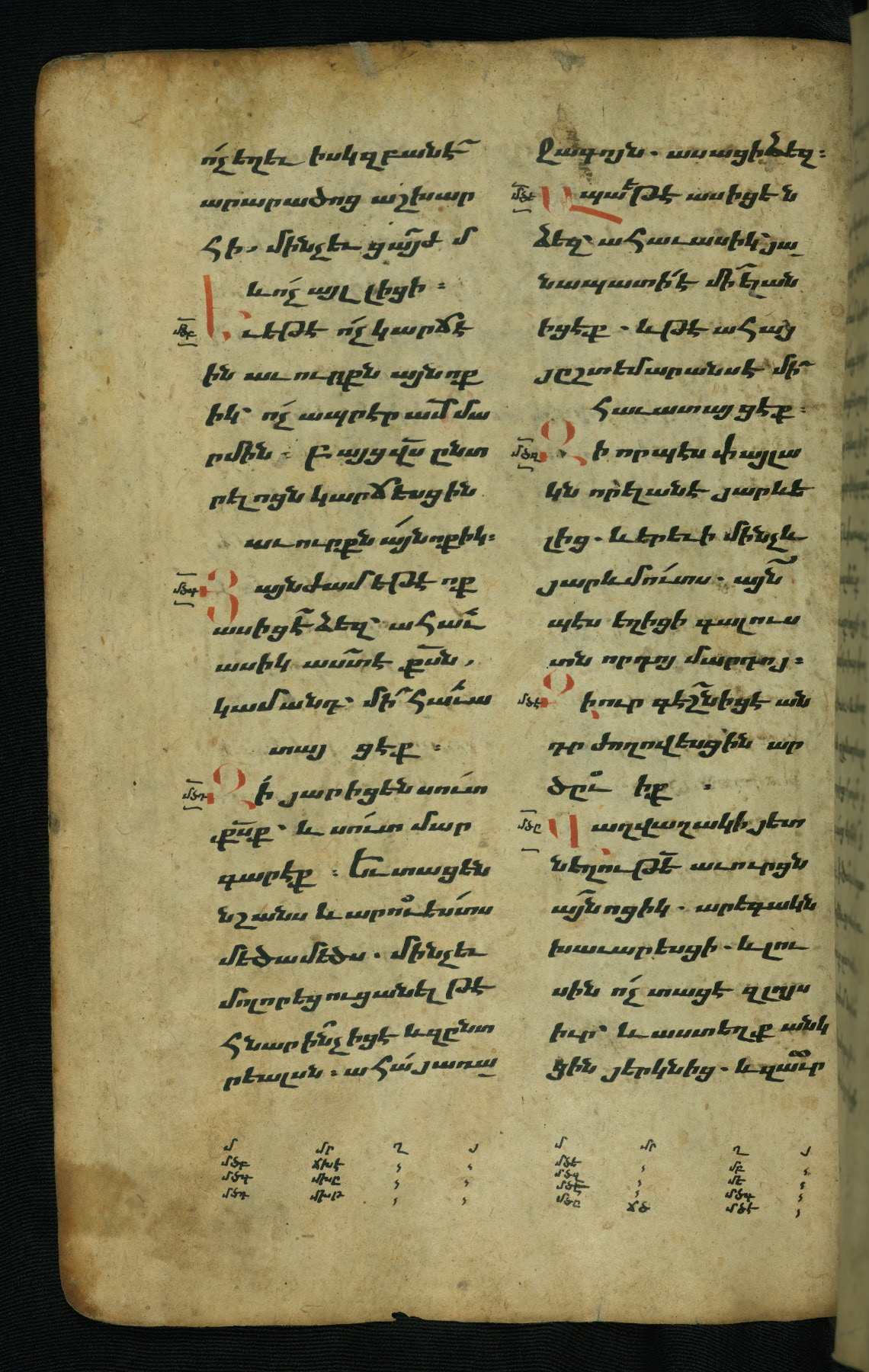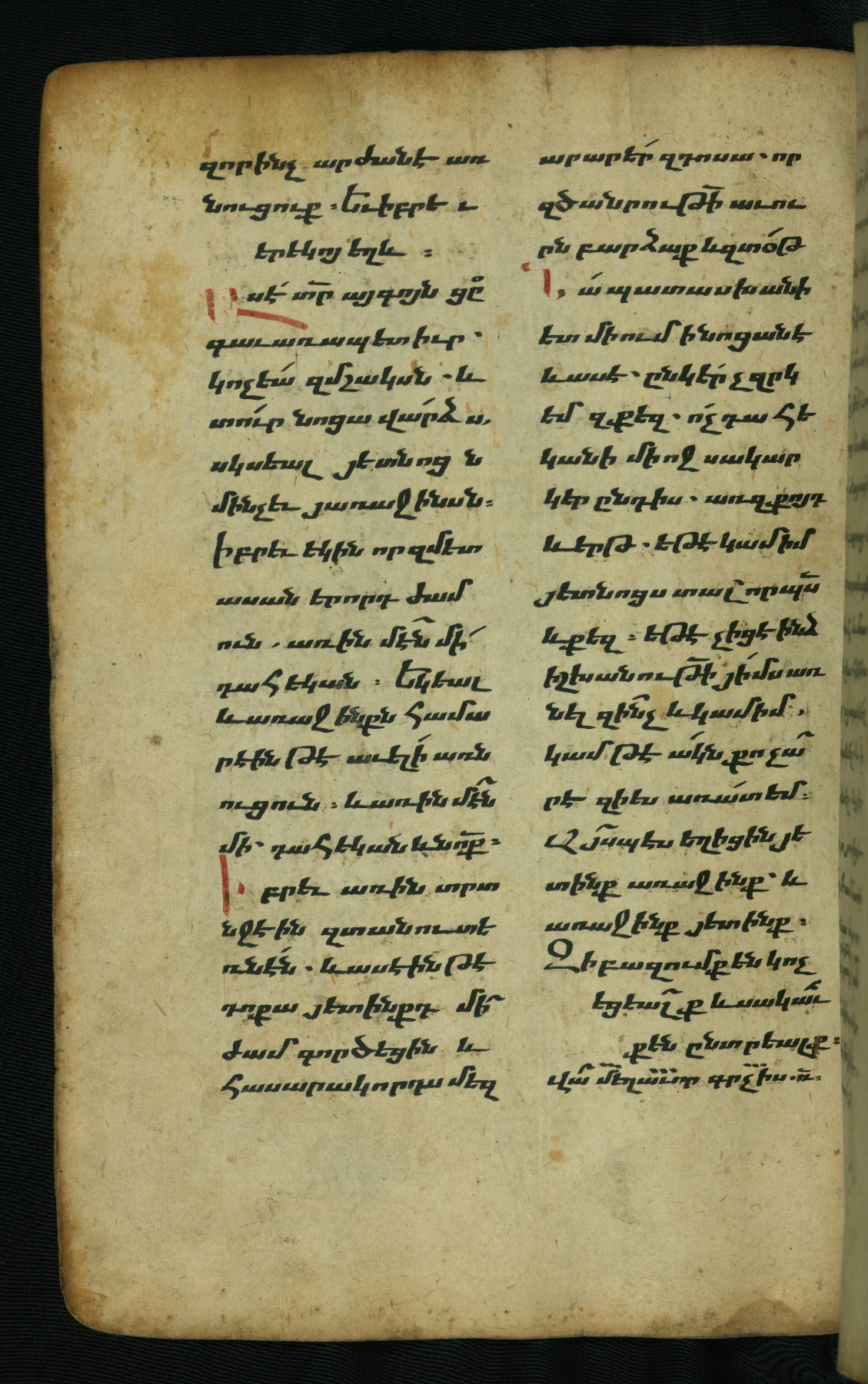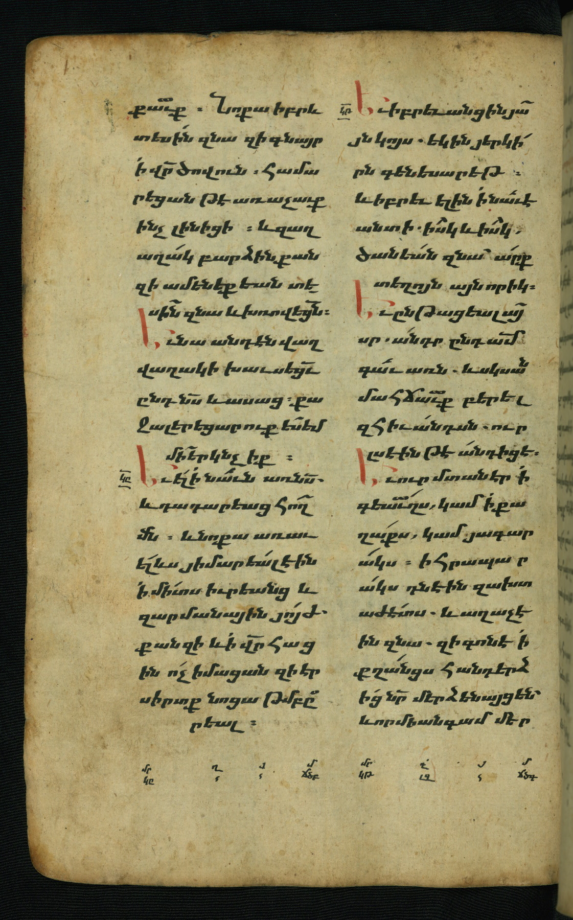 This manuscript was executed in 1475 CE by a scribe identified as Aristakes for a priest named Hakob. It contains a series of sixteen images on the life of Christ preceding the text of the Gospels, as well as the traditional Evangelist portraits, and there are marginal illustrations throughout. The style of the miniatures, which employ brilliant colors and emphasize decorative patterns, is characteristic of manuscript production in the region around Lake Van during the fifteenth century. The style of Lake Van has often been described in relation to schools of Islamic arts of the book. Numerous inscriptions (on fols. 258-260) spanning a few centuries attest to the manuscript's long history of use and revered preservation. The codex's later history included a rebinding with silver covers from Kayseri that date to approximately 1700. This jeweled and enameled silver binding bears a composition of the Adoration of the Magi on the front and the Ascension on the back.
