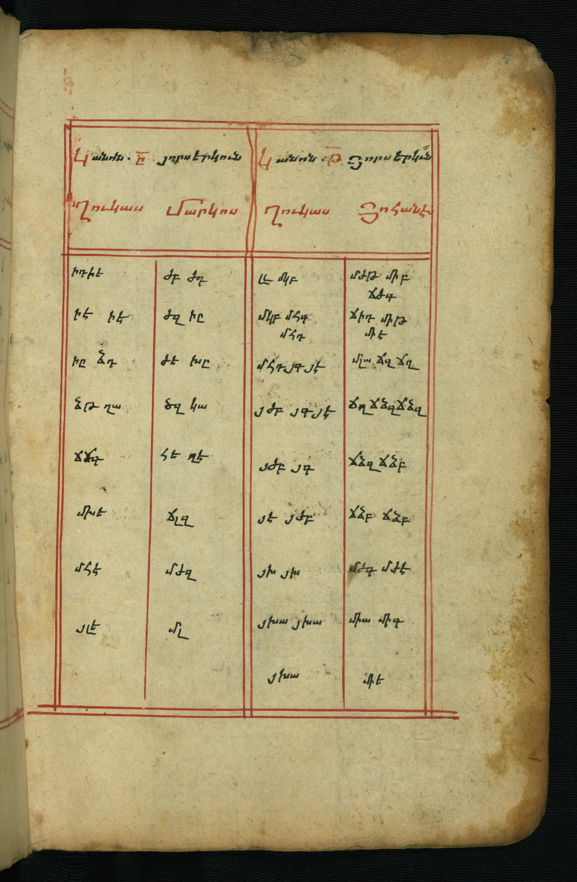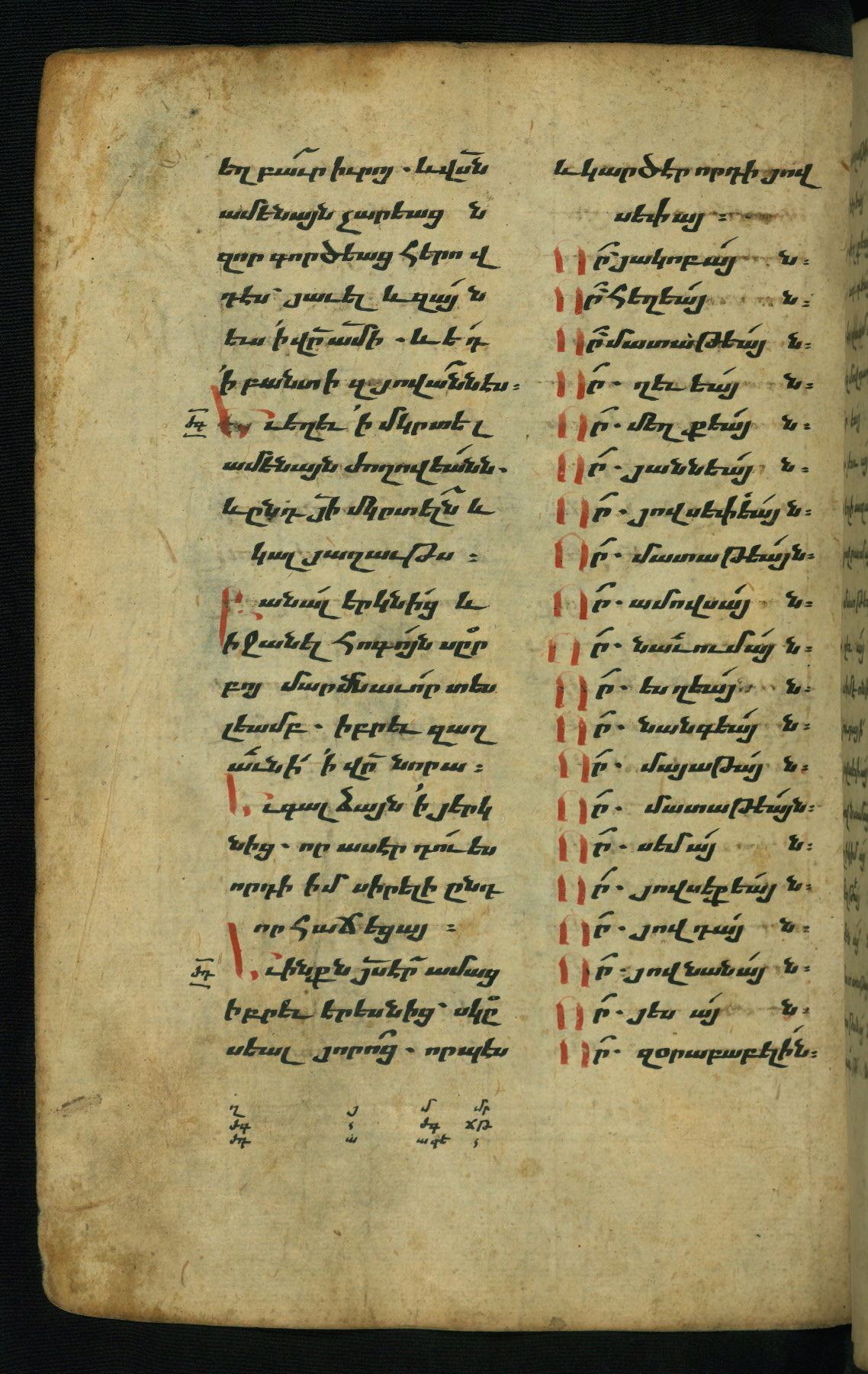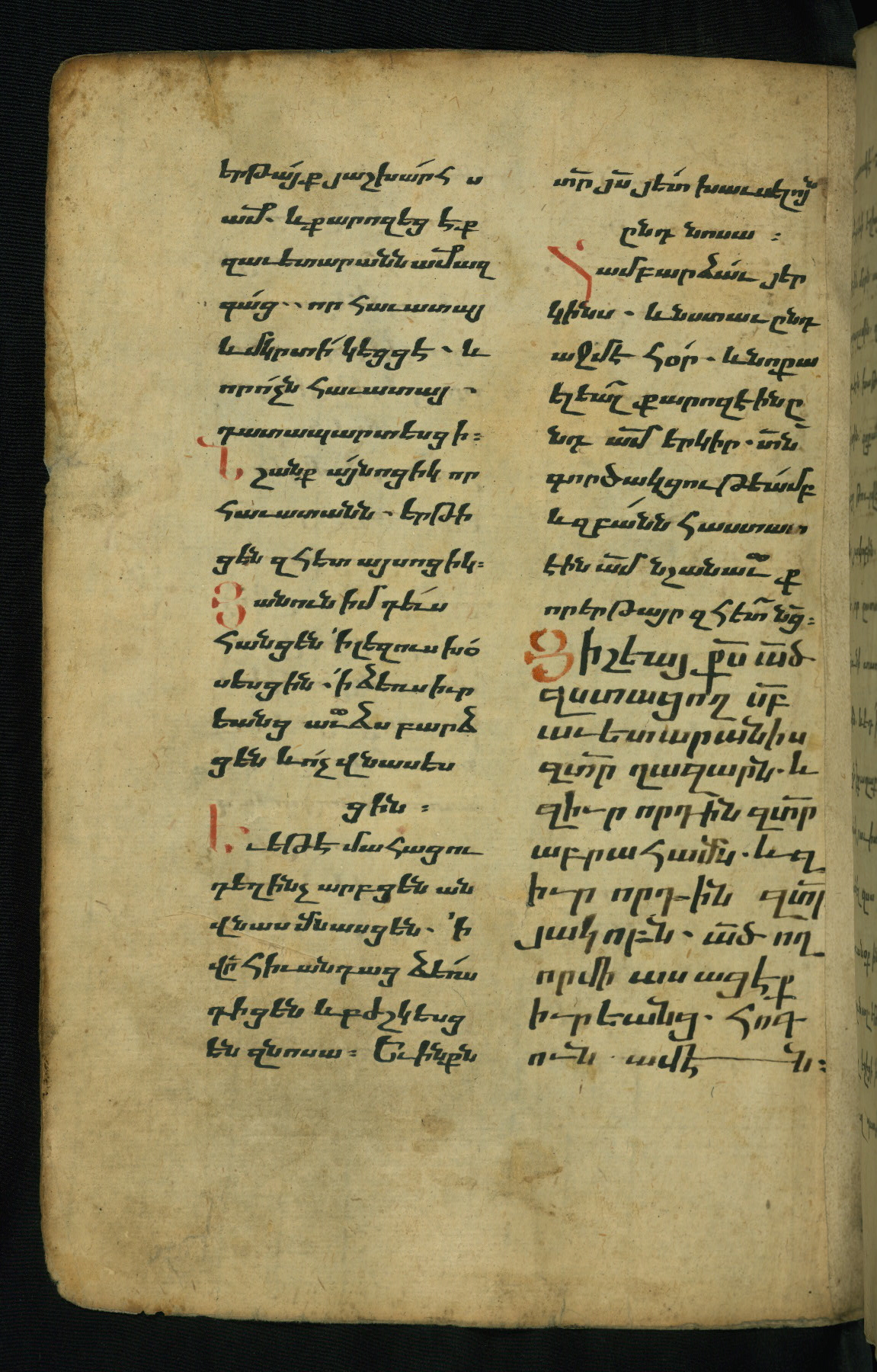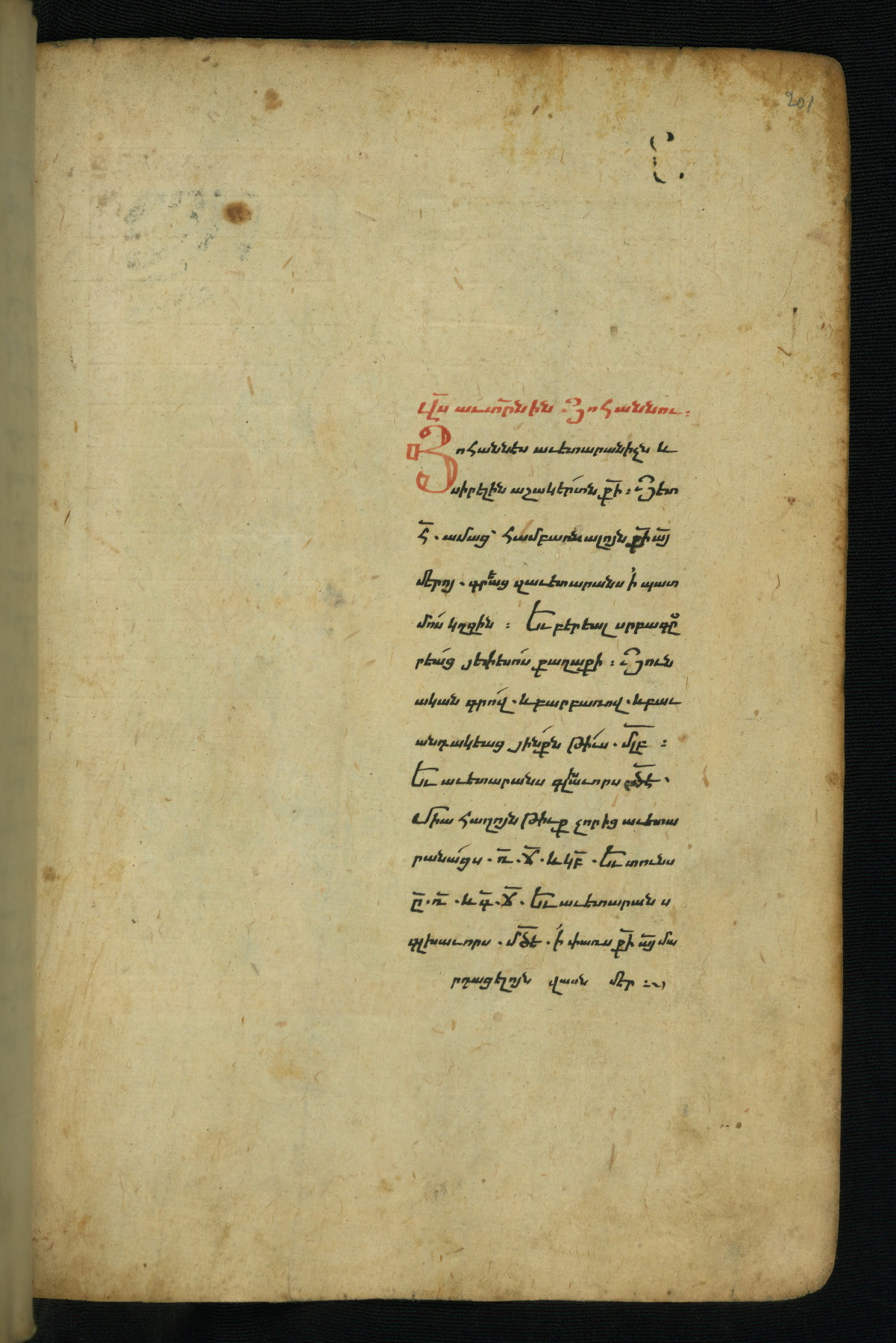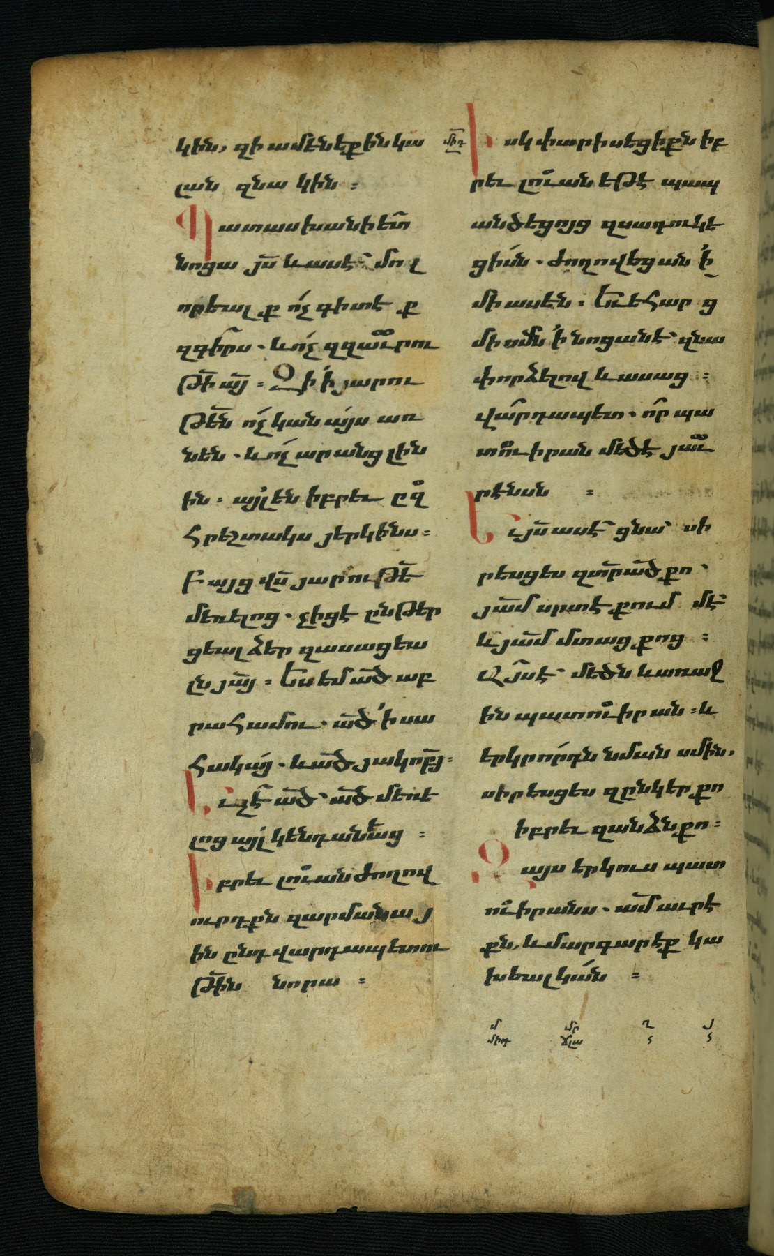 This manuscript was executed in 1475 CE by a scribe identified as Aristakes for a priest named Hakob. It contains a series of sixteen images on the life of Christ preceding the text of the Gospels, as well as the traditional Evangelist portraits, and there are marginal illustrations throughout. The style of the miniatures, which employ brilliant colors and emphasize decorative patterns, is characteristic of manuscript production in the region around Lake Van during the fifteenth century. The style of Lake Van has often been described in relation to schools of Islamic arts of the book. Numerous inscriptions (on fols. 258-260) spanning a few centuries attest to the manuscript's long history of use and revered preservation. The codex's later history included a rebinding with silver covers from Kayseri that date to approximately 1700. This jeweled and enameled silver binding bears a composition of the Adoration of the Magi on the front and the Ascension on the back.