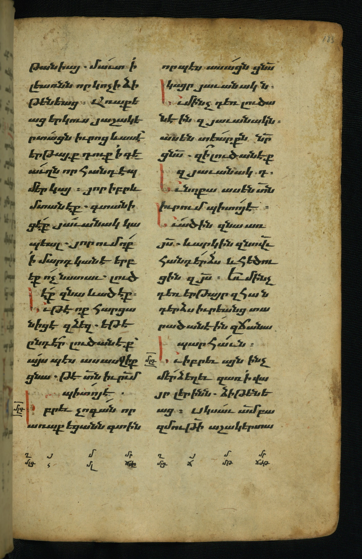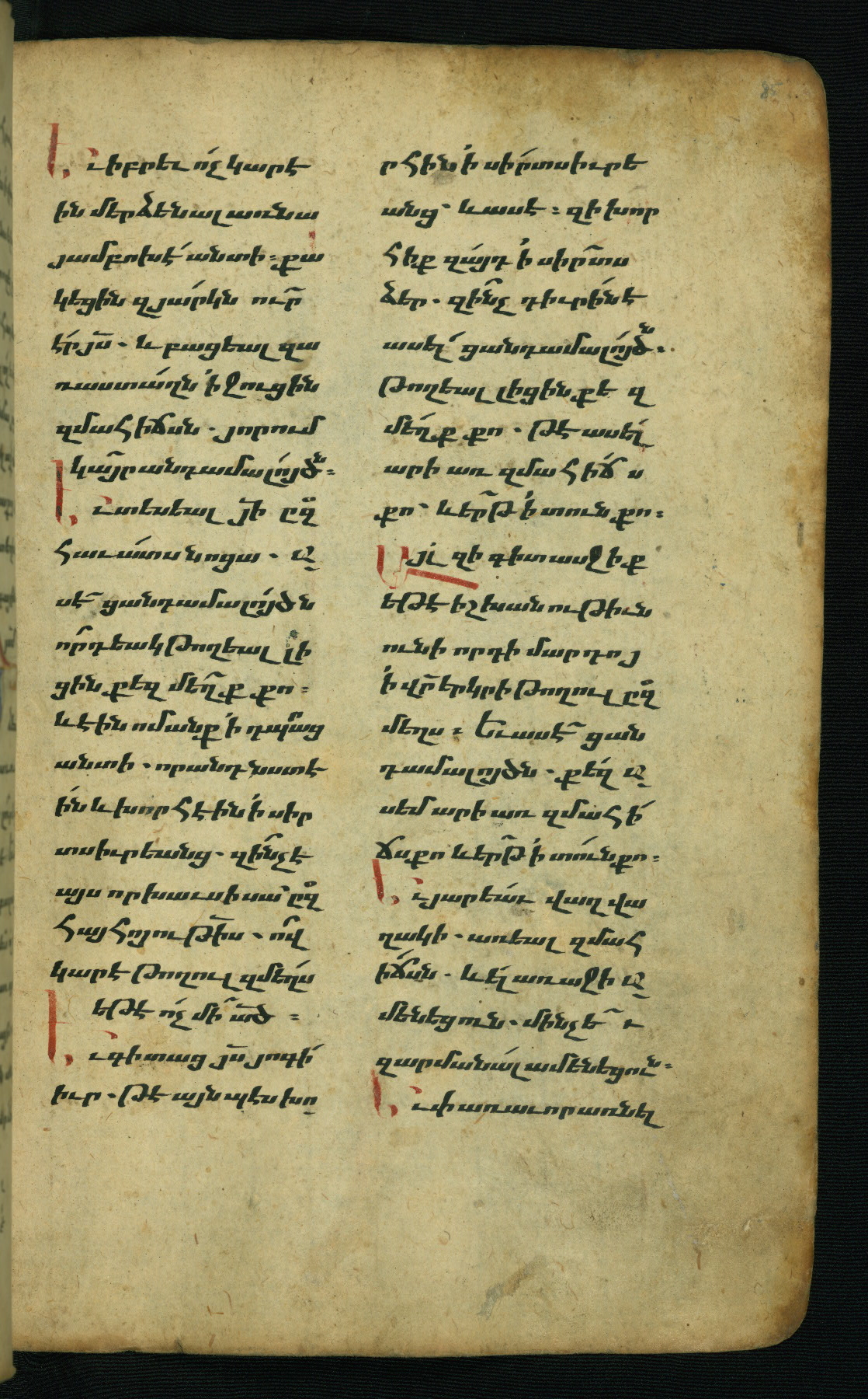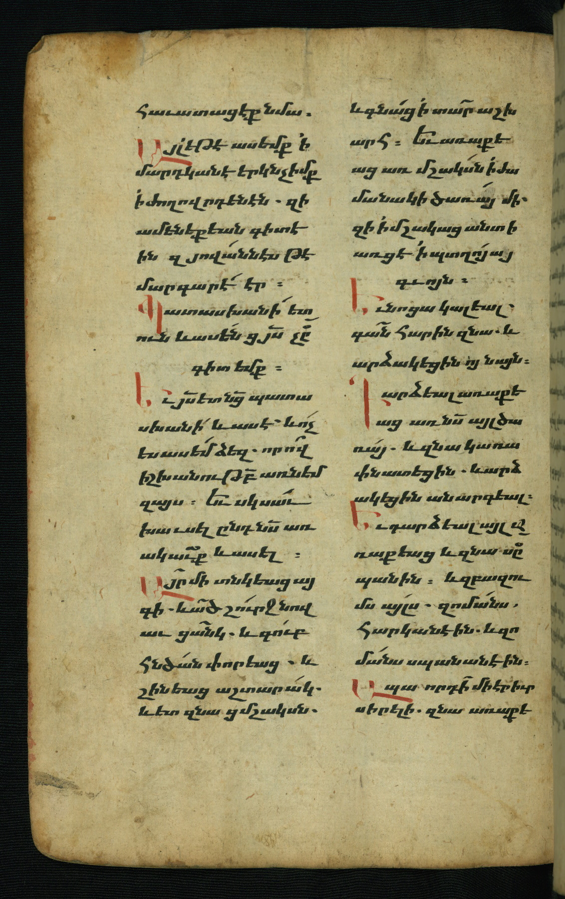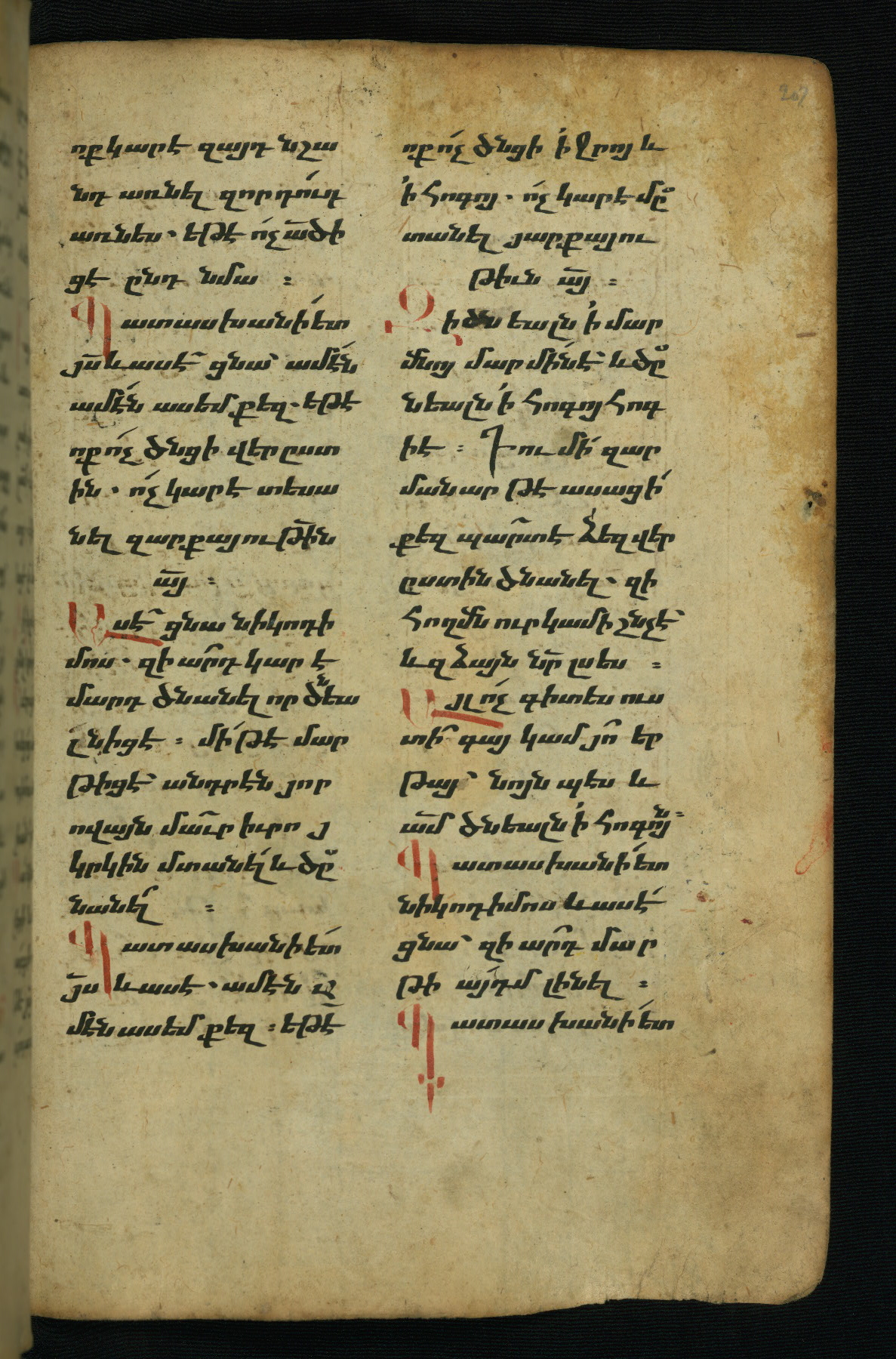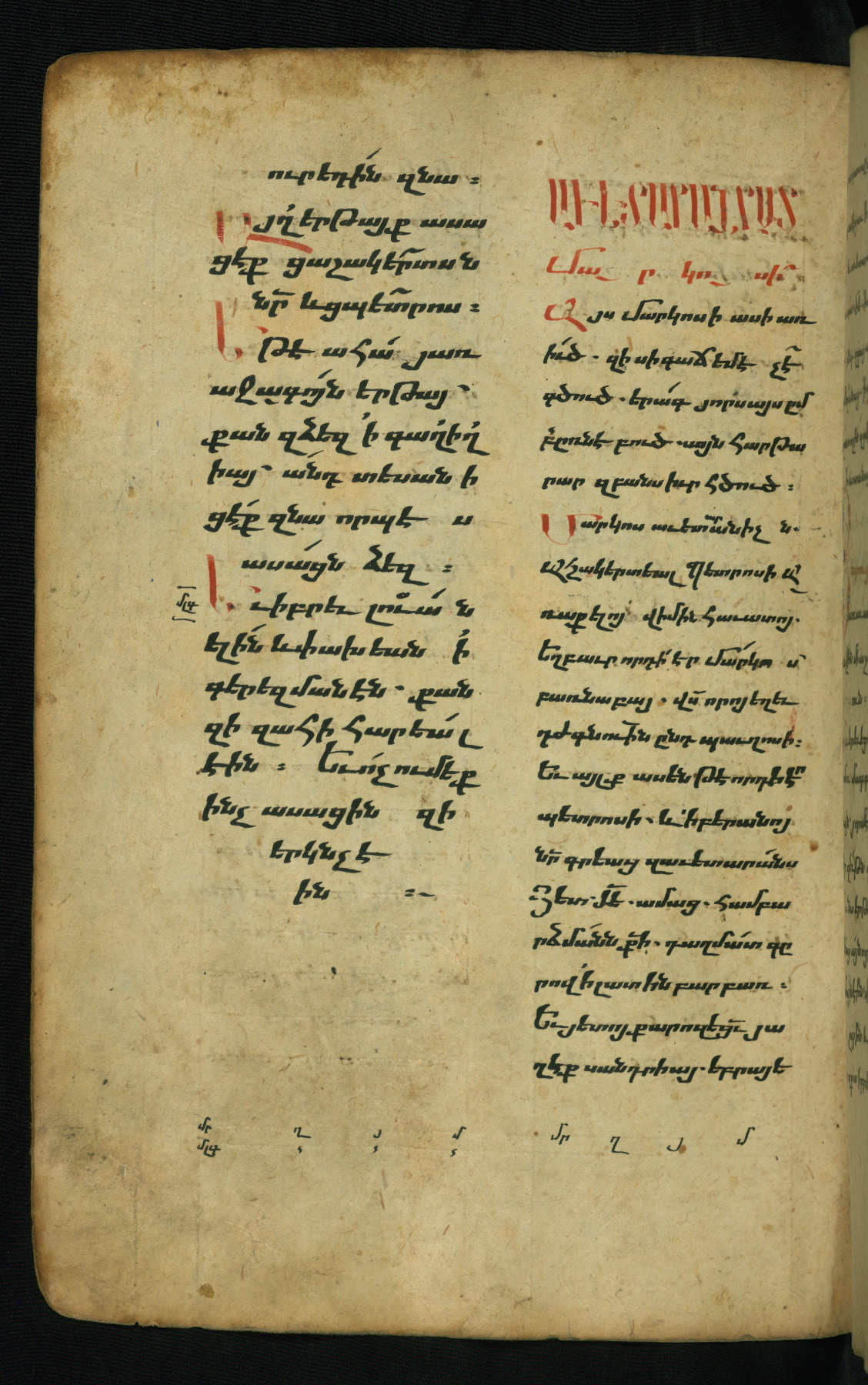 This manuscript was executed in 1475 CE by a scribe identified as Aristakes for a priest named Hakob. It contains a series of sixteen images on the life of Christ preceding the text of the Gospels, as well as the traditional Evangelist portraits, and there are marginal illustrations throughout. The style of the miniatures, which employ brilliant colors and emphasize decorative patterns, is characteristic of manuscript production in the region around Lake Van during the fifteenth century. The style of Lake Van has often been described in relation to schools of Islamic arts of the book. Numerous inscriptions (on fols. 258-260) spanning a few centuries attest to the manuscript's long history of use and revered preservation. The codex's later history included a rebinding with silver covers from Kayseri that date to approximately 1700. This jeweled and enameled silver binding bears a composition of the Adoration of the Magi on the front and the Ascension on the back.
