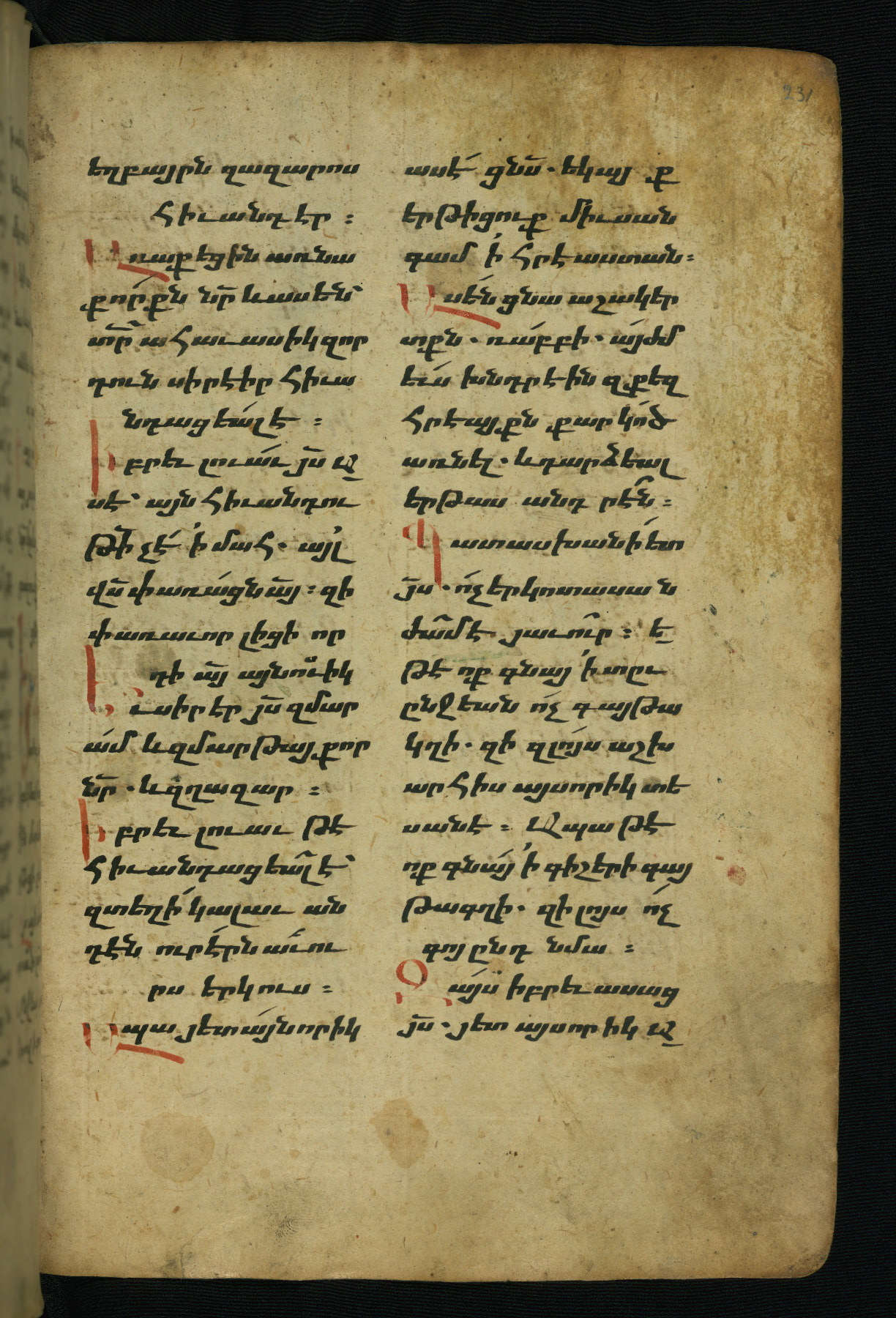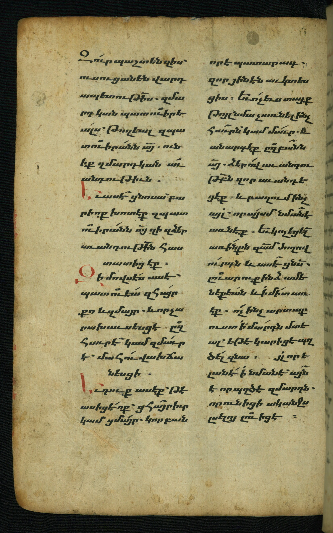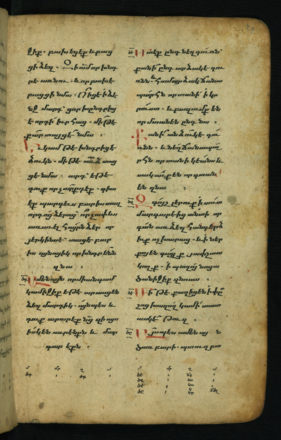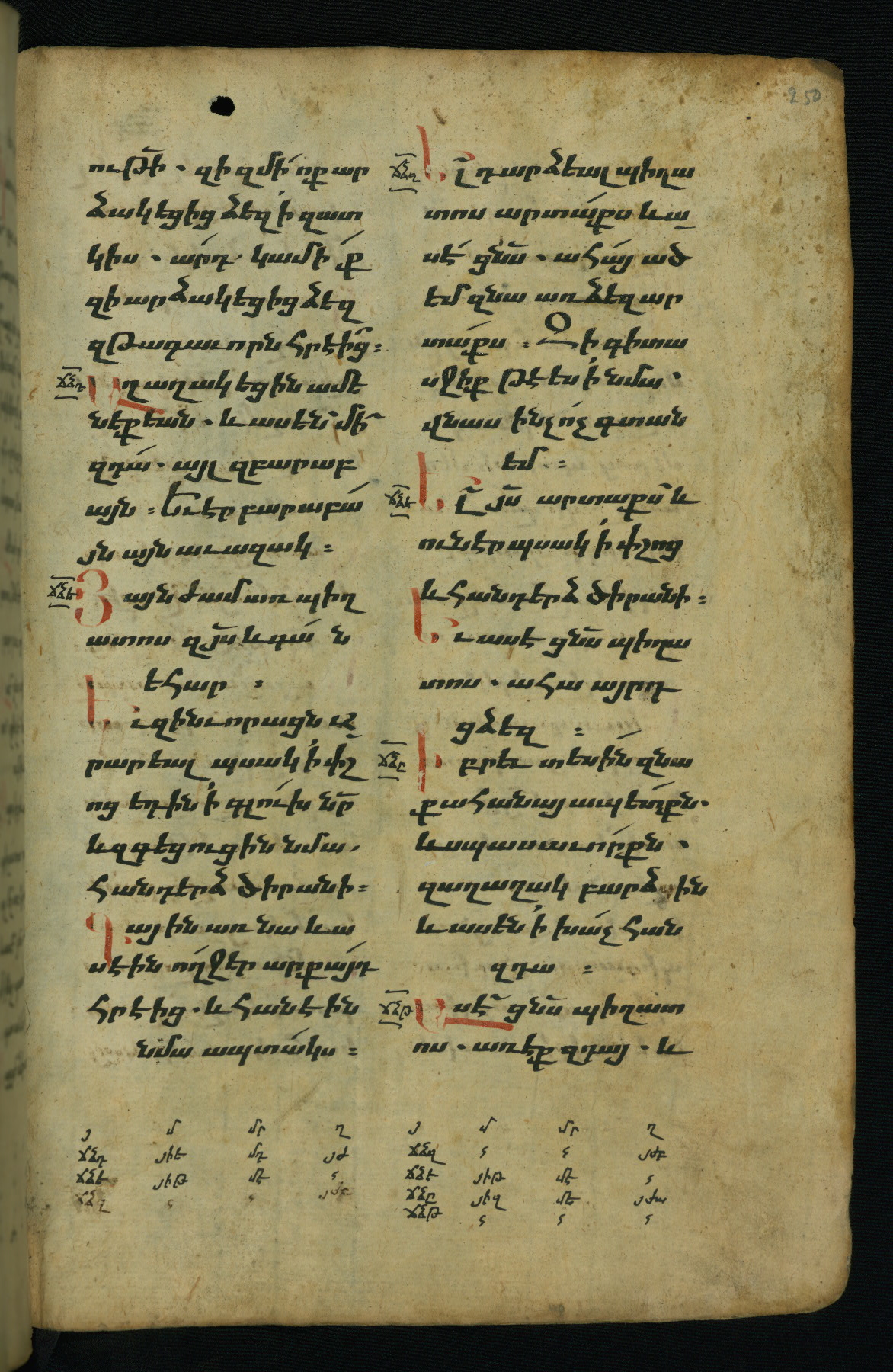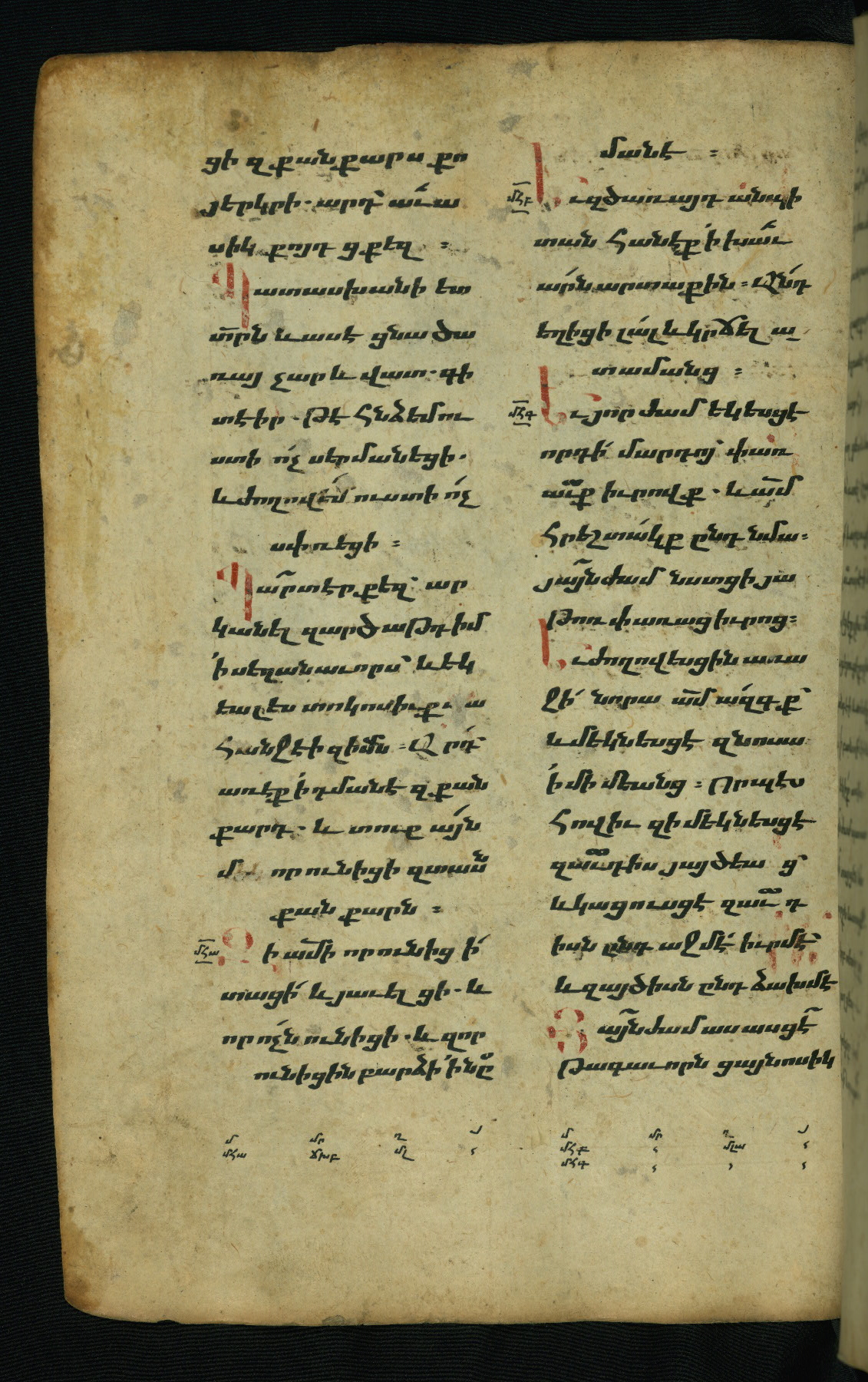 This manuscript was executed in 1475 CE by a scribe identified as Aristakes for a priest named Hakob. It contains a series of sixteen images on the life of Christ preceding the text of the Gospels, as well as the traditional Evangelist portraits, and there are marginal illustrations throughout. The style of the miniatures, which employ brilliant colors and emphasize decorative patterns, is characteristic of manuscript production in the region around Lake Van during the fifteenth century. The style of Lake Van has often been described in relation to schools of Islamic arts of the book. Numerous inscriptions (on fols. 258-260) spanning a few centuries attest to the manuscript's long history of use and revered preservation. The codex's later history included a rebinding with silver covers from Kayseri that date to approximately 1700. This jeweled and enameled silver binding bears a composition of the Adoration of the Magi on the front and the Ascension on the back.