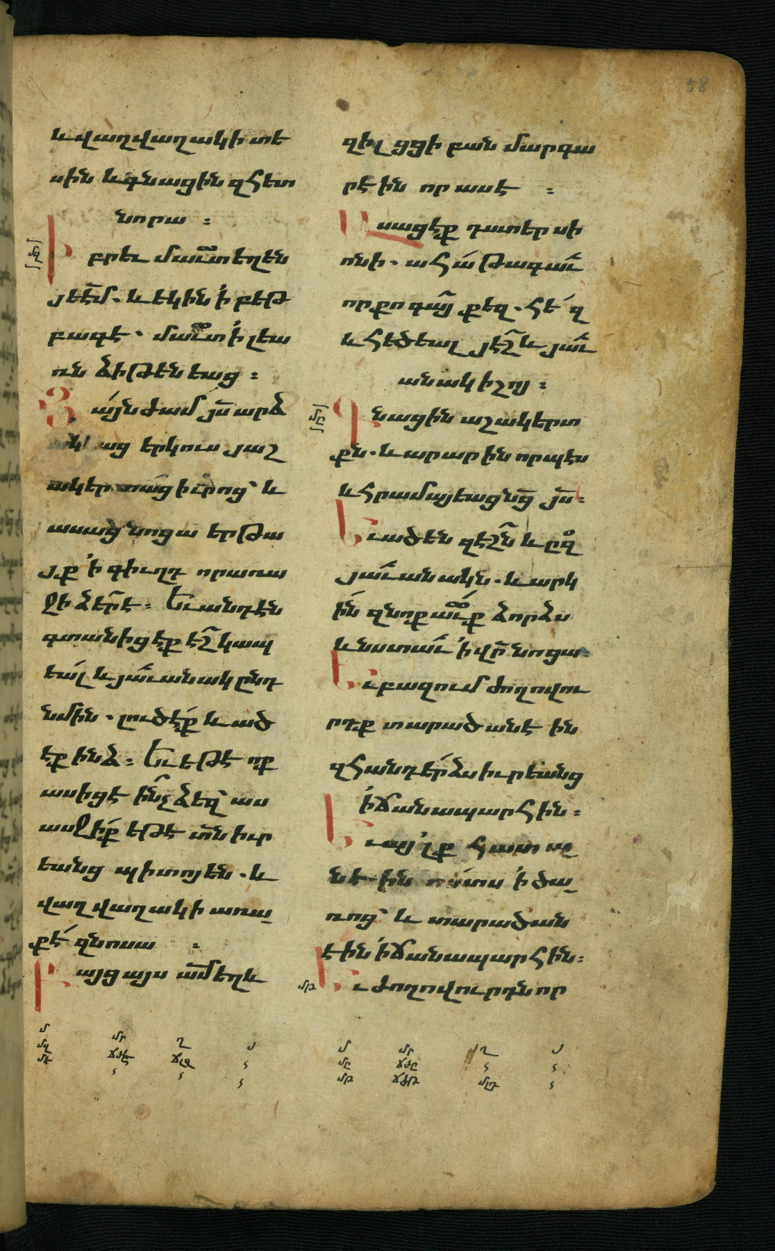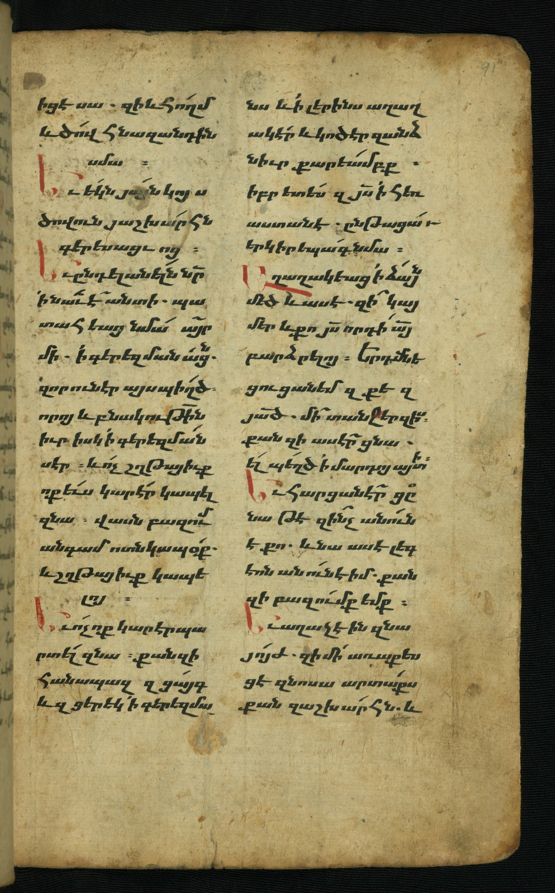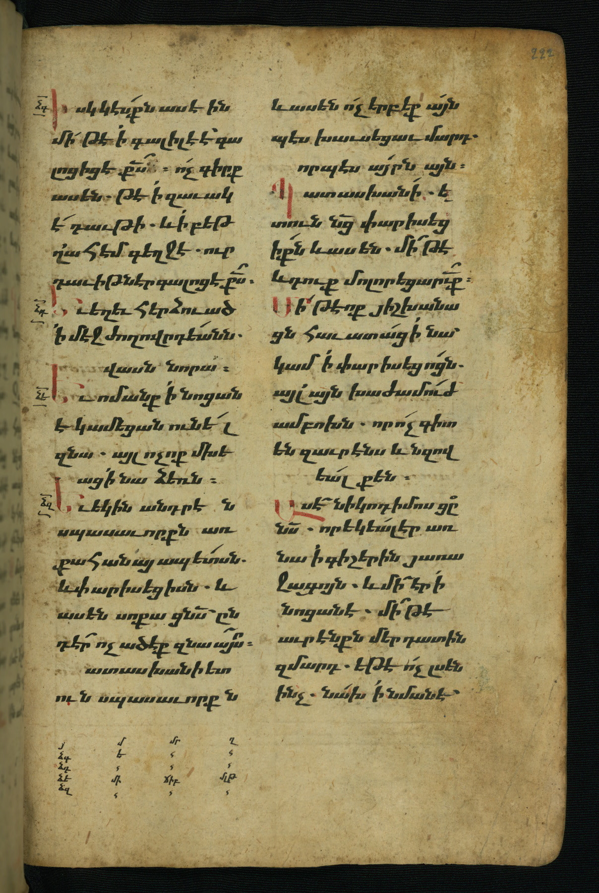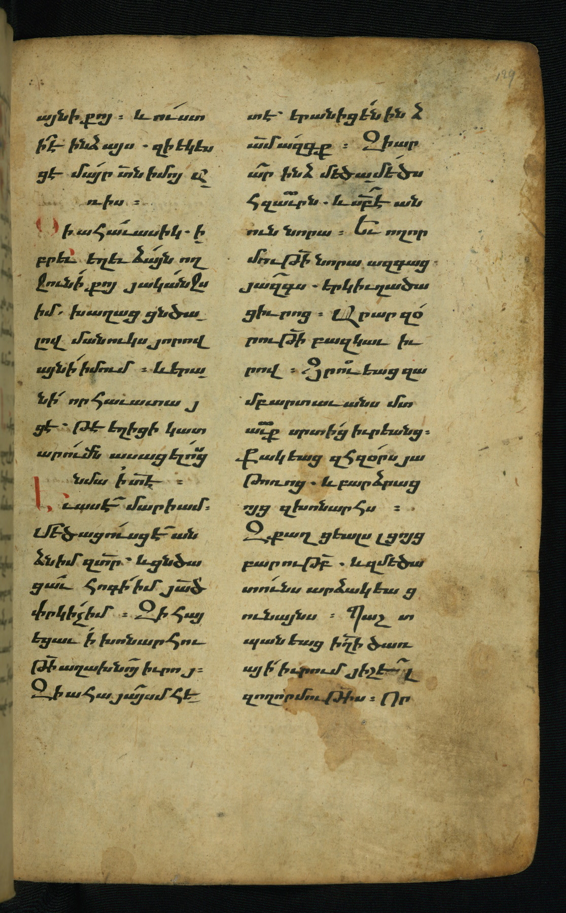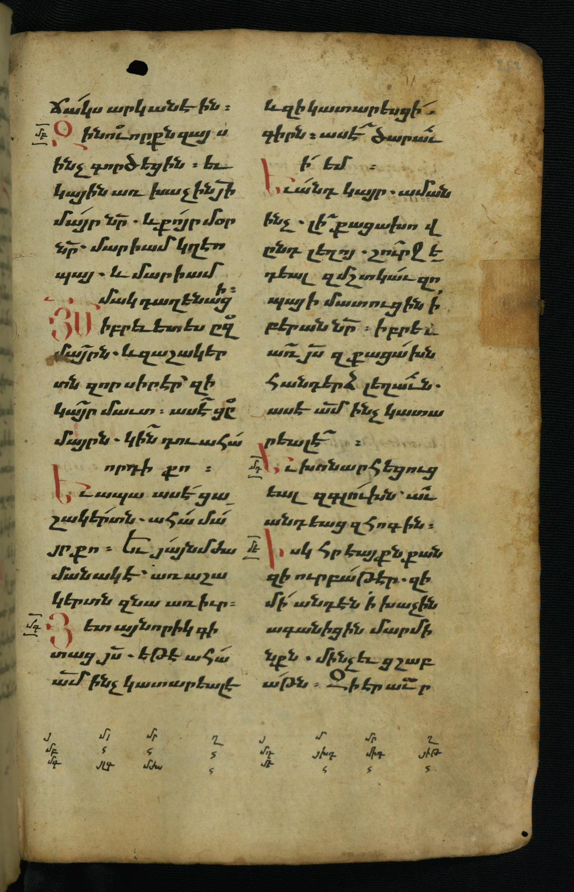 This manuscript was executed in 1475 CE by a scribe identified as Aristakes for a priest named Hakob. It contains a series of sixteen images on the life of Christ preceding the text of the Gospels, as well as the traditional Evangelist portraits, and there are marginal illustrations throughout. The style of the miniatures, which employ brilliant colors and emphasize decorative patterns, is characteristic of manuscript production in the region around Lake Van during the fifteenth century. The style of Lake Van has often been described in relation to schools of Islamic arts of the book. Numerous inscriptions (on fols. 258-260) spanning a few centuries attest to the manuscript's long history of use and revered preservation. The codex's later history included a rebinding with silver covers from Kayseri that date to approximately 1700. This jeweled and enameled silver binding bears a composition of the Adoration of the Magi on the front and the Ascension on the back.