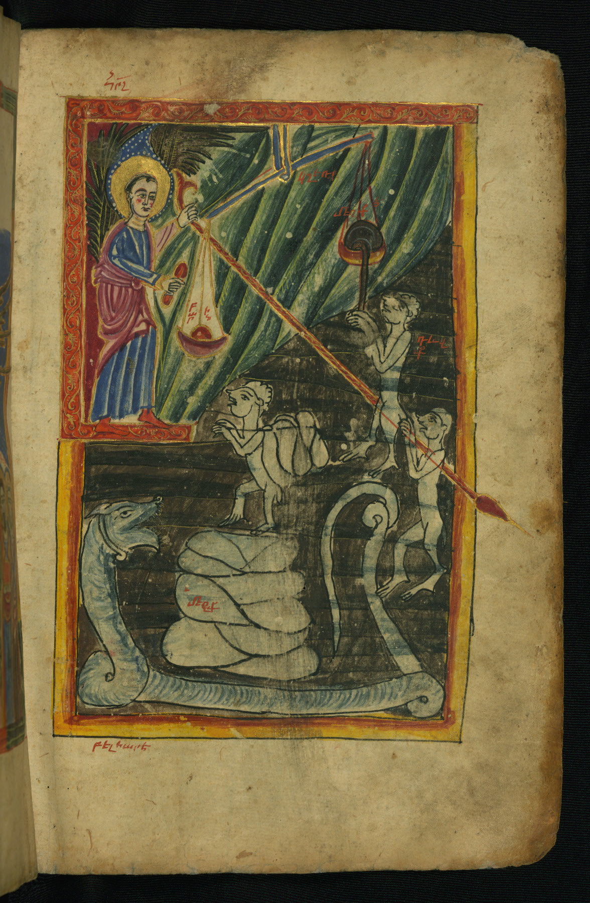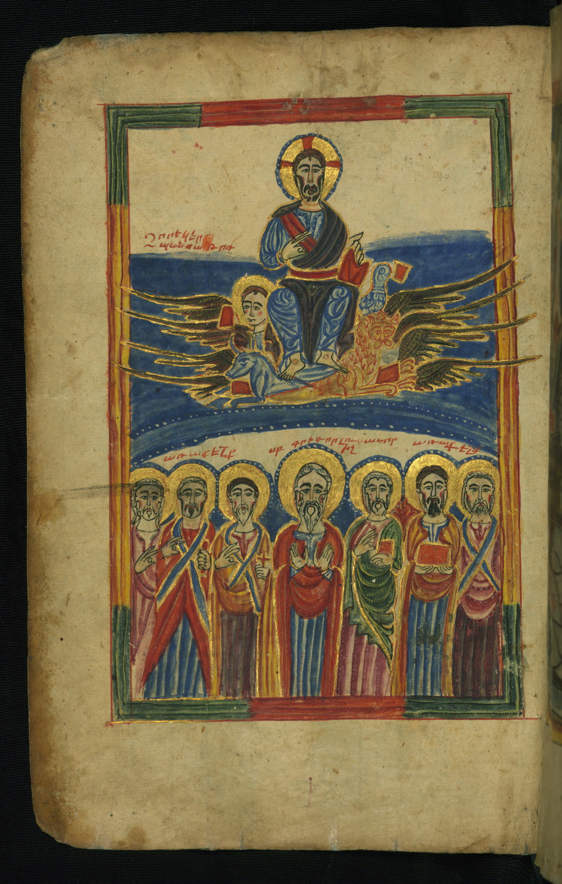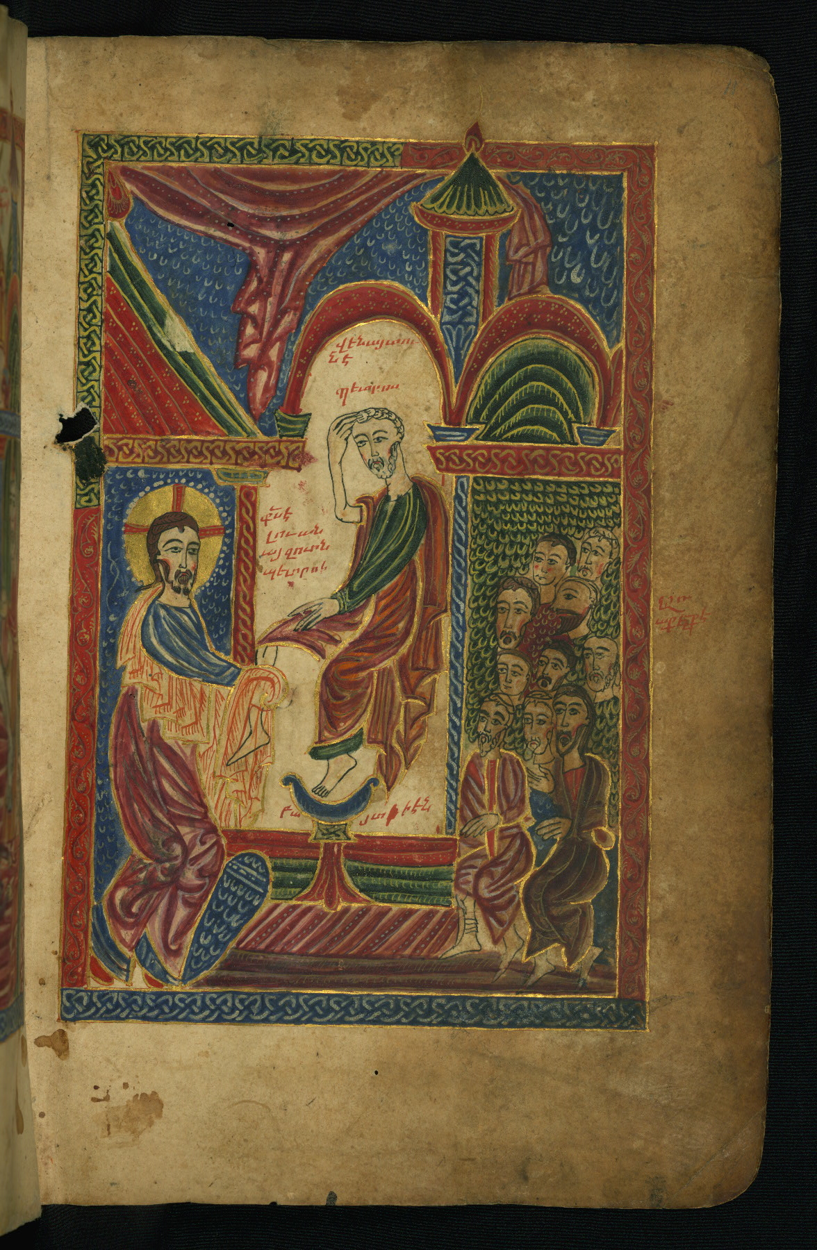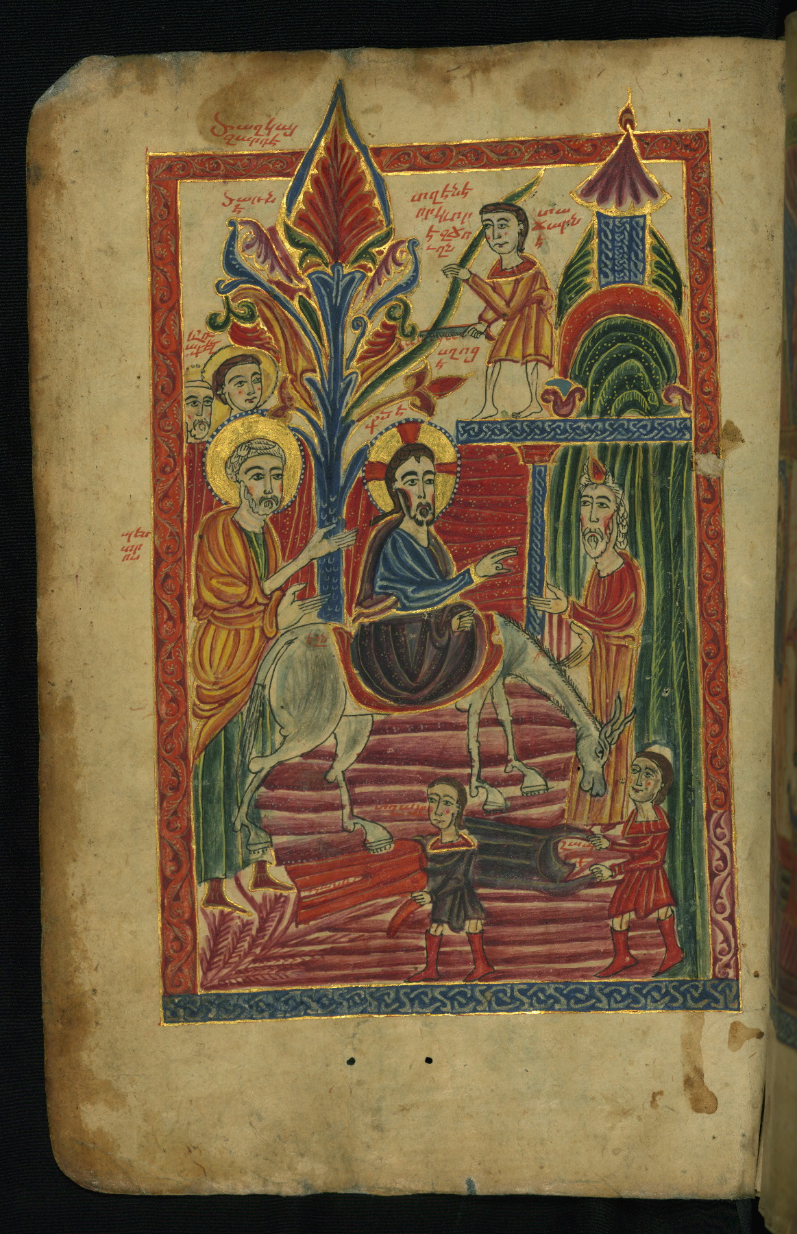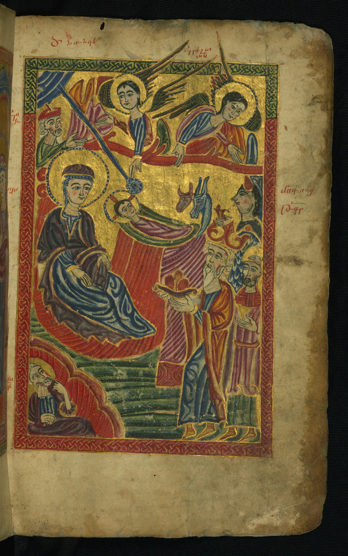 This manuscript was executed in 1475 CE by a scribe identified as Aristakes for a priest named Hakob. It contains a series of sixteen images on the life of Christ preceding the text of the Gospels, as well as the traditional Evangelist portraits, and there are marginal illustrations throughout. The style of the miniatures, which employ brilliant colors and emphasize decorative patterns, is characteristic of manuscript production in the region around Lake Van during the fifteenth century. The style of Lake Van has often been described in relation to schools of Islamic arts of the book. Numerous inscriptions (on fols. 258-260) spanning a few centuries attest to the manuscript's long history of use and revered preservation. The codex's later history included a rebinding with silver covers from Kayseri that date to approximately 1700. This jeweled and enameled silver binding bears a composition of the Adoration of the Magi on the front and the Ascension on the back.