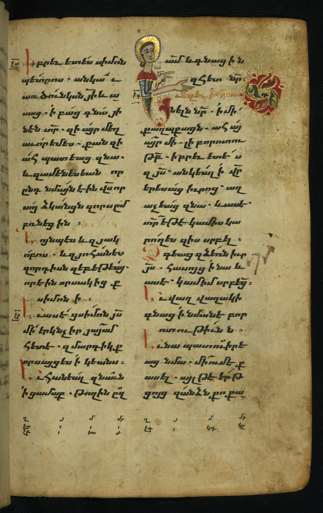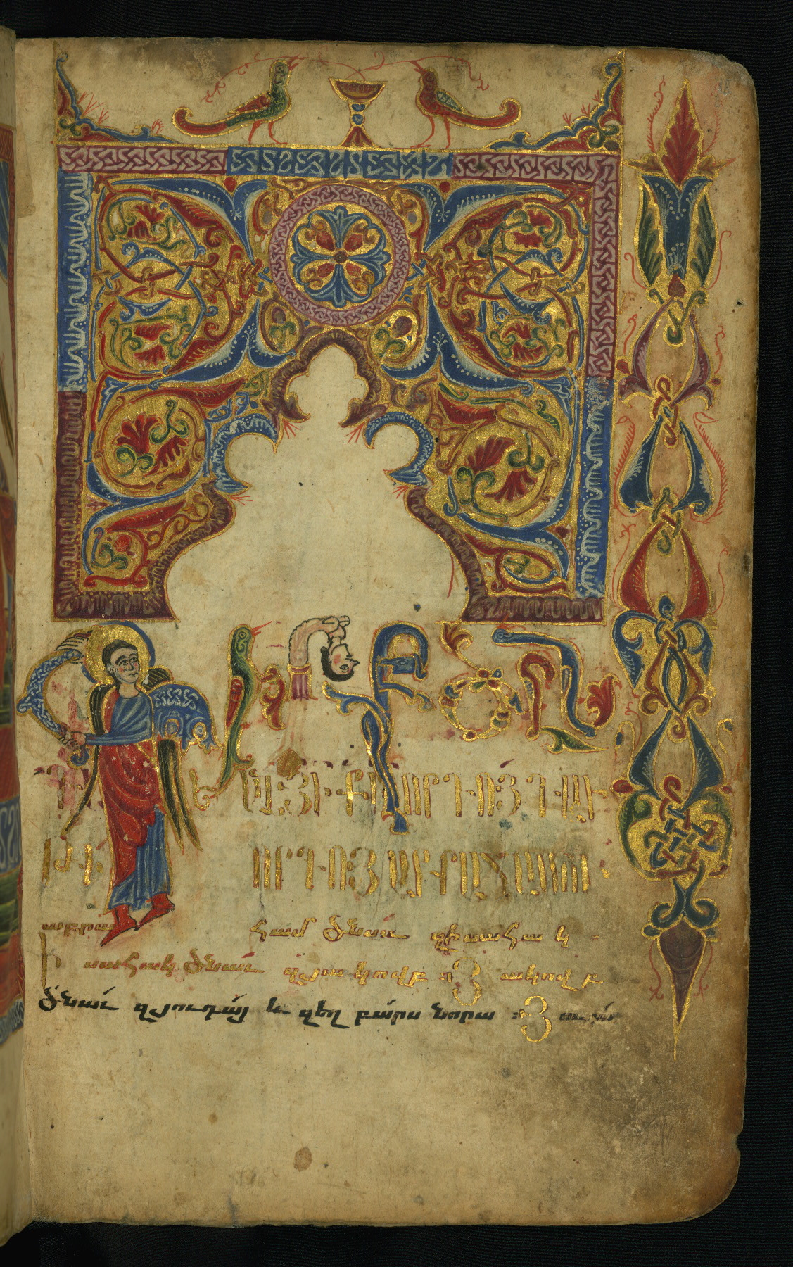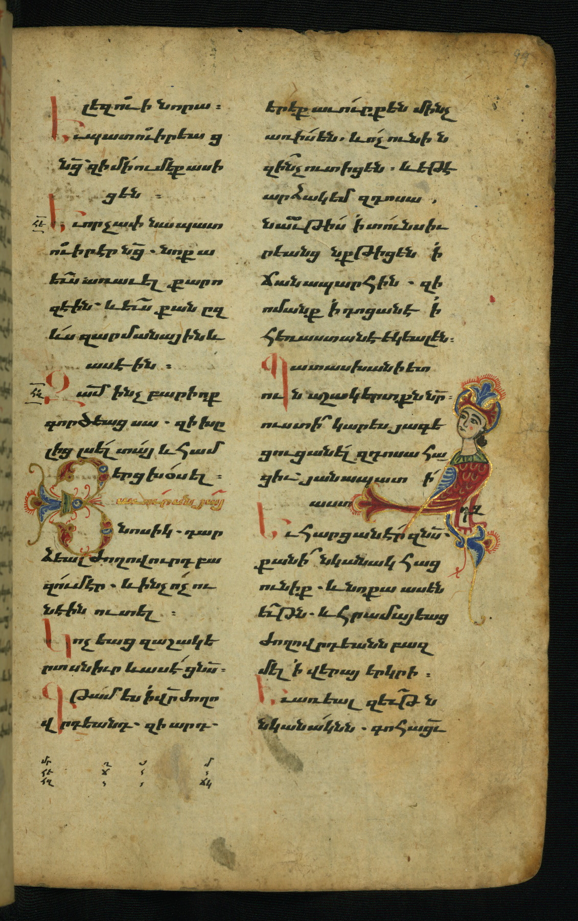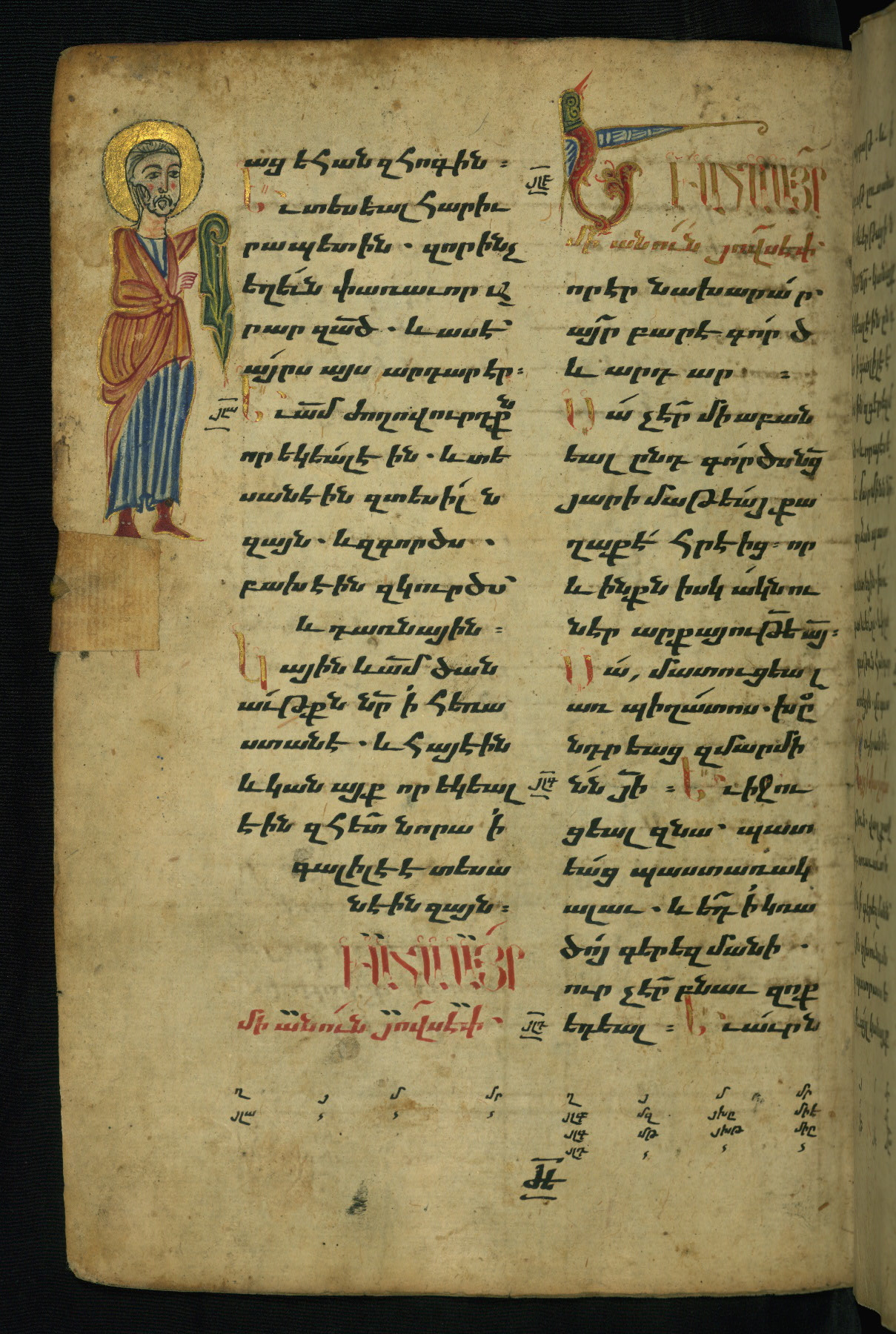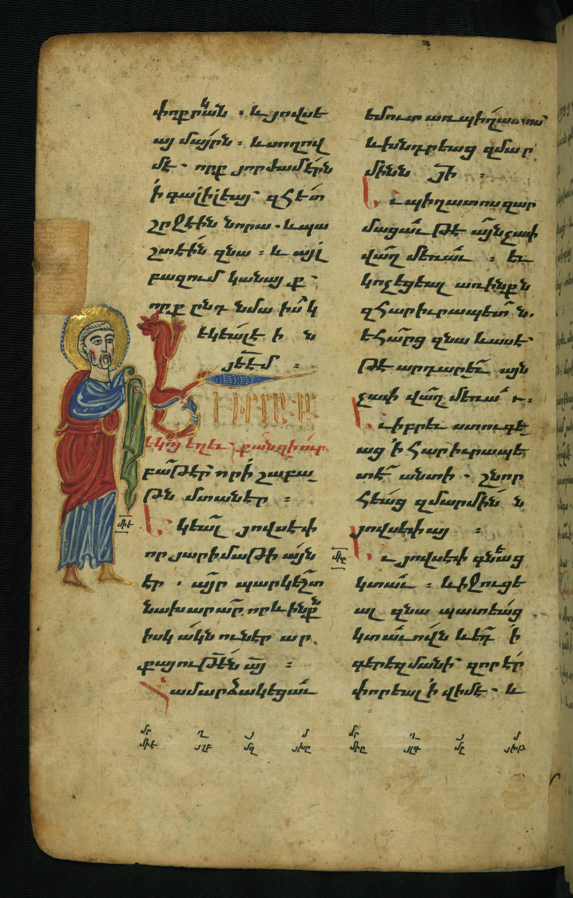 - Hand note: Bolorgir (miniscule) for the text of the Gospels; erkat’agir (uncial) for letters introducing verses; upright erkat’agir (uncial) for the flyleaves and endleaves, which are from a thirteenth-century Gospel Book