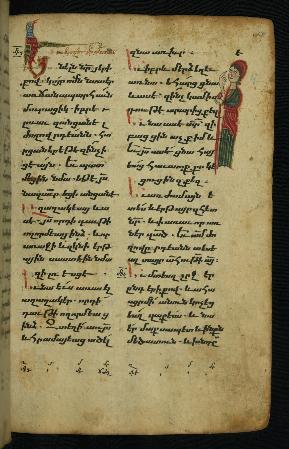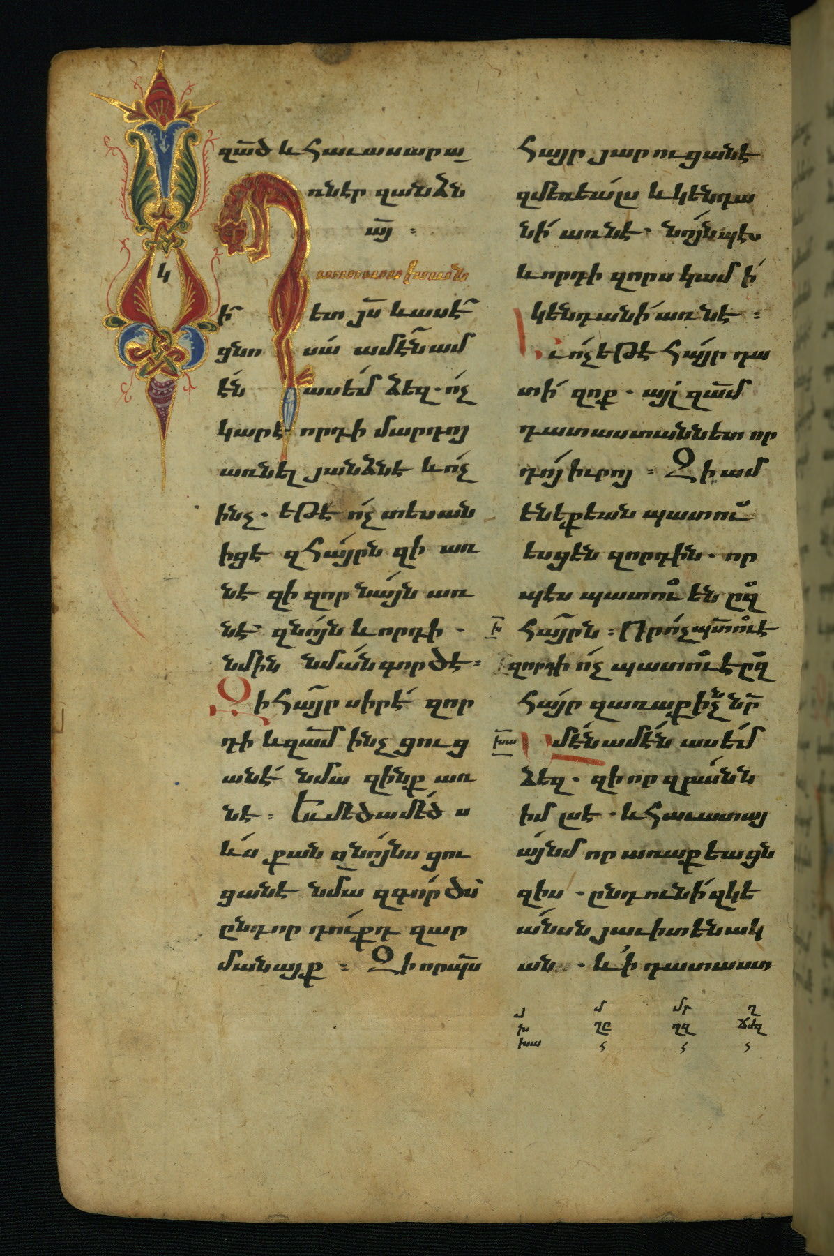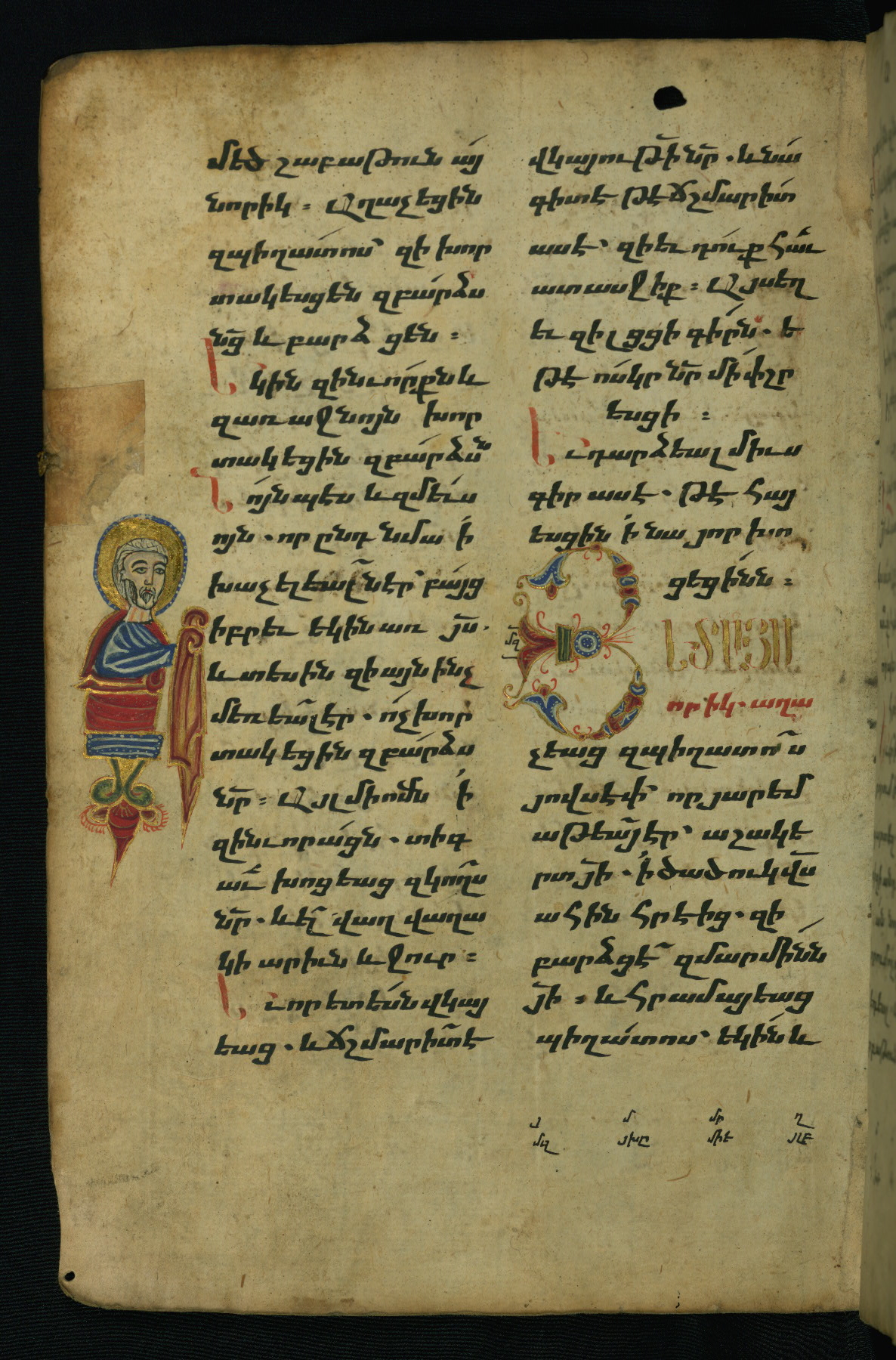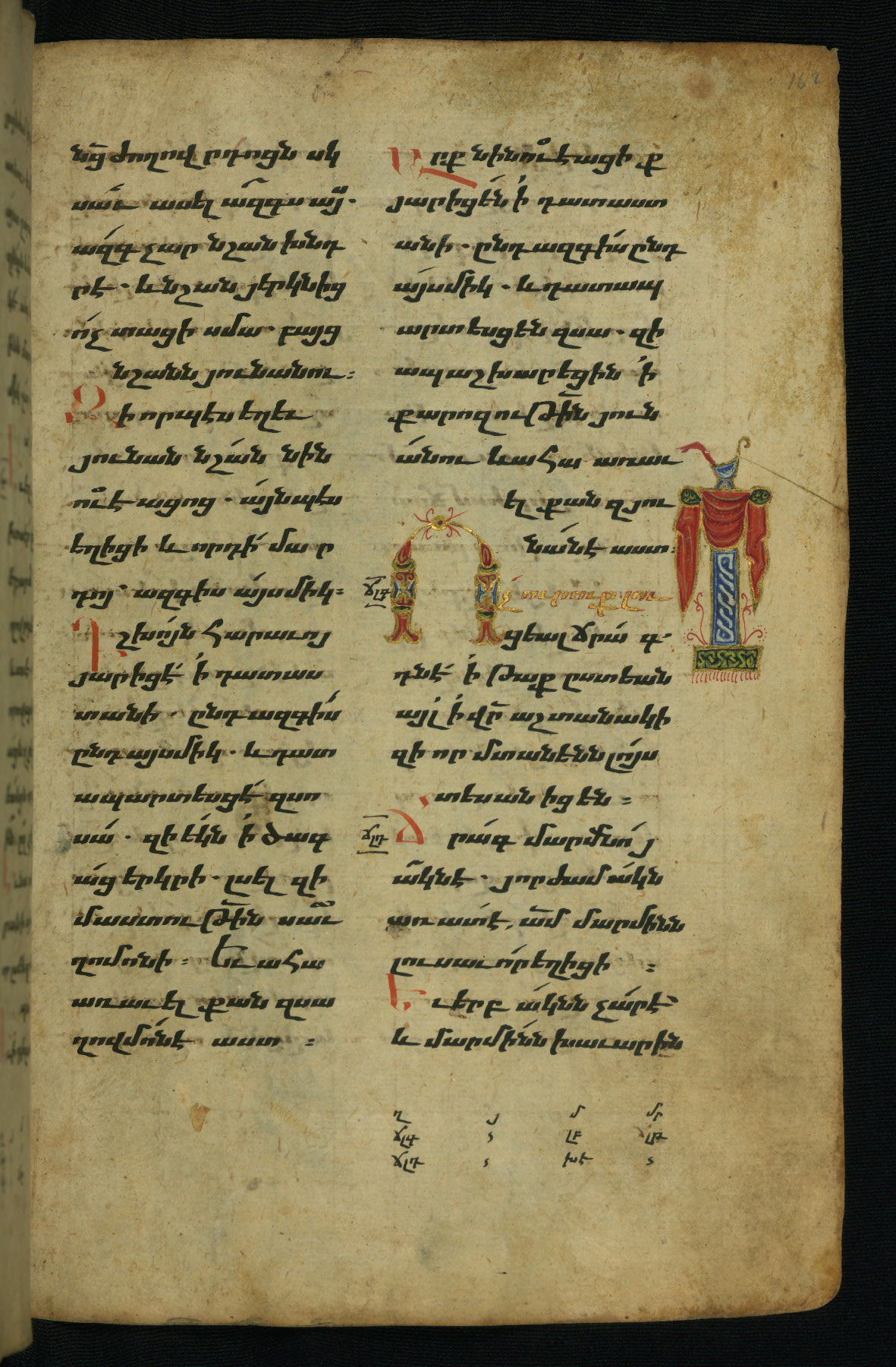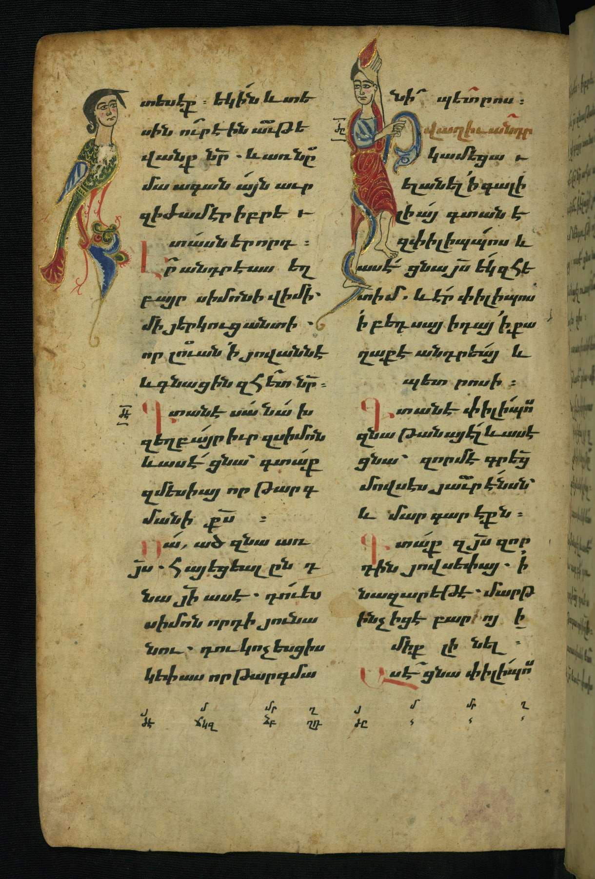- Hand note: Bolorgir (miniscule) for the text of the Gospels; erkat’agir (uncial) for letters introducing verses; upright erkat’agir (uncial) for the flyleaves and endleaves, which are from a thirteenth-century Gospel Book