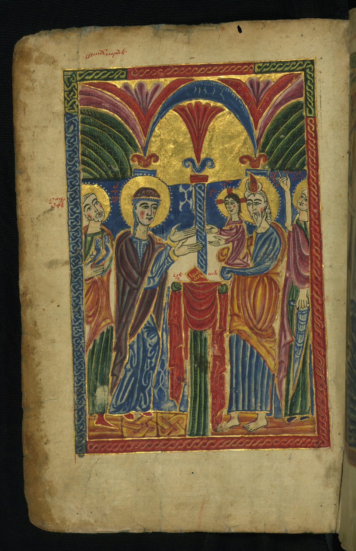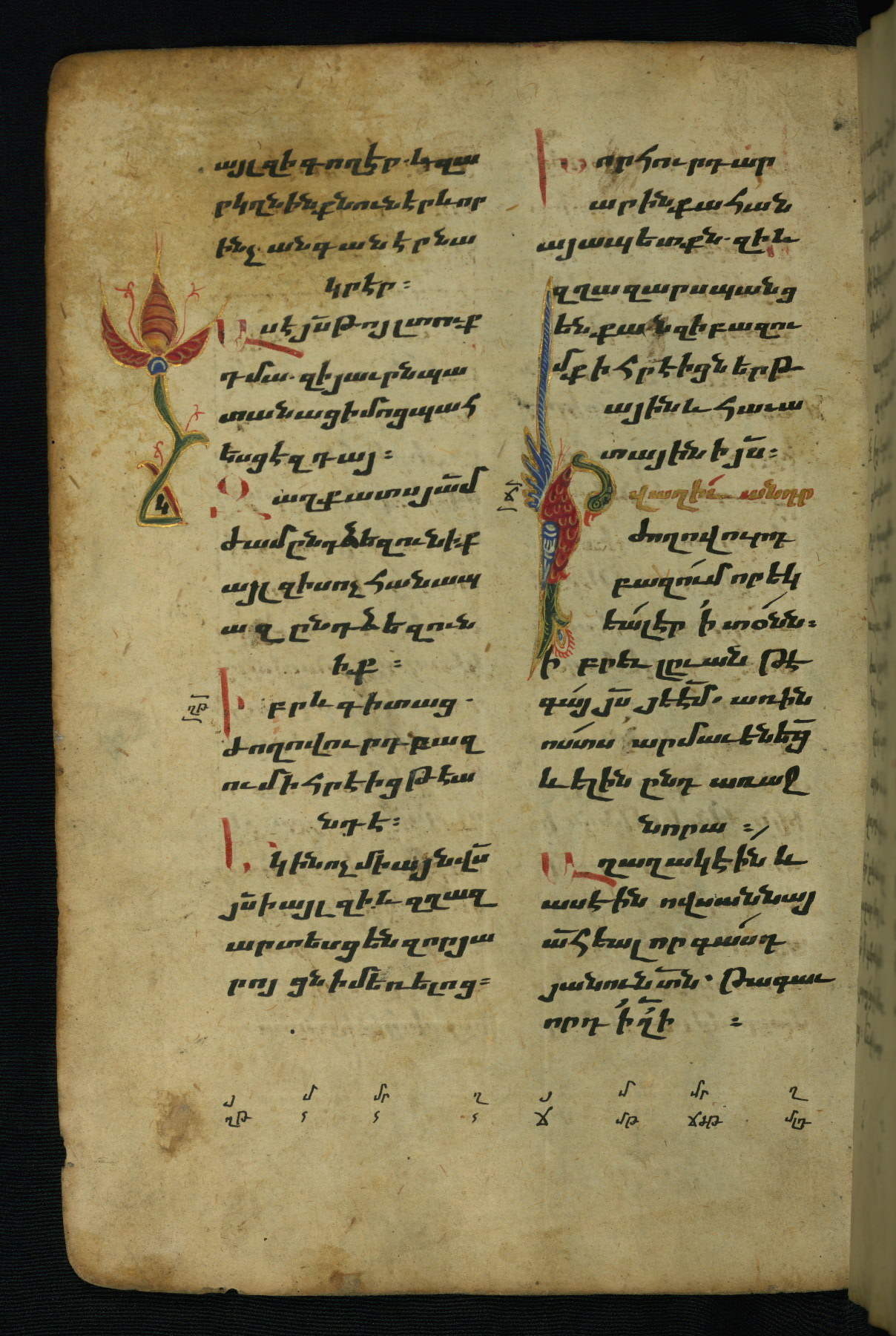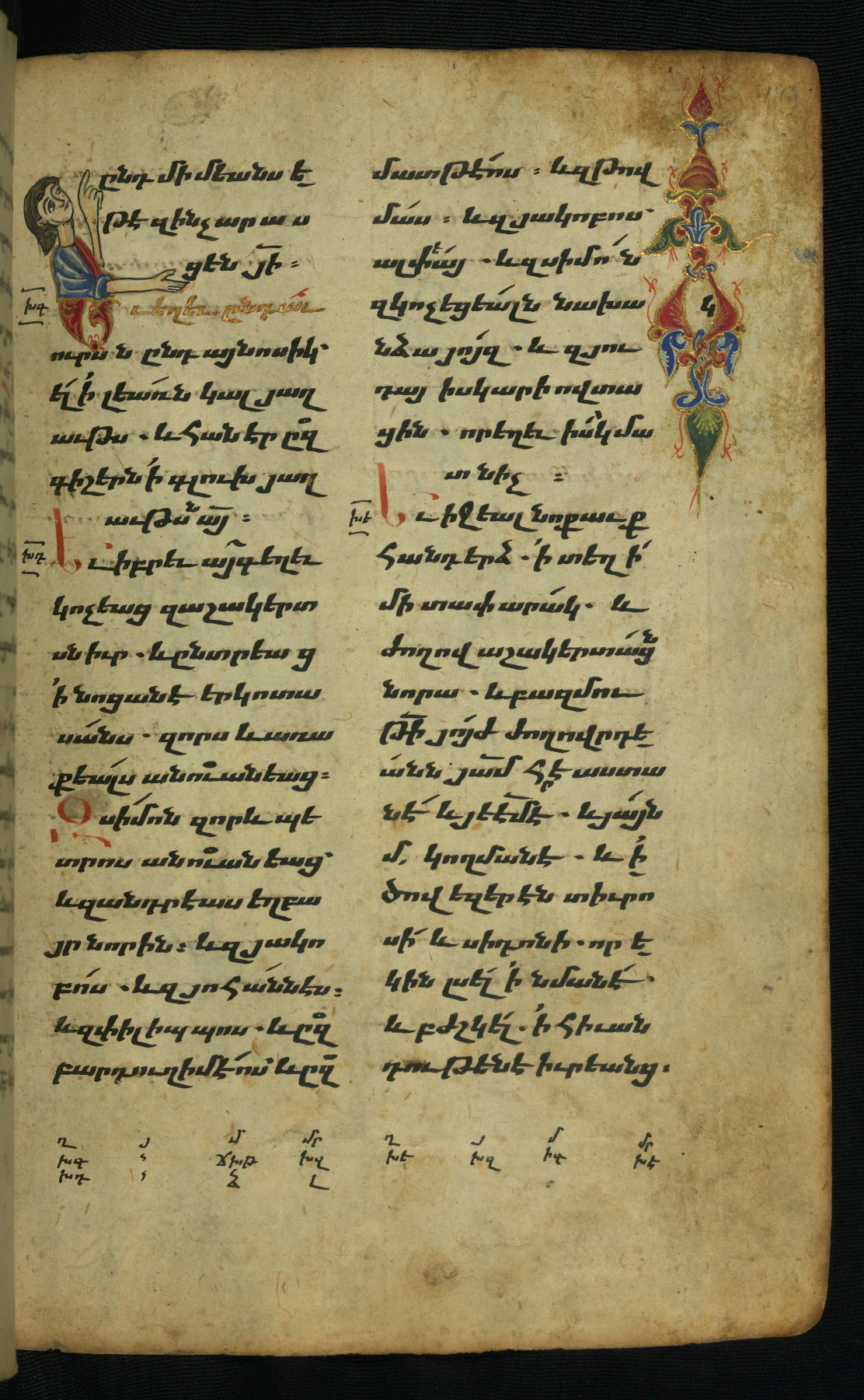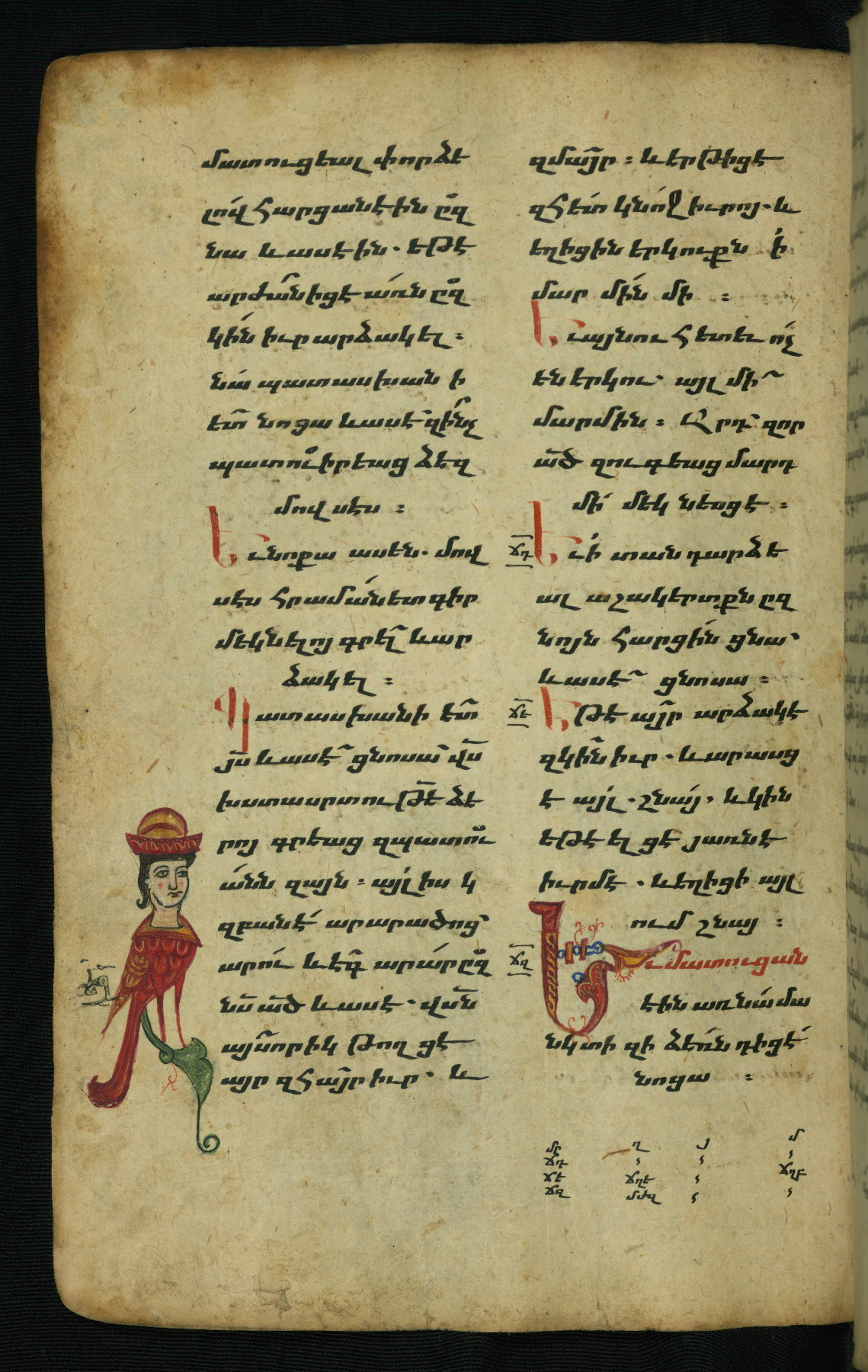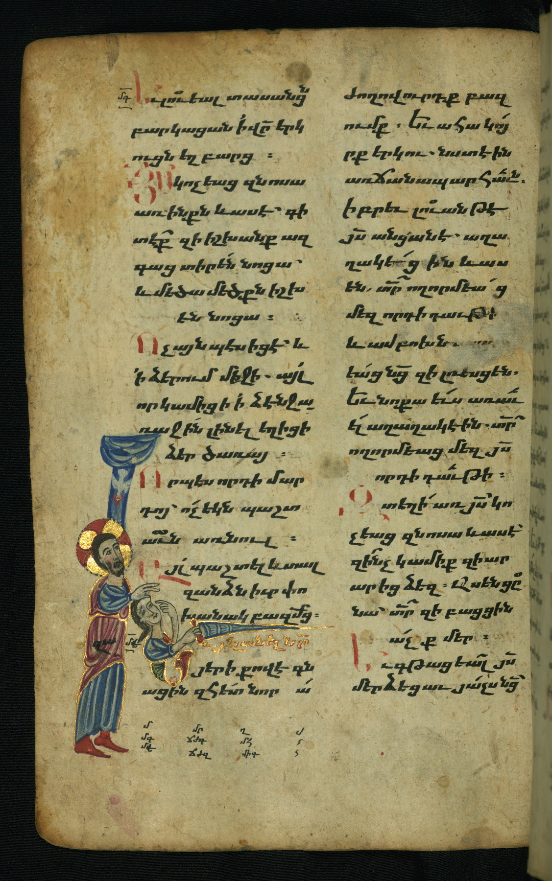 - Hand note: Bolorgir (miniscule) for the text of the Gospels; erkat’agir (uncial) for letters introducing verses; upright erkat’agir (uncial) for the flyleaves and endleaves, which are from a thirteenth-century Gospel Book