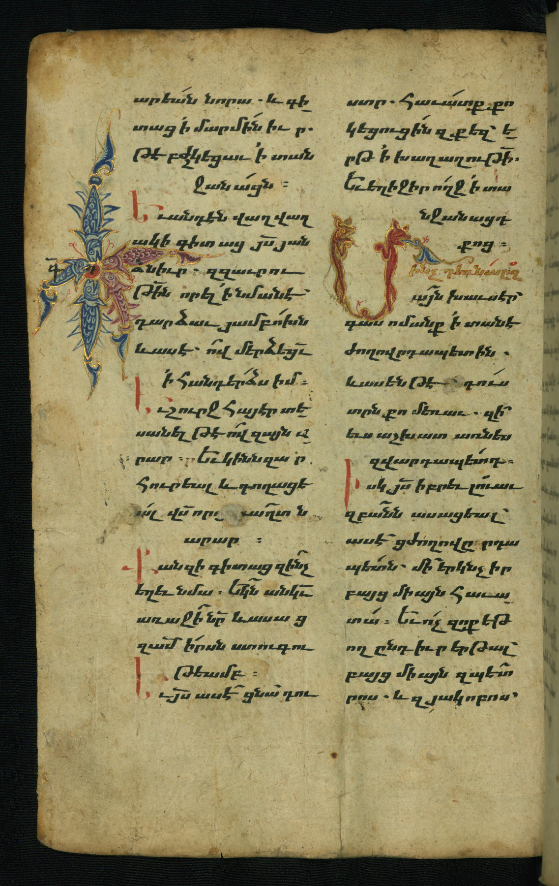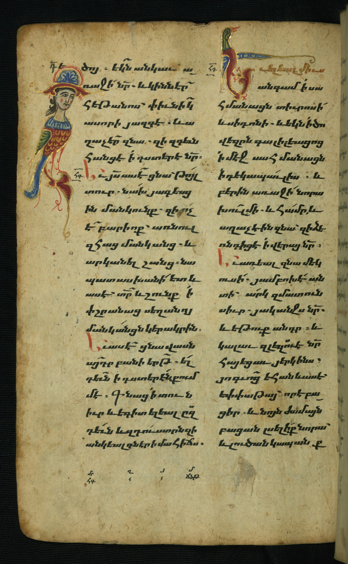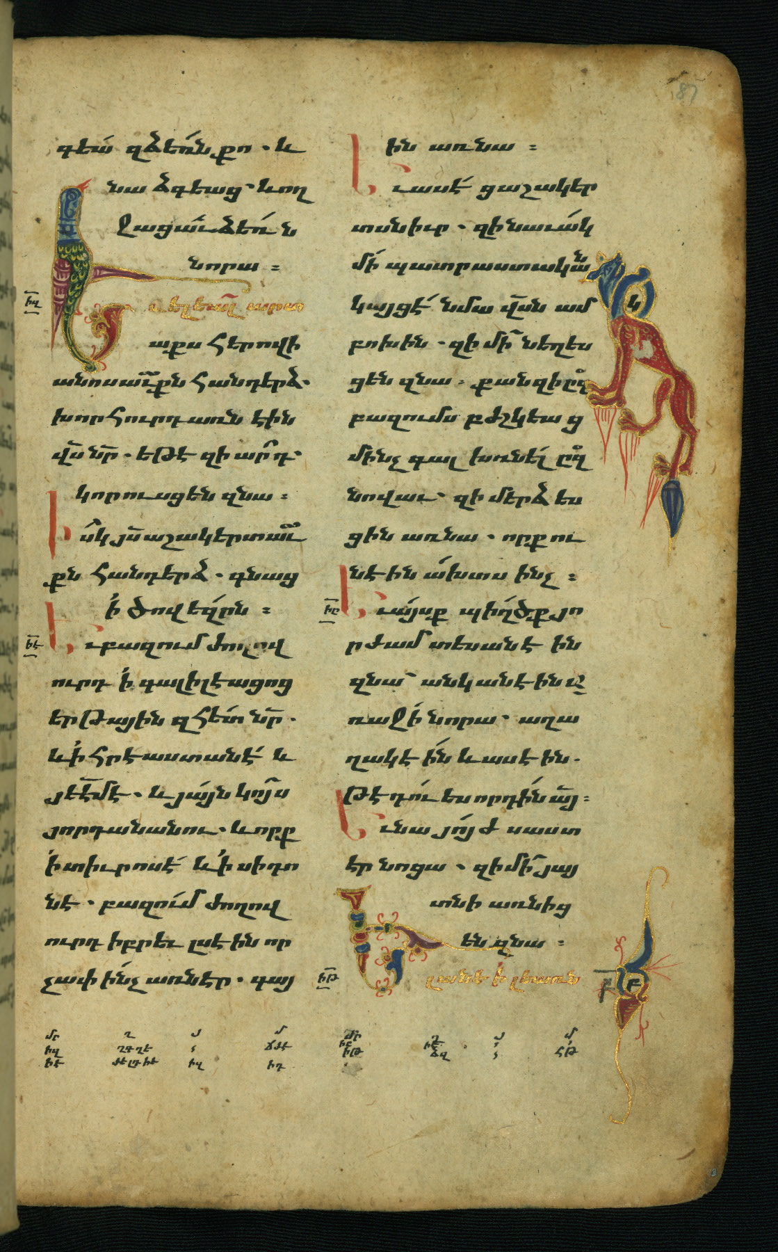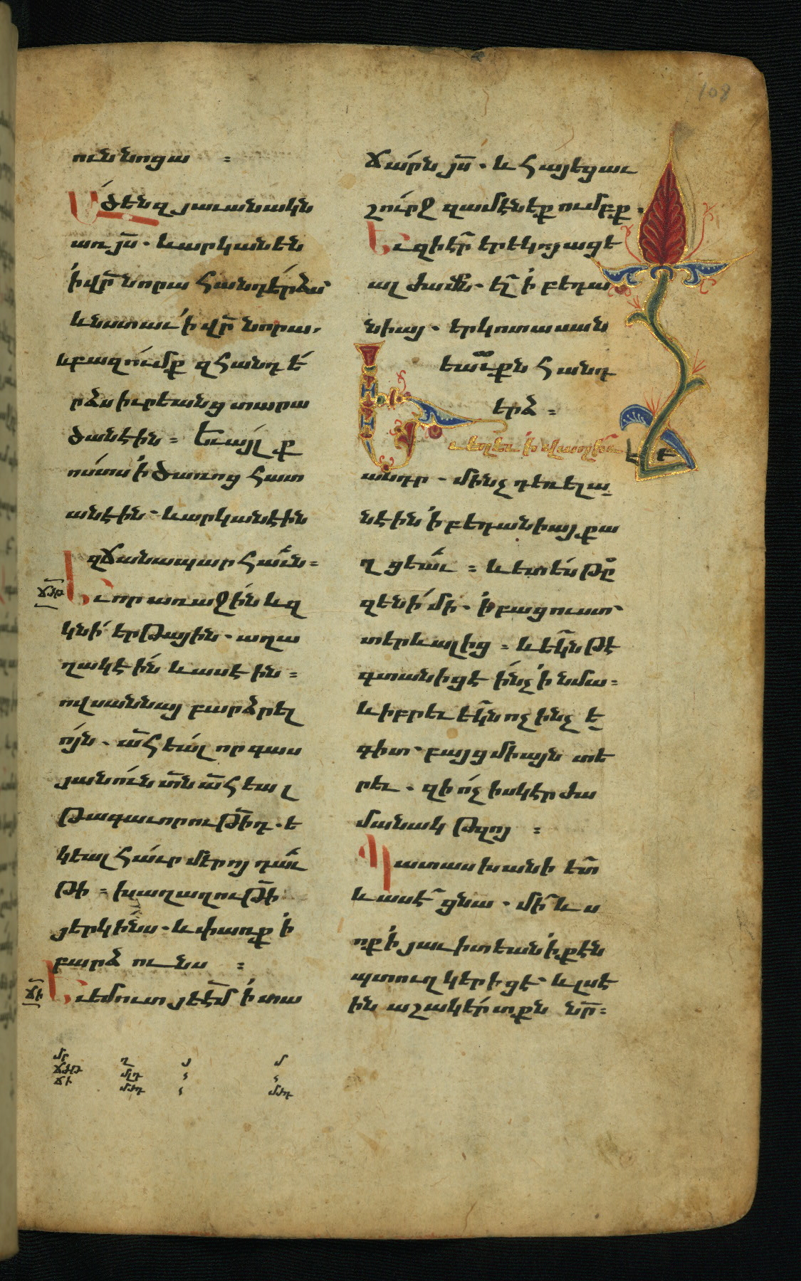 - Hand note: Bolorgir (miniscule) for the text of the Gospels; erkat’agir (uncial) for letters introducing verses; upright erkat’agir (uncial) for the flyleaves and endleaves, which are from a thirteenth-century Gospel Book