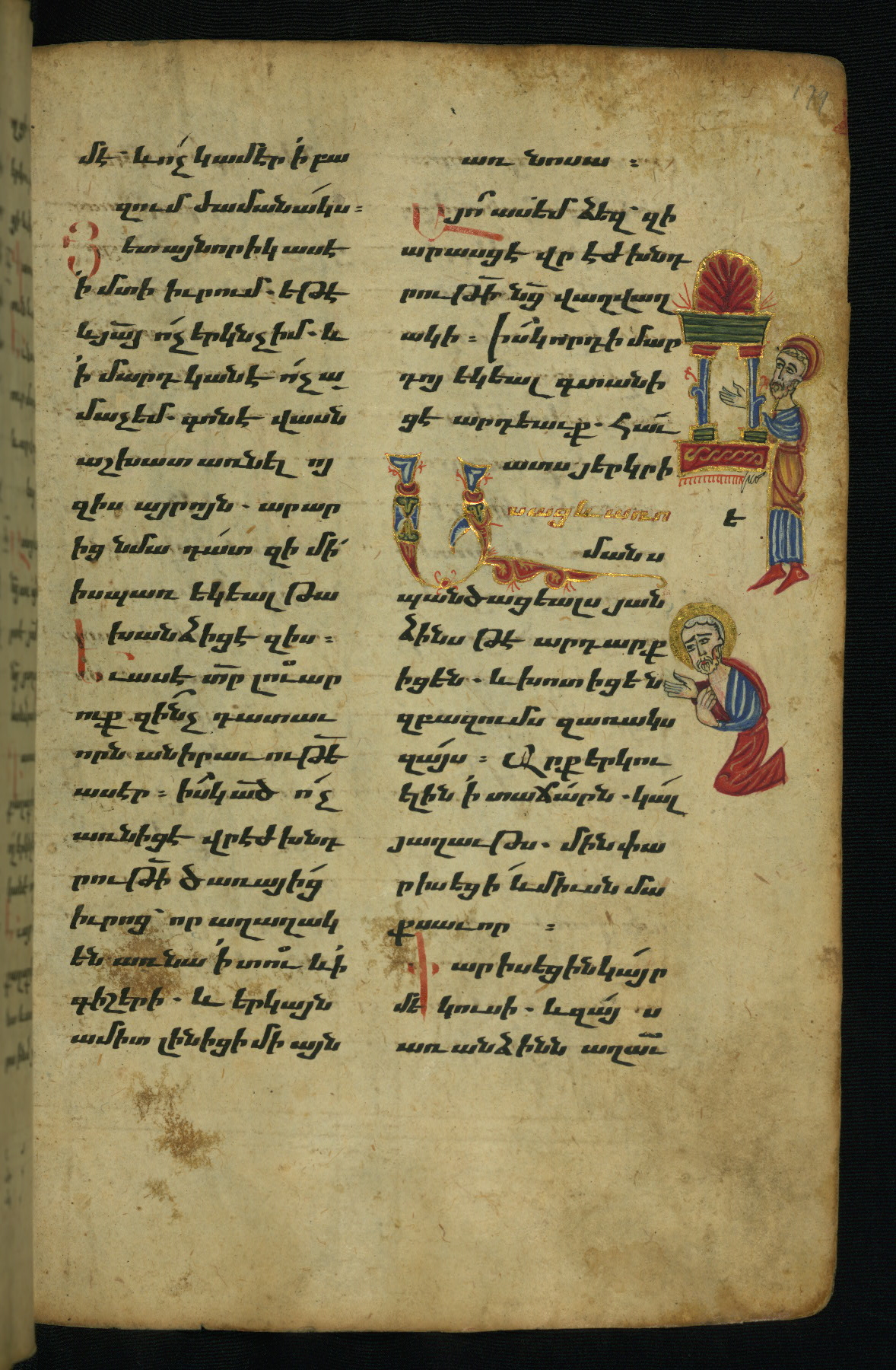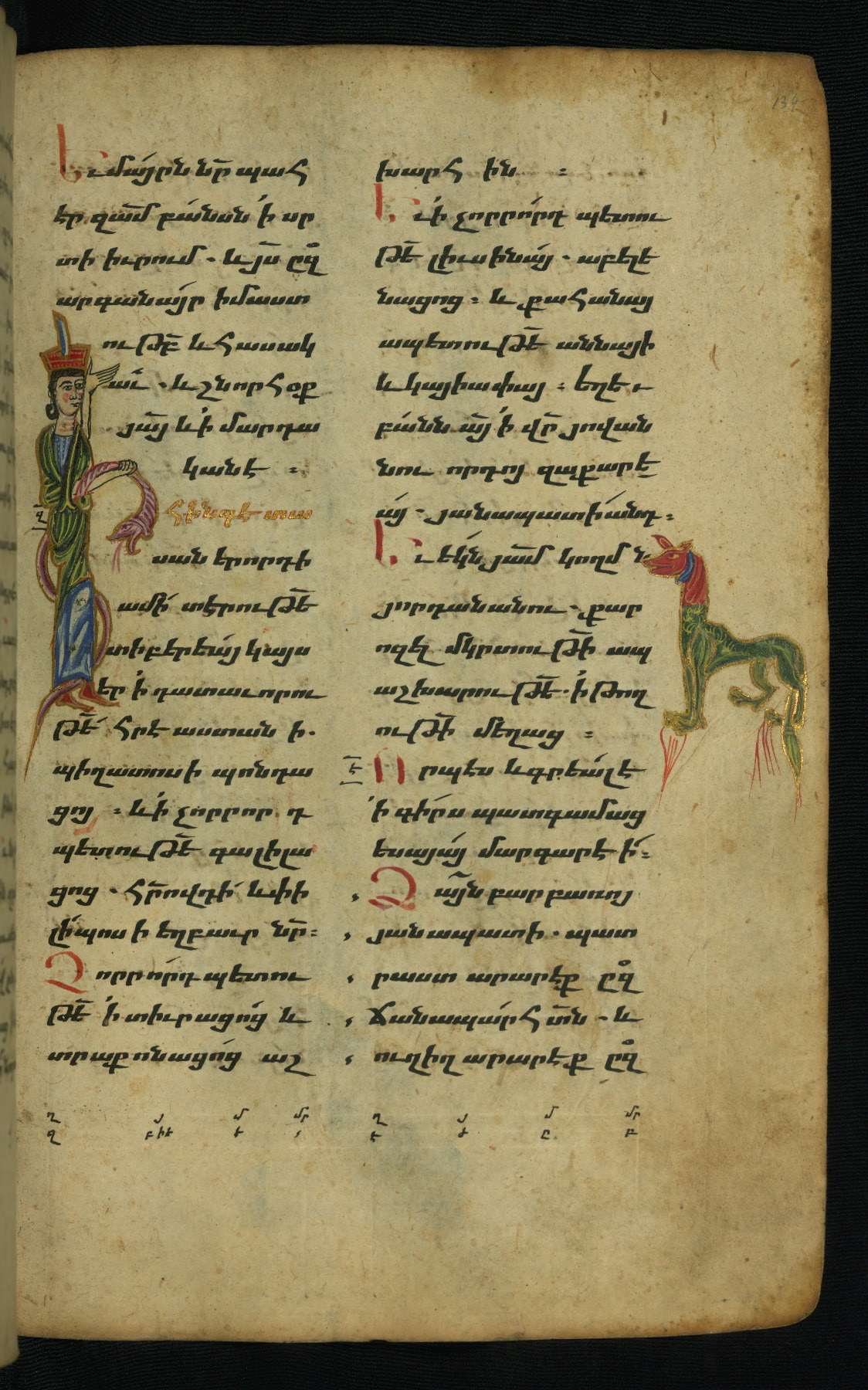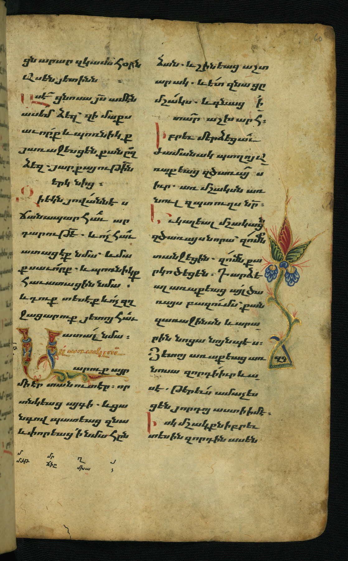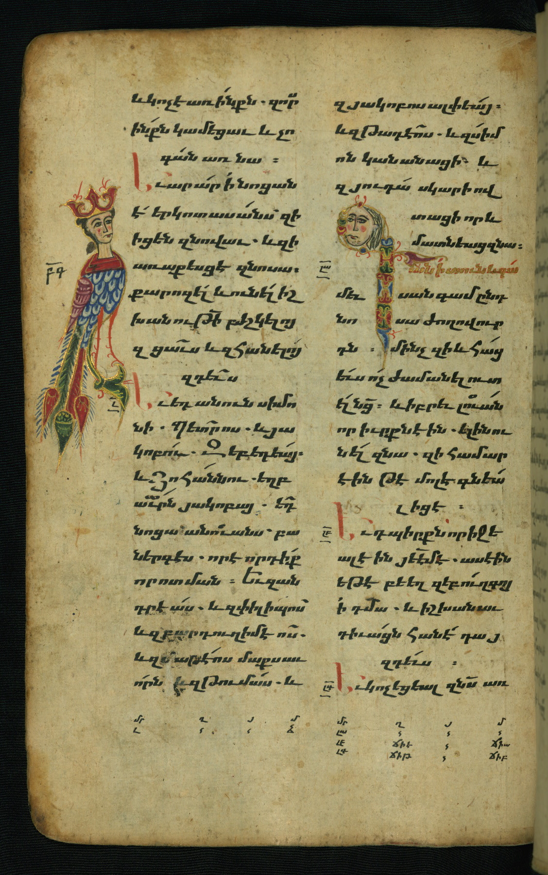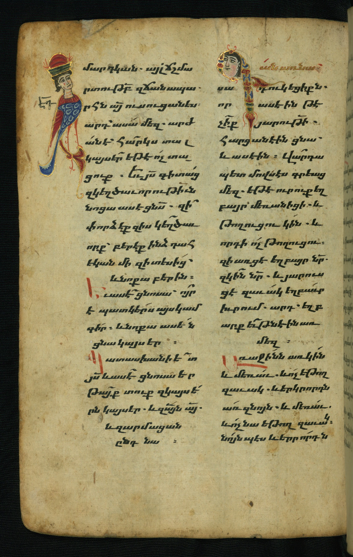- Hand note: Bolorgir (miniscule) for the text of the Gospels; erkat’agir (uncial) for letters introducing verses; upright erkat’agir (uncial) for the flyleaves and endleaves, which are from a thirteenth-century Gospel Book