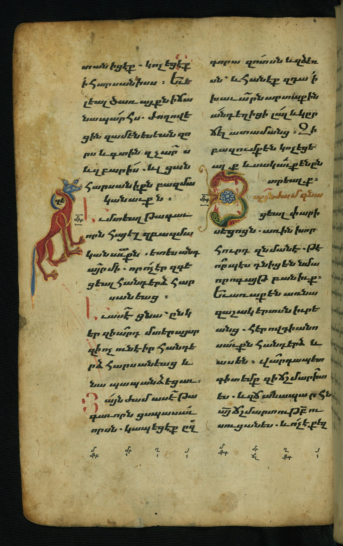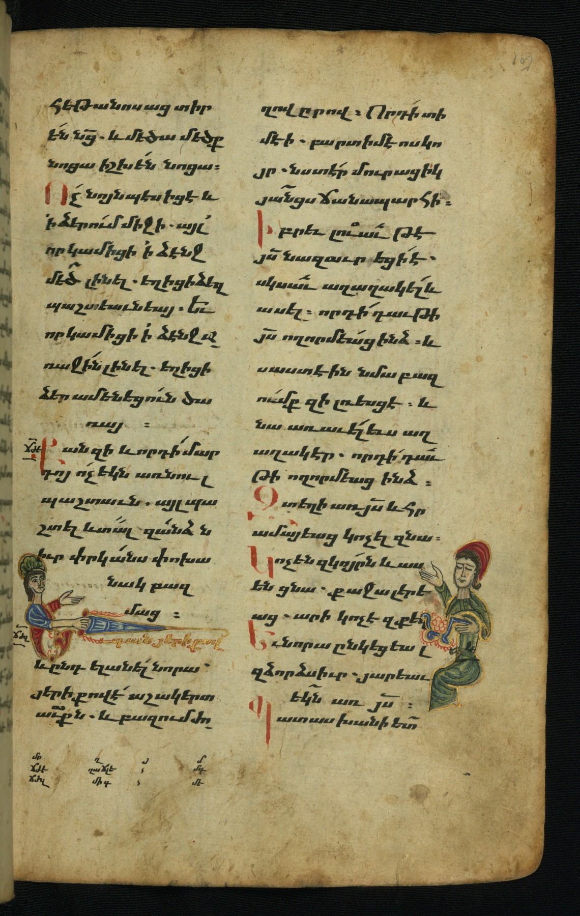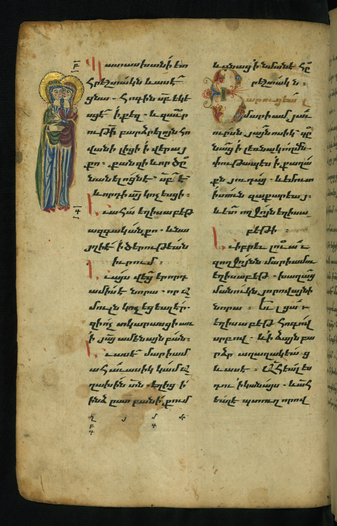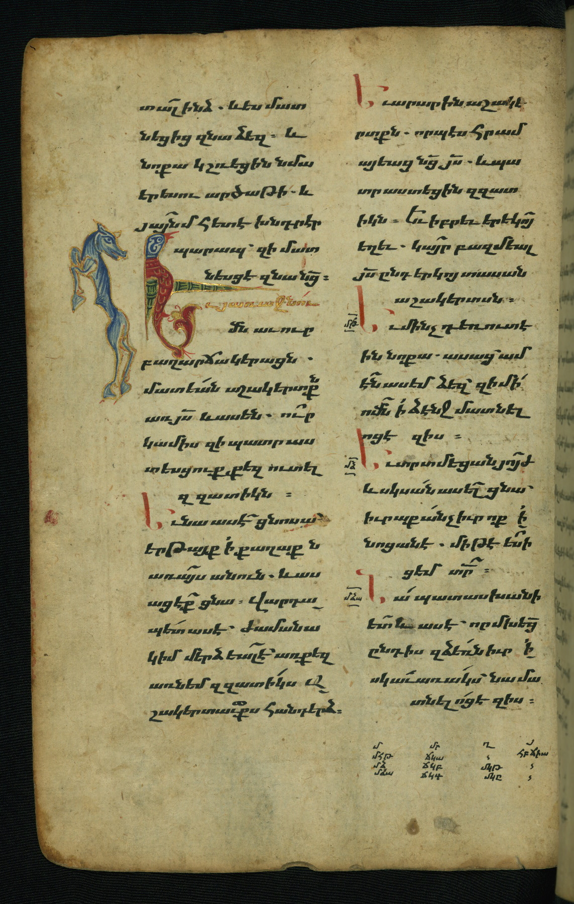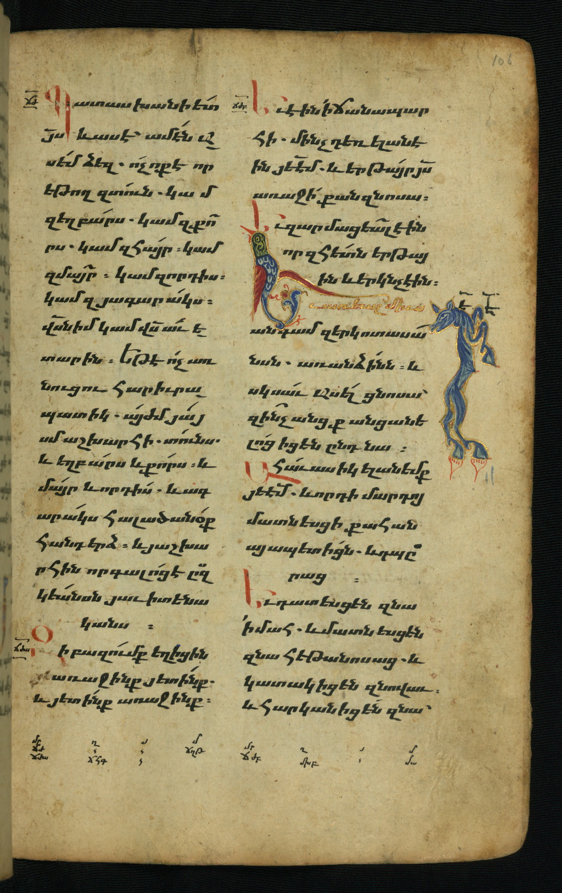 - Hand note: Bolorgir (miniscule) for the text of the Gospels; erkat’agir (uncial) for letters introducing verses; upright erkat’agir (uncial) for the flyleaves and endleaves, which are from a thirteenth-century Gospel Book