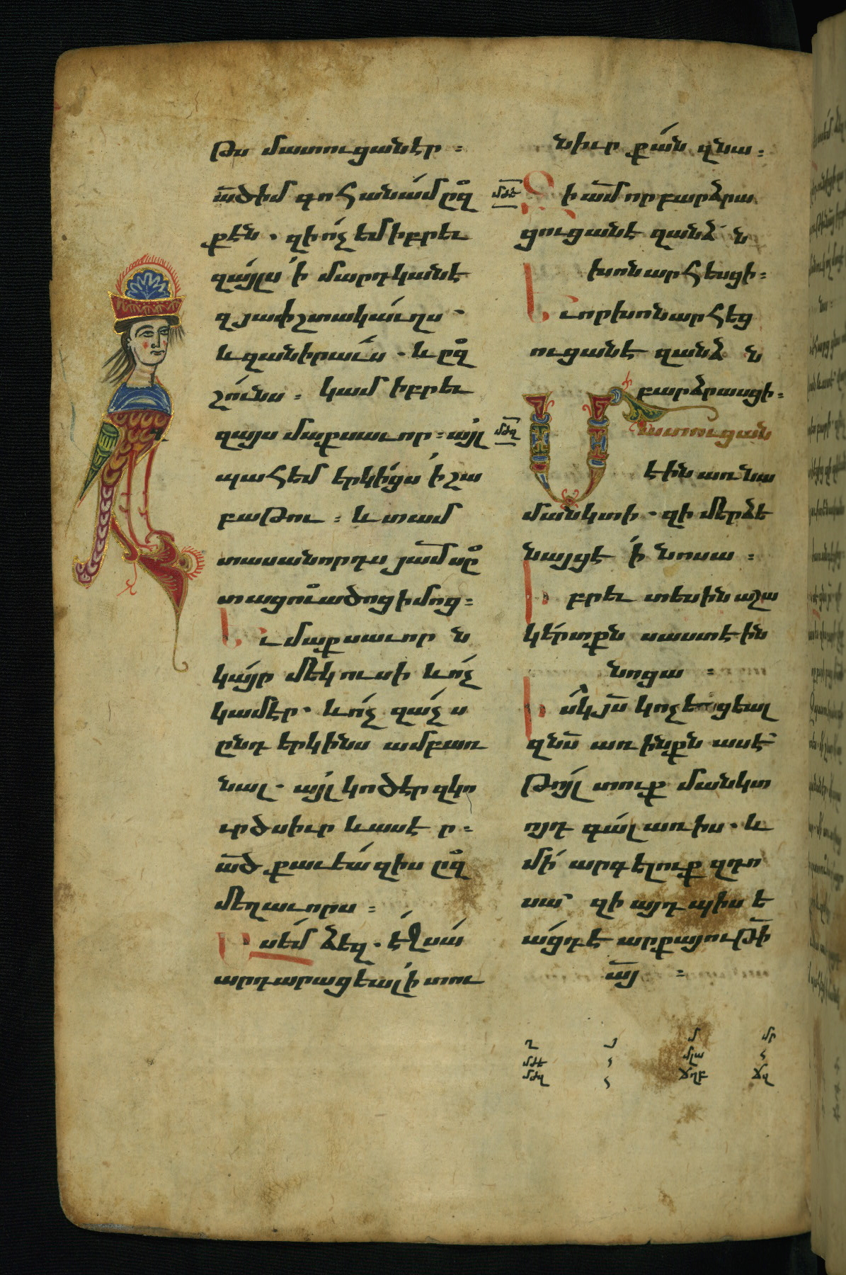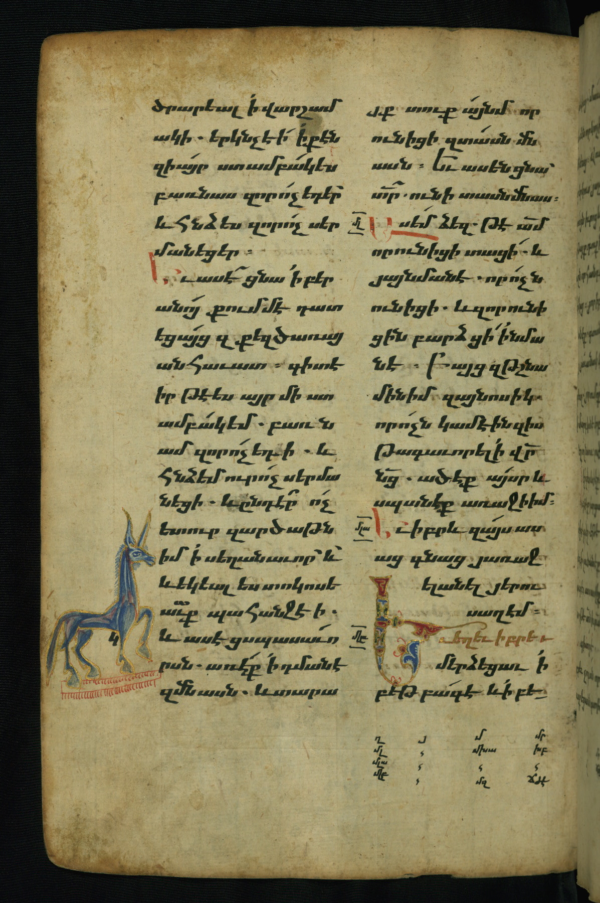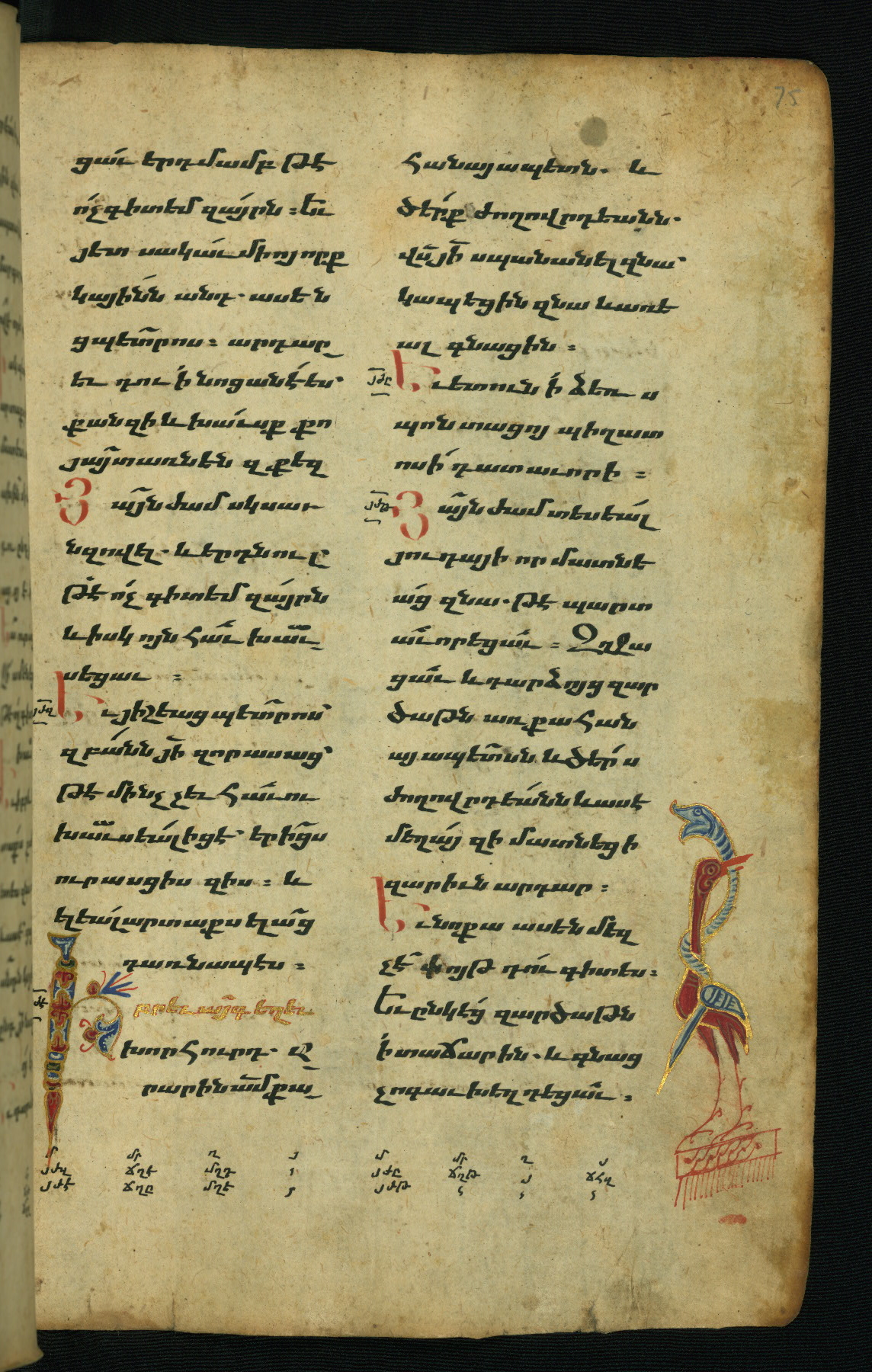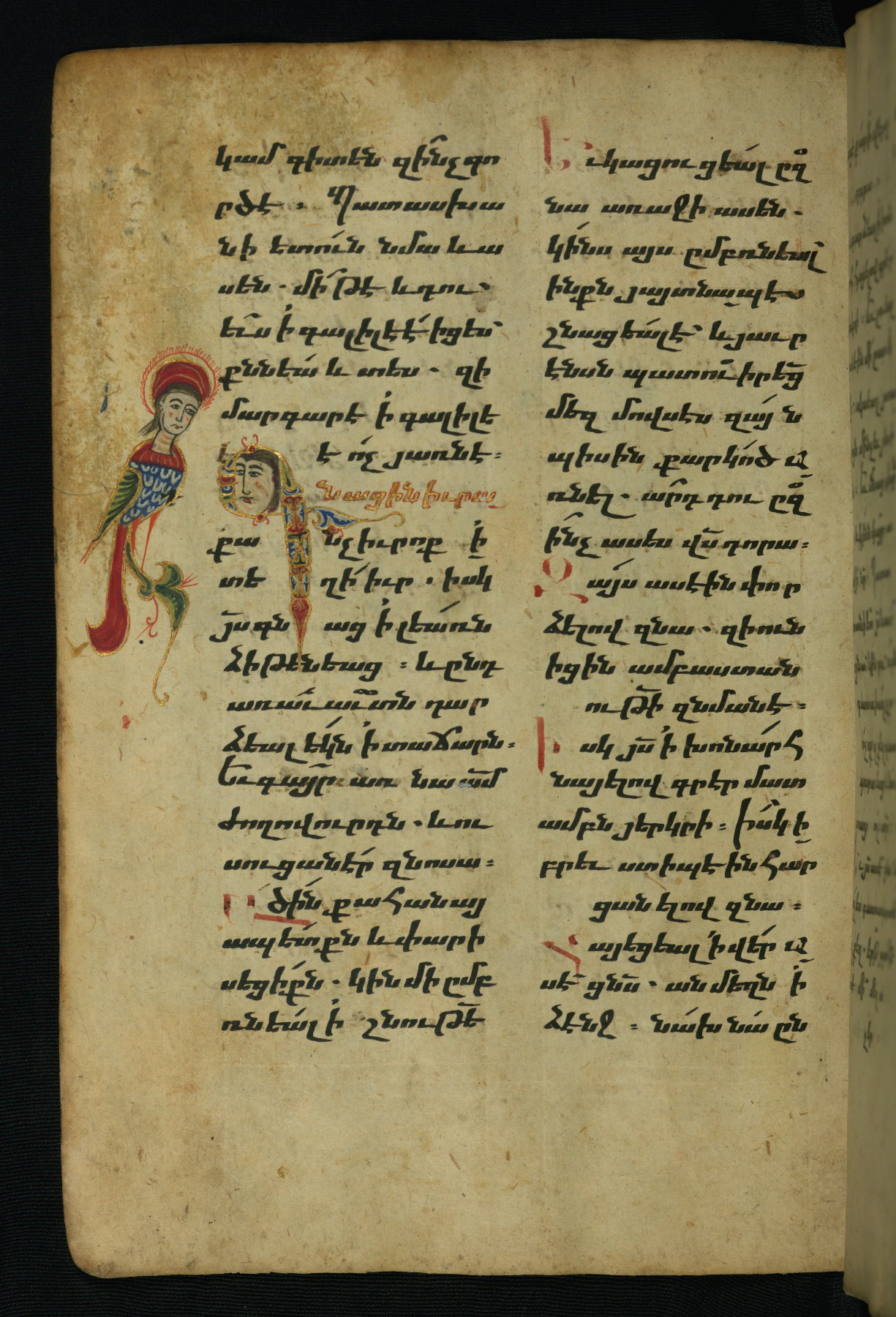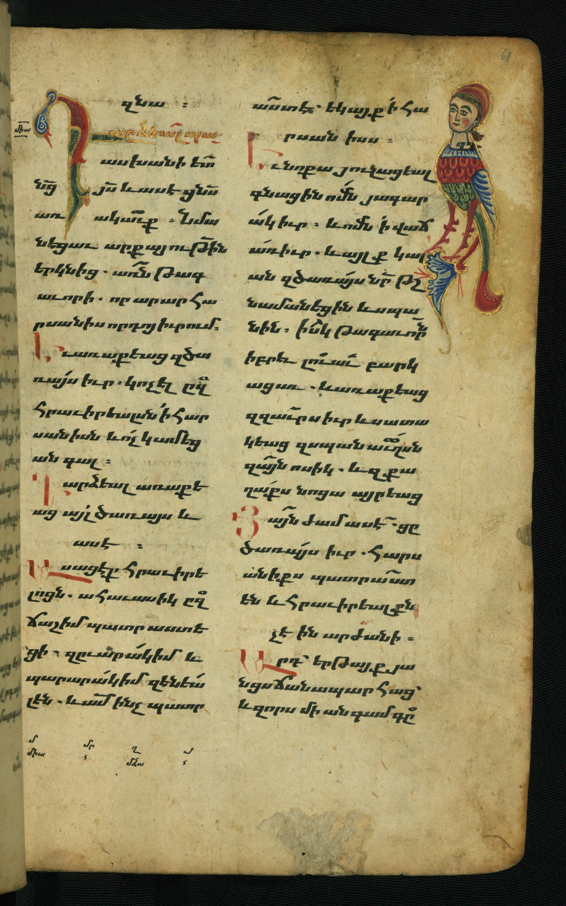 - Hand note: Bolorgir (miniscule) for the text of the Gospels; erkat’agir (uncial) for letters introducing verses; upright erkat’agir (uncial) for the flyleaves and endleaves, which are from a thirteenth-century Gospel Book