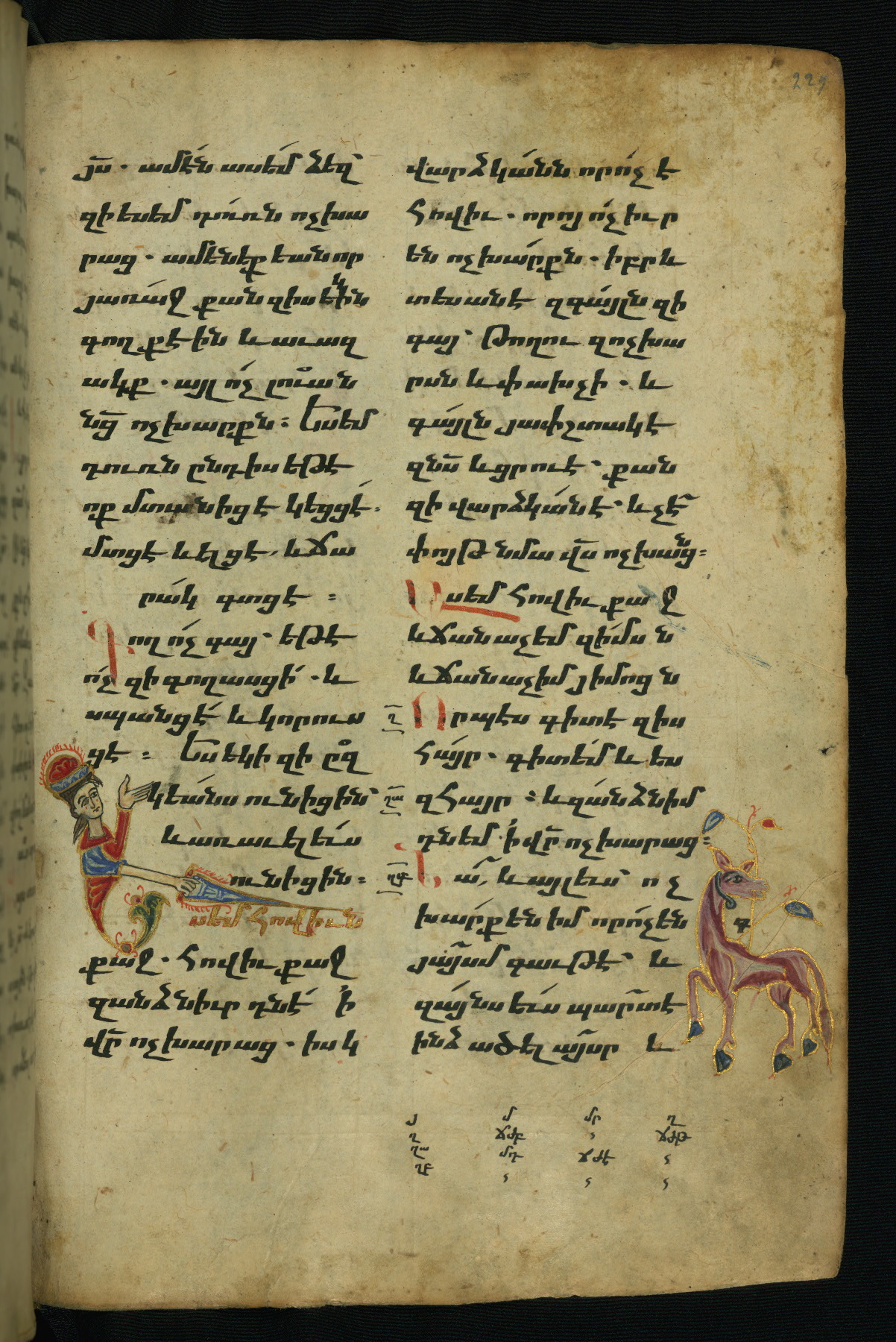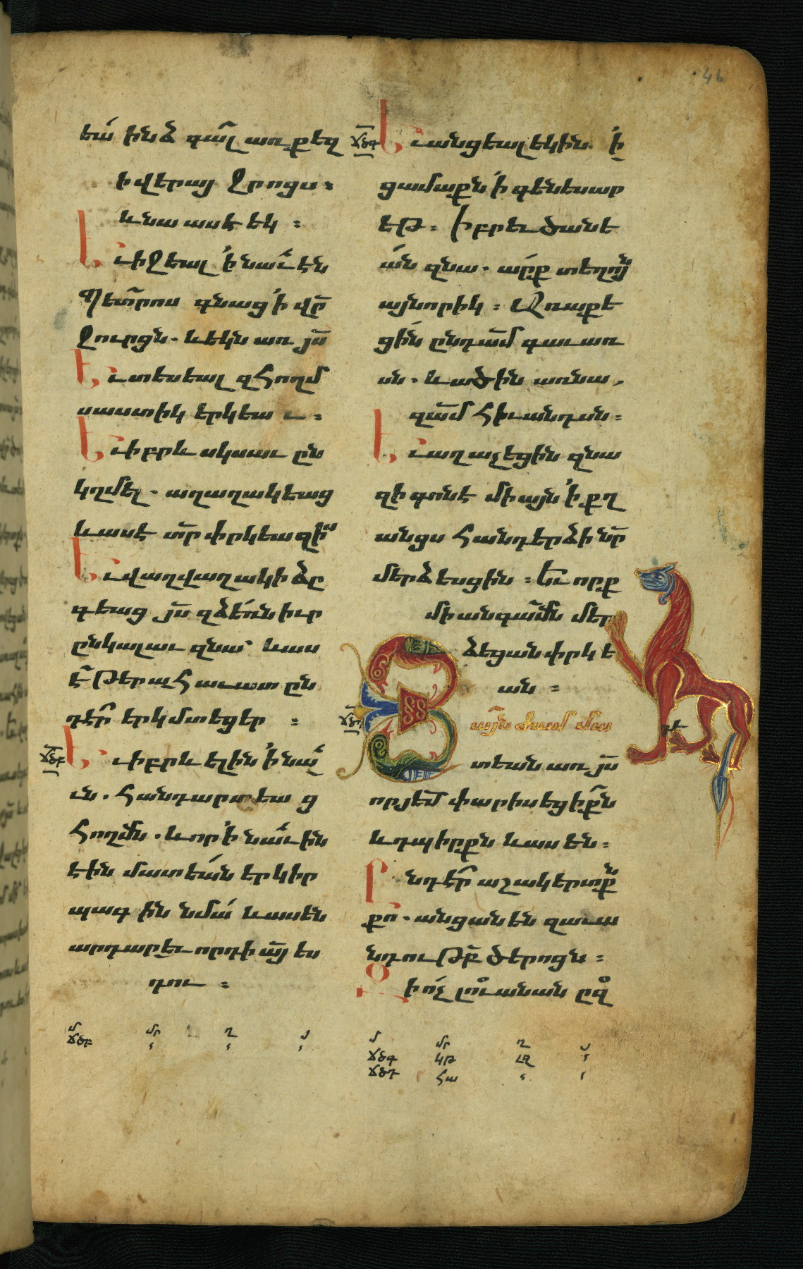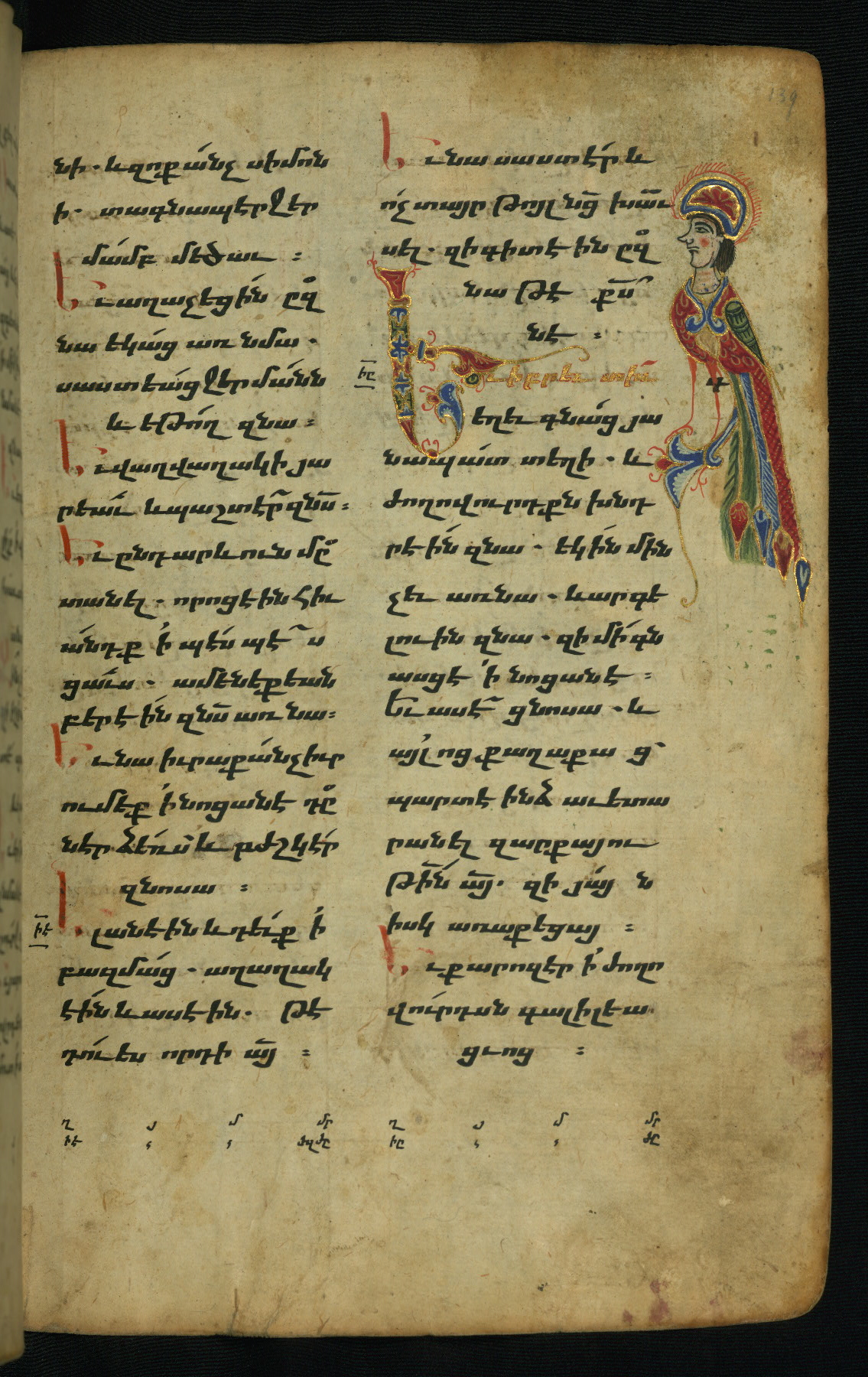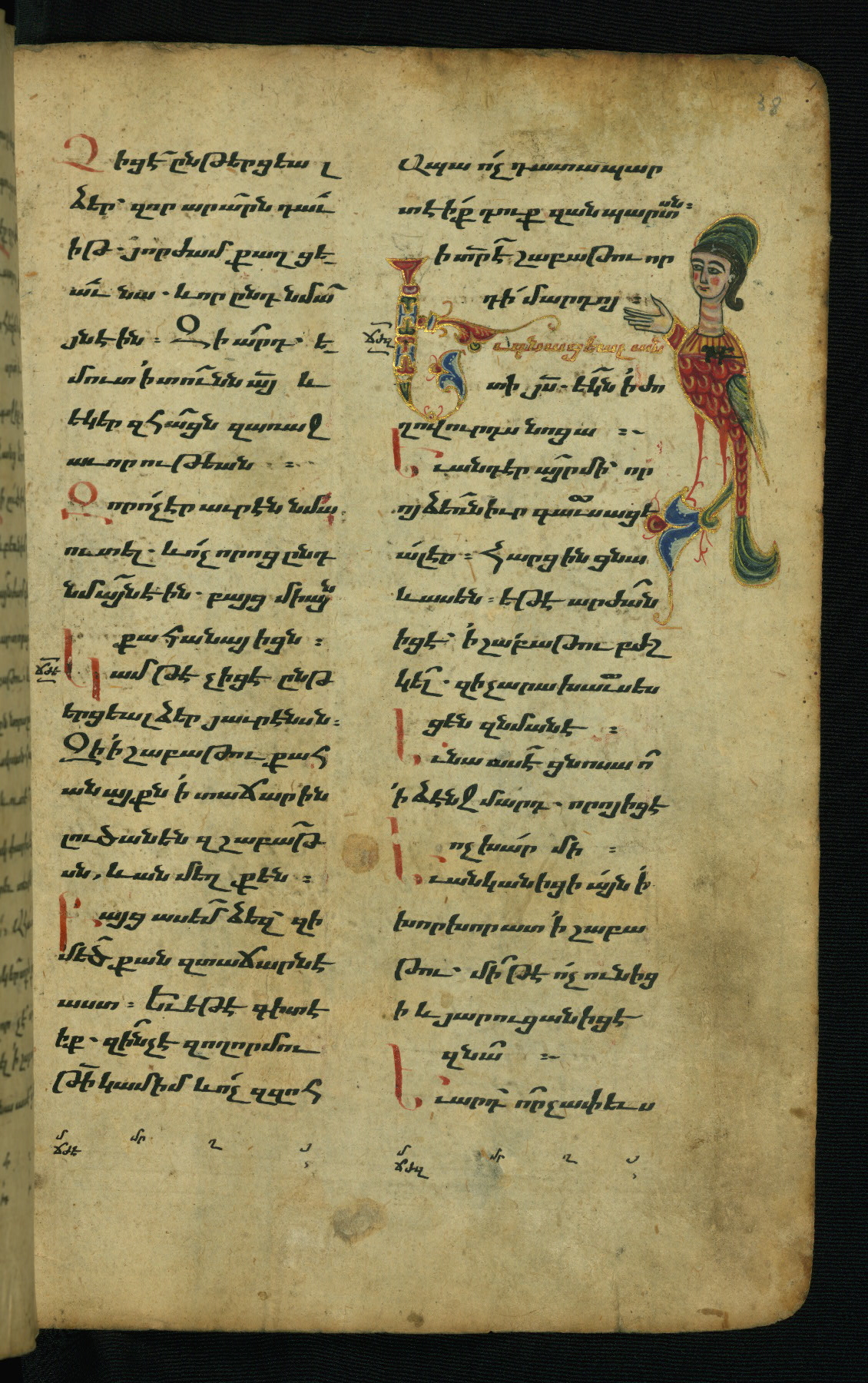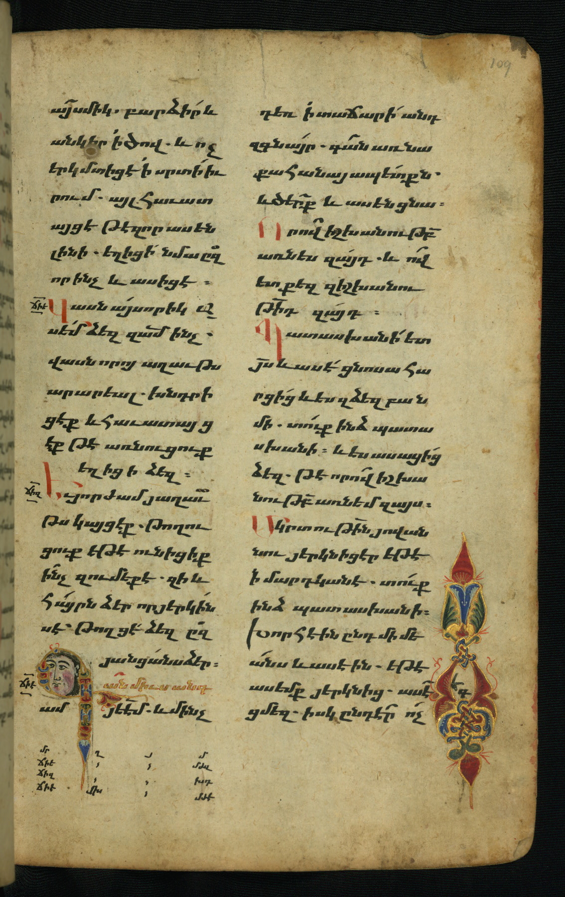 - Hand note: Bolorgir (miniscule) for the text of the Gospels; erkat’agir (uncial) for letters introducing verses; upright erkat’agir (uncial) for the flyleaves and endleaves, which are from a thirteenth-century Gospel Book