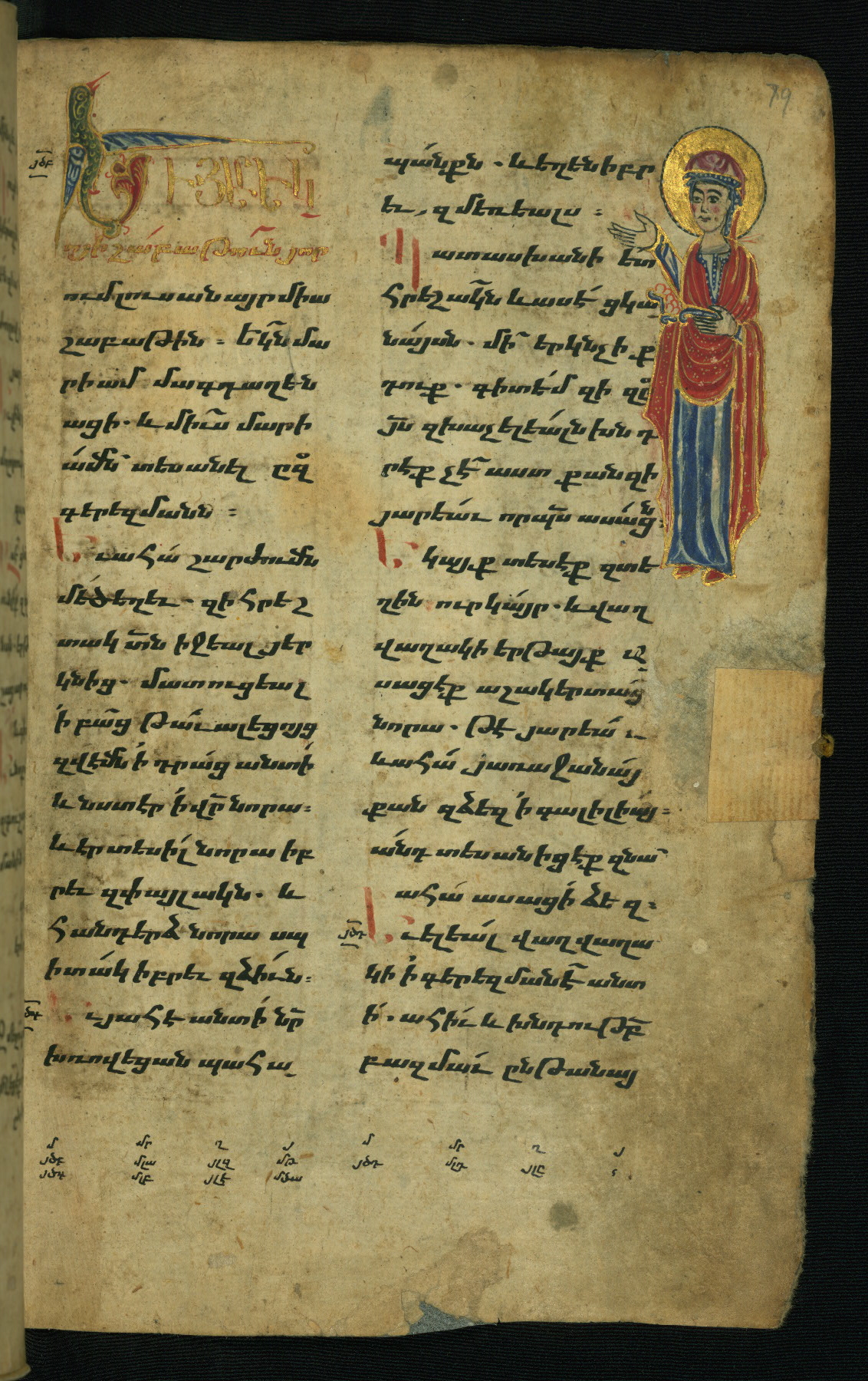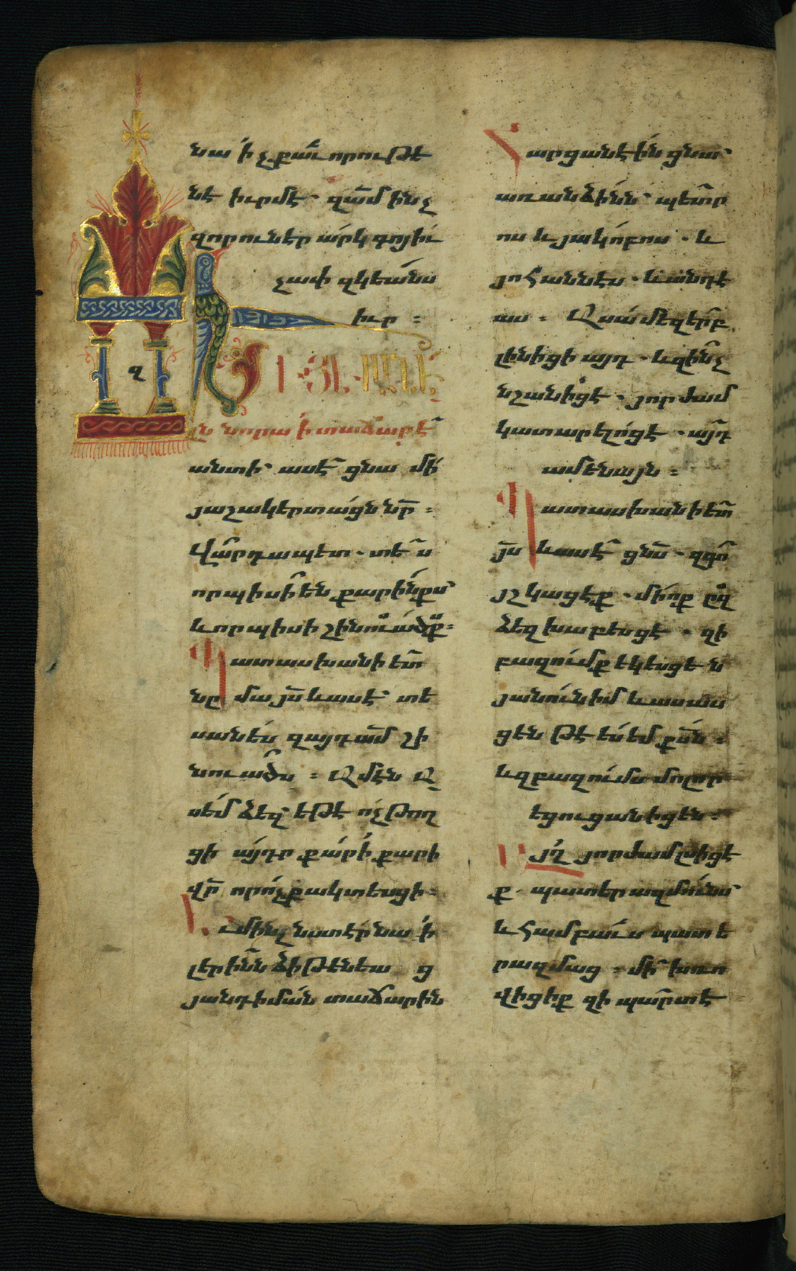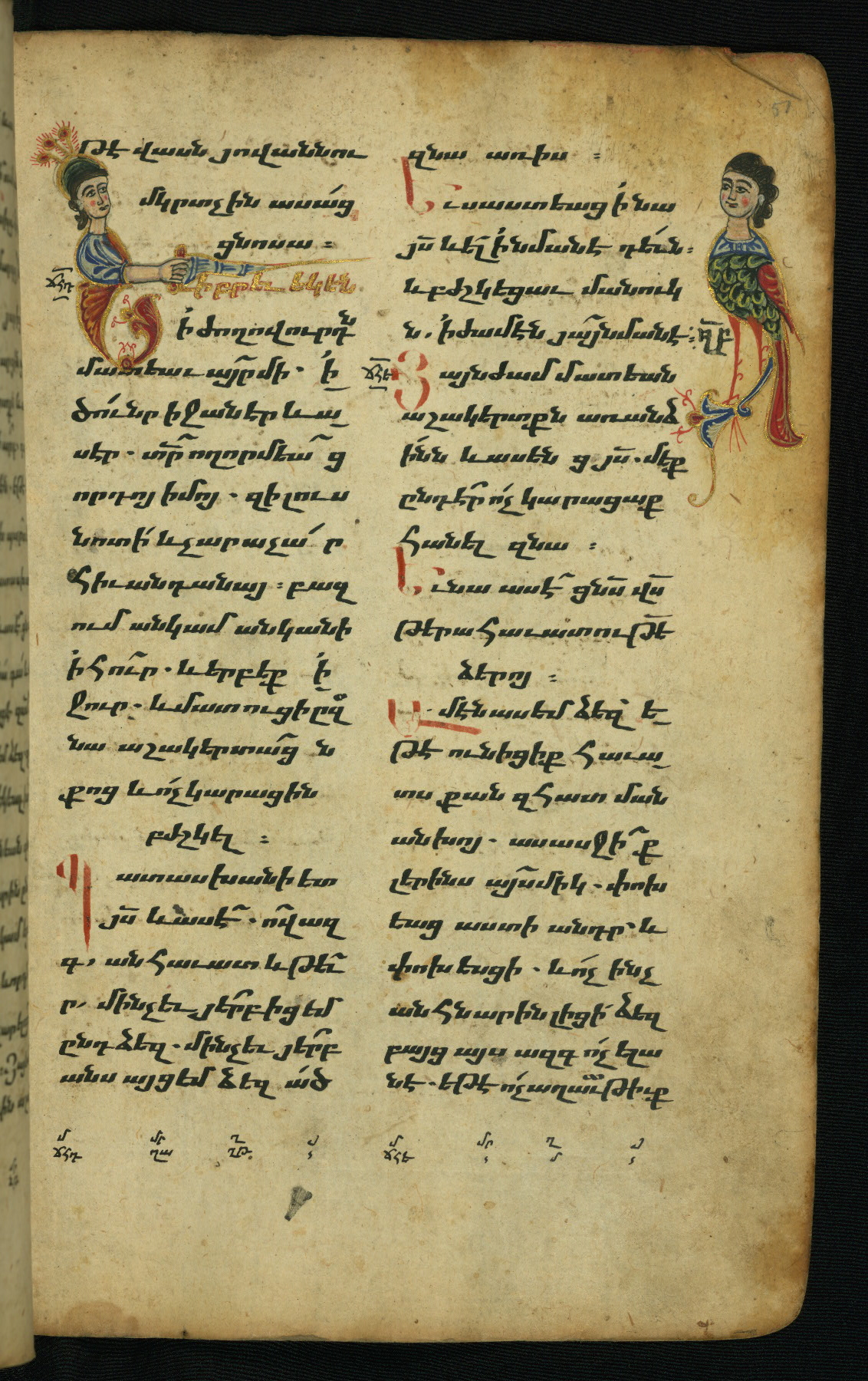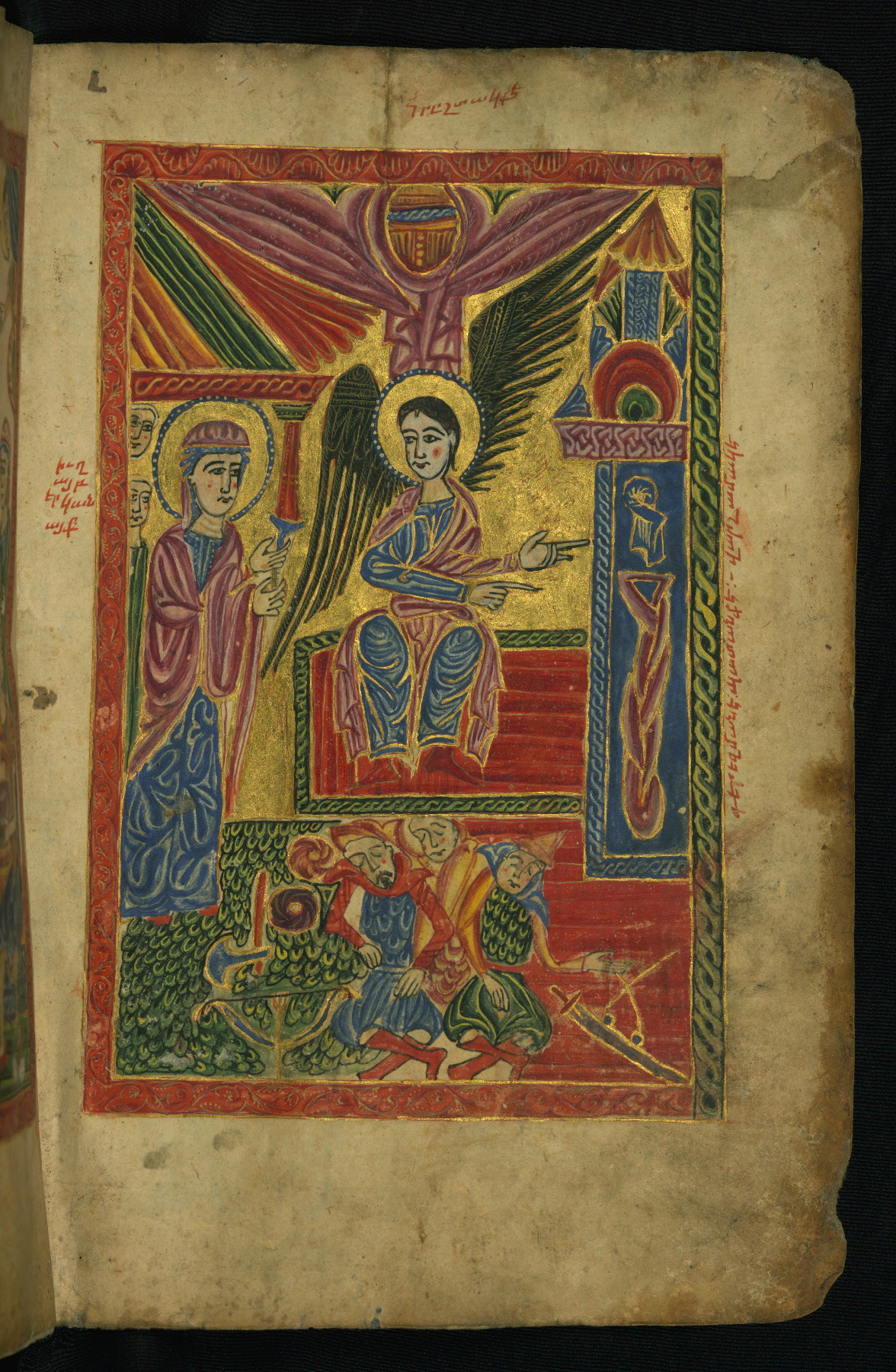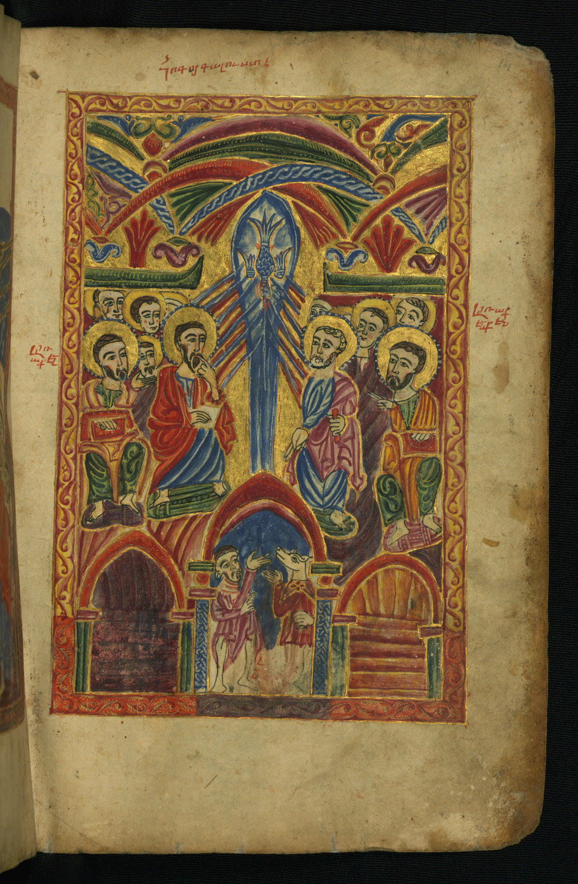- Hand note: Bolorgir (miniscule) for the text of the Gospels; erkat’agir (uncial) for letters introducing verses; upright erkat’agir (uncial) for the flyleaves and endleaves, which are from a thirteenth-century Gospel Book