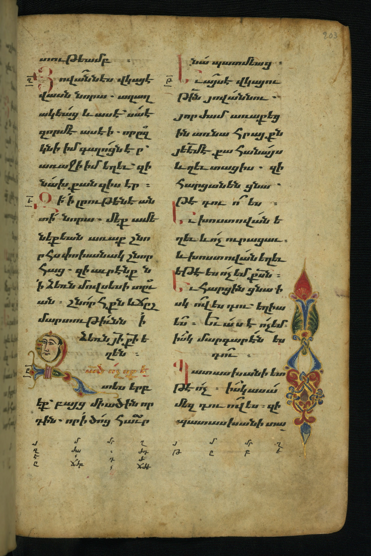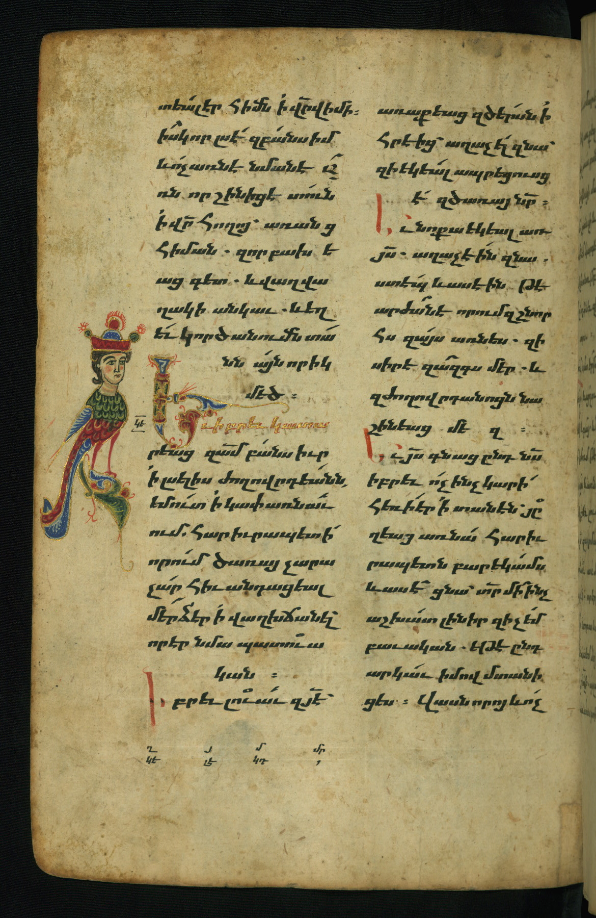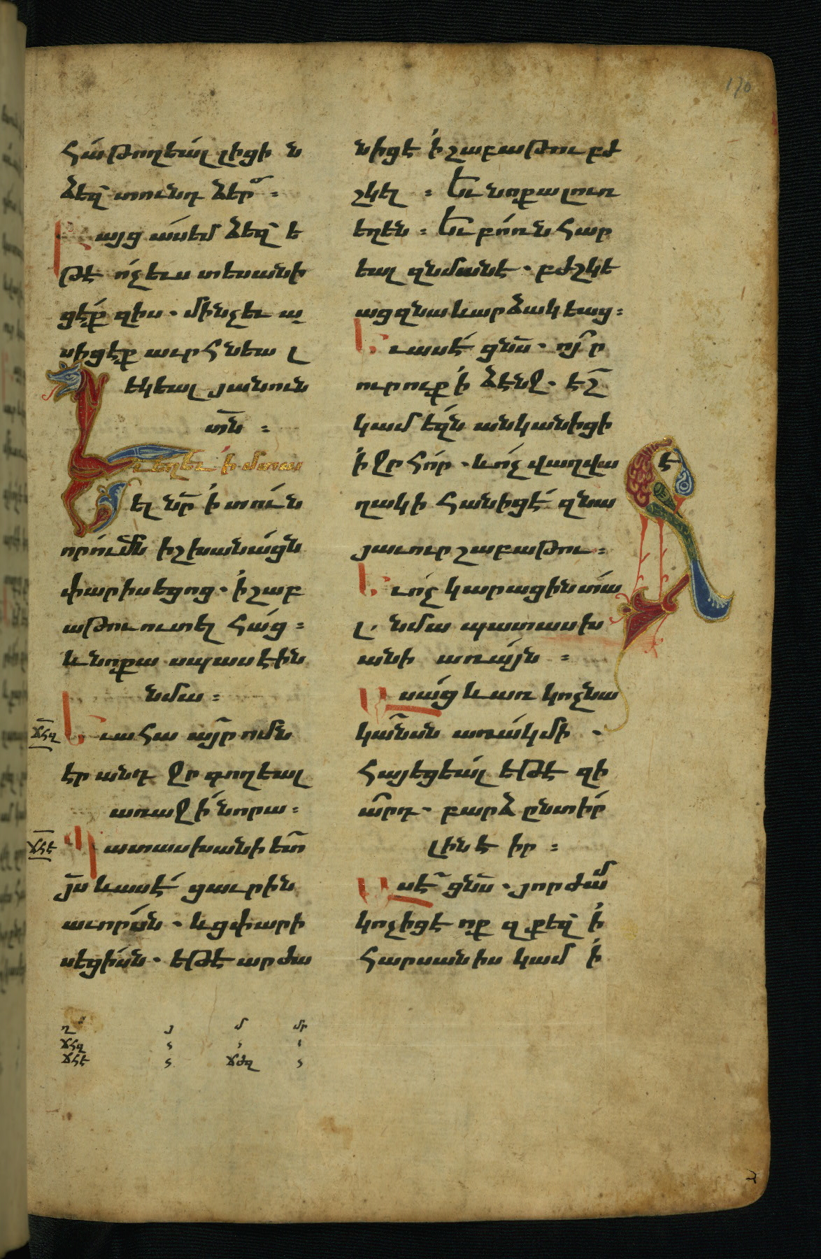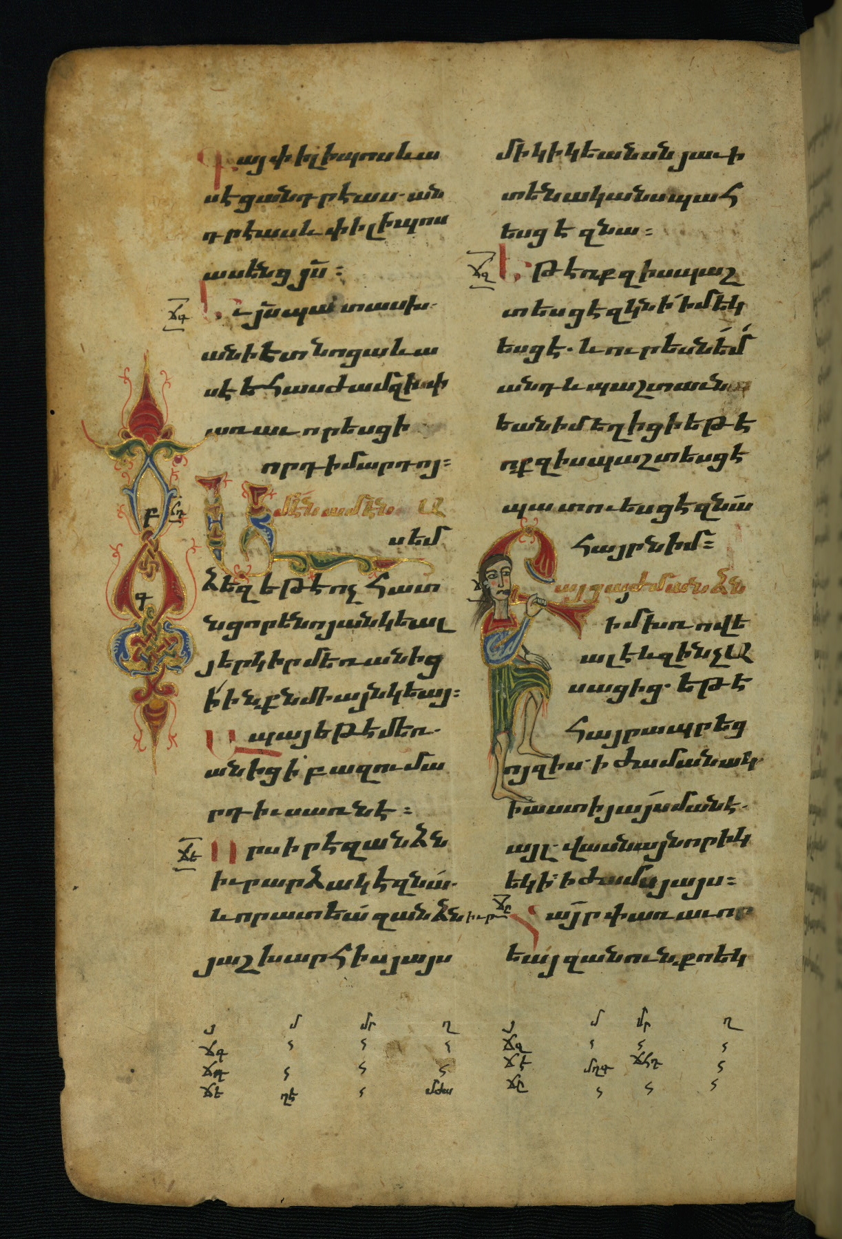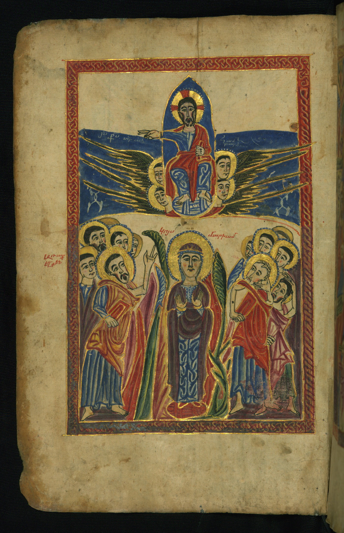 - Hand note: Bolorgir (miniscule) for the text of the Gospels; erkat’agir (uncial) for letters introducing verses; upright erkat’agir (uncial) for the flyleaves and endleaves, which are from a thirteenth-century Gospel Book