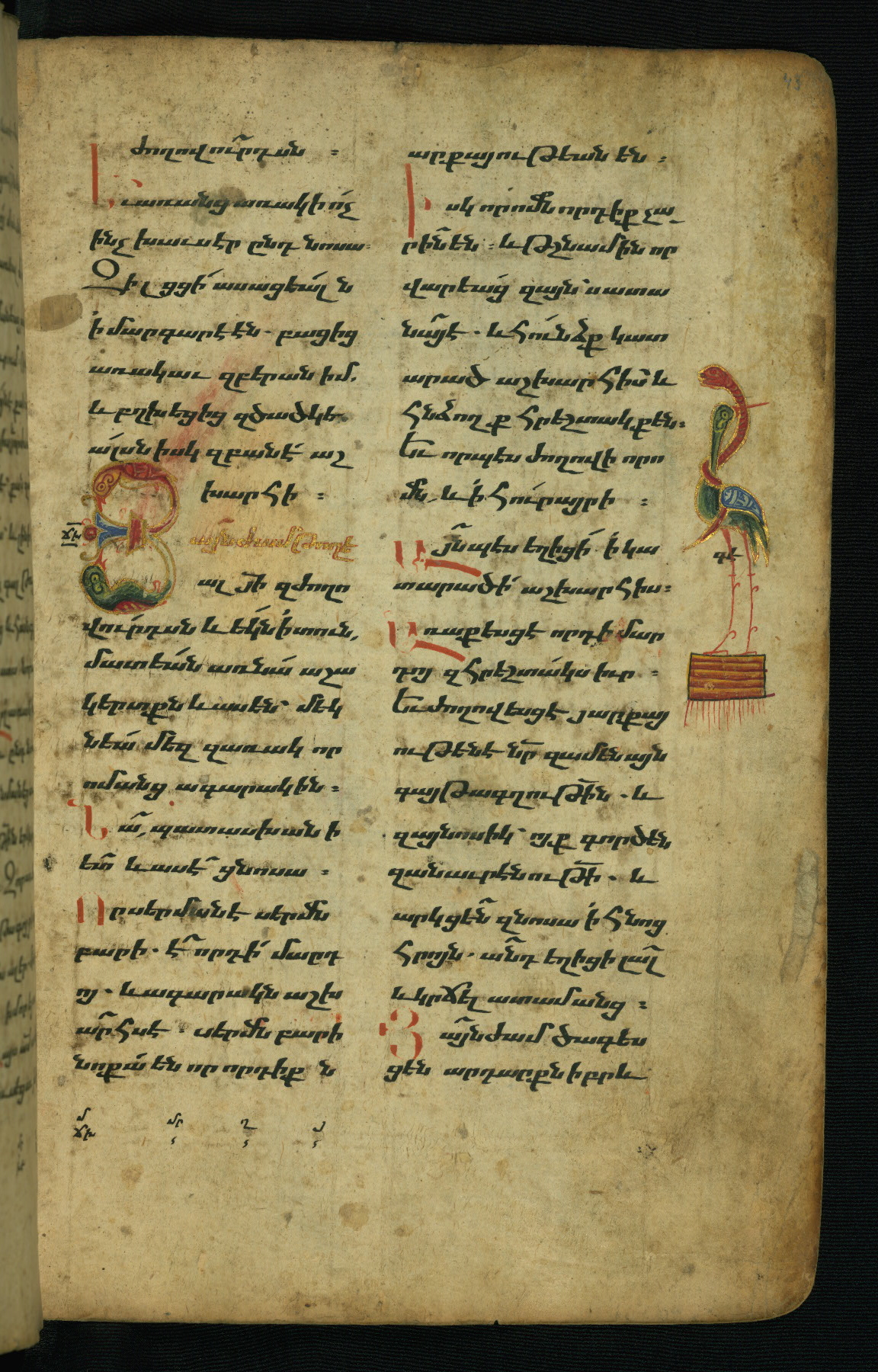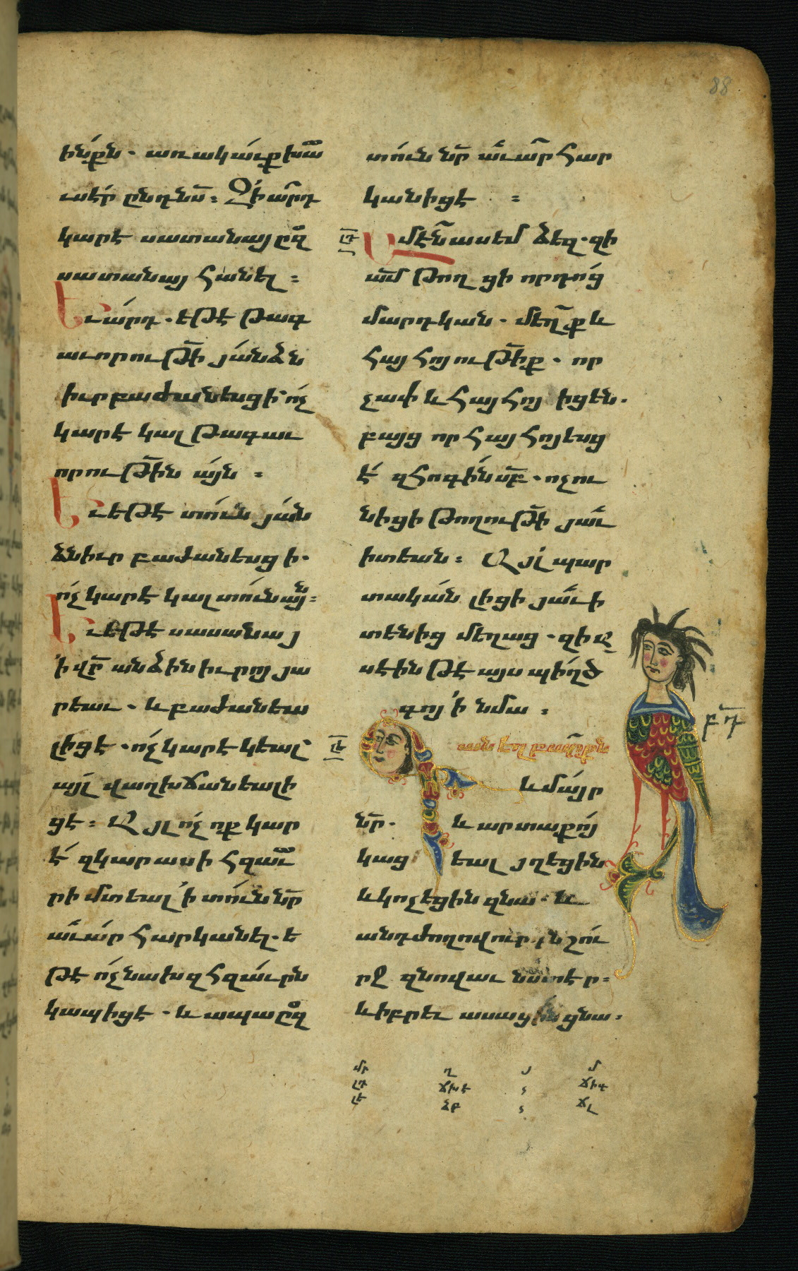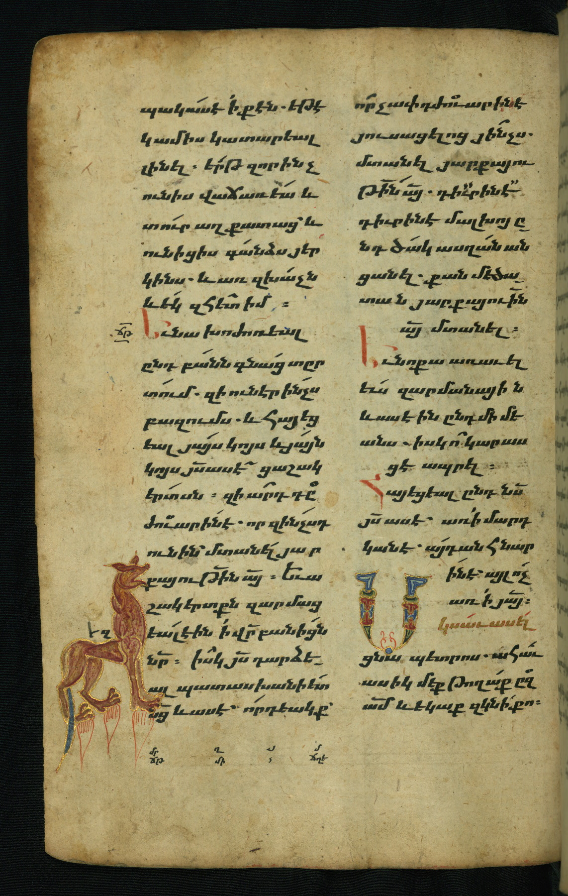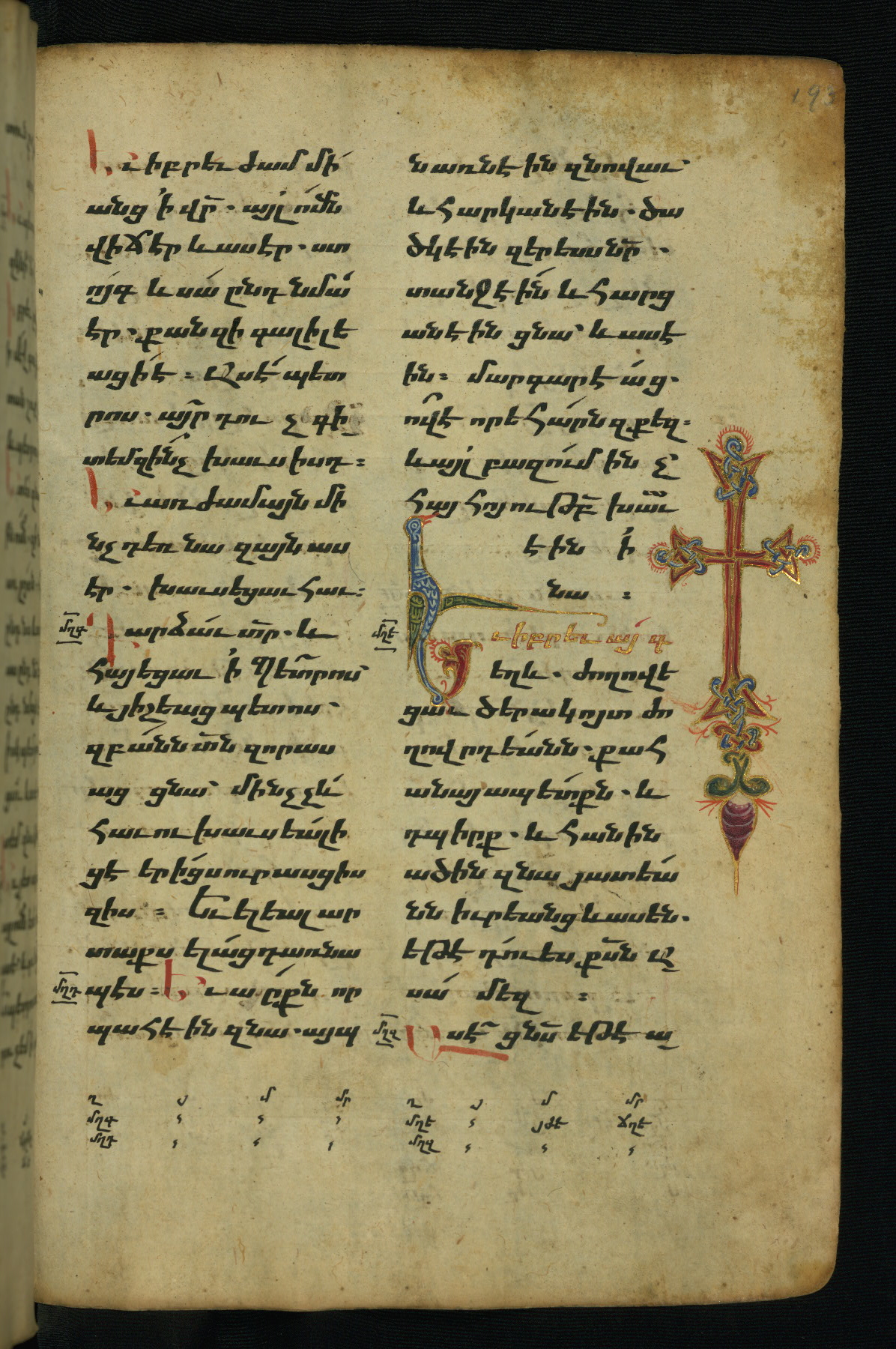 - Hand note: Bolorgir (miniscule) for the text of the Gospels; erkat’agir (uncial) for letters introducing verses; upright erkat’agir (uncial) for the flyleaves and endleaves, which are from a thirteenth-century Gospel Book
