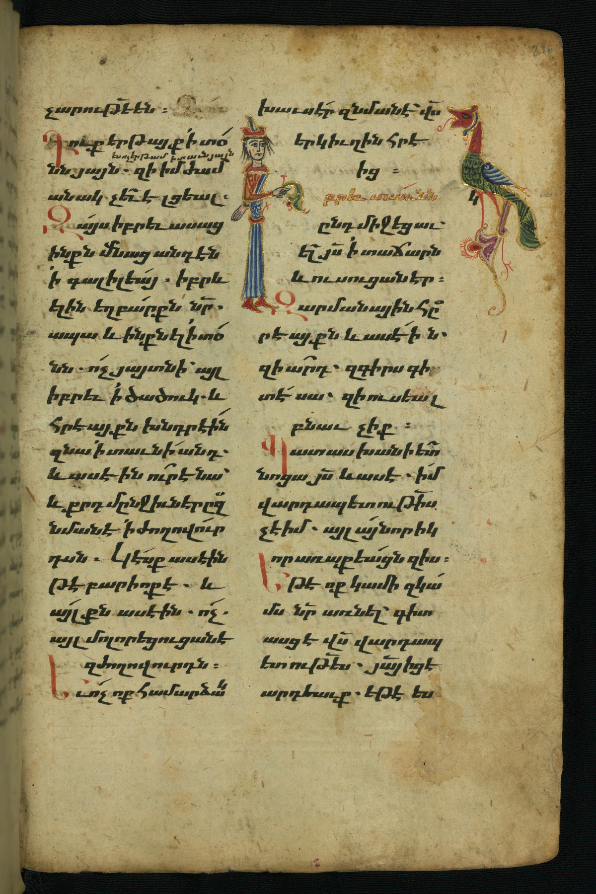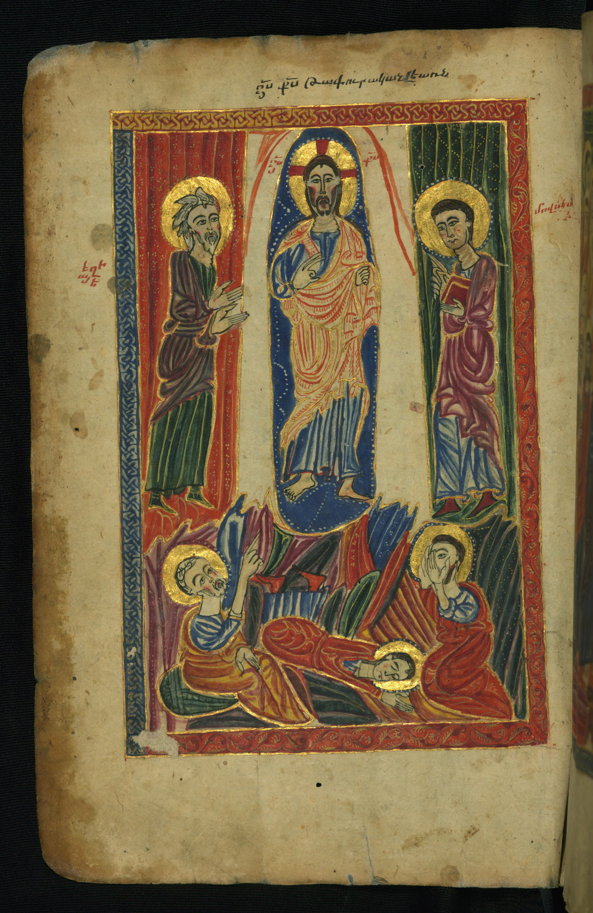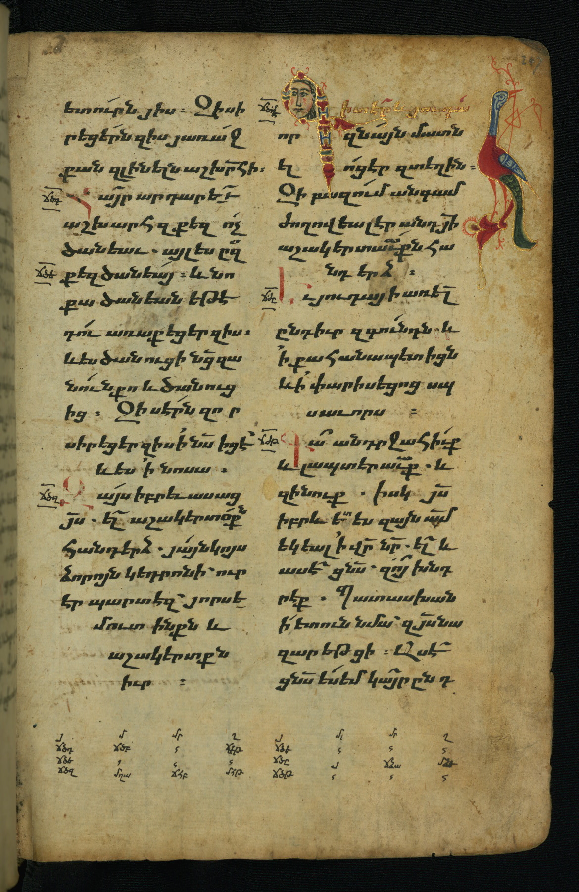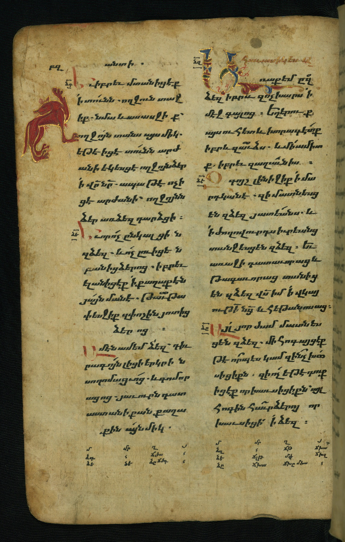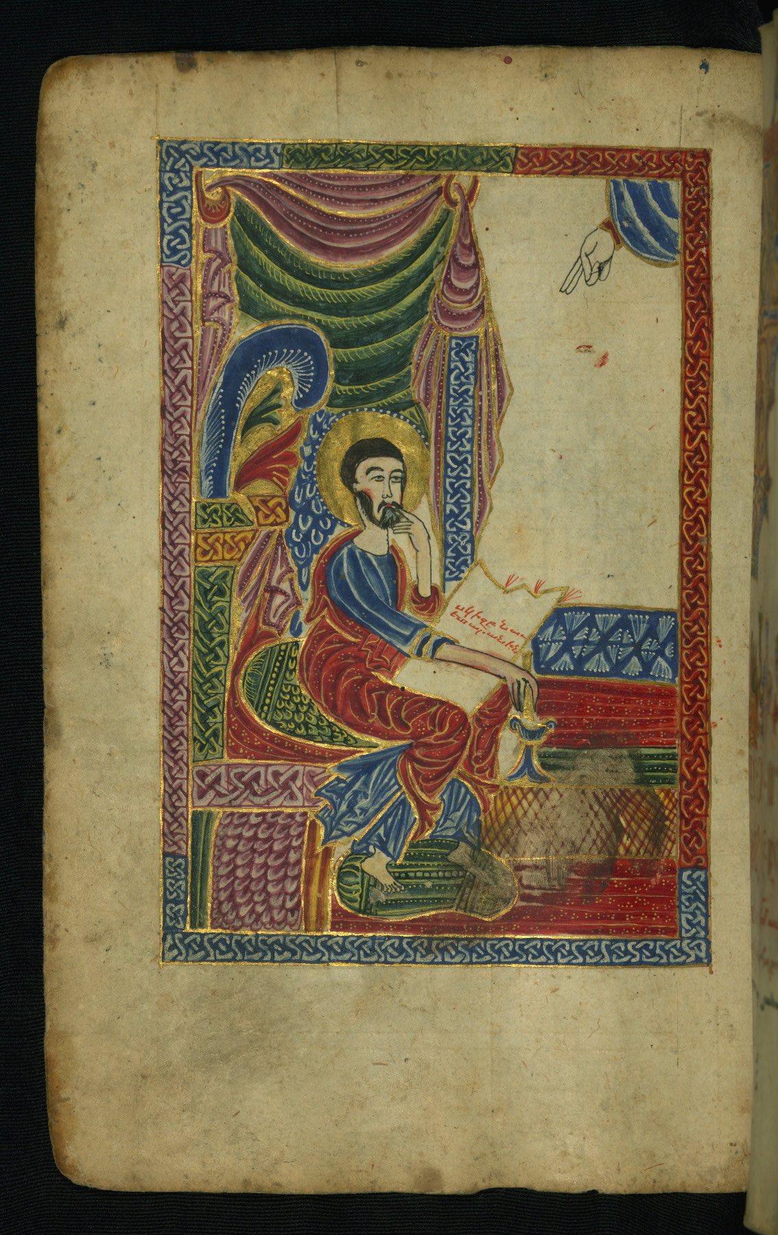 - Hand note: Bolorgir (miniscule) for the text of the Gospels; erkat’agir (uncial) for letters introducing verses; upright erkat’agir (uncial) for the flyleaves and endleaves, which are from a thirteenth-century Gospel Book