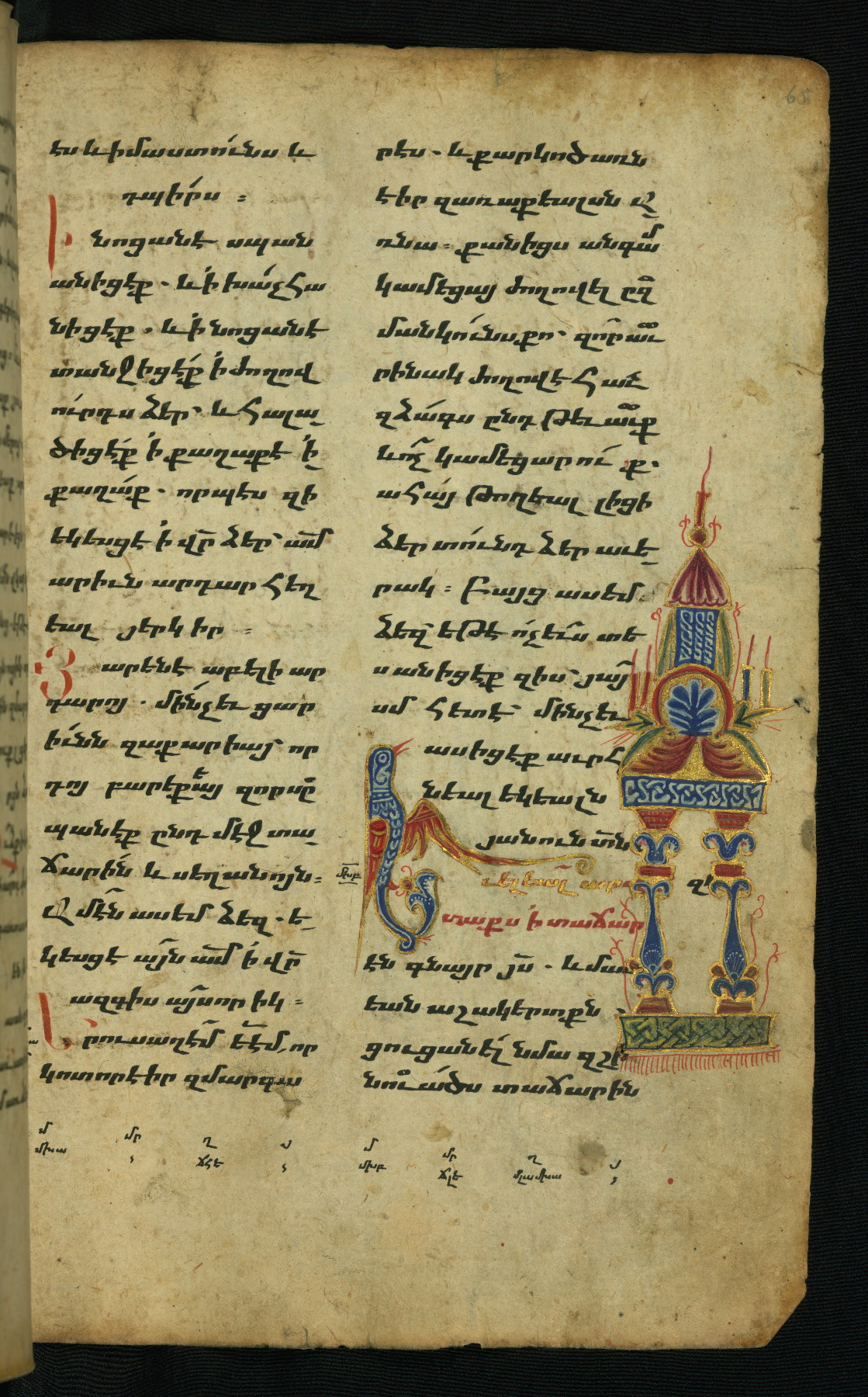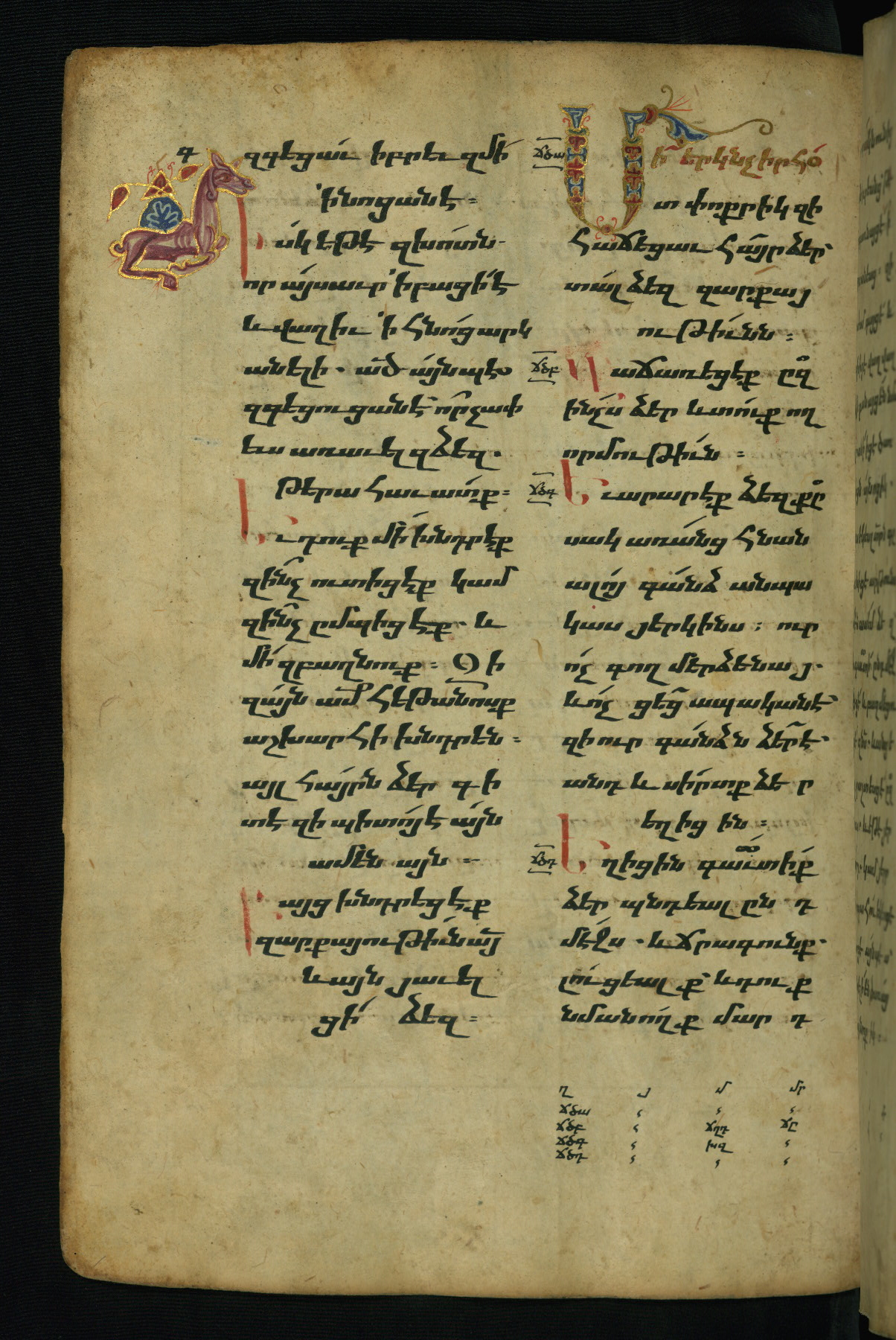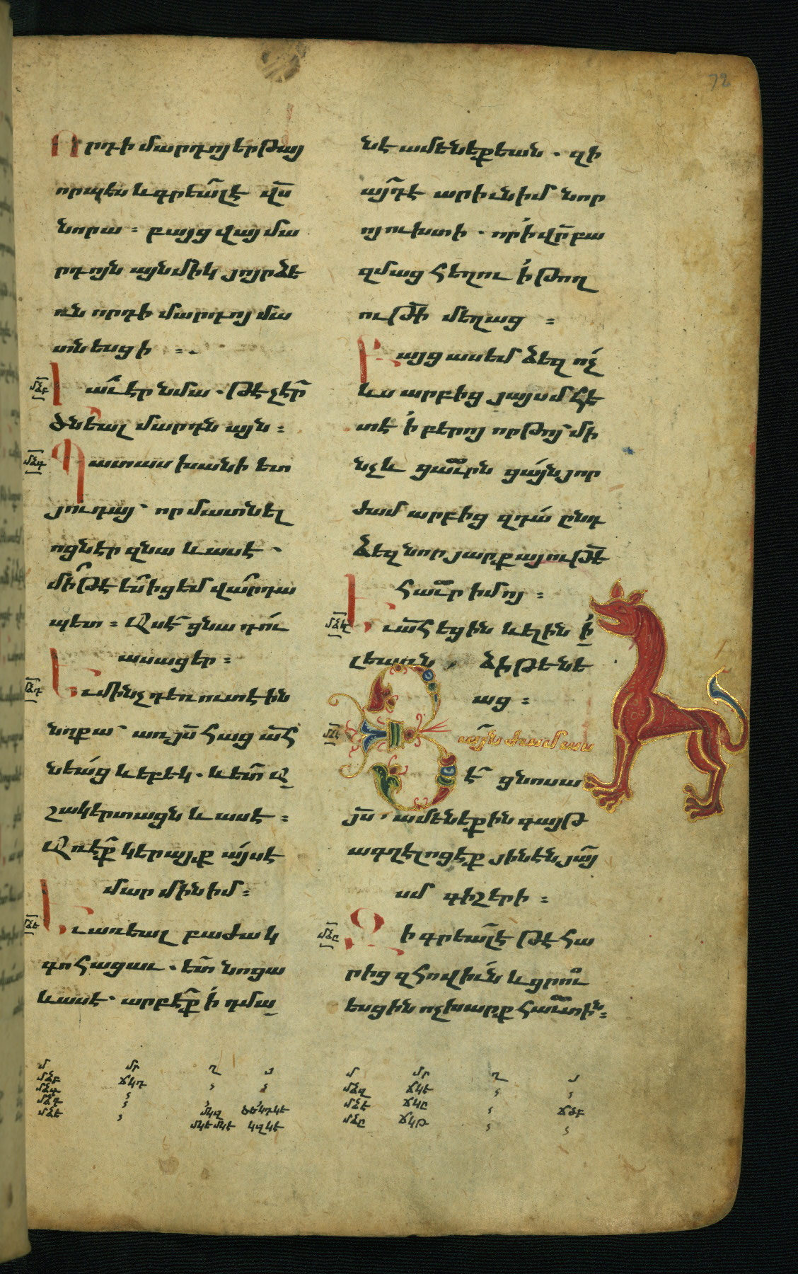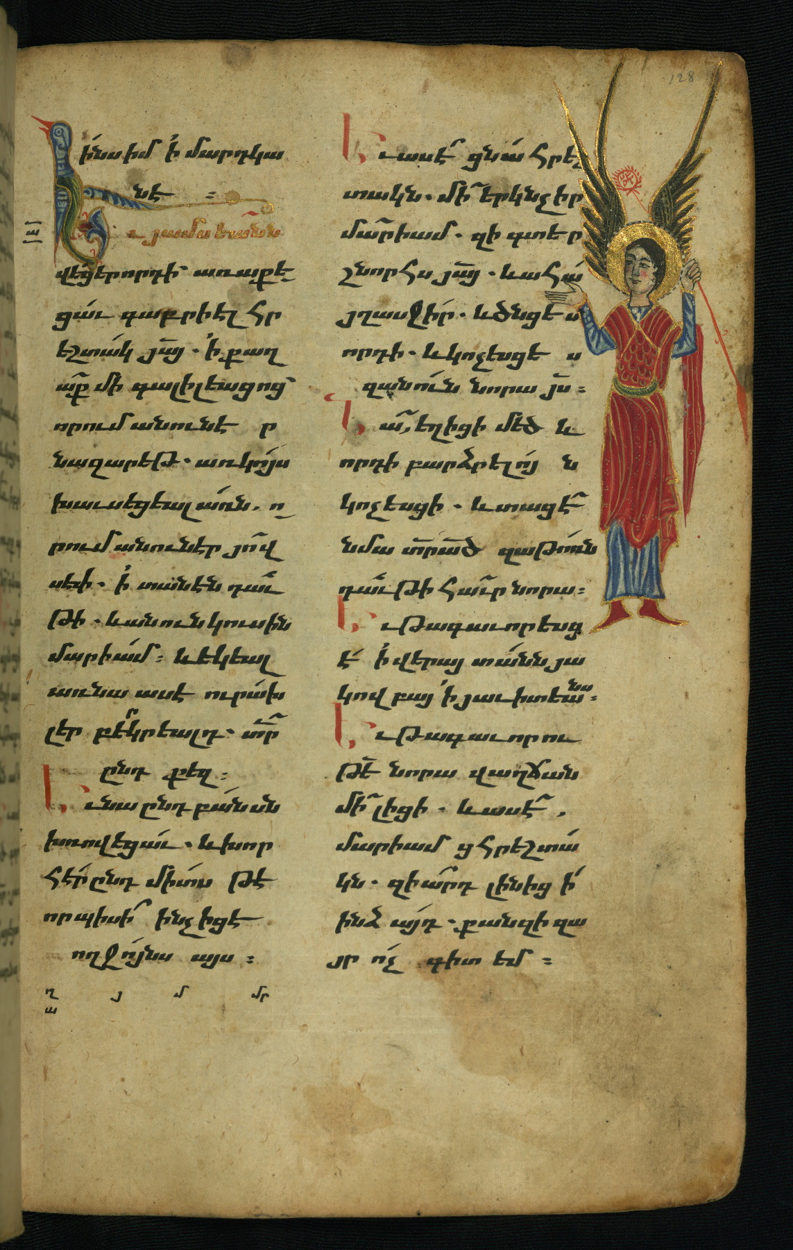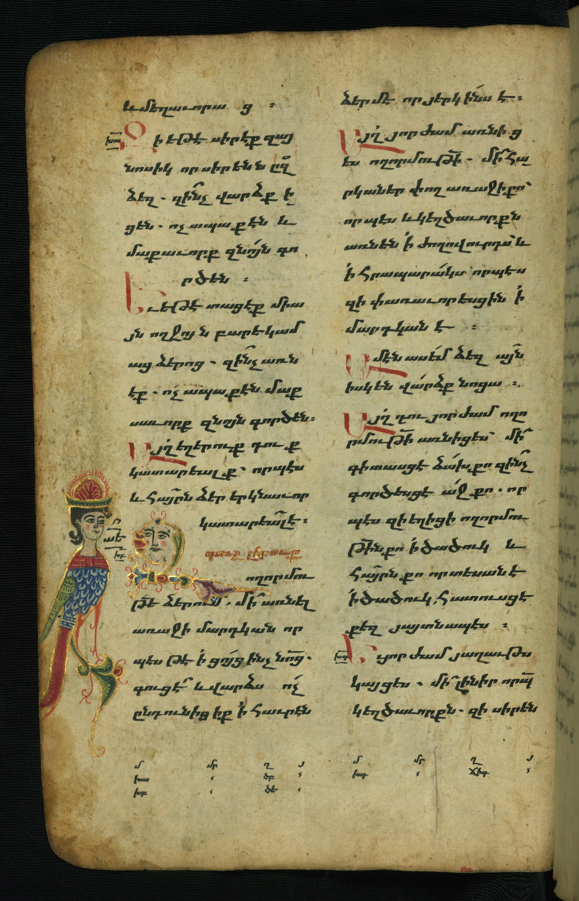 - Hand note: Bolorgir (miniscule) for the text of the Gospels; erkat’agir (uncial) for letters introducing verses; upright erkat’agir (uncial) for the flyleaves and endleaves, which are from a thirteenth-century Gospel Book