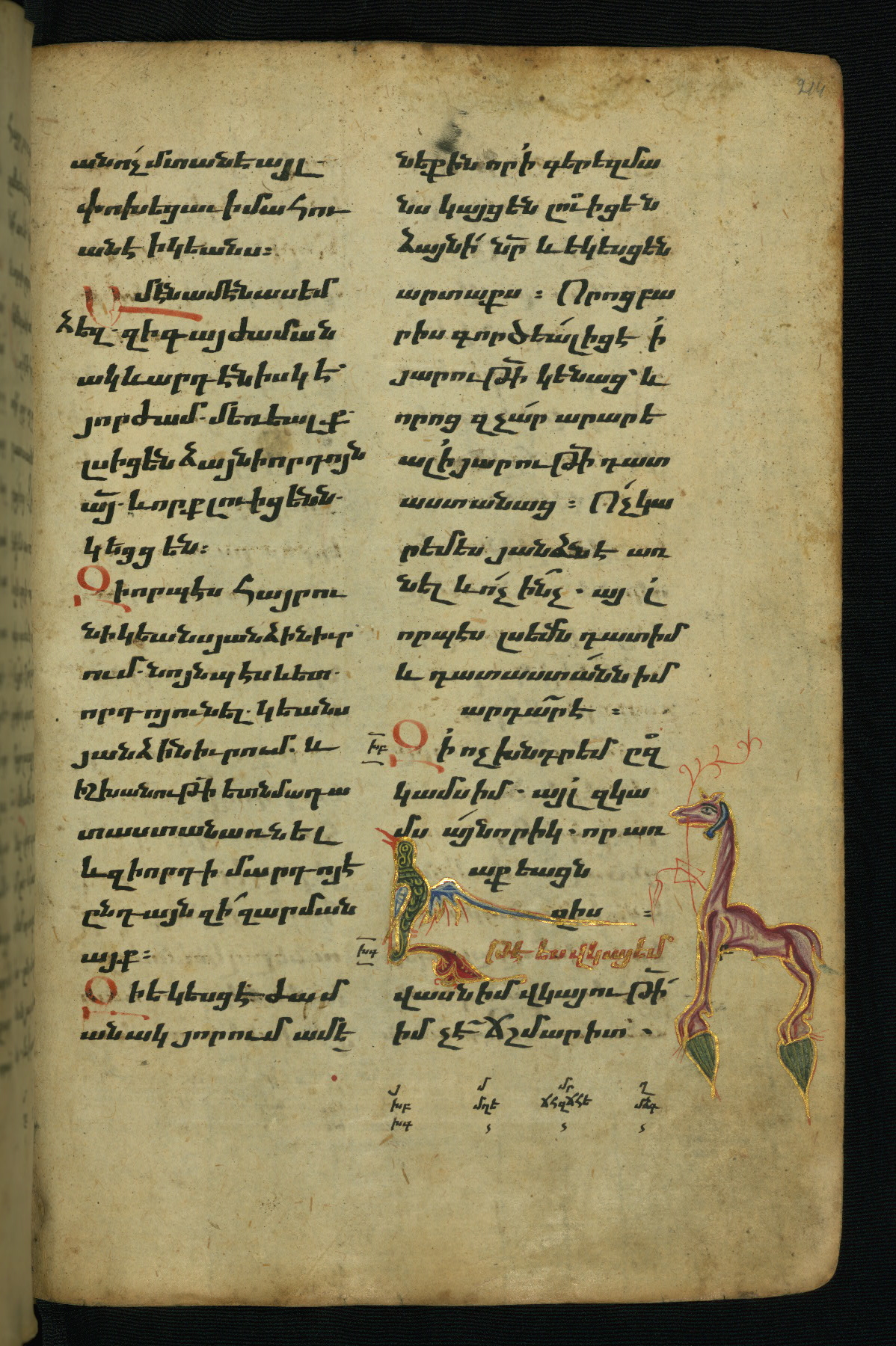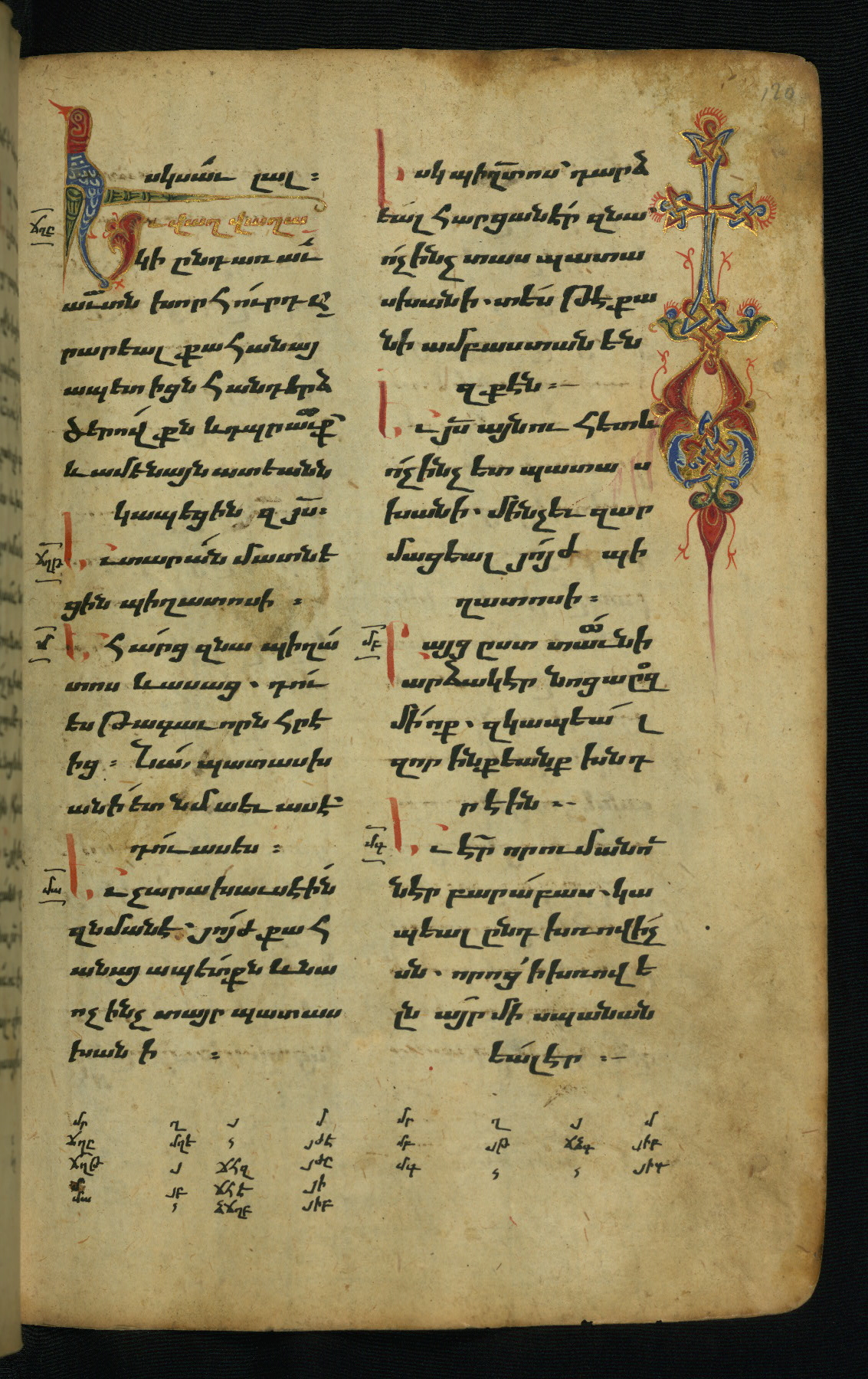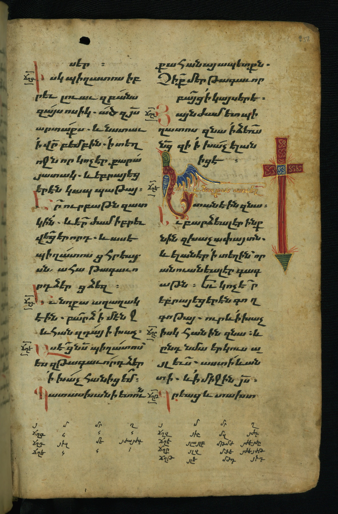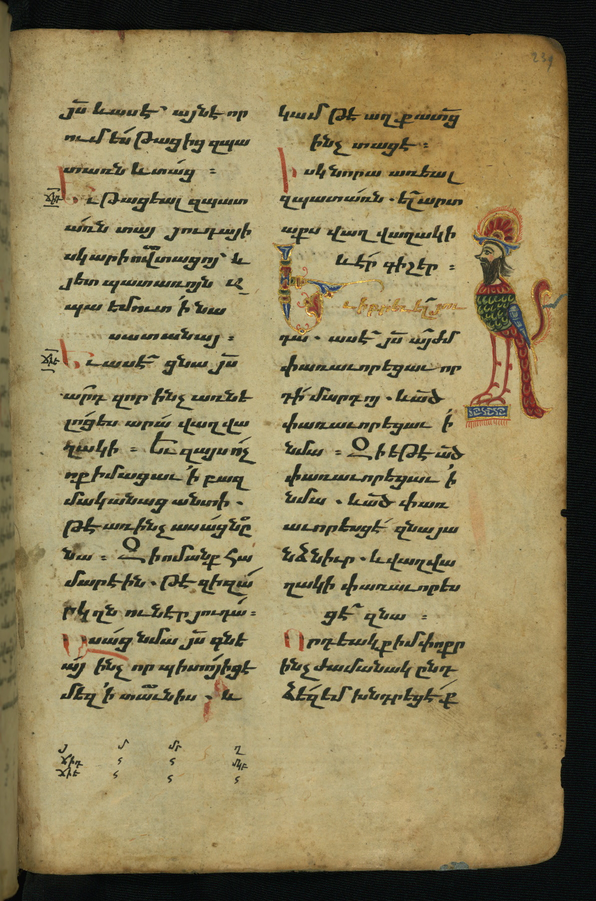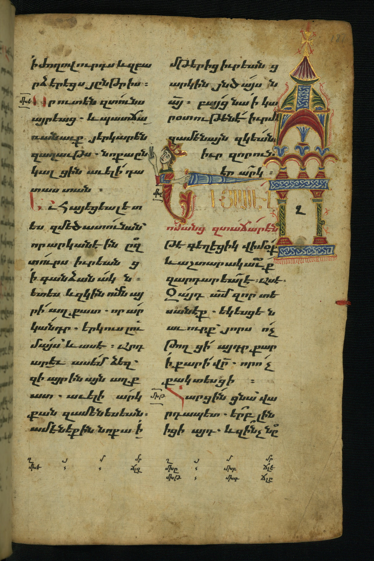- Hand note: Bolorgir (miniscule) for the text of the Gospels; erkat’agir (uncial) for letters introducing verses; upright erkat’agir (uncial) for the flyleaves and endleaves, which are from a thirteenth-century Gospel Book
