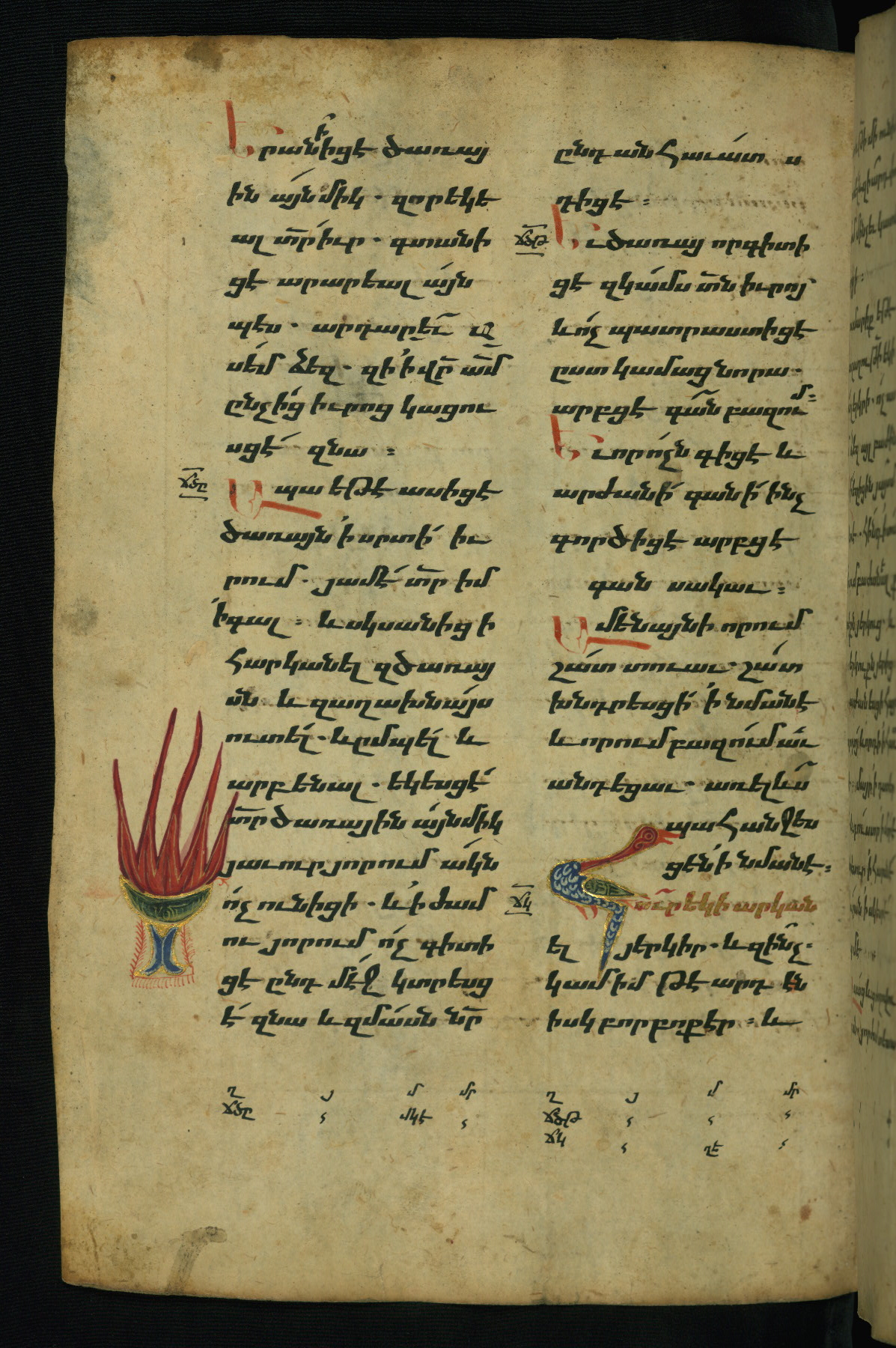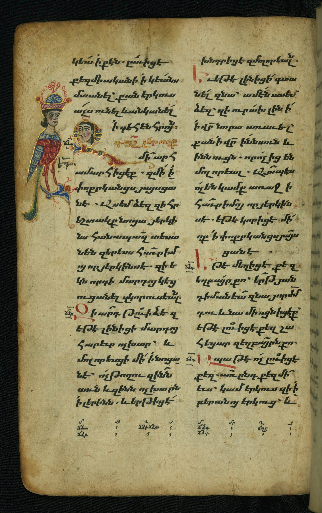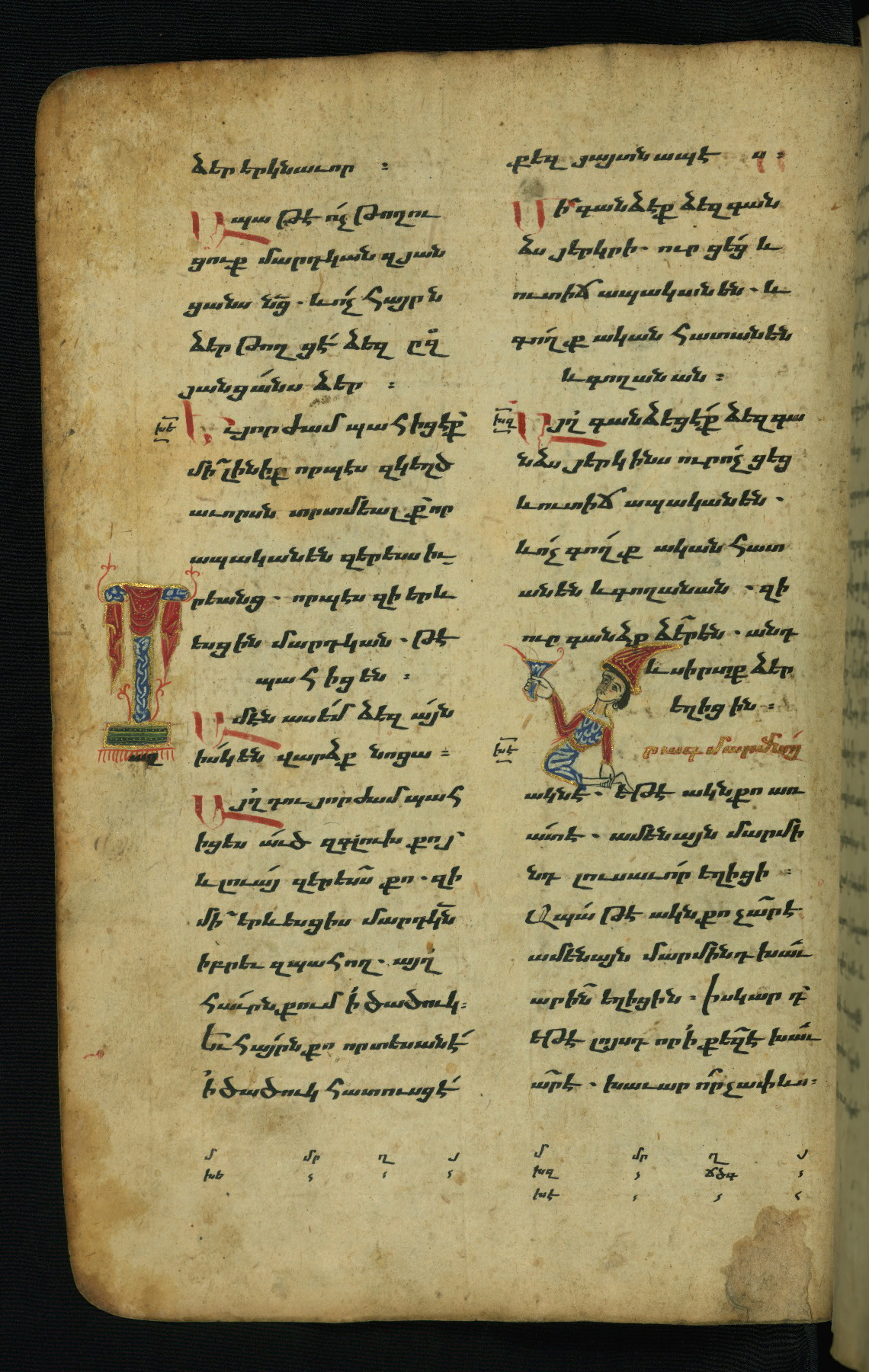 Flyleaves and endleaves are parchment, cut from a large thirteenth-century Gospel Book, with text written in upright erkat'agir (uncial)