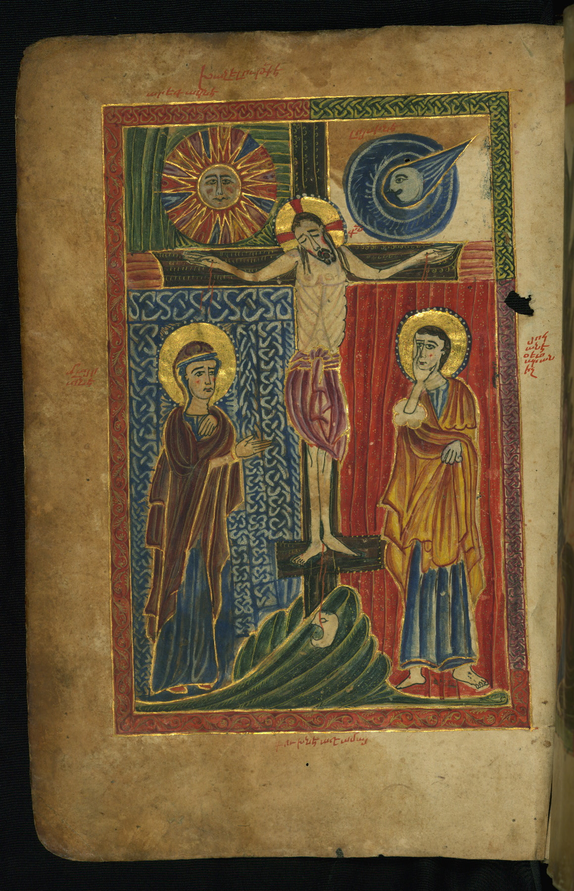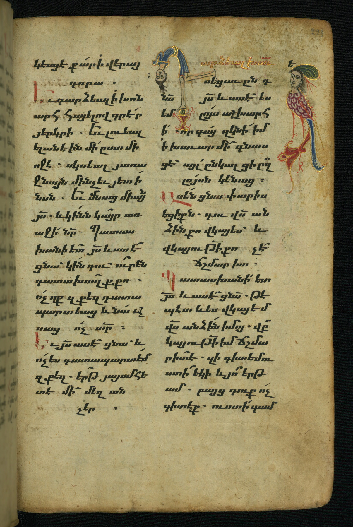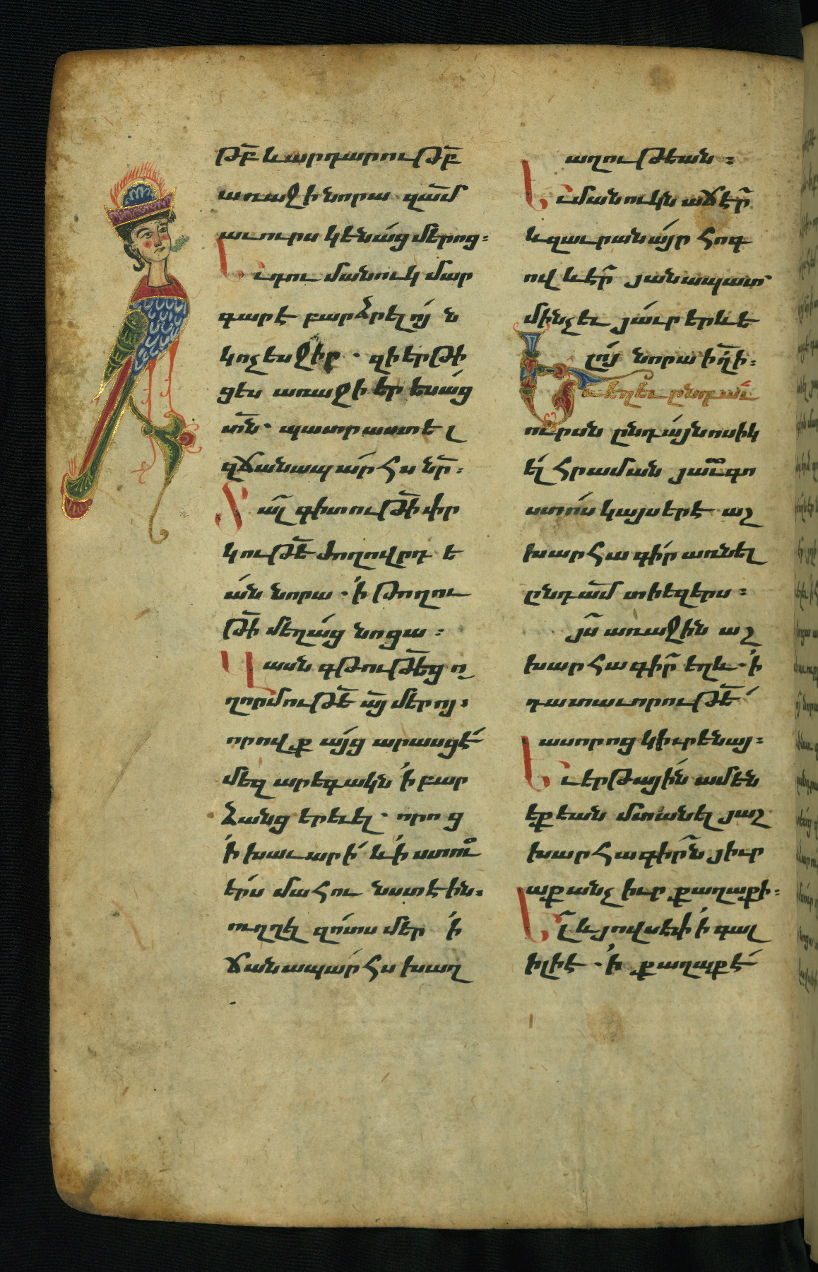 Flyleaves and endleaves are parchment, cut from a large thirteenth-century Gospel Book, with text written in upright erkat'agir (uncial)