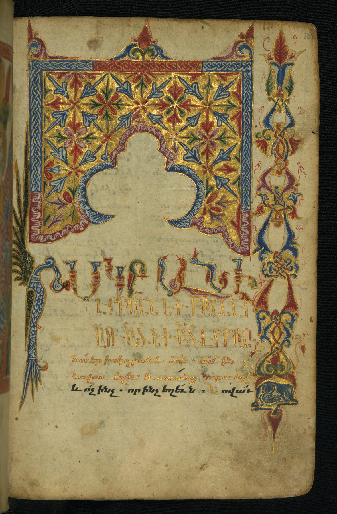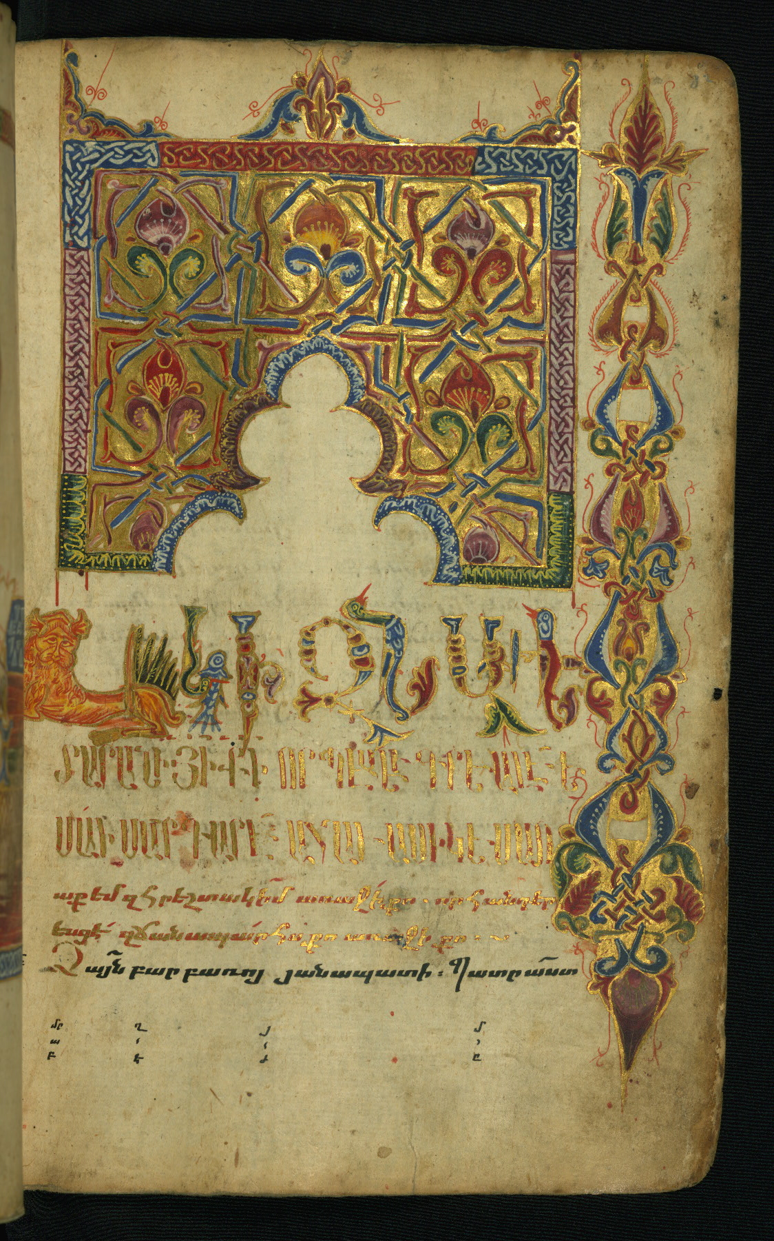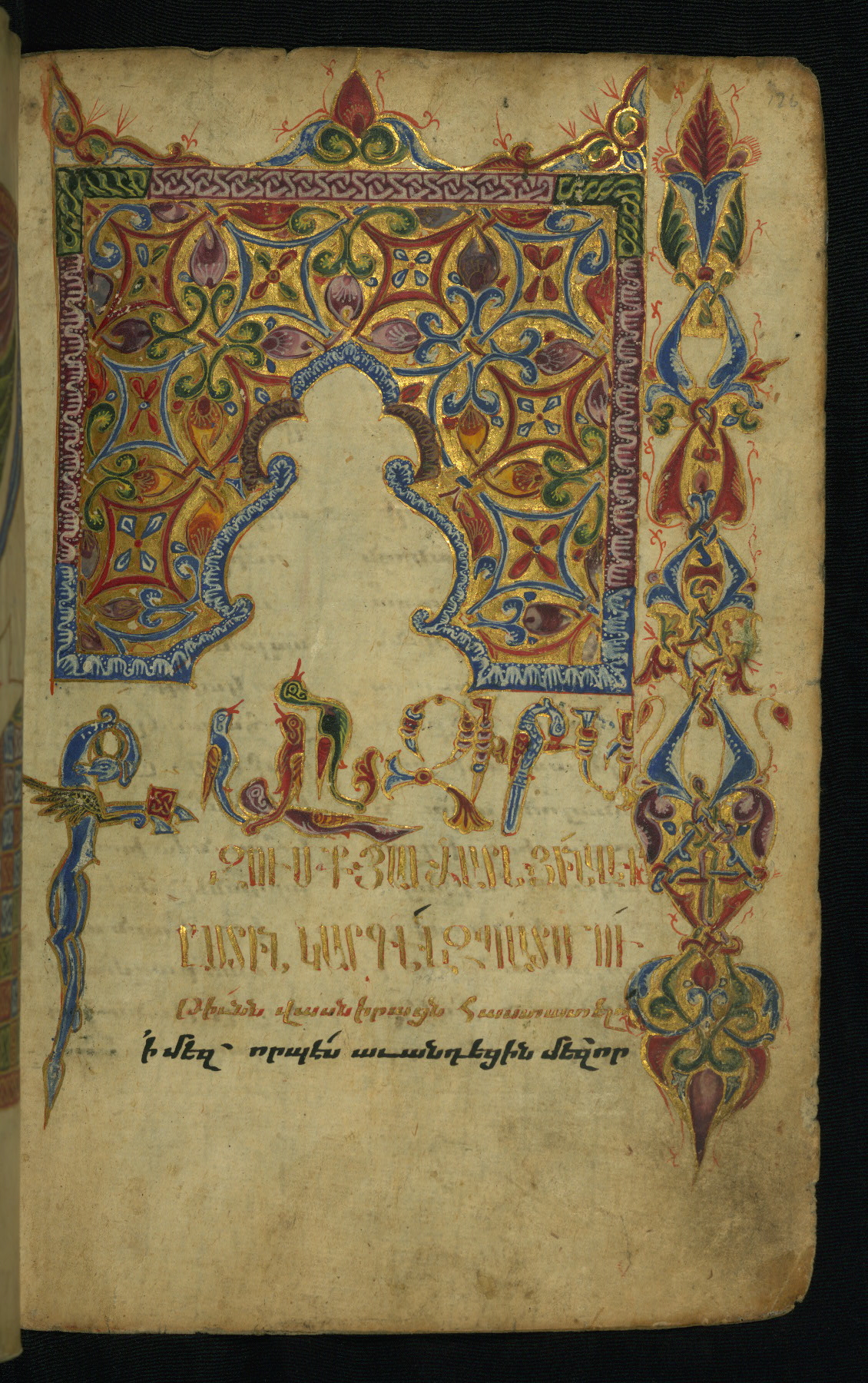 - Translation: Fol. 258r Blessing, thanksgiving, praise to the compassionate, the merciful and lover of mankind, to God the Father, God the Son, and God the Holy Spirit. Through the grace of whom this [exceedingly] wonderful and Gospels embellished by the Spirit was completed, which is the conjunction of the blessed Evangelists, according to the many shades of colors combined into one brilliant tissue. Which is artfully decorated with sweet flowers, and with […] composition, which has to be understood after the spirit. Copying (it) with distinct quality proportionate to the company of the souls shining in splendid light, made fitting for the disposition of the Church through the connection with the summit of peace. Because from this [the Gospels lead] to perfection. The four Gospels are a representation of many [things]. The four living beings, Human Being, Lion, Ox, Eagle. The four elements of the world, earth and water, air and fire, irreconcilable enemies and inseparable lovers. Four the four letters of the name of the Holy Trinity: Father [hayr], Son [ordi], Spirit [hogi]. The four rivers flowing out of Paradise; P‘ison, Gehon, Tigris, and Euphrates. (The) four corners and four horns of the altar. The four faces of the Holy Cross. The four virtues of the spirit: prudence, courage, temperance, and justice. The four sides of the universe: east, west, north and south. The four terms of this Gospel: message and commandment, threat and good news. With four words this Gospel speaks: through command and admonishing, through example and witnessing. And many other representations in which the foursome gospels are imitated. Of which the honorable and celibate monk (abegha) Yakob had become desirous, and sought to receive the impregnable abundance and the treasure that cannot be plundered, for his own enjoyment and that of the children of the Church. As a memorial to his soul and his parents, his father Umek, and his mother Hŕip‘simē, and his brothers Yovhannēs and Mkrtich‘, and his (= Mkrtich‘’s) spouse Ĵamal and to the children (of) Ghazar, of his daughter Mahruban and the sons of Yovhannēs, Vardan and Simēon, Nersēs and P‘aruwan, Awag and his daughter Habib, and the spouse of Yovhannēs, Ayrmelēk‘, and all his blood relatives, and his paternal uncle Umēd, and his spouse [...] [blank space], and his daughters Zarmandukht and Sandukht and his maternal uncle Astuacatur and his son Mkhit‘ar and to [the memory] of his other brother Hasan and his children Ghazar and Heran, and his maternal aunt Mamxadun and her son Sadagh. Well [nine lines blank in the manuscript] Now this Holy Gospels was written at the end of the day and at the running out of this time in [the year] 924 [= 1475 CE ] of the Armenian era during the patriarchate of Lord Sargis of Etchmiadzin, and during the reign of Uzun Hasan, who resides in T‘awrez [Tabriz]. Once more, prostrate we implore everyone who may happen upon this Holy Gospel, devote one "God have mercy" to the afflicted scribe Aristakēs, abundant in evil and devoid of good, the vilest of all the ecclesiastics, the false monk, the feigned one. And deem my parents, my father Grigor and my mother Mudam worthy of remembrance and God [will] remember you at his Second Coming. Amen. Once more, I implore thee to remember in your [exceeding] pure prayers my teacher, the blessed and courageous rabunapet Martiros vardapet, to whom we are deeply grateful, Christ the granter of gifts [shall] give him inexpressible good [ness] at his [Second] Coming. And our archbishop, Lord T‘uma, and his pure priests, amen, may it be so. Fol. 260v In the year 1093 (1644 CE) Lord Grigor blessed (pl.) Fol. 260v, in notrgir In the year thousand two hundred (= 1751 CE) on August 15 Lord Astuacatur’s son Petros was ordained. May God preserve him firm in his ordination. May God preserve him in his ordination from the temptations of Satan [from satanic temptations].