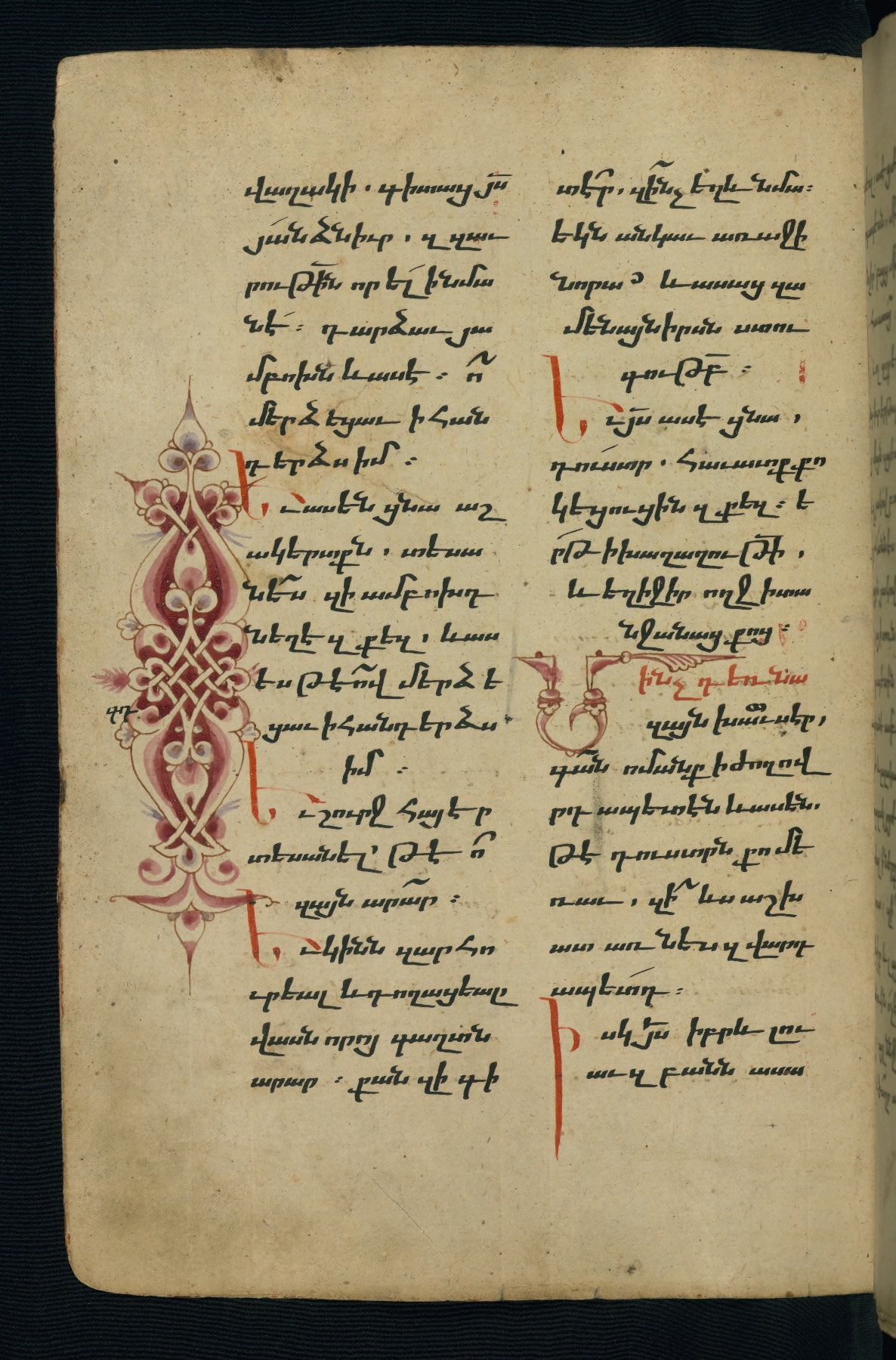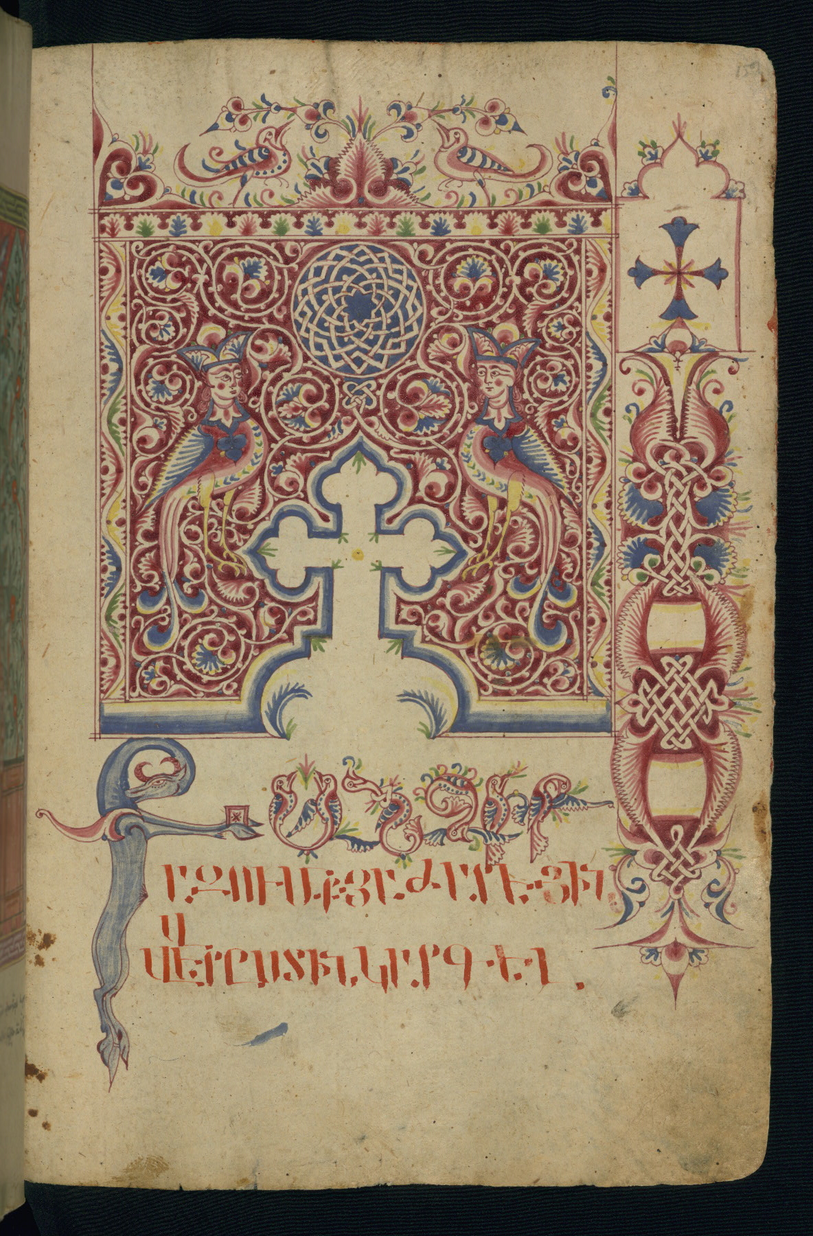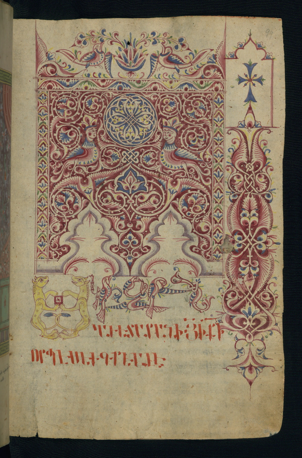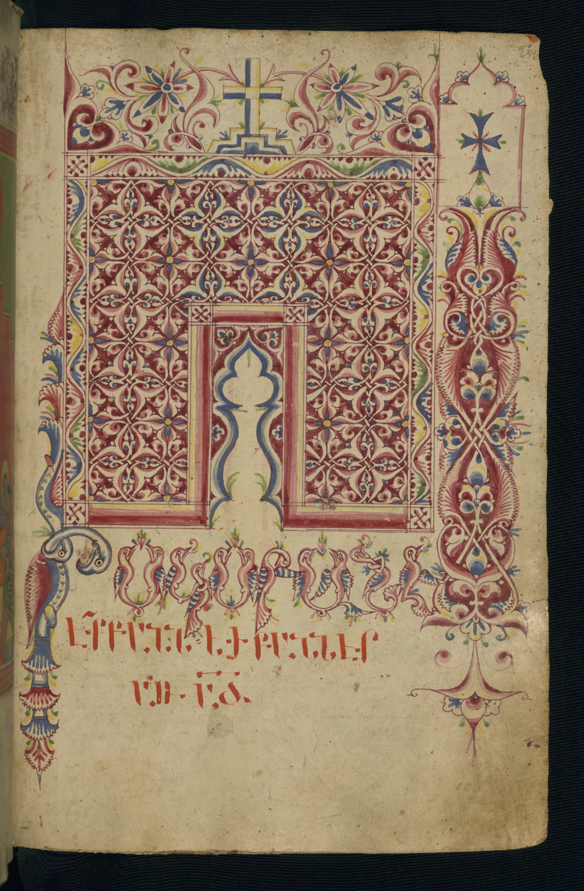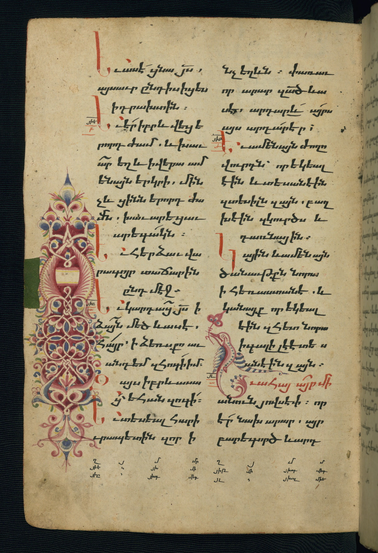 This Armenian Gospel book was produced in 904 of the Armenian era (1455 CE) at the monastery of Gamałiēl in Xizan by the scribe Yohannēs Vardapet, son of Vardan and Dilšat, and was illuminated by the priest Xačʿatur. The priest Pʿilipos commissioned the manuscript as a memorial to himself, his parents Łazar and Xutʿlumēlikʿ, and other relatives listed in the colophon on fols. 300r to 301v. Pʿilipos is depicted on fol. 14v alongside his brothers Yusēpʿ and Sultanša, as they kneel before the Virgin and Child enthroned (Theotokos). The book contains twenty-six full-page polychrome miniatures, including four Evangelist portraits; ornately designed canon tables; four decorated incipit pages; numerous marginal miniatures of floral and faunal motifs; and nineteen marginal miniatures of biblical characters or allusions to biblical narratives.