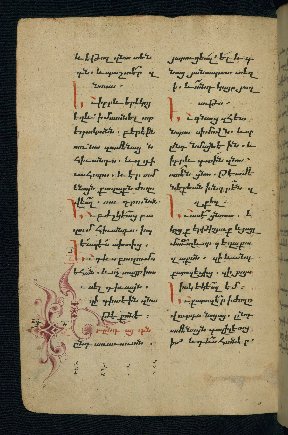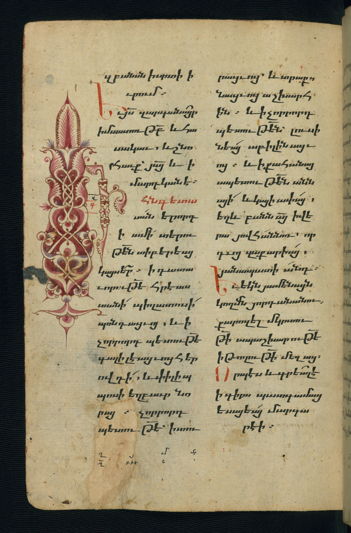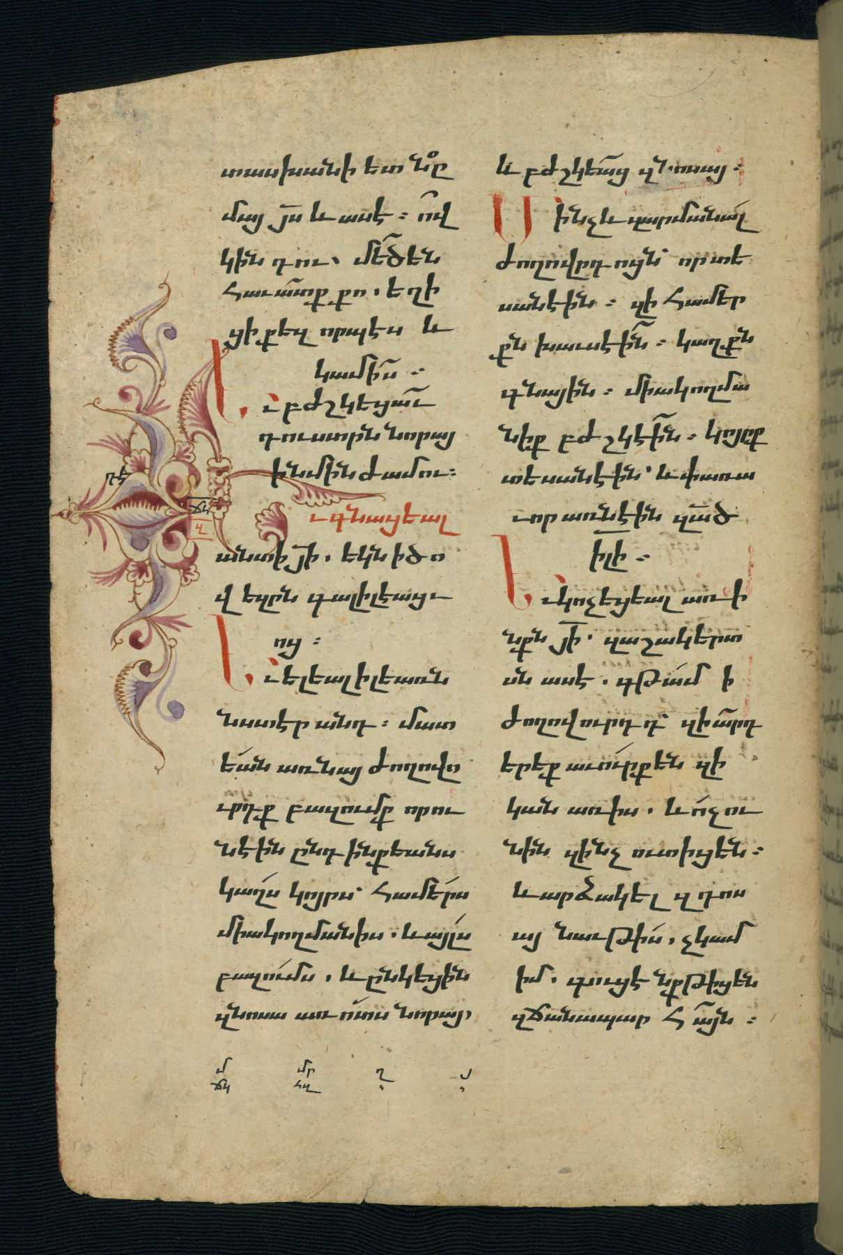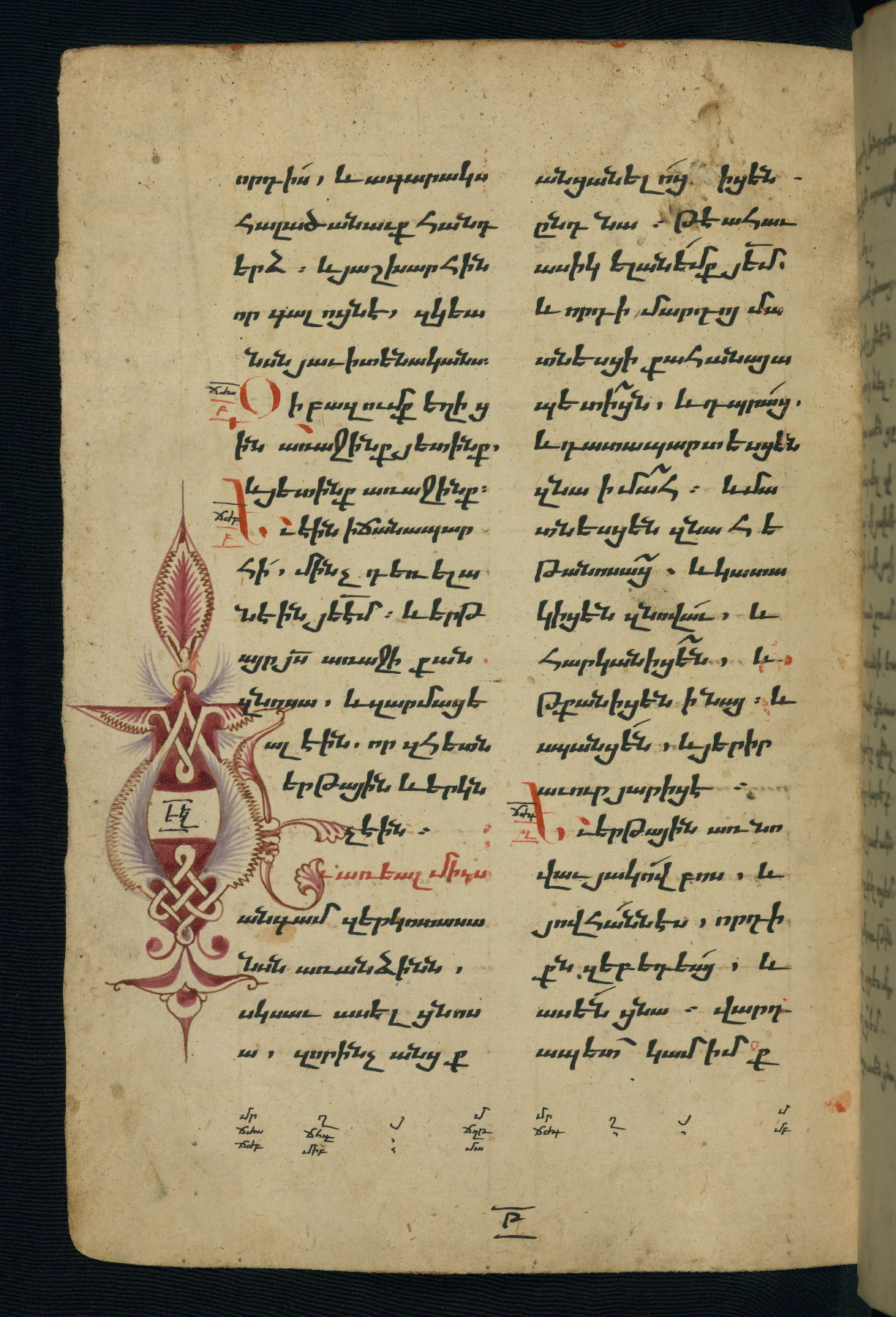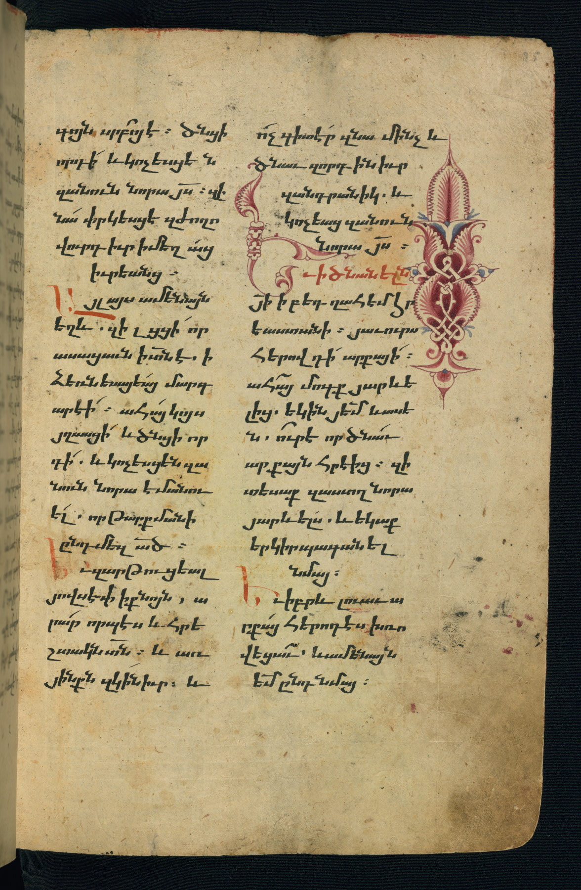 This Armenian Gospel book was produced in 904 of the Armenian era (1455 CE) at the monastery of Gamałiēl in Xizan by the scribe Yohannēs Vardapet, son of Vardan and Dilšat, and was illuminated by the priest Xačʿatur. The priest Pʿilipos commissioned the manuscript as a memorial to himself, his parents Łazar and Xutʿlumēlikʿ, and other relatives listed in the colophon on fols. 300r to 301v. Pʿilipos is depicted on fol. 14v alongside his brothers Yusēpʿ and Sultanša, as they kneel before the Virgin and Child enthroned (Theotokos). The book contains twenty-six full-page polychrome miniatures, including four Evangelist portraits; ornately designed canon tables; four decorated incipit pages; numerous marginal miniatures of floral and faunal motifs; and nineteen marginal miniatures of biblical characters or allusions to biblical narratives.