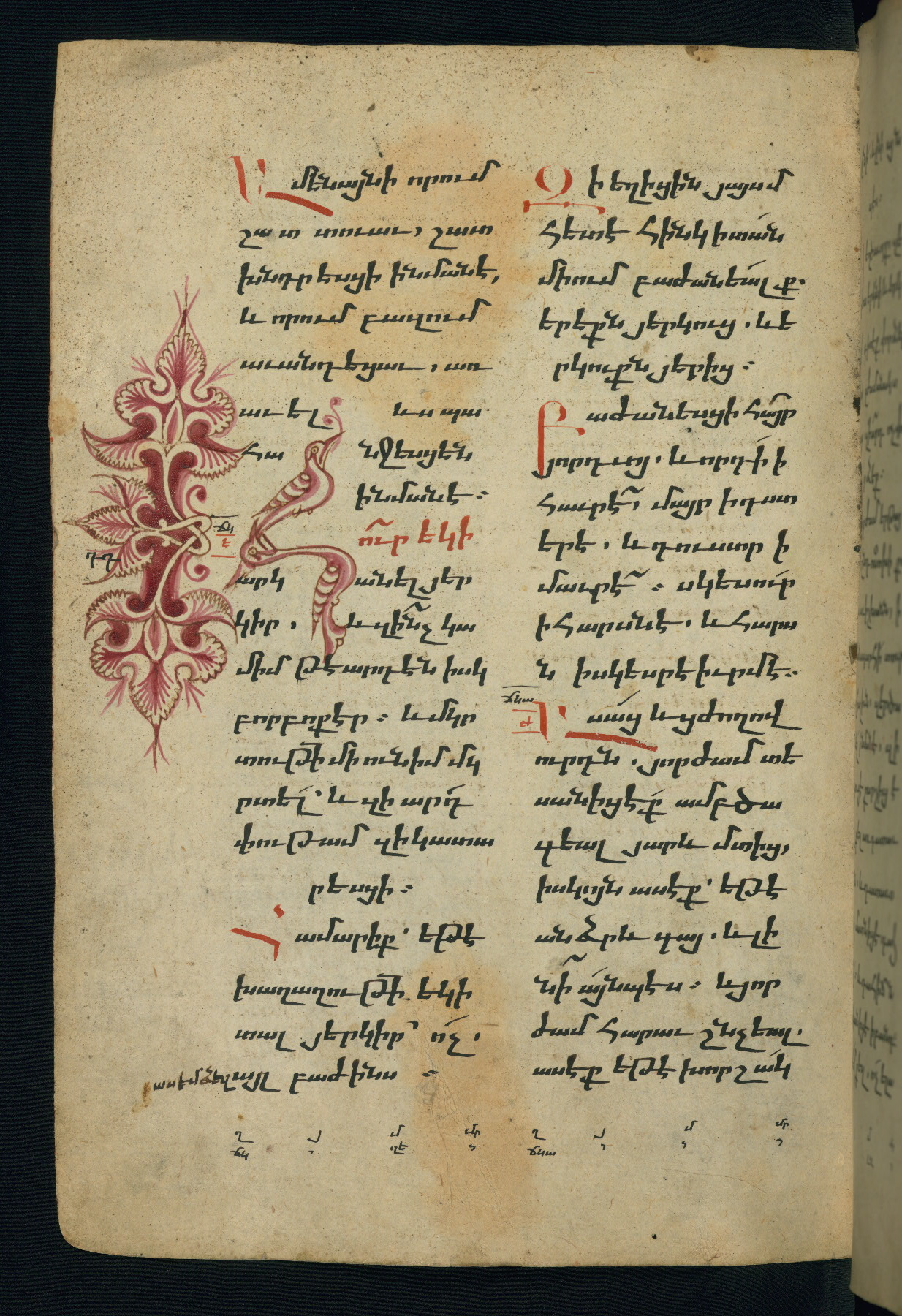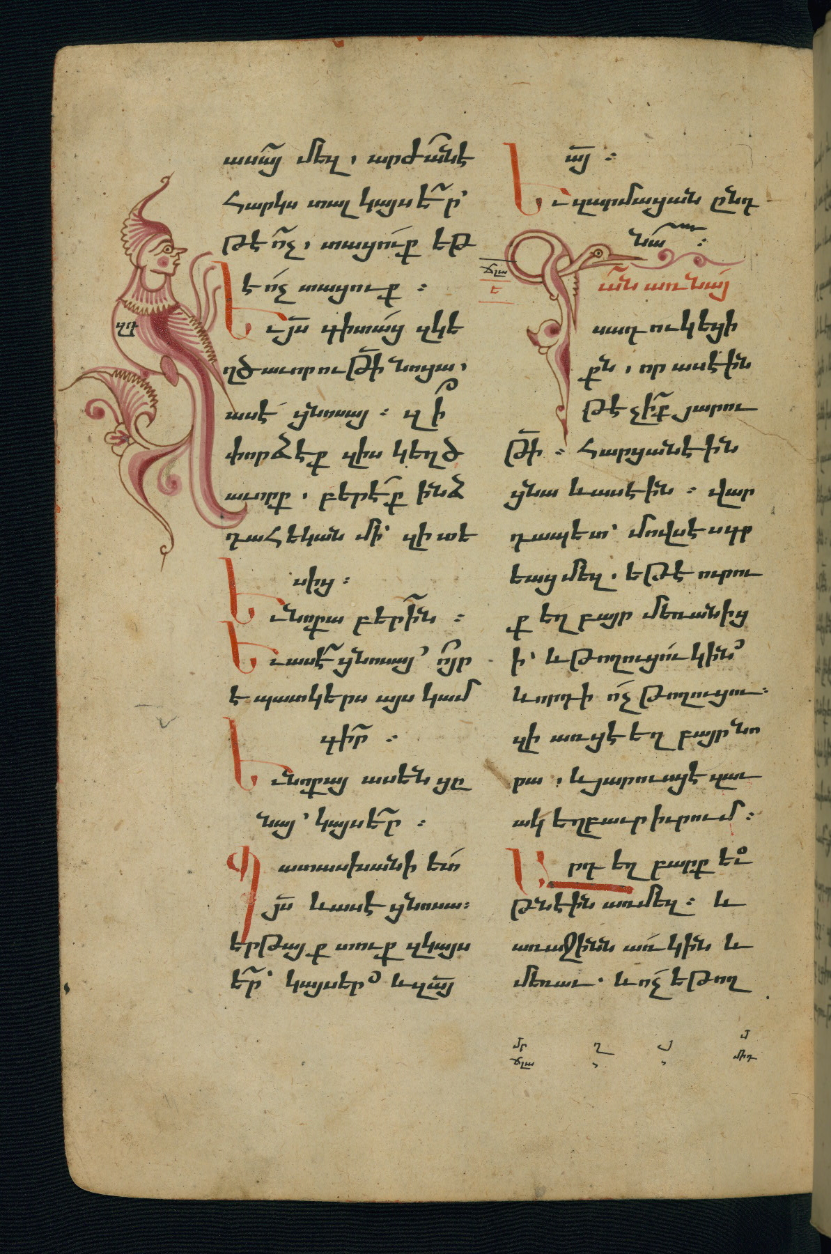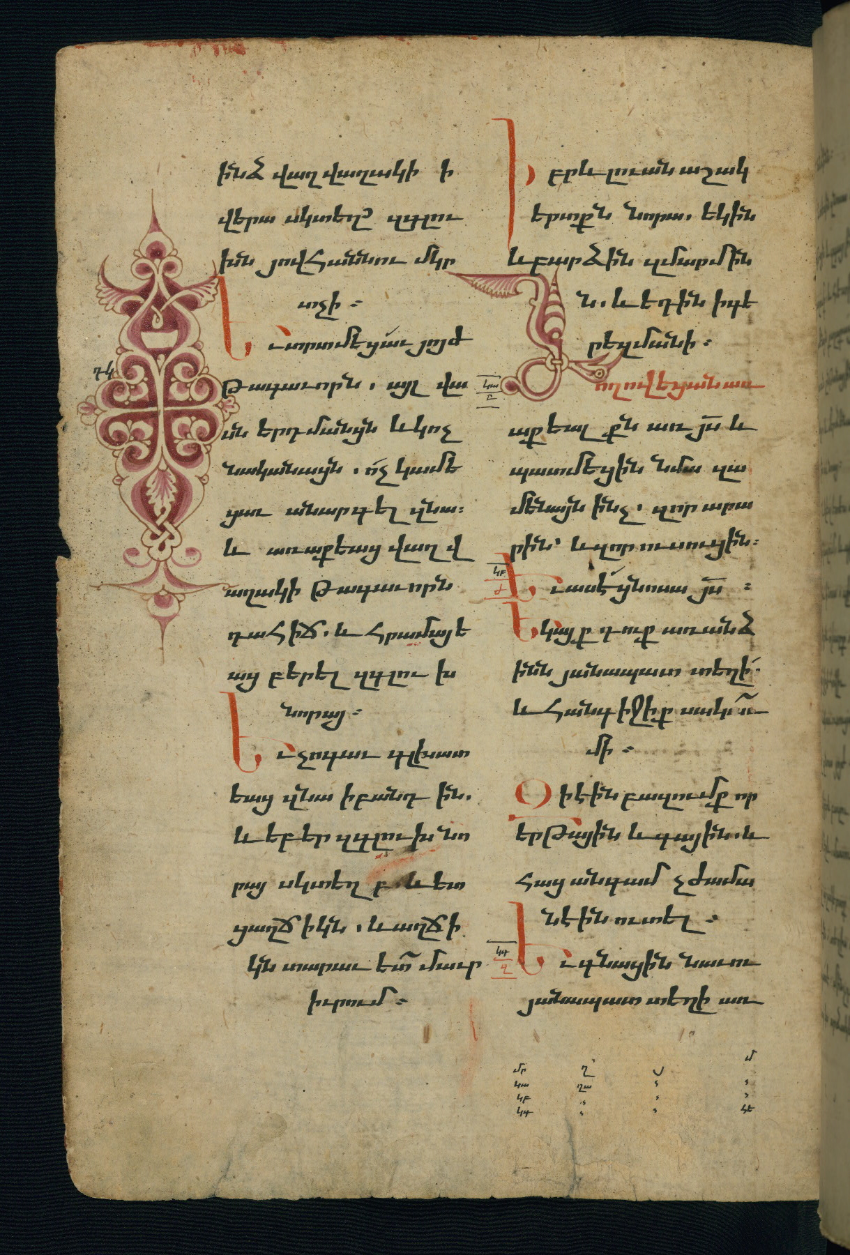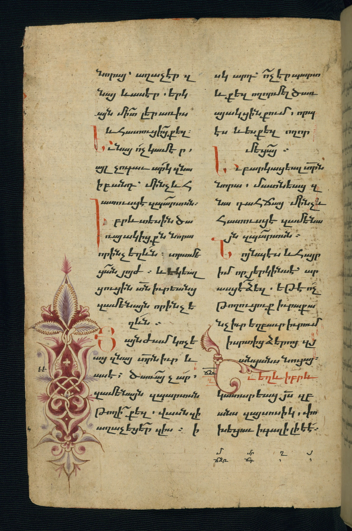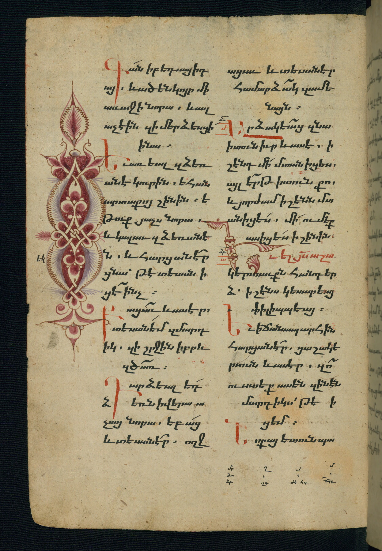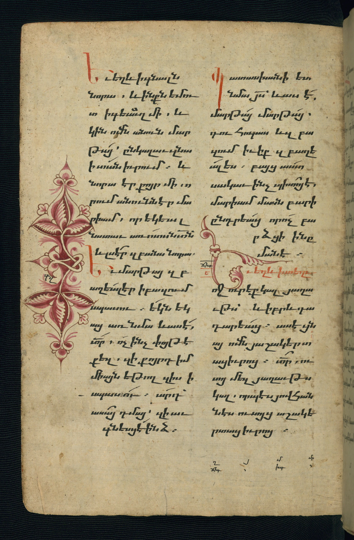 This Armenian Gospel book was produced in 904 of the Armenian era (1455 CE) at the monastery of Gamałiēl in Xizan by the scribe Yohannēs Vardapet, son of Vardan and Dilšat, and was illuminated by the priest Xačʿatur. The priest Pʿilipos commissioned the manuscript as a memorial to himself, his parents Łazar and Xutʿlumēlikʿ, and other relatives listed in the colophon on fols. 300r to 301v. Pʿilipos is depicted on fol. 14v alongside his brothers Yusēpʿ and Sultanša, as they kneel before the Virgin and Child enthroned (Theotokos). The book contains twenty-six full-page polychrome miniatures, including four Evangelist portraits; ornately designed canon tables; four decorated incipit pages; numerous marginal miniatures of floral and faunal motifs; and nineteen marginal miniatures of biblical characters or allusions to biblical narratives.