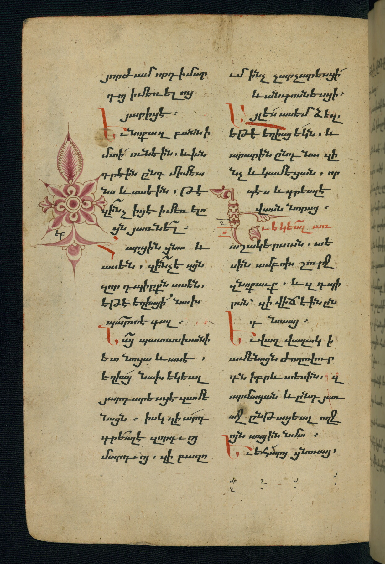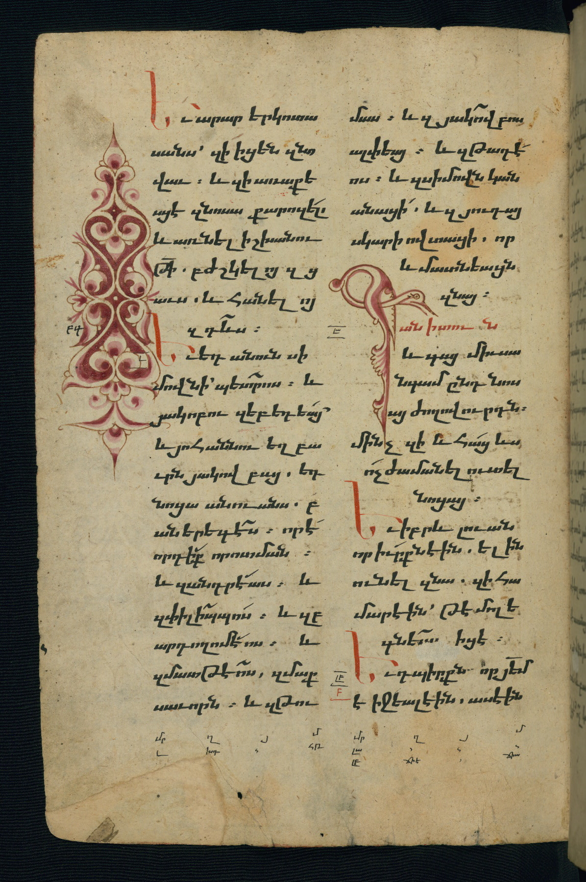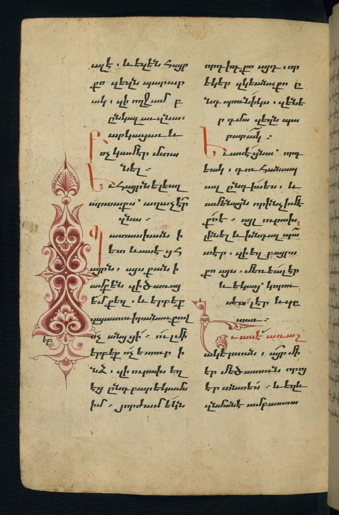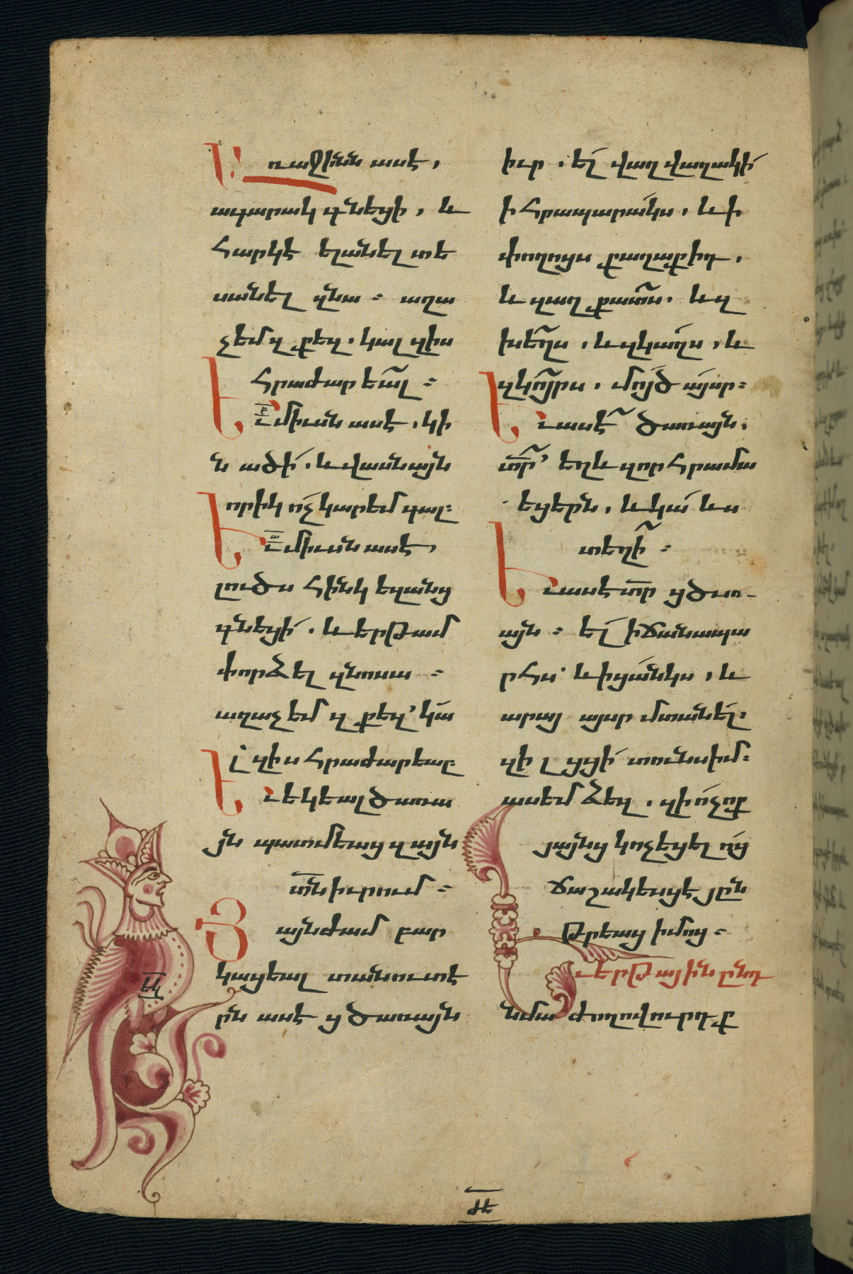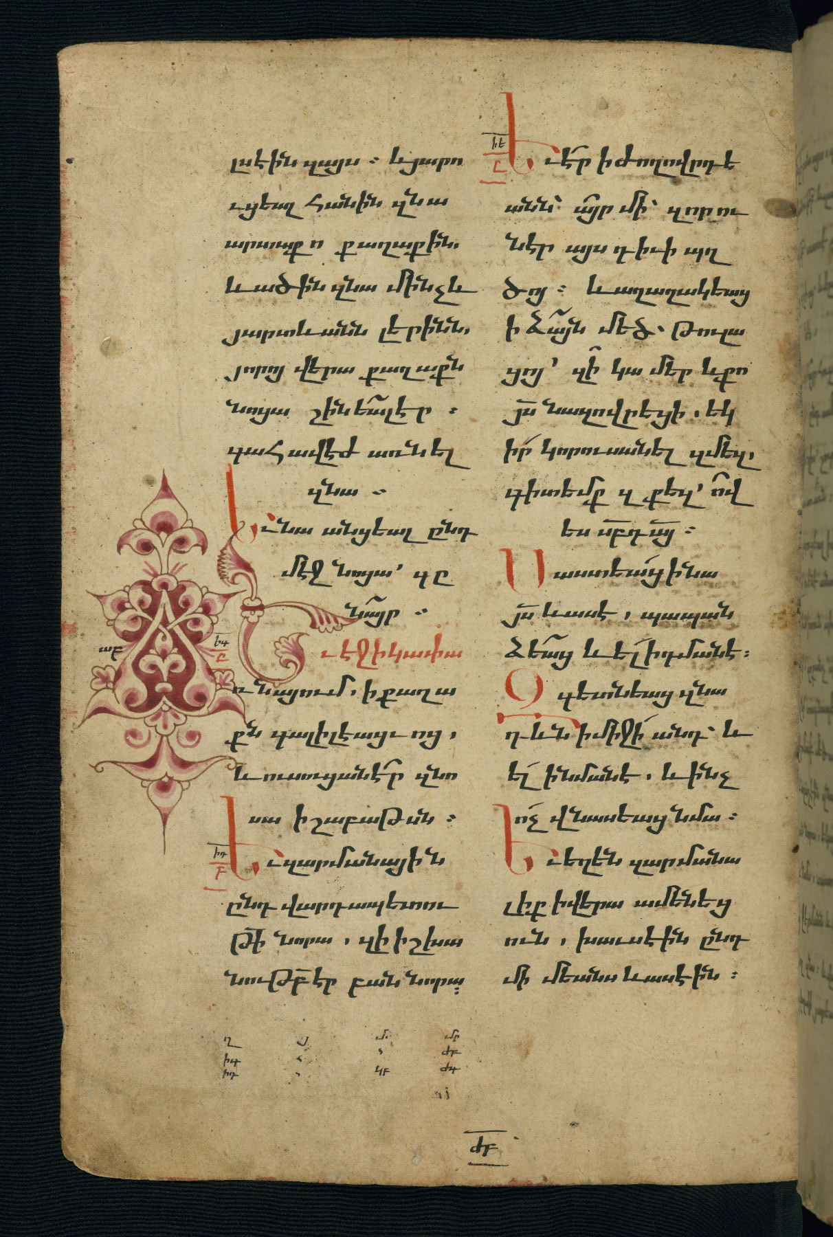 This Armenian Gospel book was produced in 904 of the Armenian era (1455 CE) at the monastery of Gamałiēl in Xizan by the scribe Yohannēs Vardapet, son of Vardan and Dilšat, and was illuminated by the priest Xačʿatur. The priest Pʿilipos commissioned the manuscript as a memorial to himself, his parents Łazar and Xutʿlumēlikʿ, and other relatives listed in the colophon on fols. 300r to 301v. Pʿilipos is depicted on fol. 14v alongside his brothers Yusēpʿ and Sultanša, as they kneel before the Virgin and Child enthroned (Theotokos). The book contains twenty-six full-page polychrome miniatures, including four Evangelist portraits; ornately designed canon tables; four decorated incipit pages; numerous marginal miniatures of floral and faunal motifs; and nineteen marginal miniatures of biblical characters or allusions to biblical narratives.