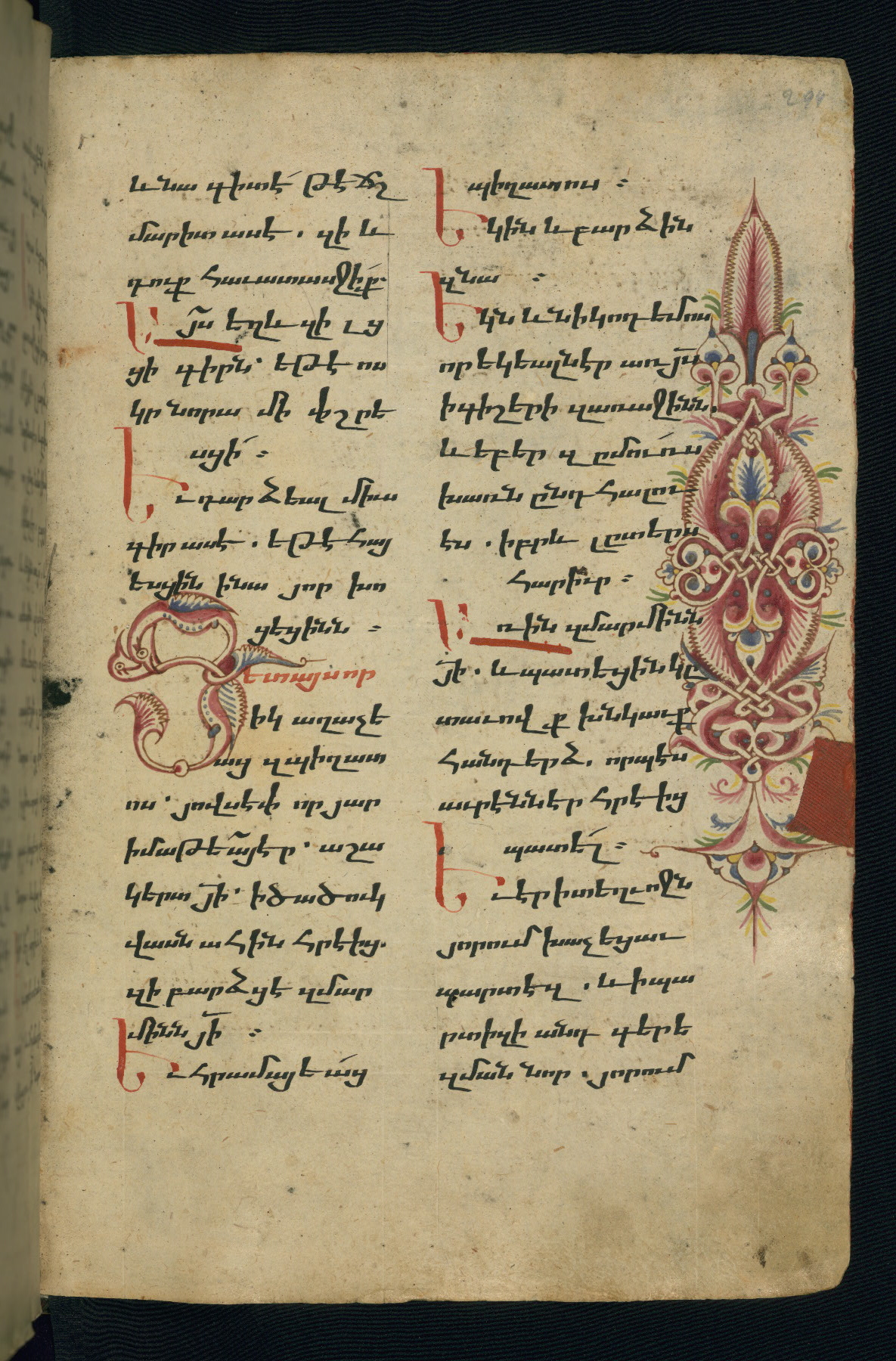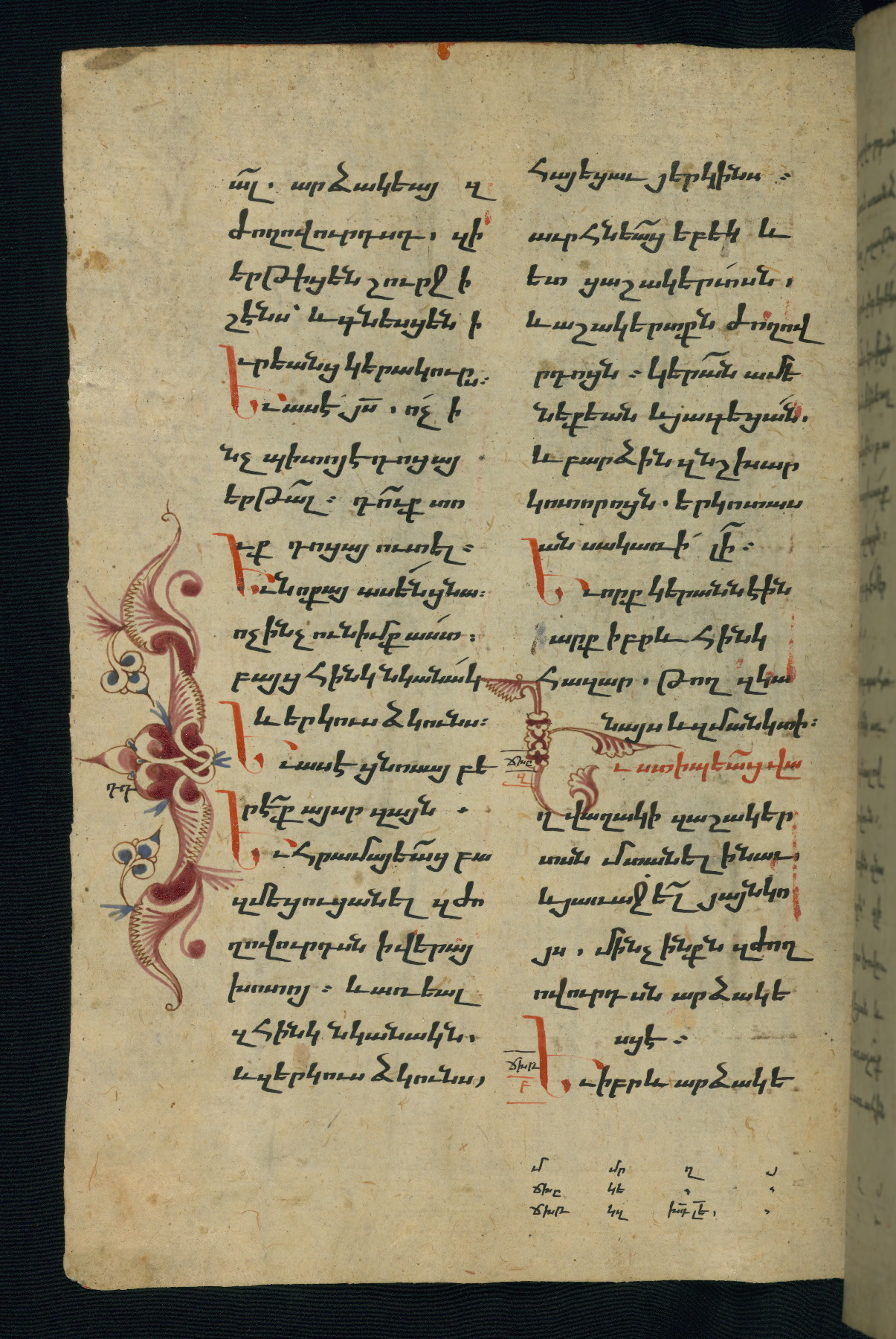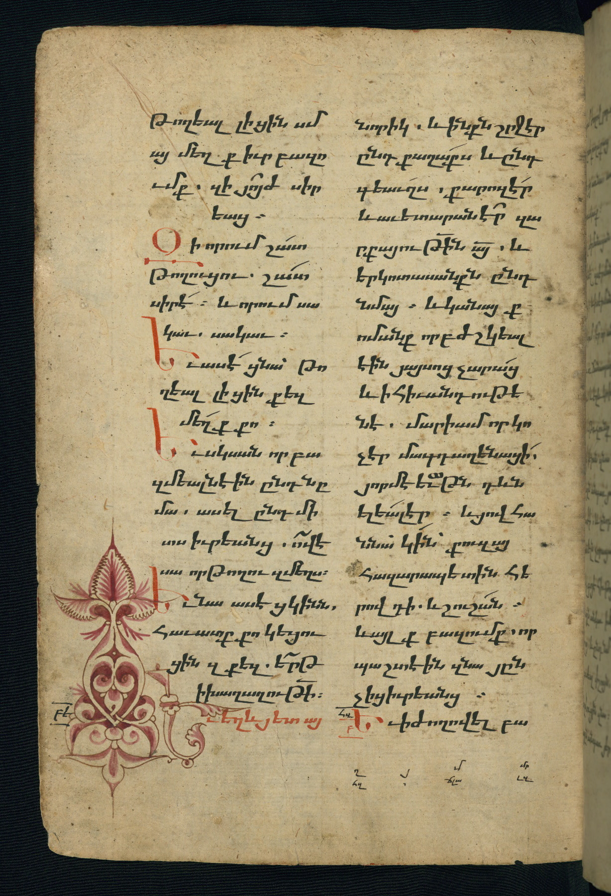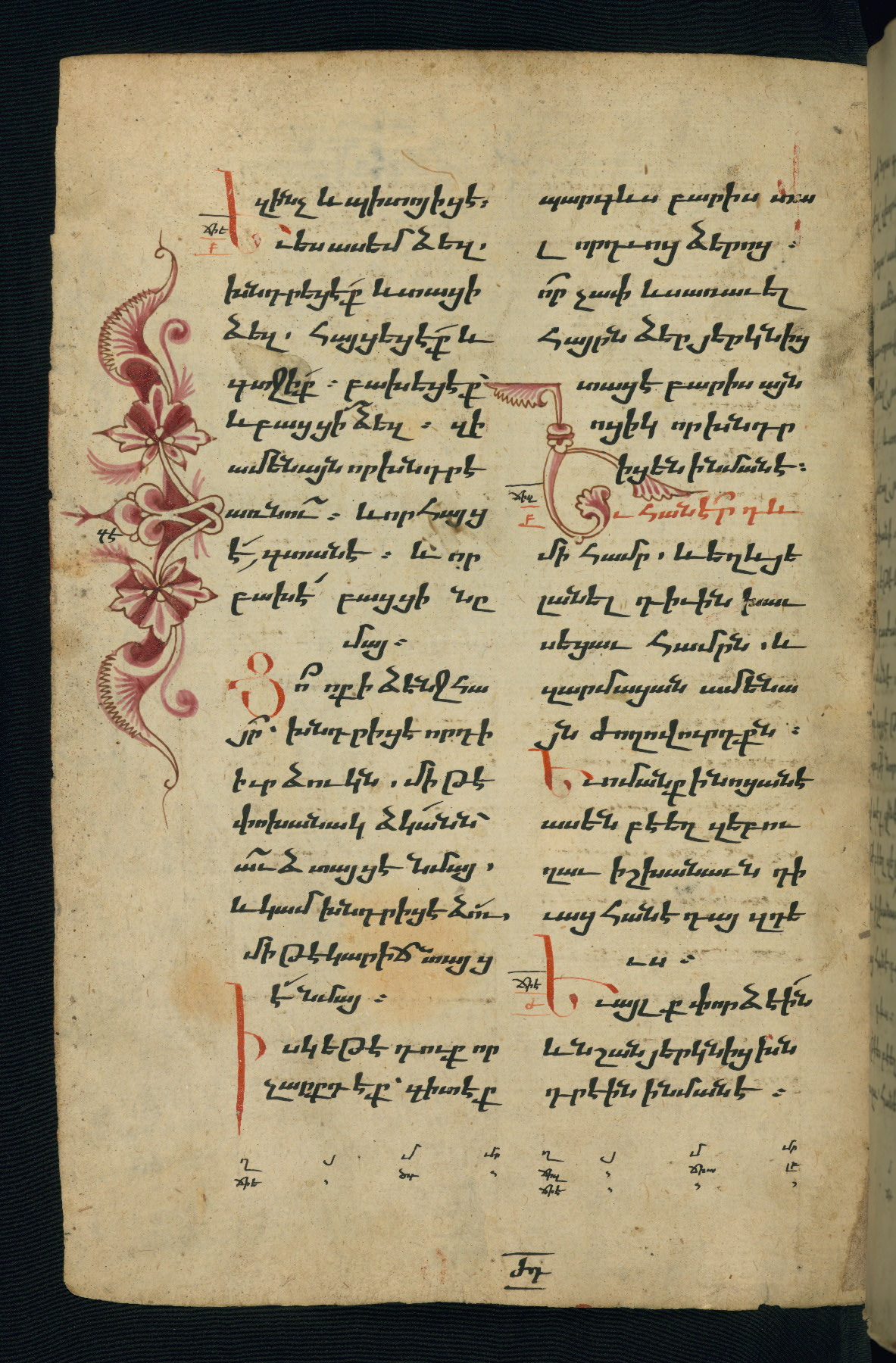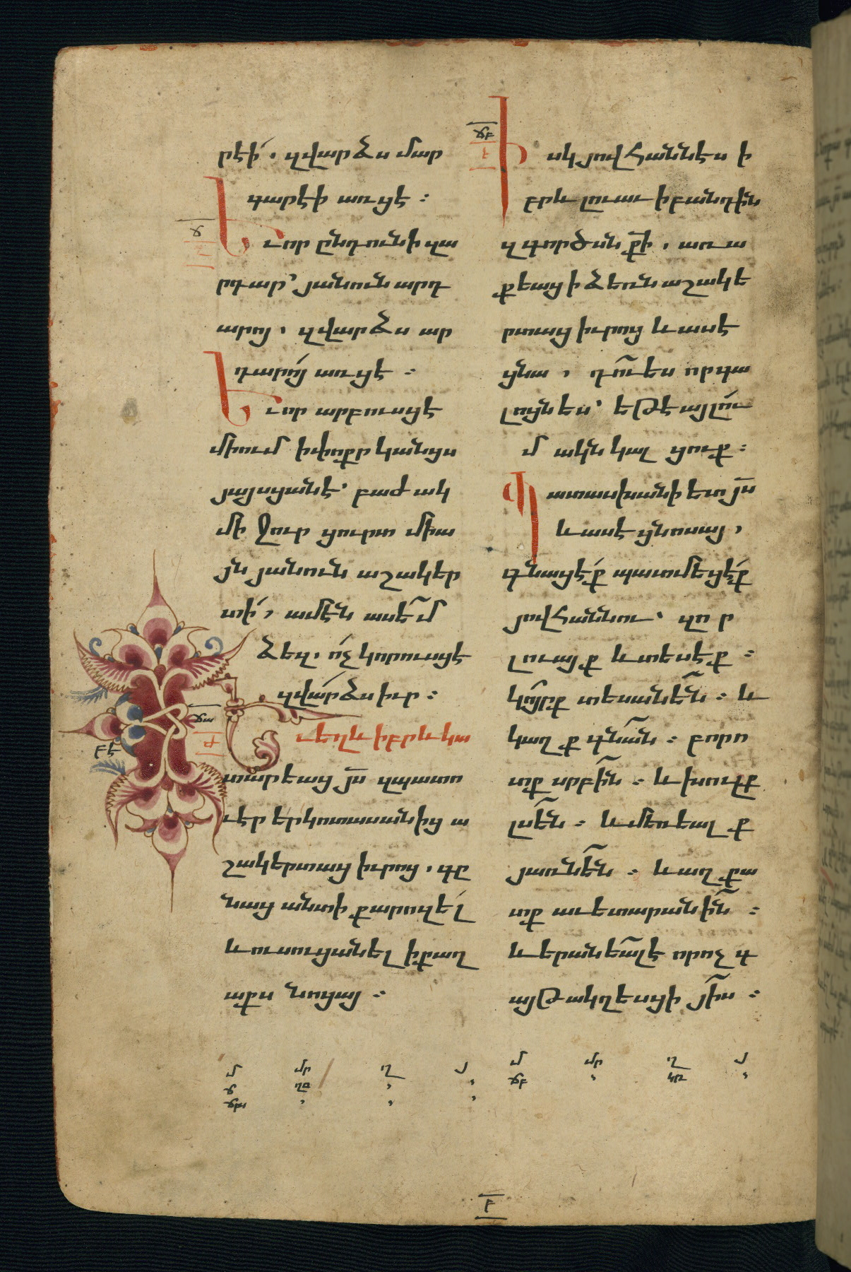 This Armenian Gospel book was produced in 904 of the Armenian era (1455 CE) at the monastery of Gamałiēl in Xizan by the scribe Yohannēs Vardapet, son of Vardan and Dilšat, and was illuminated by the priest Xačʿatur. The priest Pʿilipos commissioned the manuscript as a memorial to himself, his parents Łazar and Xutʿlumēlikʿ, and other relatives listed in the colophon on fols. 300r to 301v. Pʿilipos is depicted on fol. 14v alongside his brothers Yusēpʿ and Sultanša, as they kneel before the Virgin and Child enthroned (Theotokos). The book contains twenty-six full-page polychrome miniatures, including four Evangelist portraits; ornately designed canon tables; four decorated incipit pages; numerous marginal miniatures of floral and faunal motifs; and nineteen marginal miniatures of biblical characters or allusions to biblical narratives.