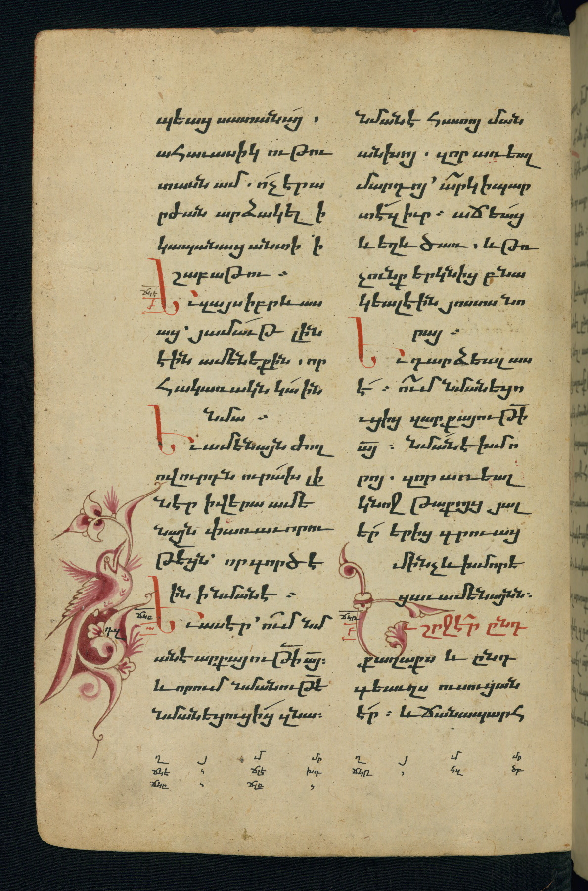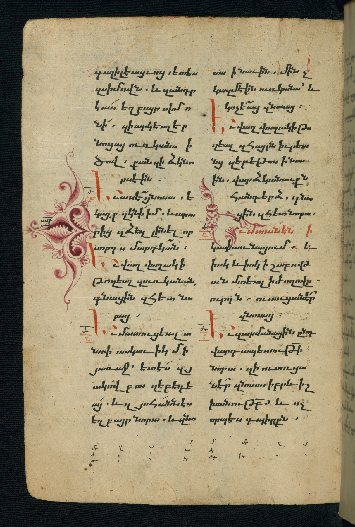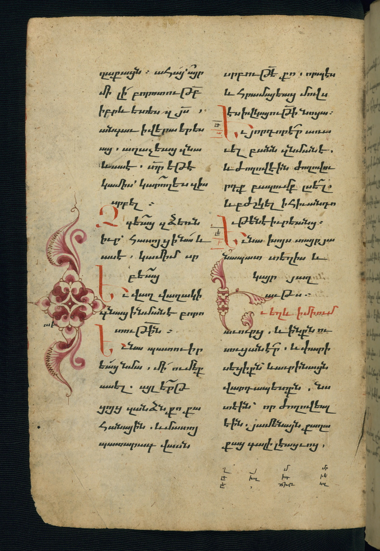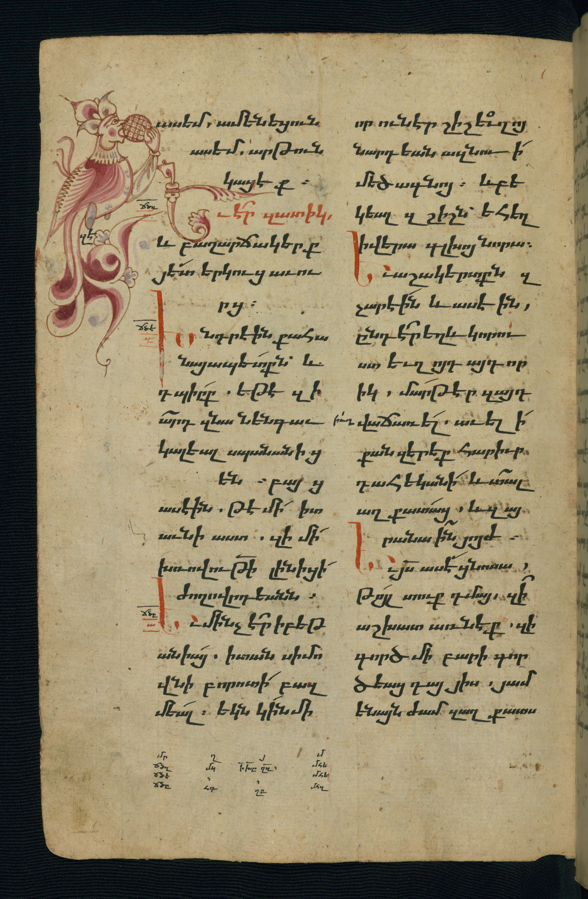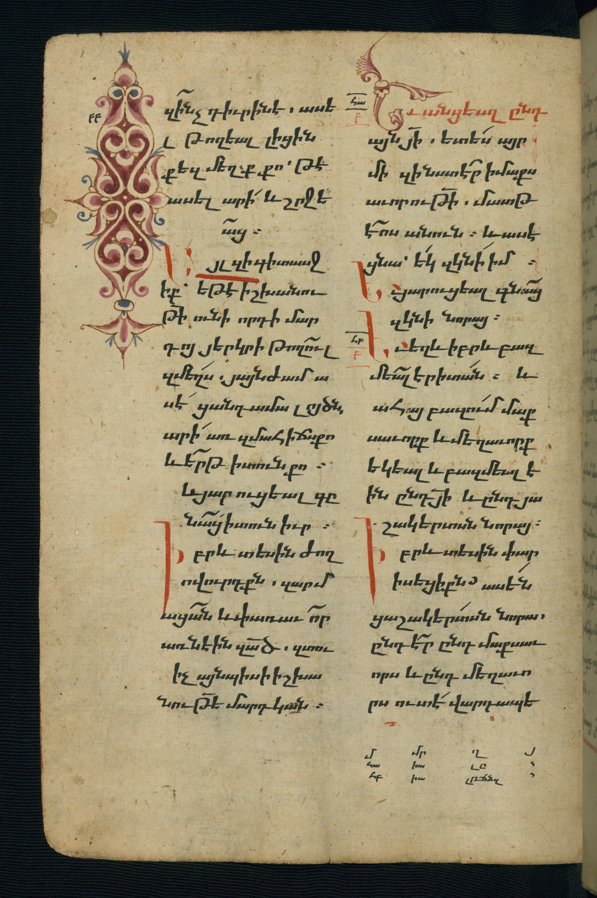This Armenian Gospel book was produced in 904 of the Armenian era (1455 CE) at the monastery of Gamałiēl in Xizan by the scribe Yohannēs Vardapet, son of Vardan and Dilšat, and was illuminated by the priest Xačʿatur. The priest Pʿilipos commissioned the manuscript as a memorial to himself, his parents Łazar and Xutʿlumēlikʿ, and other relatives listed in the colophon on fols. 300r to 301v. Pʿilipos is depicted on fol. 14v alongside his brothers Yusēpʿ and Sultanša, as they kneel before the Virgin and Child enthroned (Theotokos). The book contains twenty-six full-page polychrome miniatures, including four Evangelist portraits; ornately designed canon tables; four decorated incipit pages; numerous marginal miniatures of floral and faunal motifs; and nineteen marginal miniatures of biblical characters or allusions to biblical narratives.