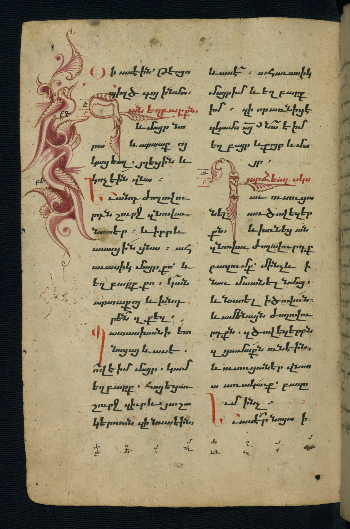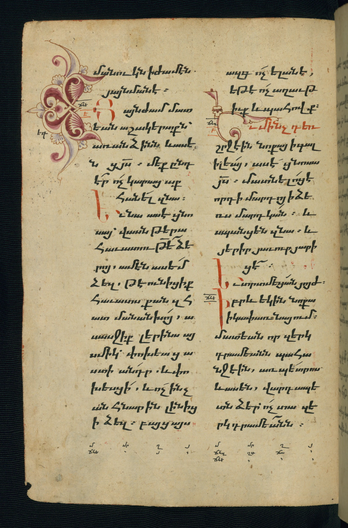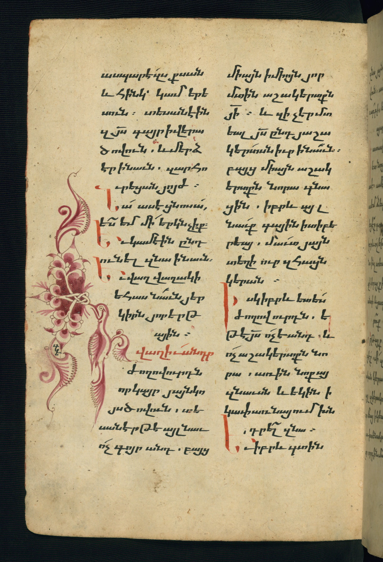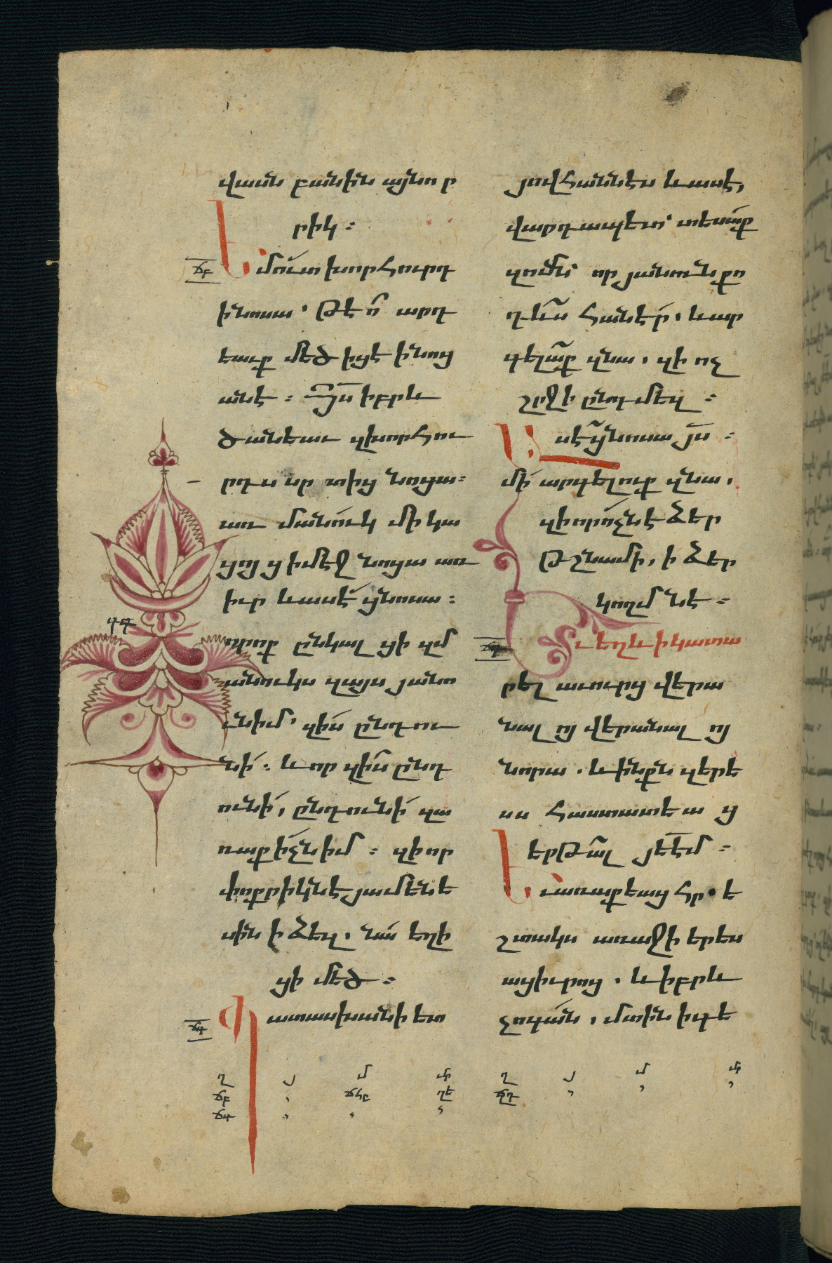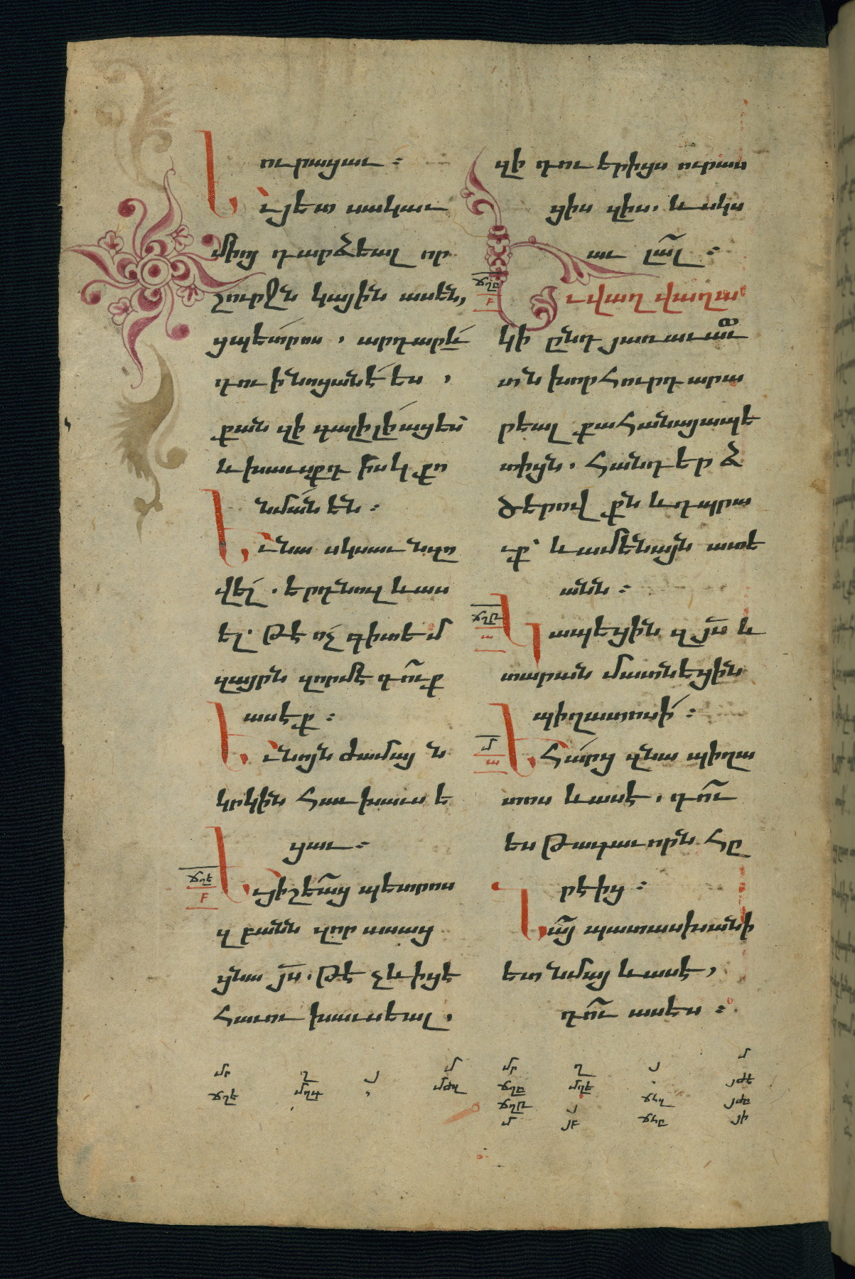 This Armenian Gospel book was produced in 904 of the Armenian era (1455 CE) at the monastery of Gamałiēl in Xizan by the scribe Yohannēs Vardapet, son of Vardan and Dilšat, and was illuminated by the priest Xačʿatur. The priest Pʿilipos commissioned the manuscript as a memorial to himself, his parents Łazar and Xutʿlumēlikʿ, and other relatives listed in the colophon on fols. 300r to 301v. Pʿilipos is depicted on fol. 14v alongside his brothers Yusēpʿ and Sultanša, as they kneel before the Virgin and Child enthroned (Theotokos). The book contains twenty-six full-page polychrome miniatures, including four Evangelist portraits; ornately designed canon tables; four decorated incipit pages; numerous marginal miniatures of floral and faunal motifs; and nineteen marginal miniatures of biblical characters or allusions to biblical narratives.