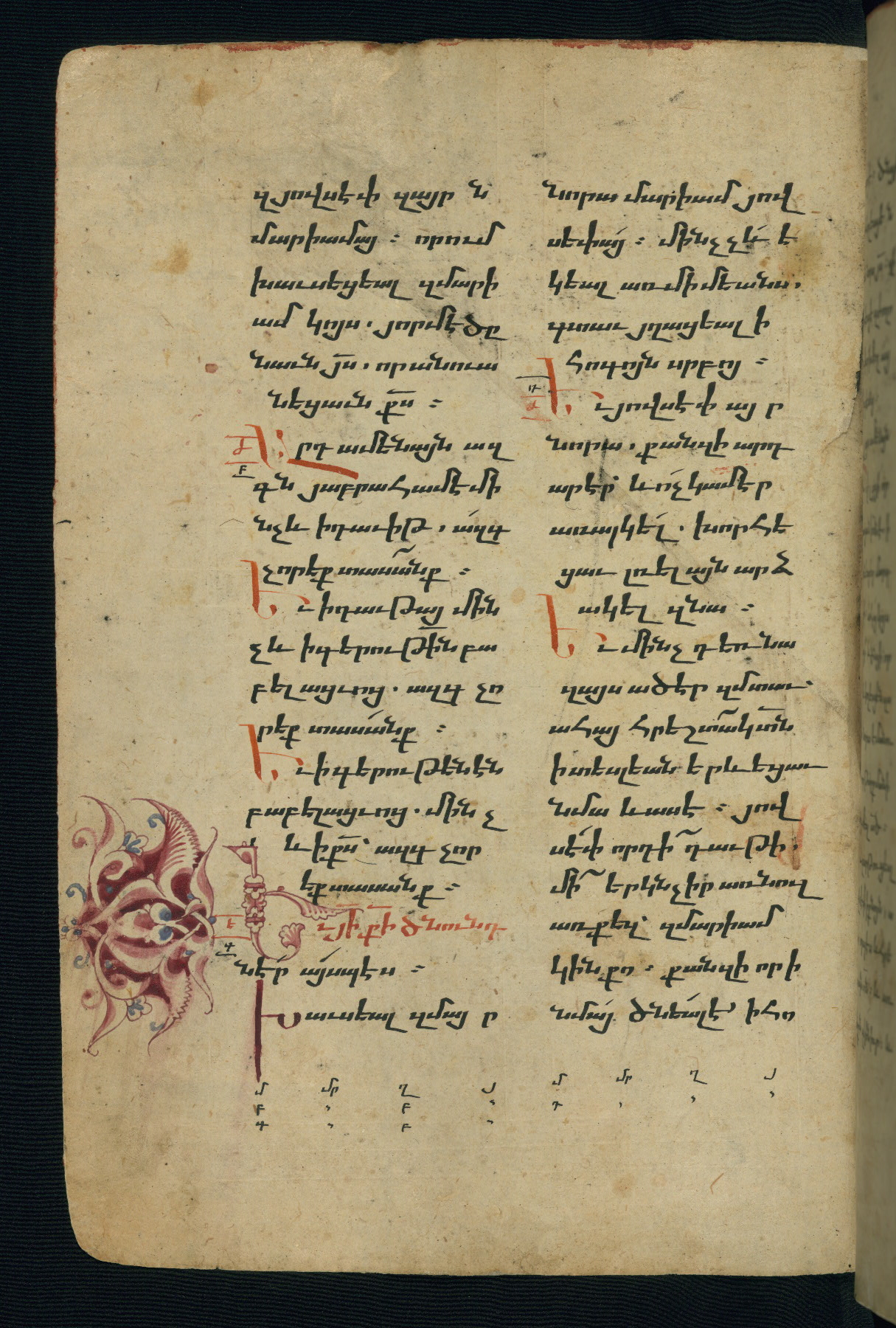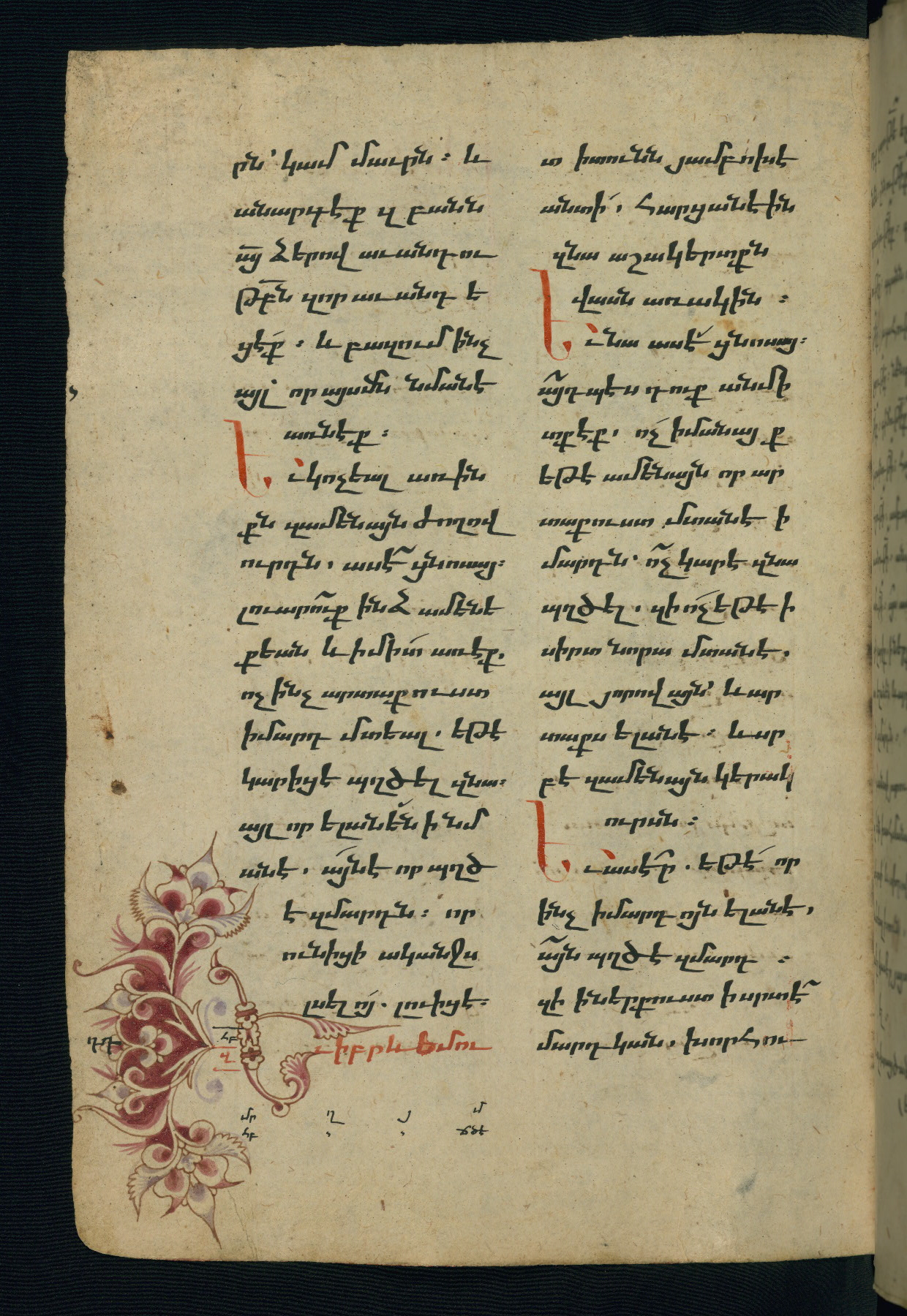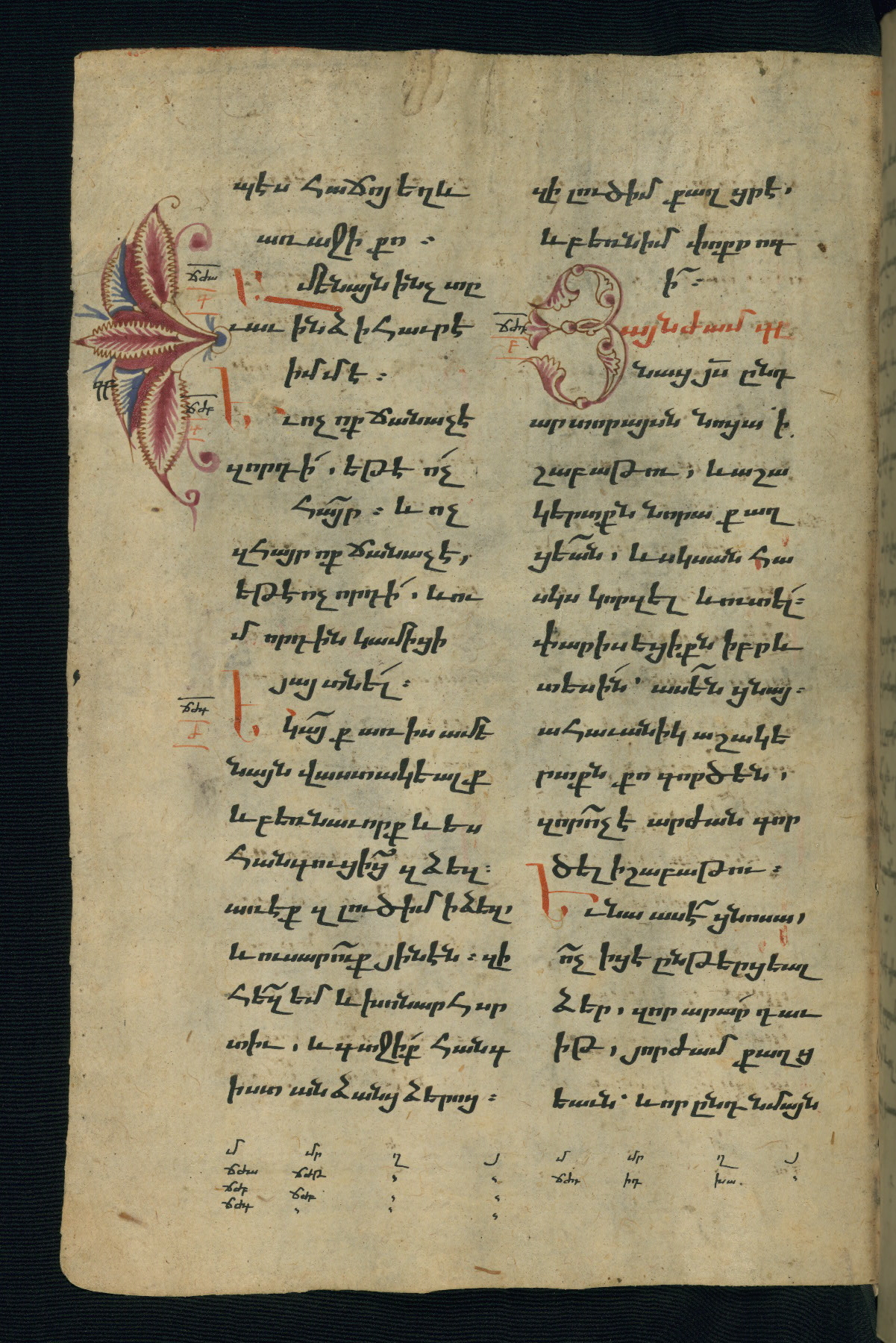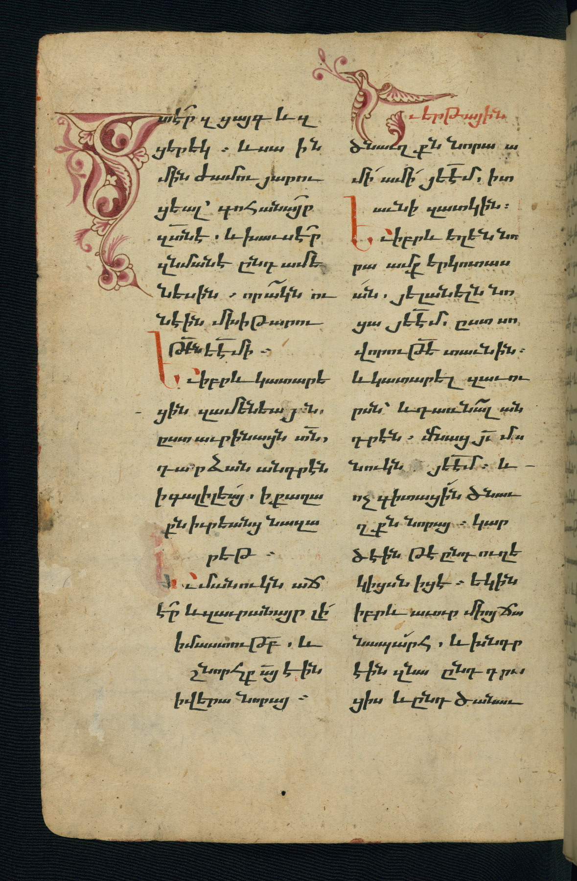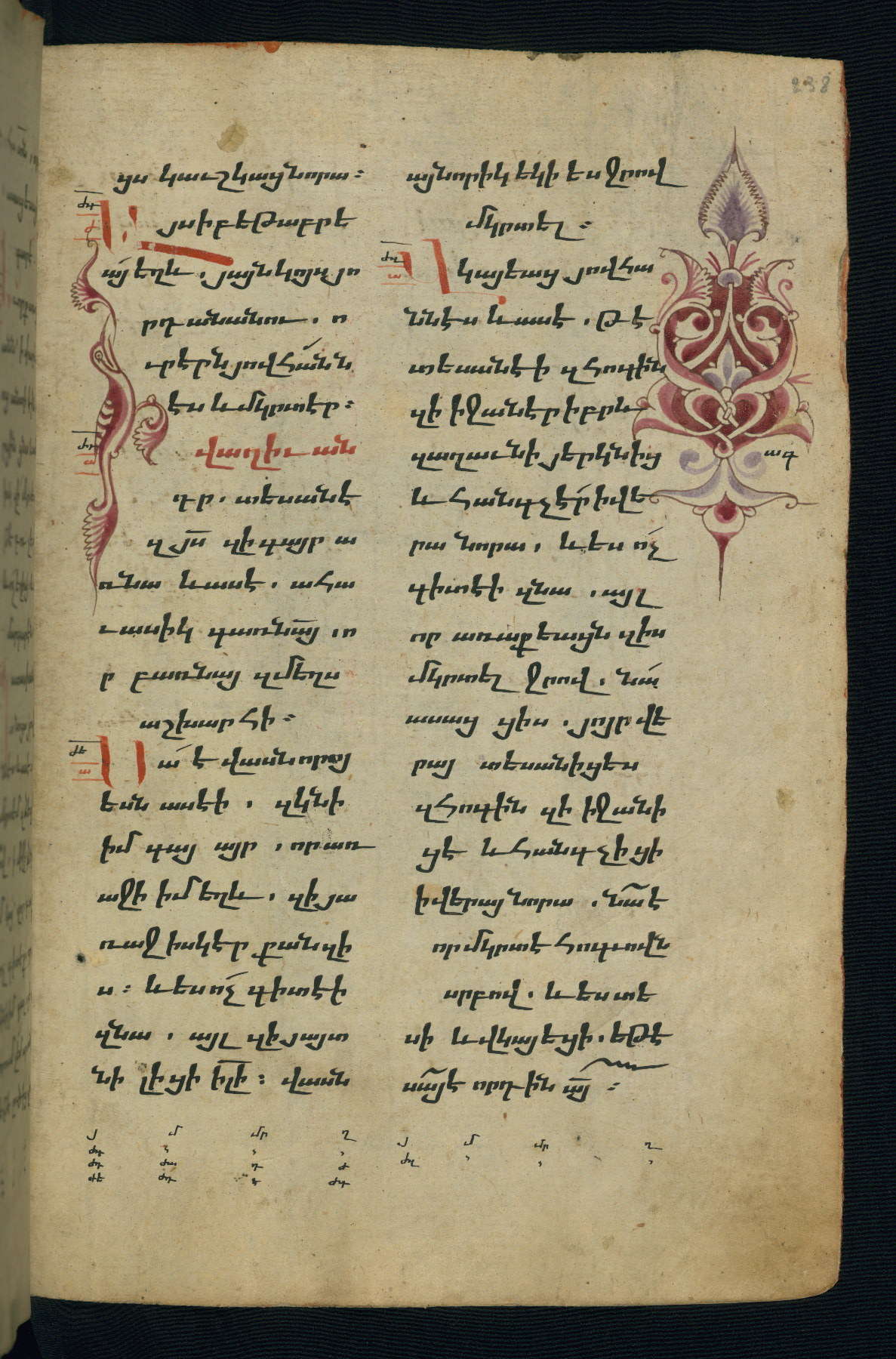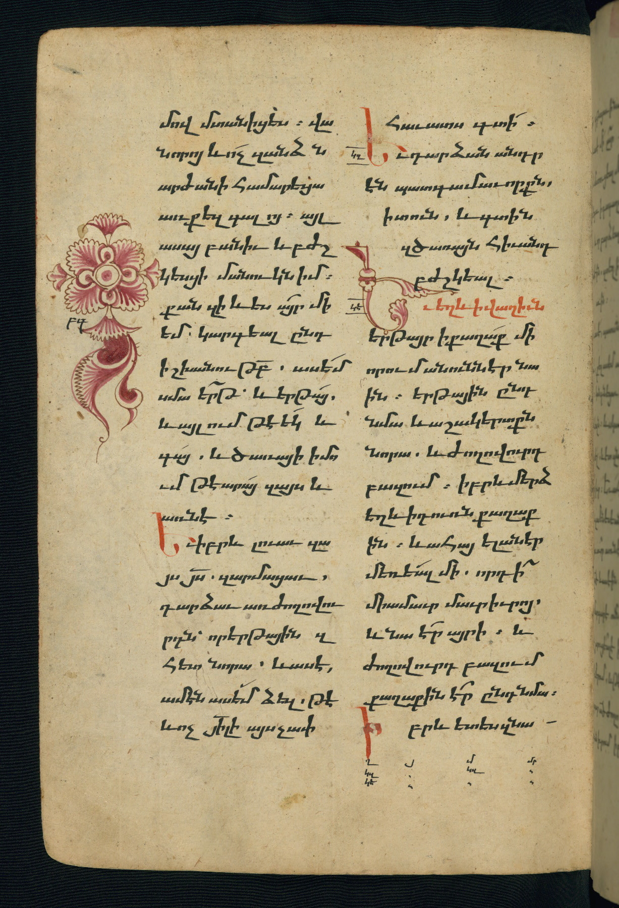 This Armenian Gospel book was produced in 904 of the Armenian era (1455 CE) at the monastery of Gamałiēl in Xizan by the scribe Yohannēs Vardapet, son of Vardan and Dilšat, and was illuminated by the priest Xačʿatur. The priest Pʿilipos commissioned the manuscript as a memorial to himself, his parents Łazar and Xutʿlumēlikʿ, and other relatives listed in the colophon on fols. 300r to 301v. Pʿilipos is depicted on fol. 14v alongside his brothers Yusēpʿ and Sultanša, as they kneel before the Virgin and Child enthroned (Theotokos). The book contains twenty-six full-page polychrome miniatures, including four Evangelist portraits; ornately designed canon tables; four decorated incipit pages; numerous marginal miniatures of floral and faunal motifs; and nineteen marginal miniatures of biblical characters or allusions to biblical narratives.