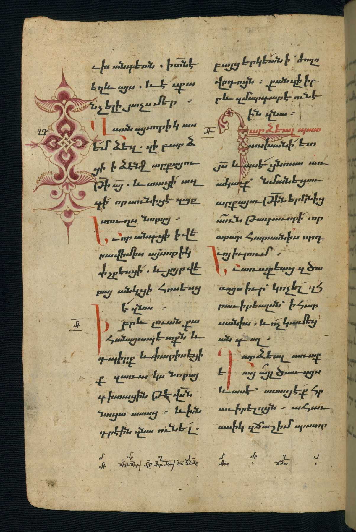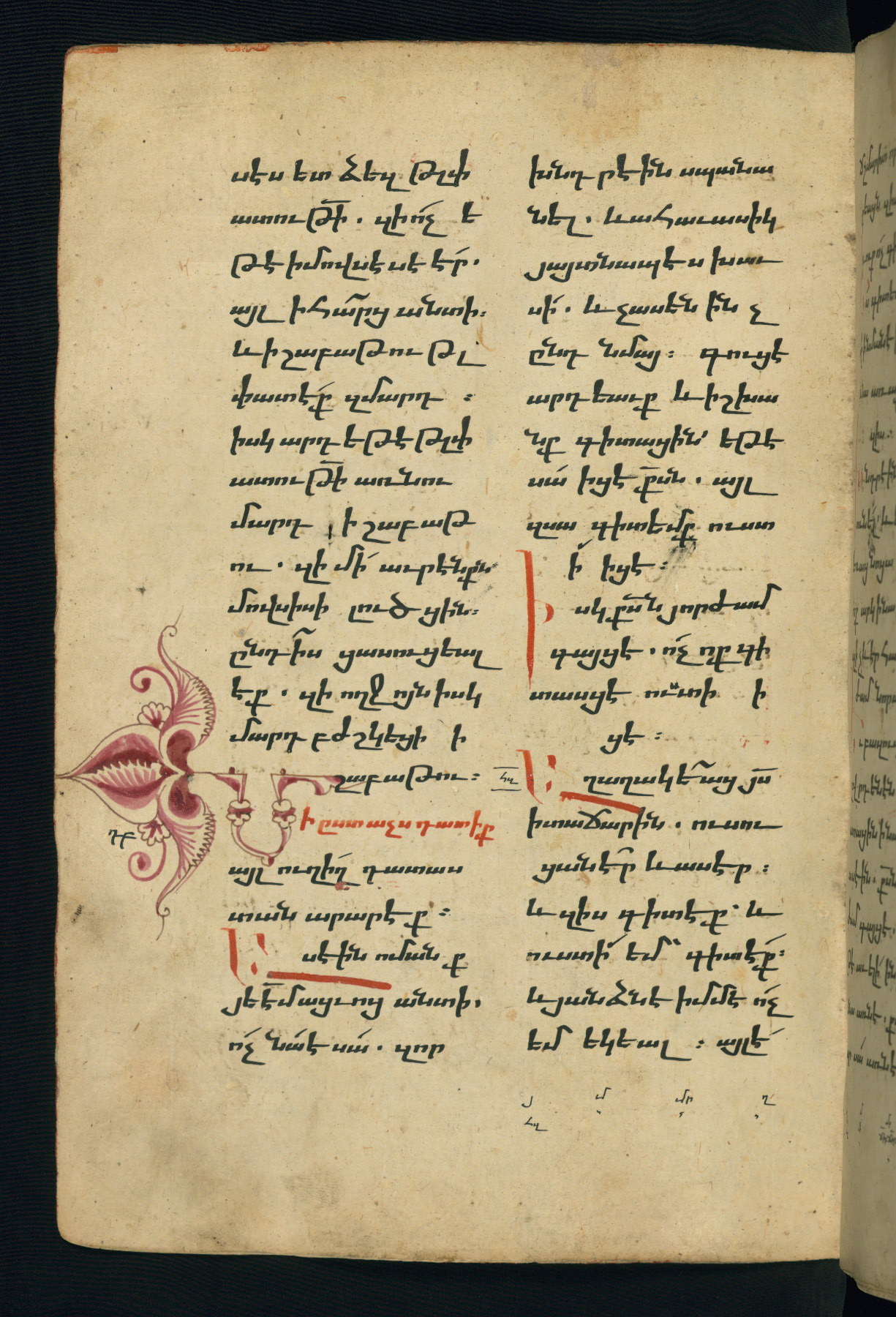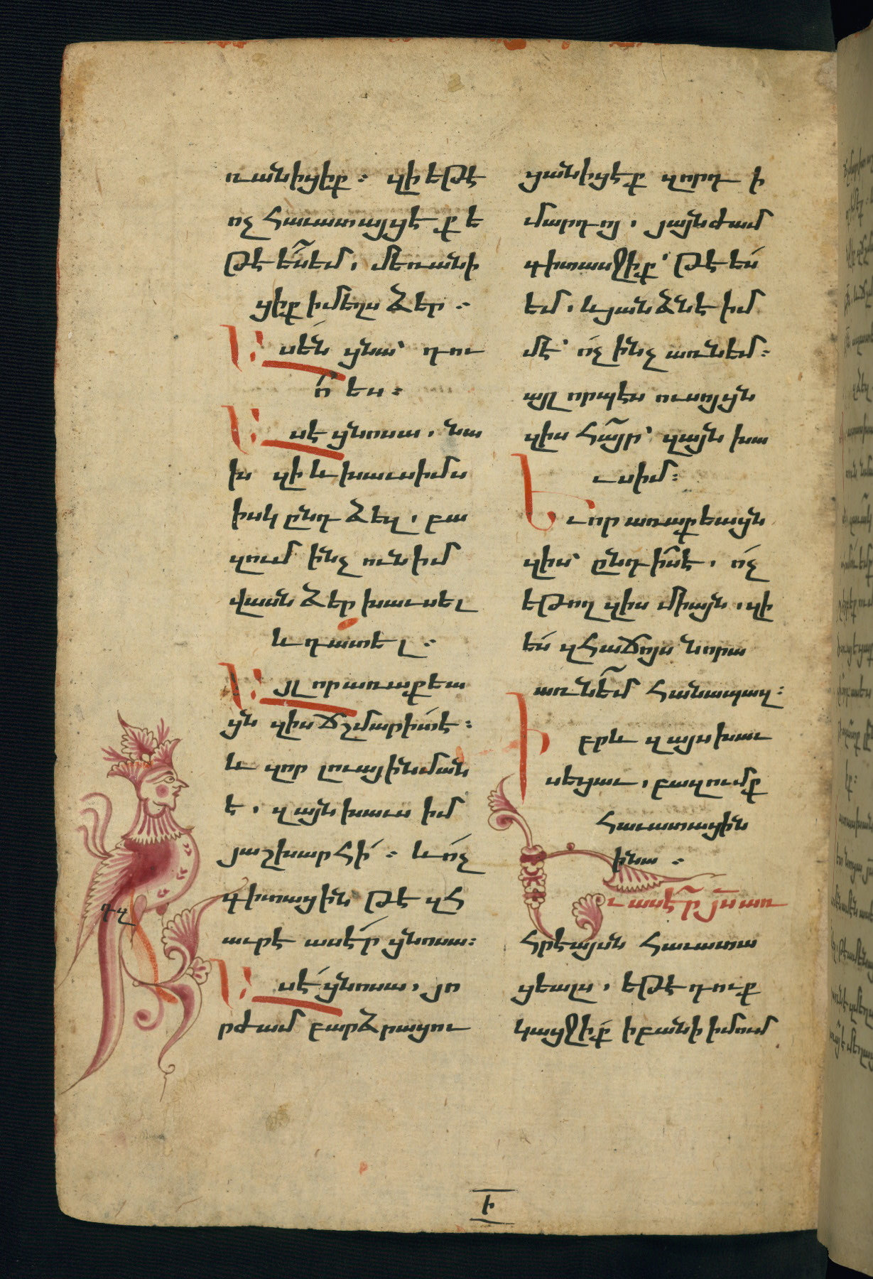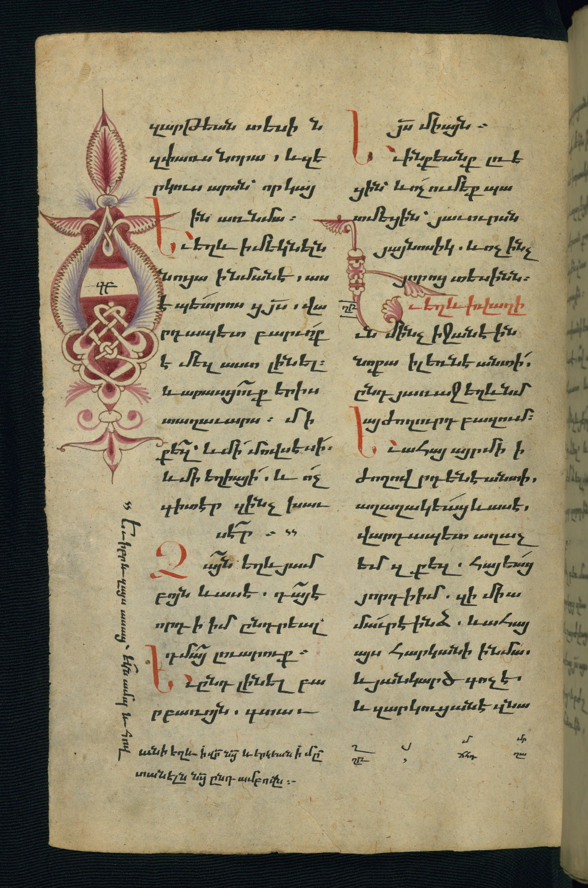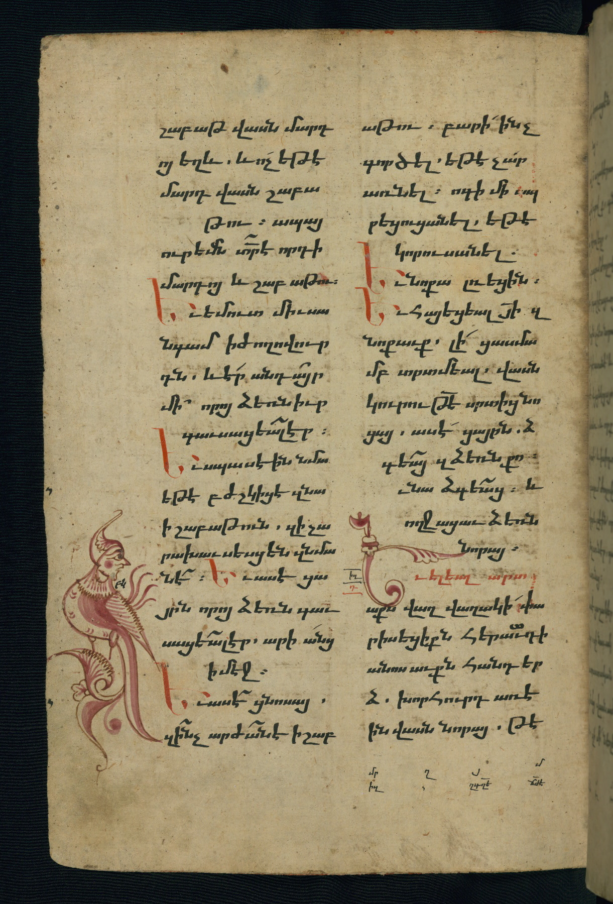 This Armenian Gospel book was produced in 904 of the Armenian era (1455 CE) at the monastery of Gamałiēl in Xizan by the scribe Yohannēs Vardapet, son of Vardan and Dilšat, and was illuminated by the priest Xačʿatur. The priest Pʿilipos commissioned the manuscript as a memorial to himself, his parents Łazar and Xutʿlumēlikʿ, and other relatives listed in the colophon on fols. 300r to 301v. Pʿilipos is depicted on fol. 14v alongside his brothers Yusēpʿ and Sultanša, as they kneel before the Virgin and Child enthroned (Theotokos). The book contains twenty-six full-page polychrome miniatures, including four Evangelist portraits; ornately designed canon tables; four decorated incipit pages; numerous marginal miniatures of floral and faunal motifs; and nineteen marginal miniatures of biblical characters or allusions to biblical narratives.