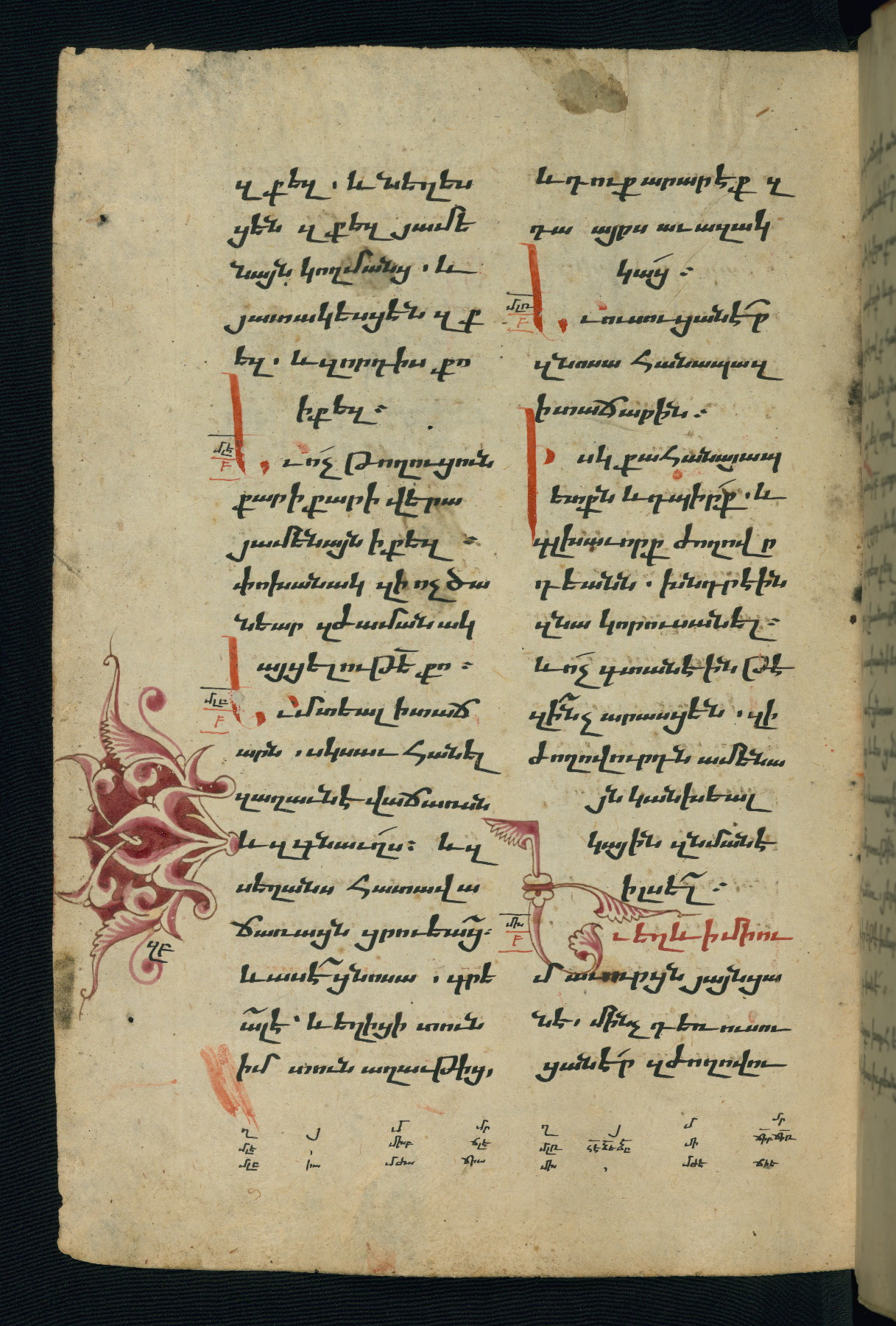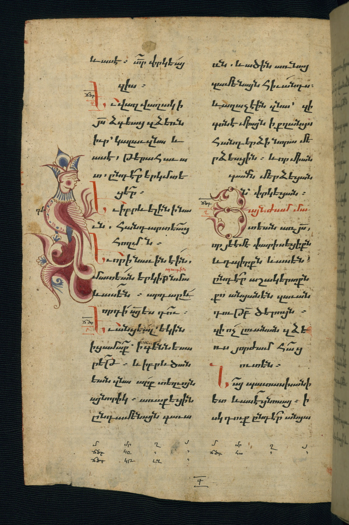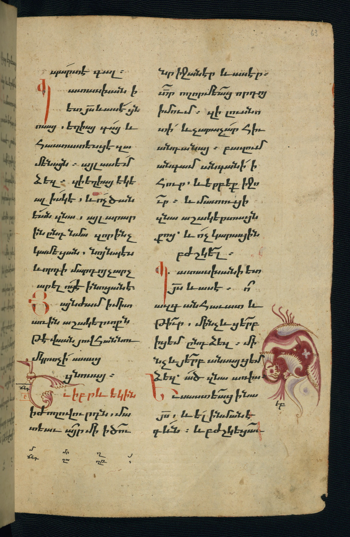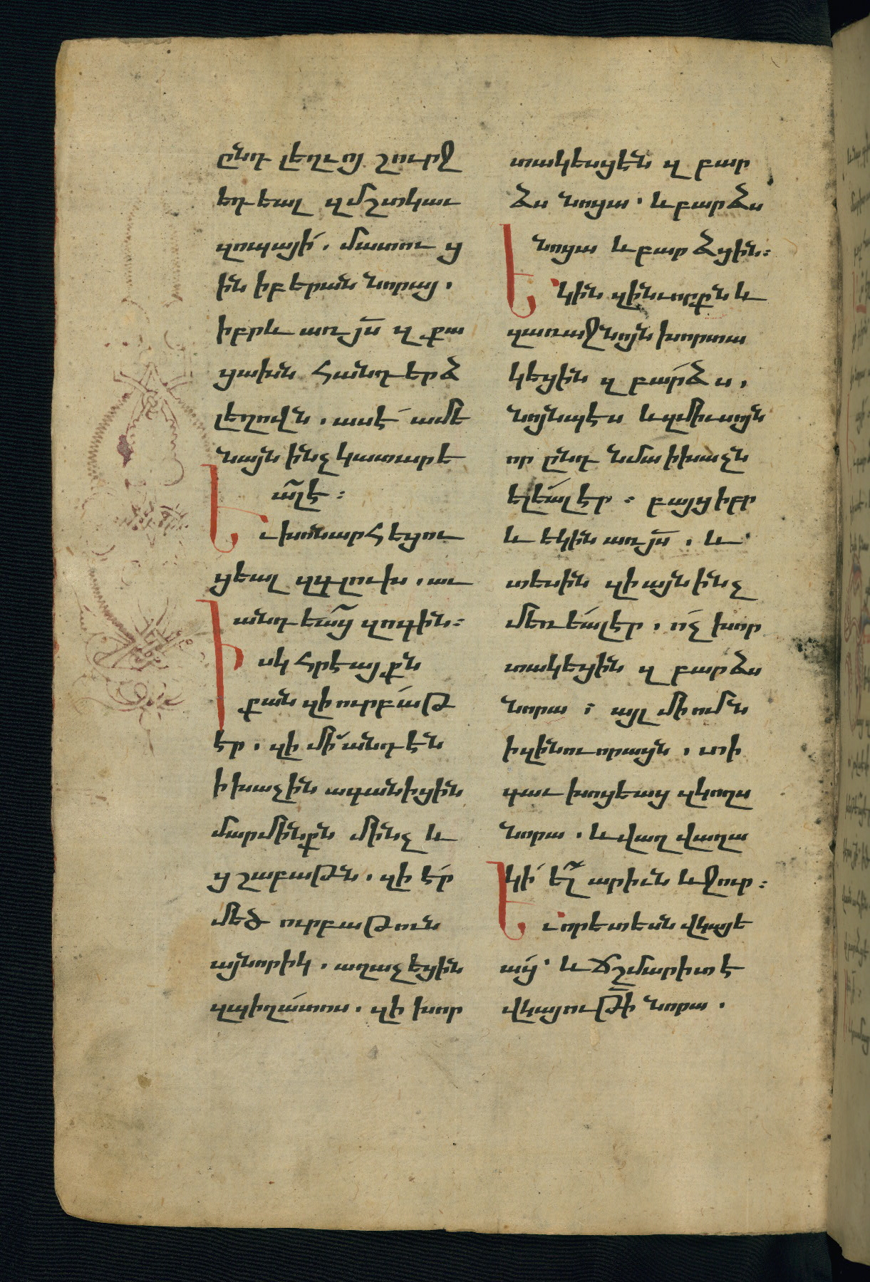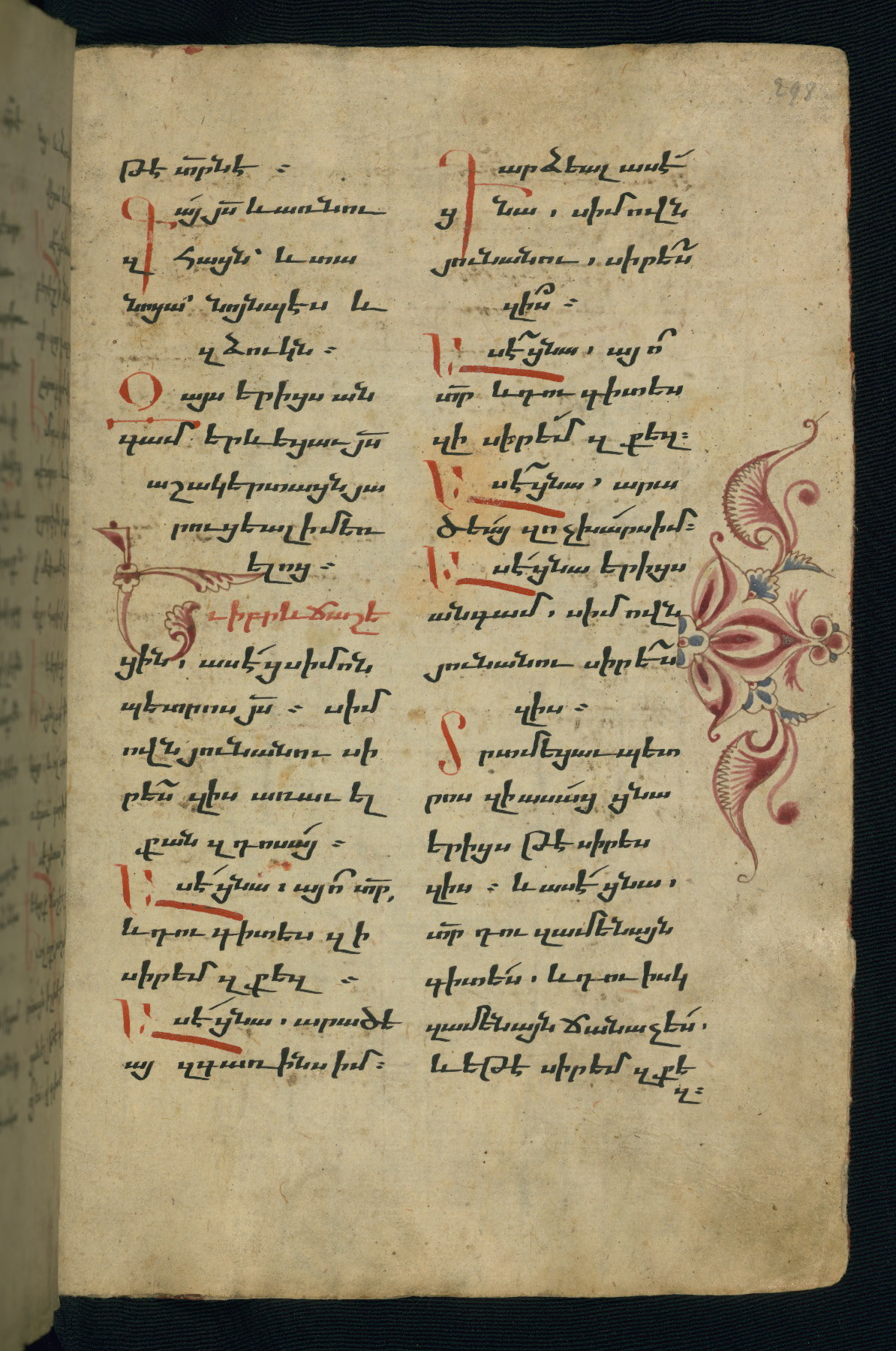 This Armenian Gospel book was produced in 904 of the Armenian era (1455 CE) at the monastery of Gamałiēl in Xizan by the scribe Yohannēs Vardapet, son of Vardan and Dilšat, and was illuminated by the priest Xačʿatur. The priest Pʿilipos commissioned the manuscript as a memorial to himself, his parents Łazar and Xutʿlumēlikʿ, and other relatives listed in the colophon on fols. 300r to 301v. Pʿilipos is depicted on fol. 14v alongside his brothers Yusēpʿ and Sultanša, as they kneel before the Virgin and Child enthroned (Theotokos). The book contains twenty-six full-page polychrome miniatures, including four Evangelist portraits; ornately designed canon tables; four decorated incipit pages; numerous marginal miniatures of floral and faunal motifs; and nineteen marginal miniatures of biblical characters or allusions to biblical narratives.