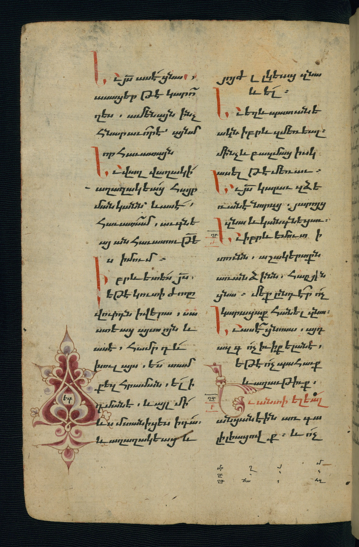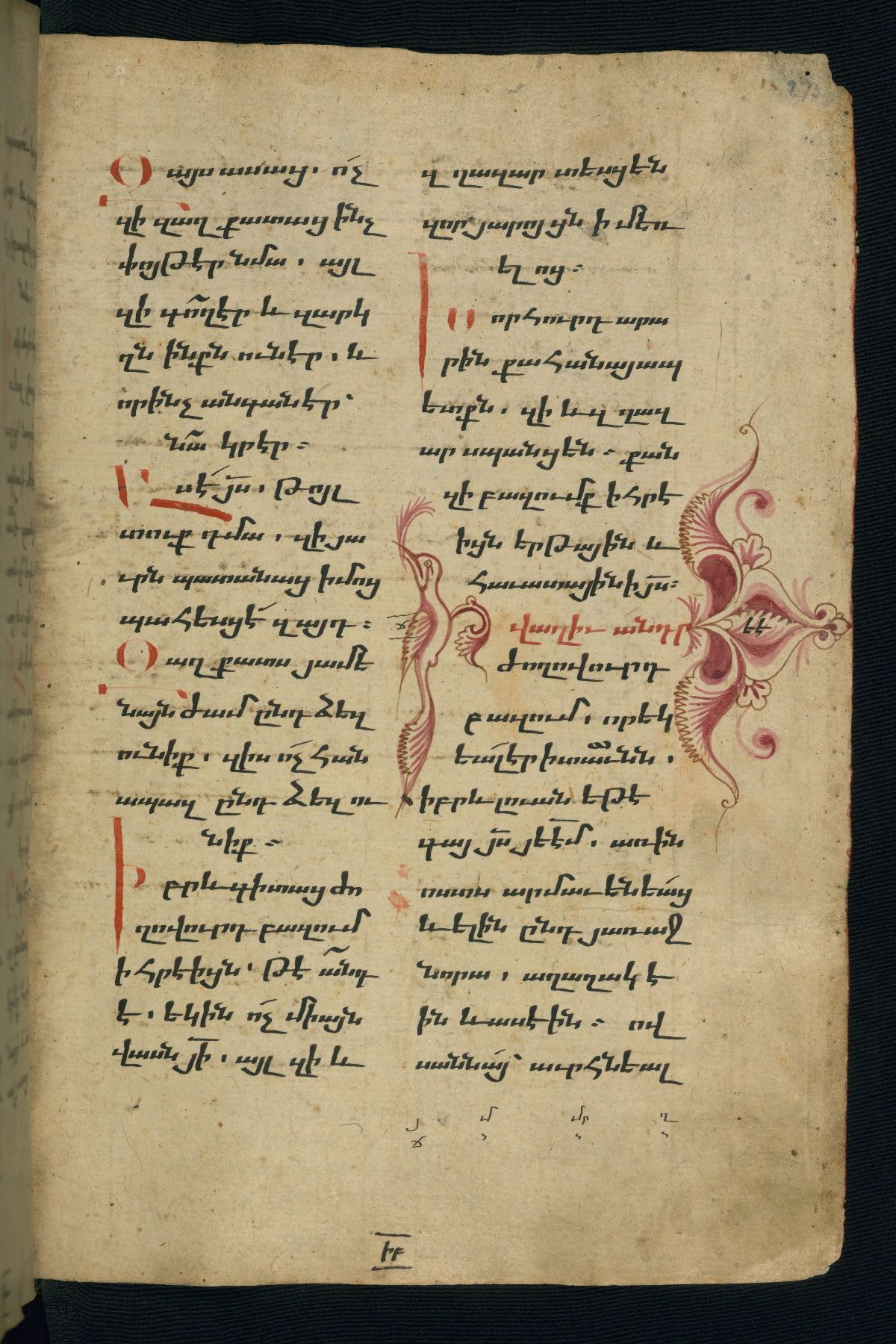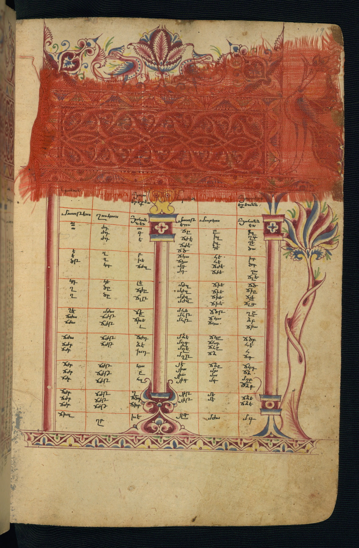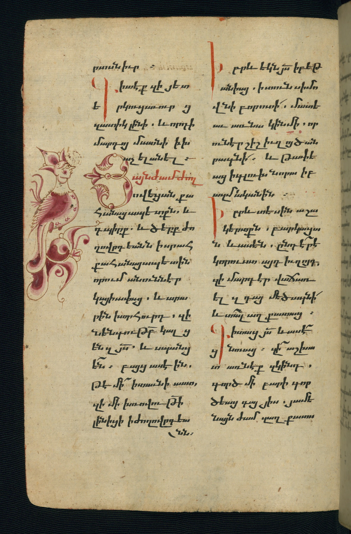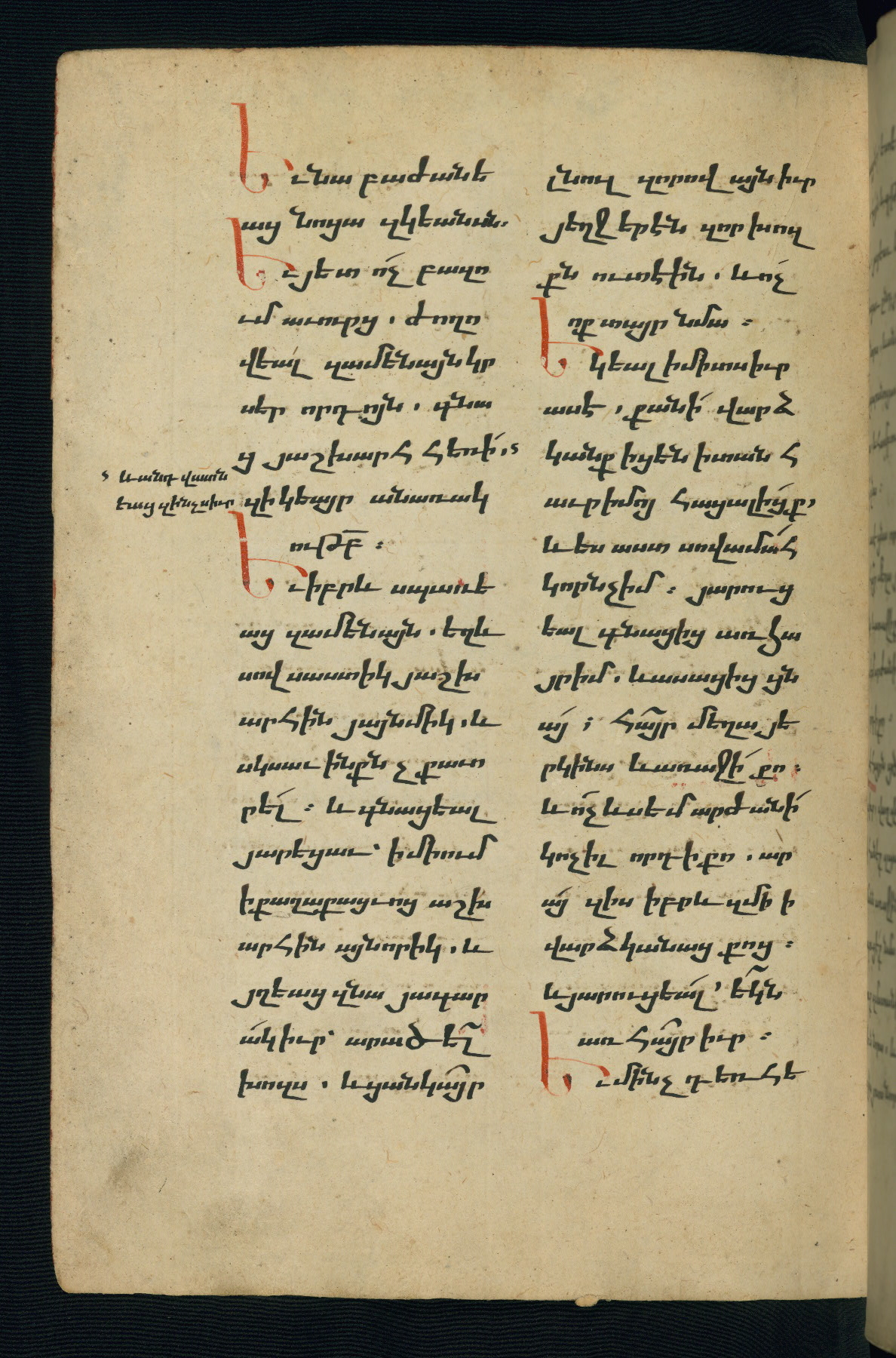 This Armenian Gospel book was produced in 904 of the Armenian era (1455 CE) at the monastery of Gamałiēl in Xizan by the scribe Yohannēs Vardapet, son of Vardan and Dilšat, and was illuminated by the priest Xačʿatur. The priest Pʿilipos commissioned the manuscript as a memorial to himself, his parents Łazar and Xutʿlumēlikʿ, and other relatives listed in the colophon on fols. 300r to 301v. Pʿilipos is depicted on fol. 14v alongside his brothers Yusēpʿ and Sultanša, as they kneel before the Virgin and Child enthroned (Theotokos). The book contains twenty-six full-page polychrome miniatures, including four Evangelist portraits; ornately designed canon tables; four decorated incipit pages; numerous marginal miniatures of floral and faunal motifs; and nineteen marginal miniatures of biblical characters or allusions to biblical narratives.