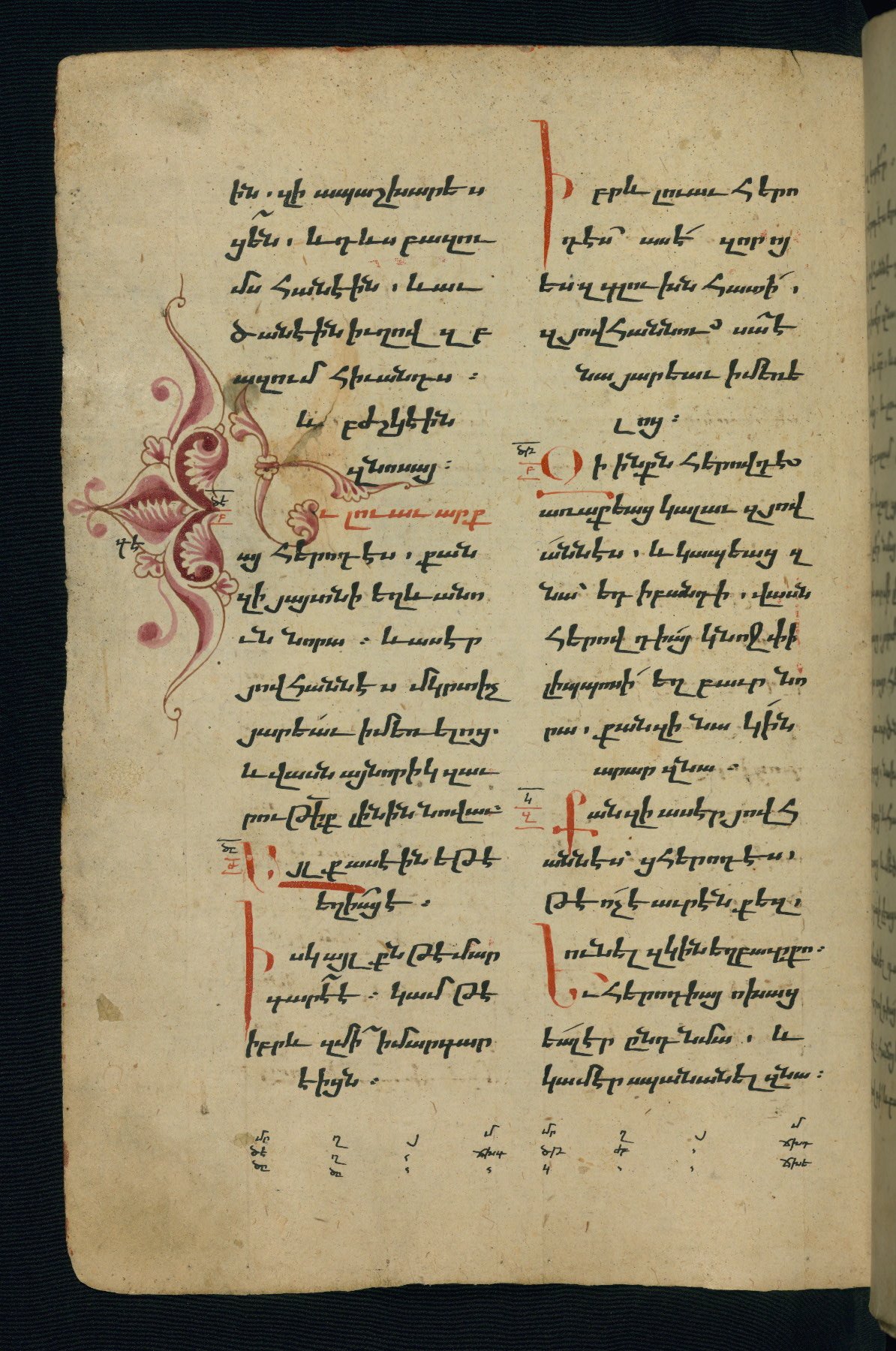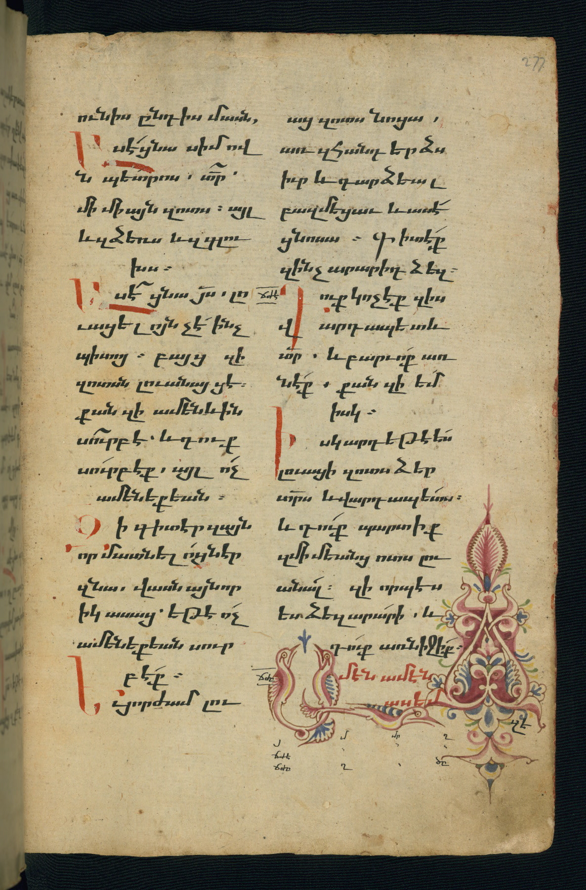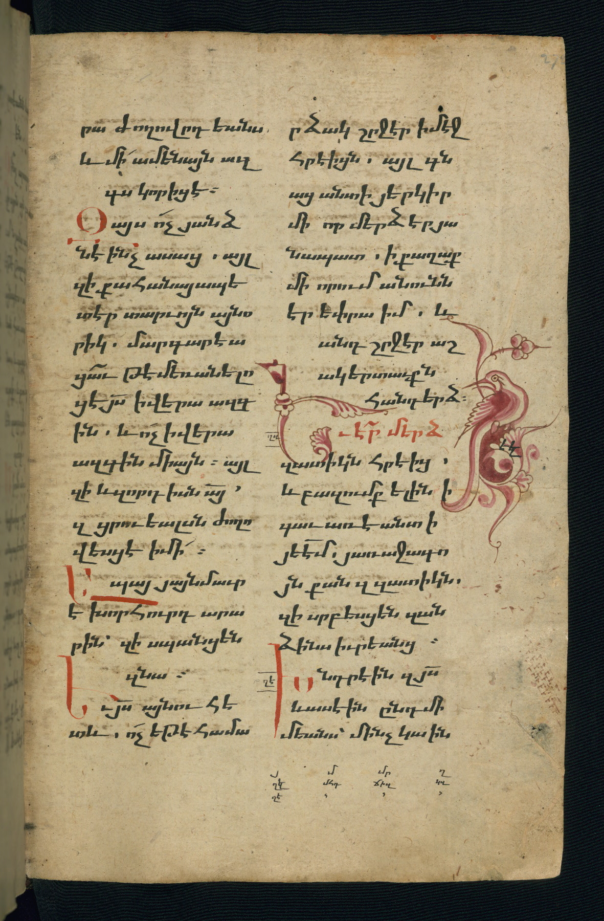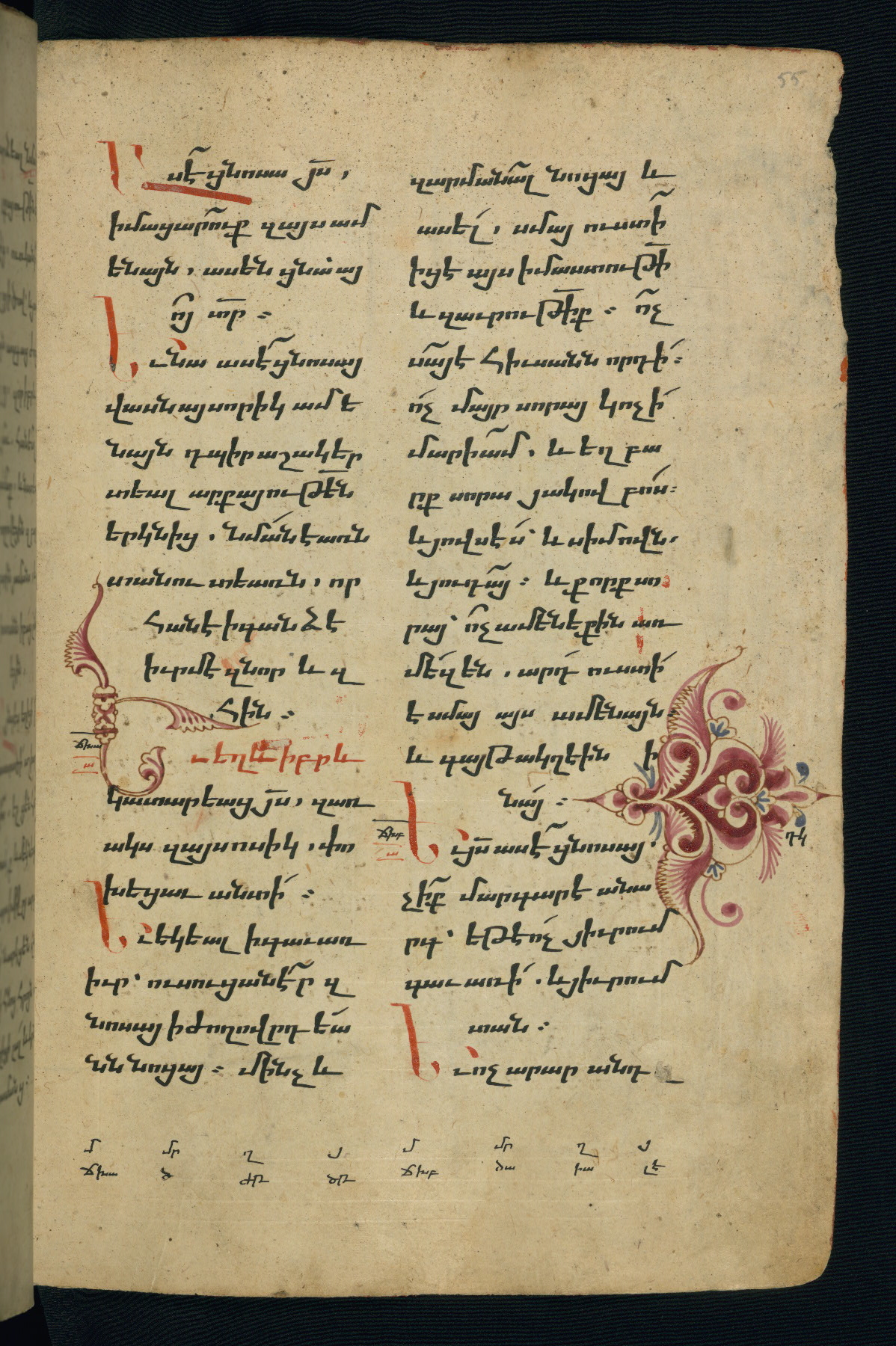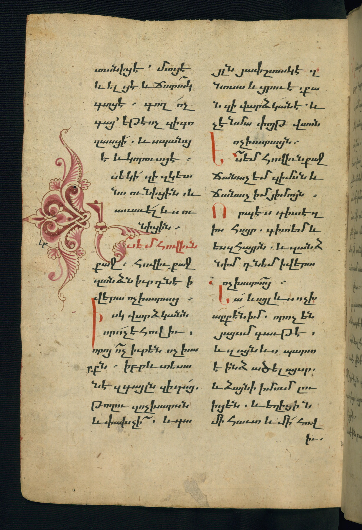 This Armenian Gospel book was produced in 904 of the Armenian era (1455 CE) at the monastery of Gamałiēl in Xizan by the scribe Yohannēs Vardapet, son of Vardan and Dilšat, and was illuminated by the priest Xačʿatur. The priest Pʿilipos commissioned the manuscript as a memorial to himself, his parents Łazar and Xutʿlumēlikʿ, and other relatives listed in the colophon on fols. 300r to 301v. Pʿilipos is depicted on fol. 14v alongside his brothers Yusēpʿ and Sultanša, as they kneel before the Virgin and Child enthroned (Theotokos). The book contains twenty-six full-page polychrome miniatures, including four Evangelist portraits; ornately designed canon tables; four decorated incipit pages; numerous marginal miniatures of floral and faunal motifs; and nineteen marginal miniatures of biblical characters or allusions to biblical narratives.