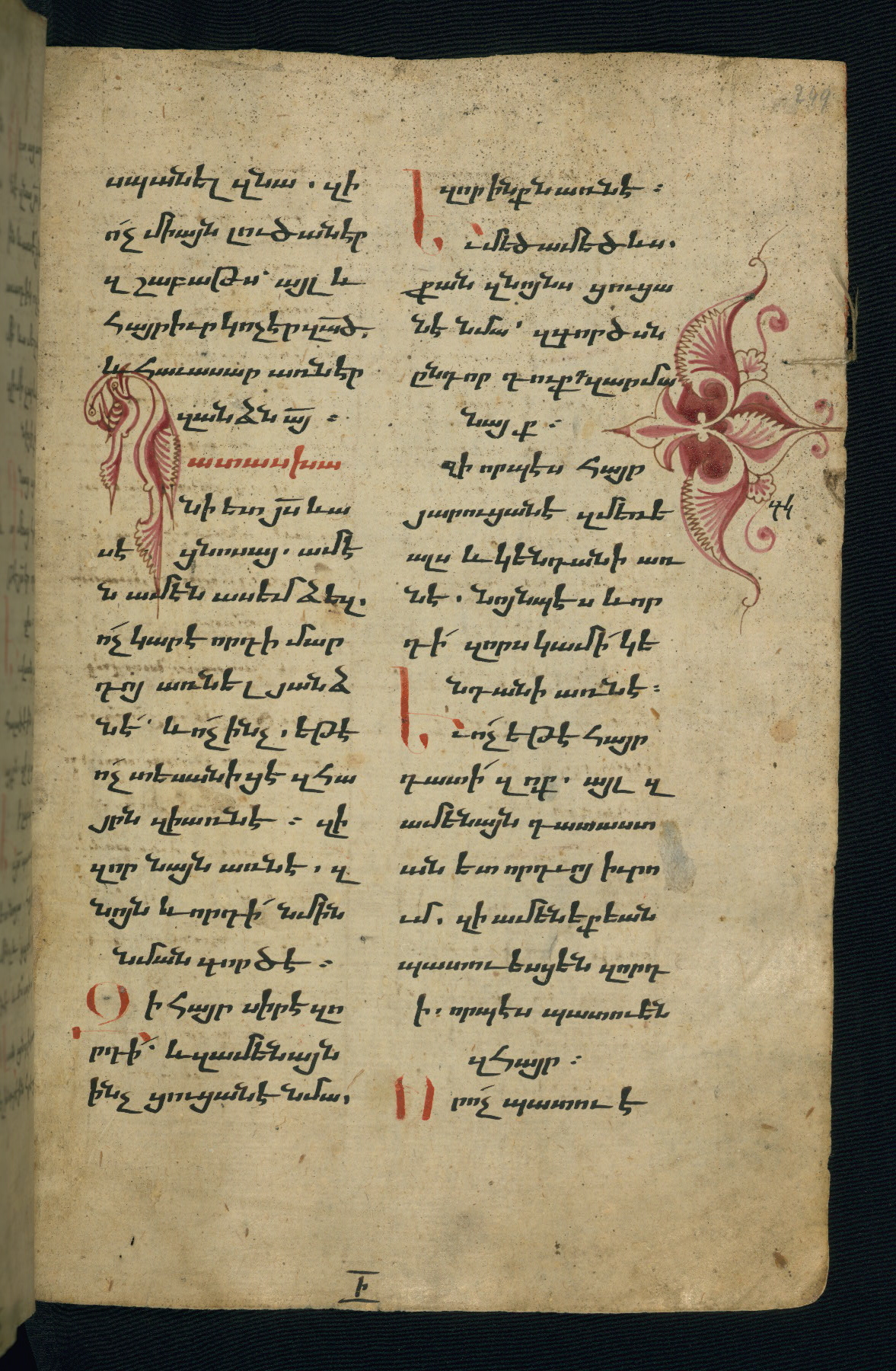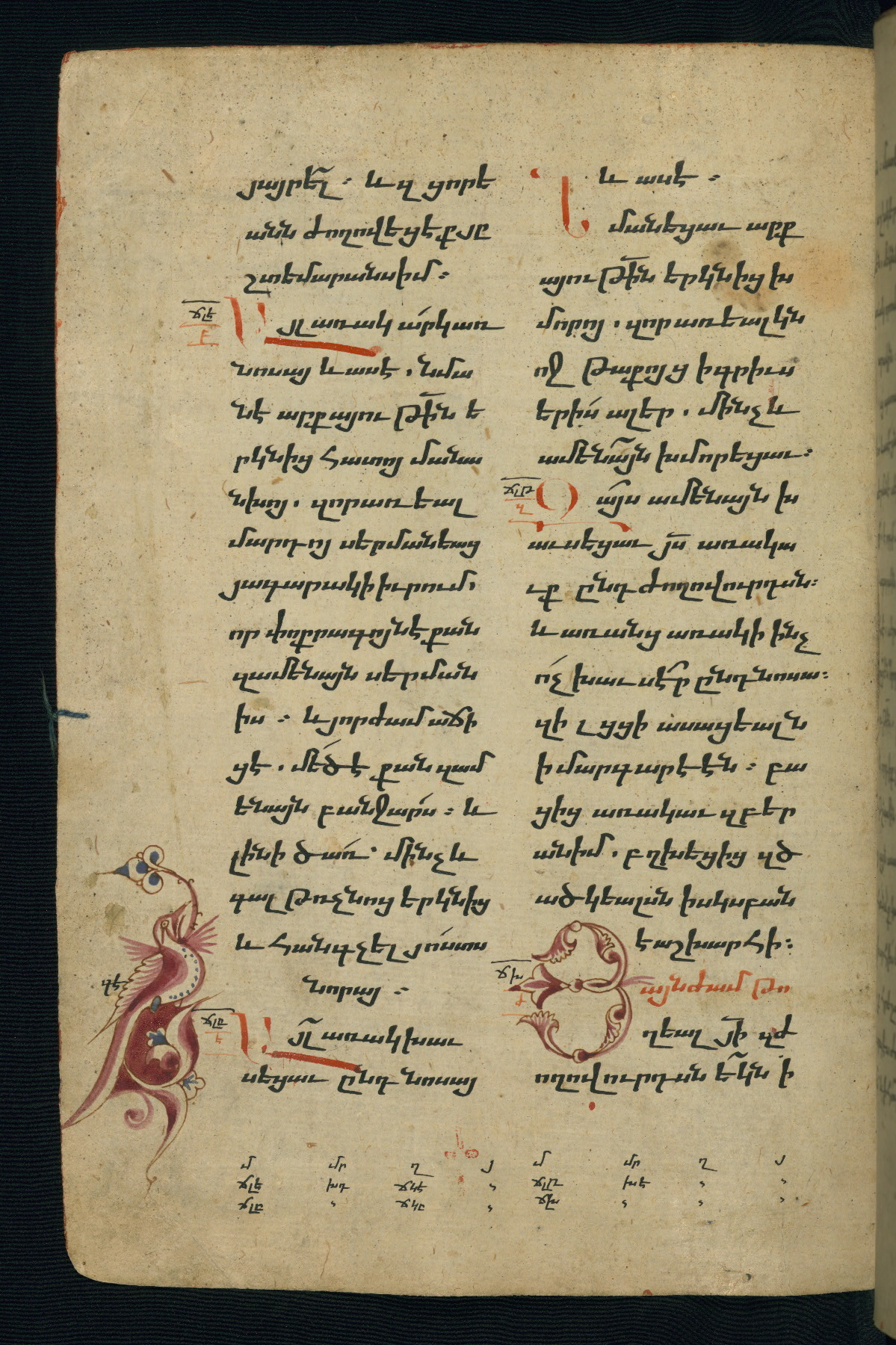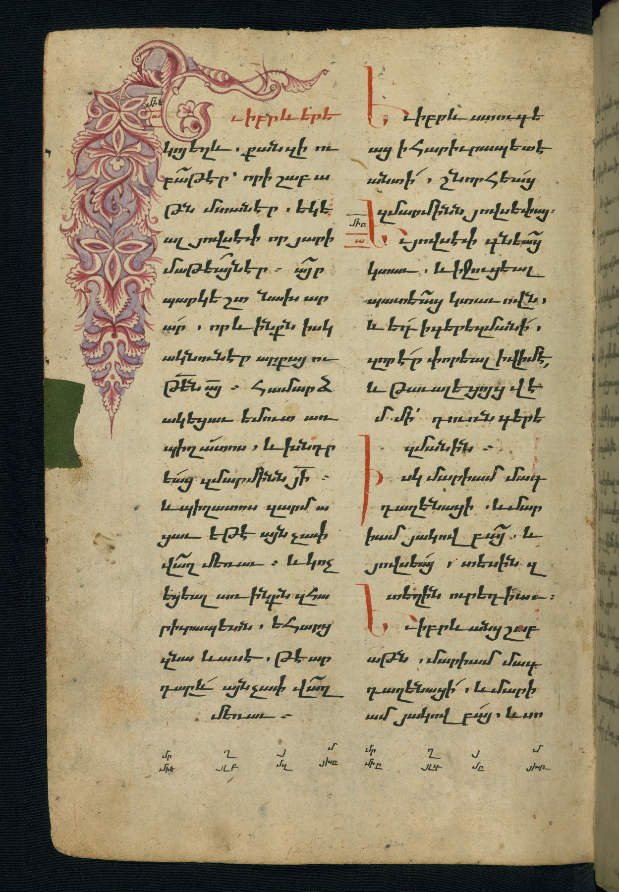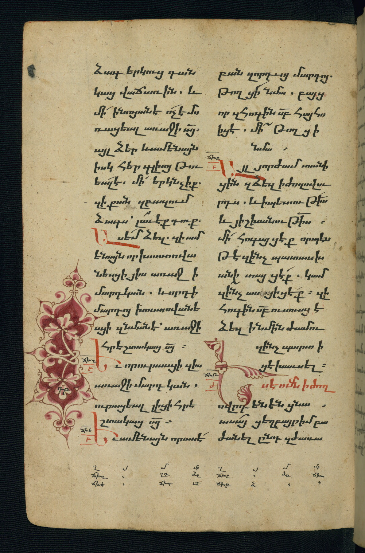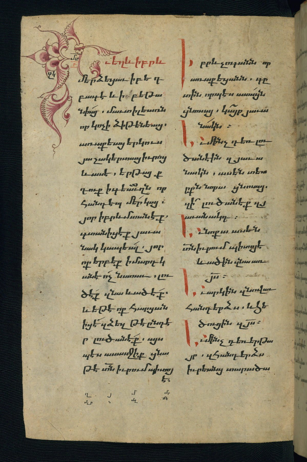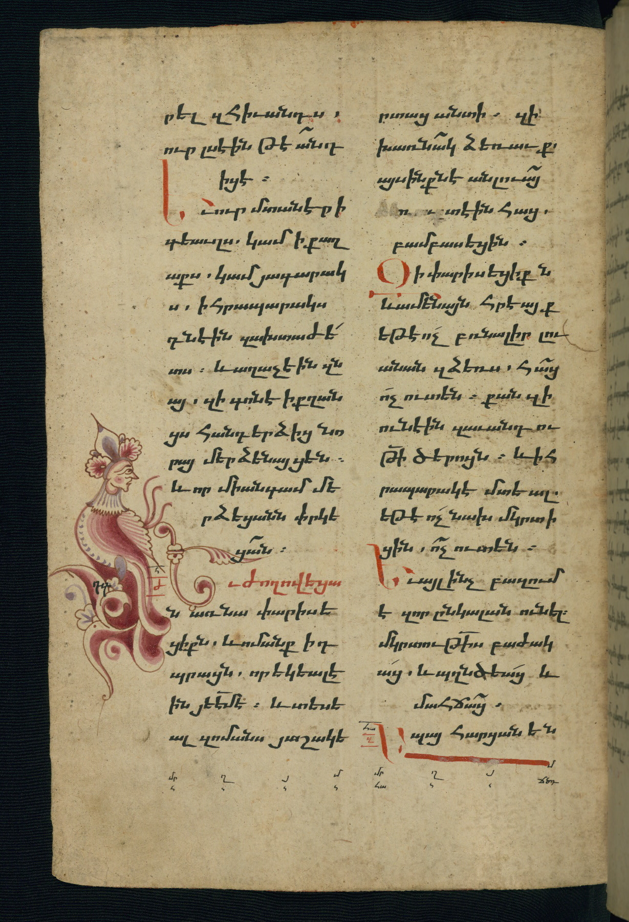 This Armenian Gospel book was produced in 904 of the Armenian era (1455 CE) at the monastery of Gamałiēl in Xizan by the scribe Yohannēs Vardapet, son of Vardan and Dilšat, and was illuminated by the priest Xačʿatur. The priest Pʿilipos commissioned the manuscript as a memorial to himself, his parents Łazar and Xutʿlumēlikʿ, and other relatives listed in the colophon on fols. 300r to 301v. Pʿilipos is depicted on fol. 14v alongside his brothers Yusēpʿ and Sultanša, as they kneel before the Virgin and Child enthroned (Theotokos). The book contains twenty-six full-page polychrome miniatures, including four Evangelist portraits; ornately designed canon tables; four decorated incipit pages; numerous marginal miniatures of floral and faunal motifs; and nineteen marginal miniatures of biblical characters or allusions to biblical narratives.