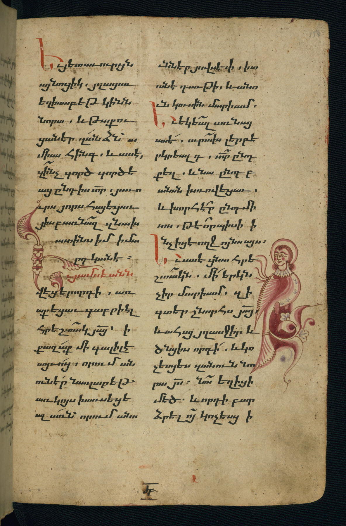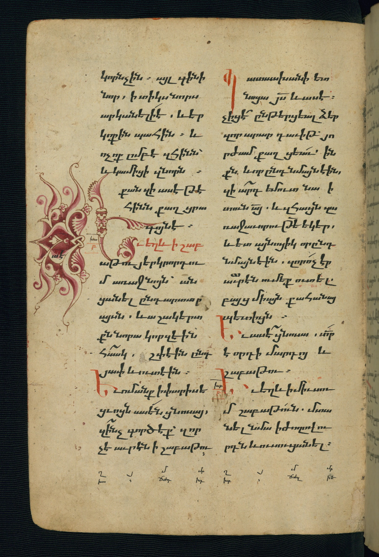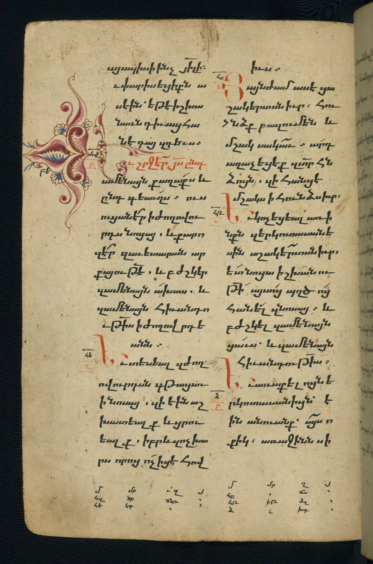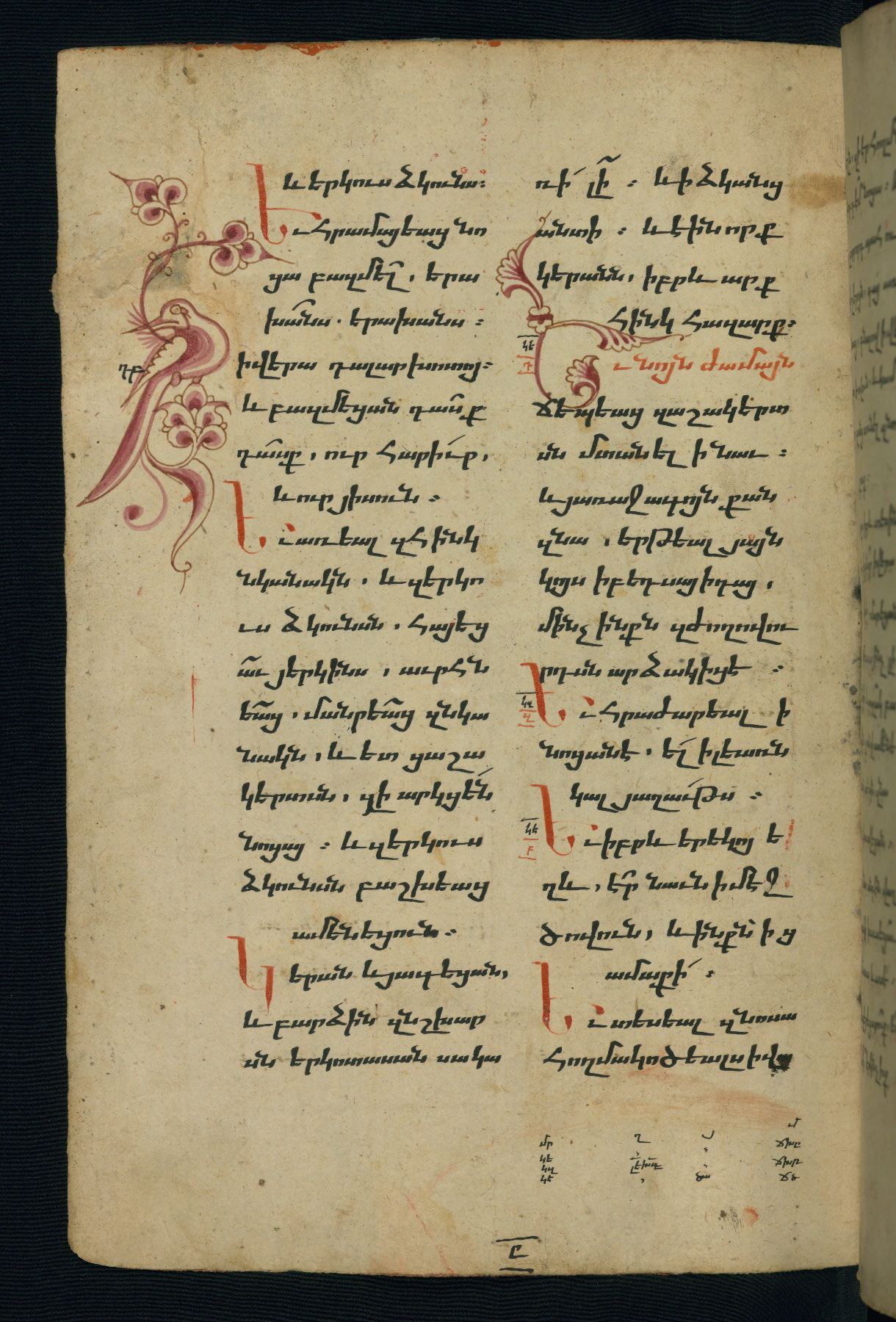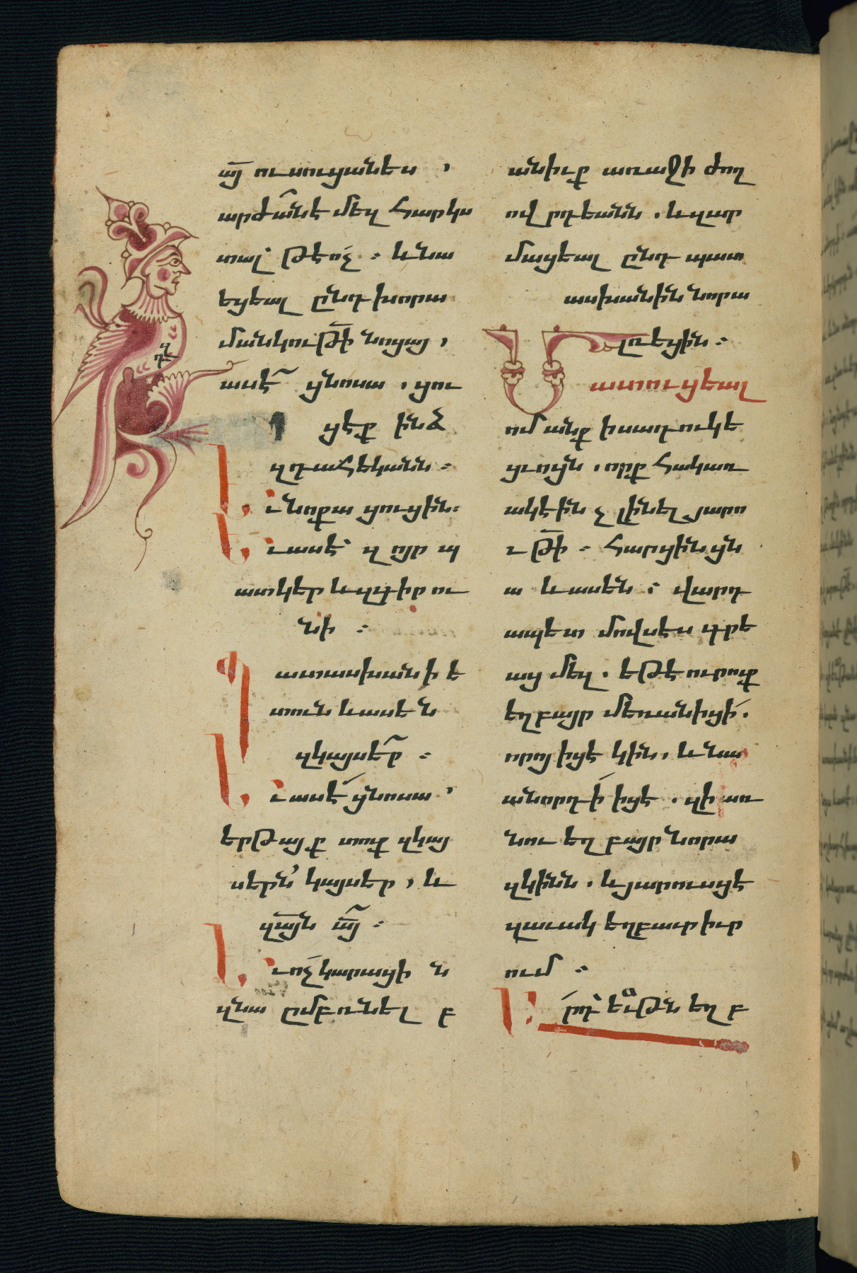 This Armenian Gospel book was produced in 904 of the Armenian era (1455 CE) at the monastery of Gamałiēl in Xizan by the scribe Yohannēs Vardapet, son of Vardan and Dilšat, and was illuminated by the priest Xačʿatur. The priest Pʿilipos commissioned the manuscript as a memorial to himself, his parents Łazar and Xutʿlumēlikʿ, and other relatives listed in the colophon on fols. 300r to 301v. Pʿilipos is depicted on fol. 14v alongside his brothers Yusēpʿ and Sultanša, as they kneel before the Virgin and Child enthroned (Theotokos). The book contains twenty-six full-page polychrome miniatures, including four Evangelist portraits; ornately designed canon tables; four decorated incipit pages; numerous marginal miniatures of floral and faunal motifs; and nineteen marginal miniatures of biblical characters or allusions to biblical narratives.