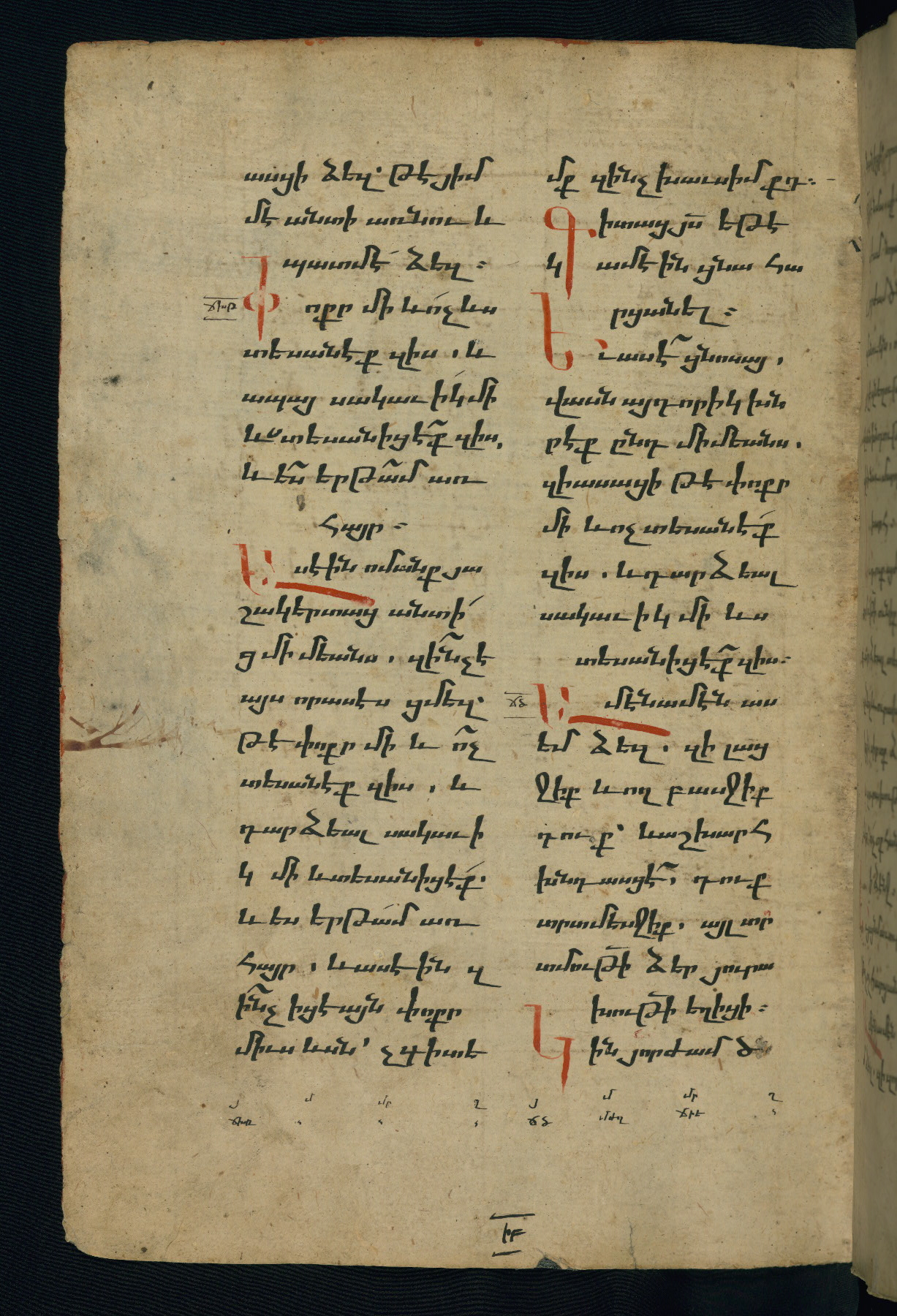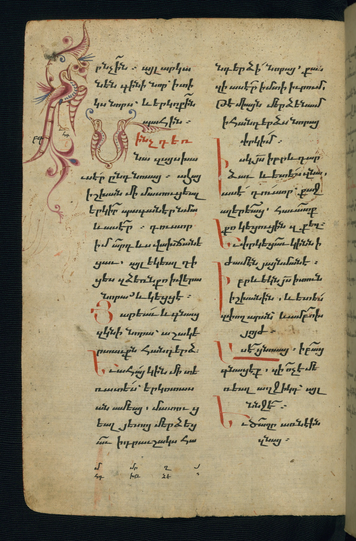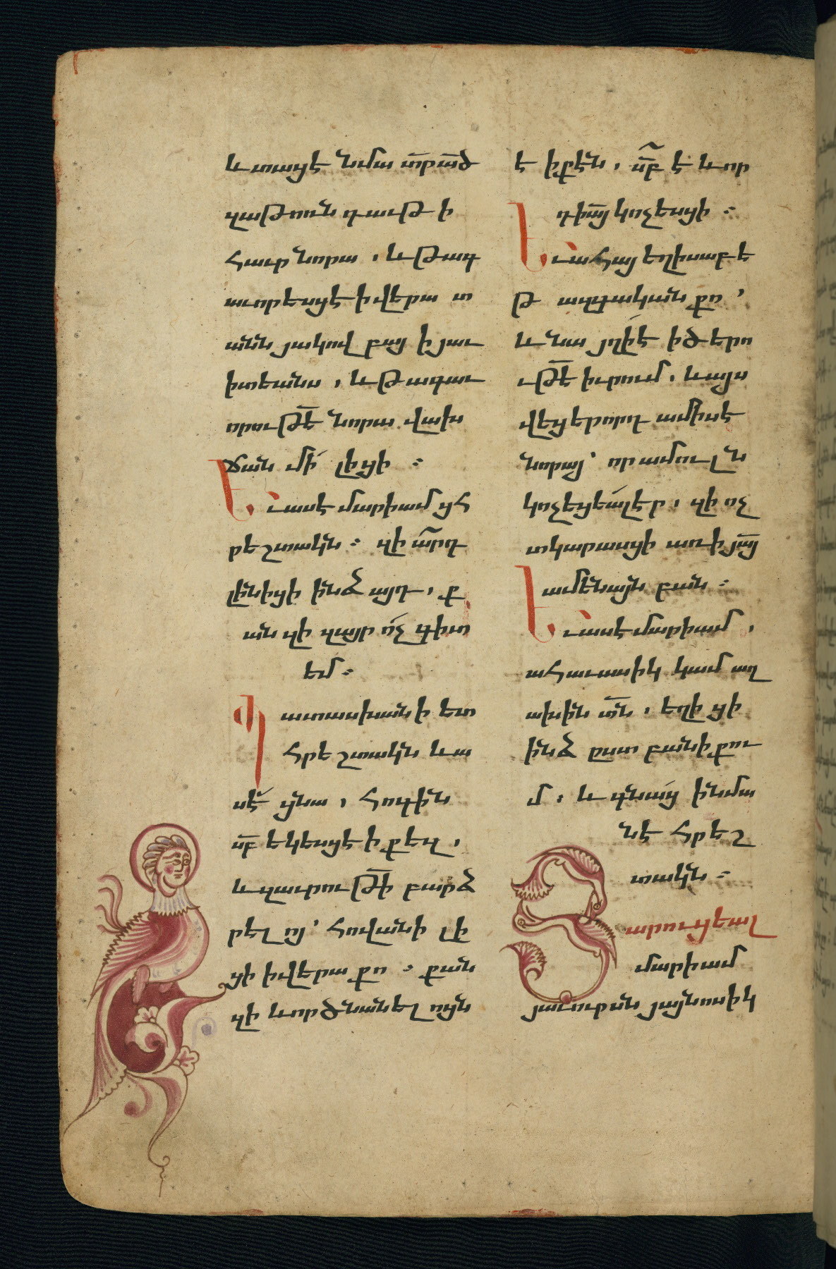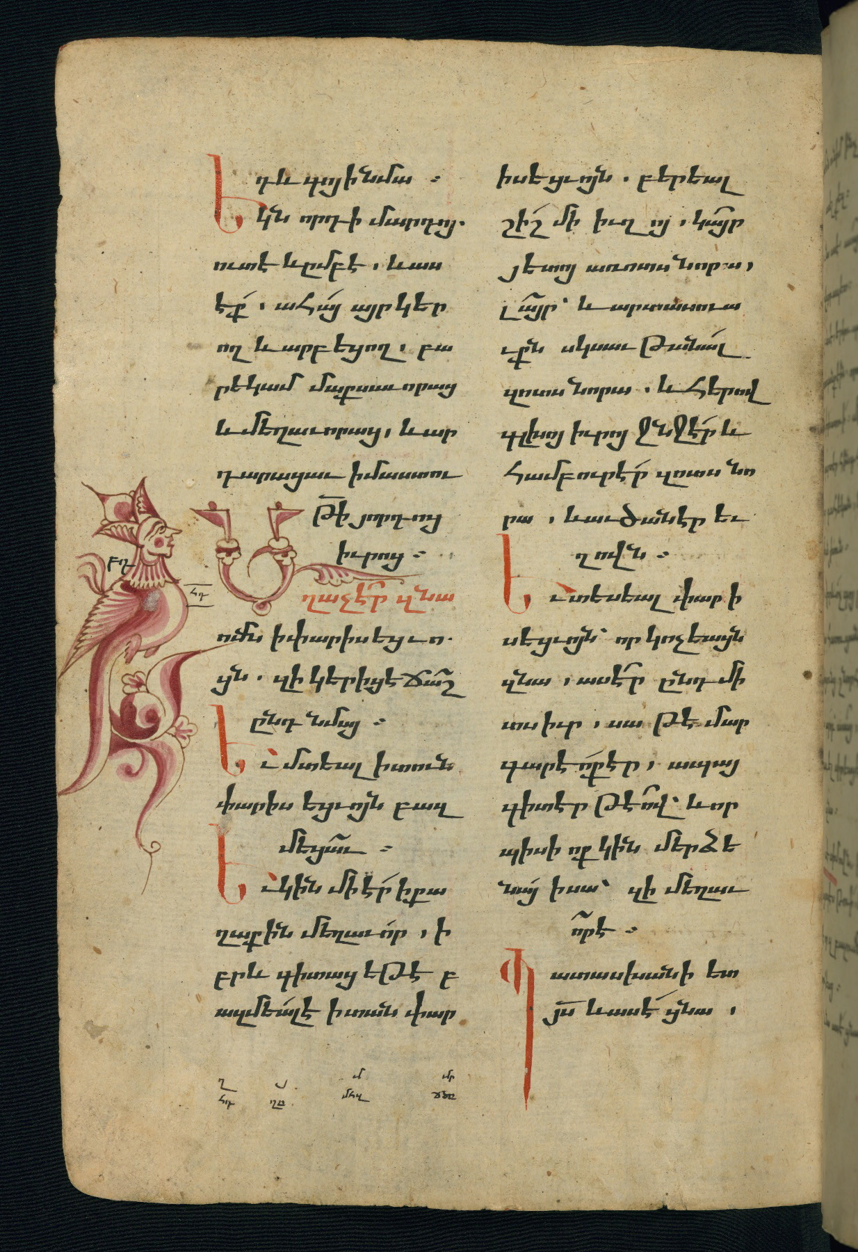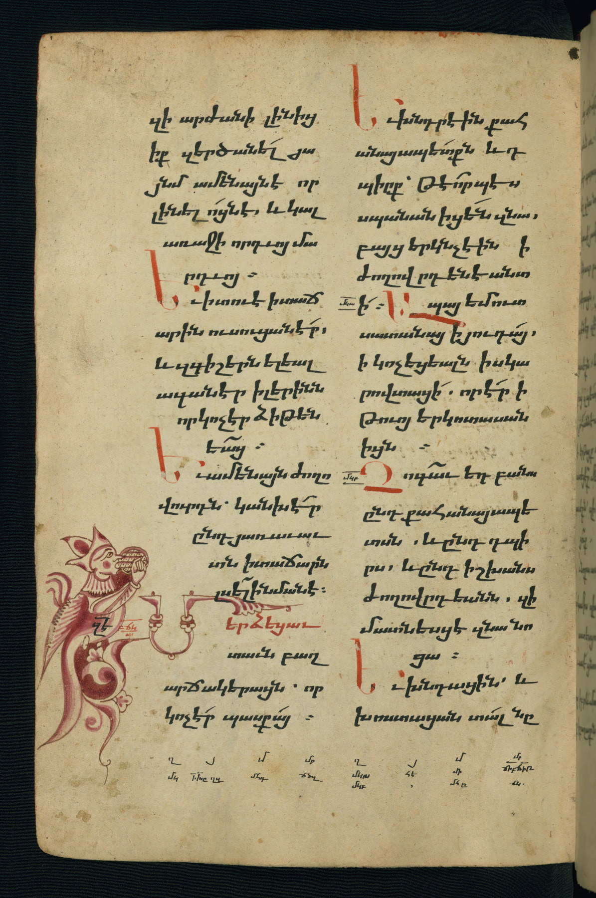 This Armenian Gospel book was produced in 904 of the Armenian era (1455 CE) at the monastery of Gamałiēl in Xizan by the scribe Yohannēs Vardapet, son of Vardan and Dilšat, and was illuminated by the priest Xačʿatur. The priest Pʿilipos commissioned the manuscript as a memorial to himself, his parents Łazar and Xutʿlumēlikʿ, and other relatives listed in the colophon on fols. 300r to 301v. Pʿilipos is depicted on fol. 14v alongside his brothers Yusēpʿ and Sultanša, as they kneel before the Virgin and Child enthroned (Theotokos). The book contains twenty-six full-page polychrome miniatures, including four Evangelist portraits; ornately designed canon tables; four decorated incipit pages; numerous marginal miniatures of floral and faunal motifs; and nineteen marginal miniatures of biblical characters or allusions to biblical narratives.