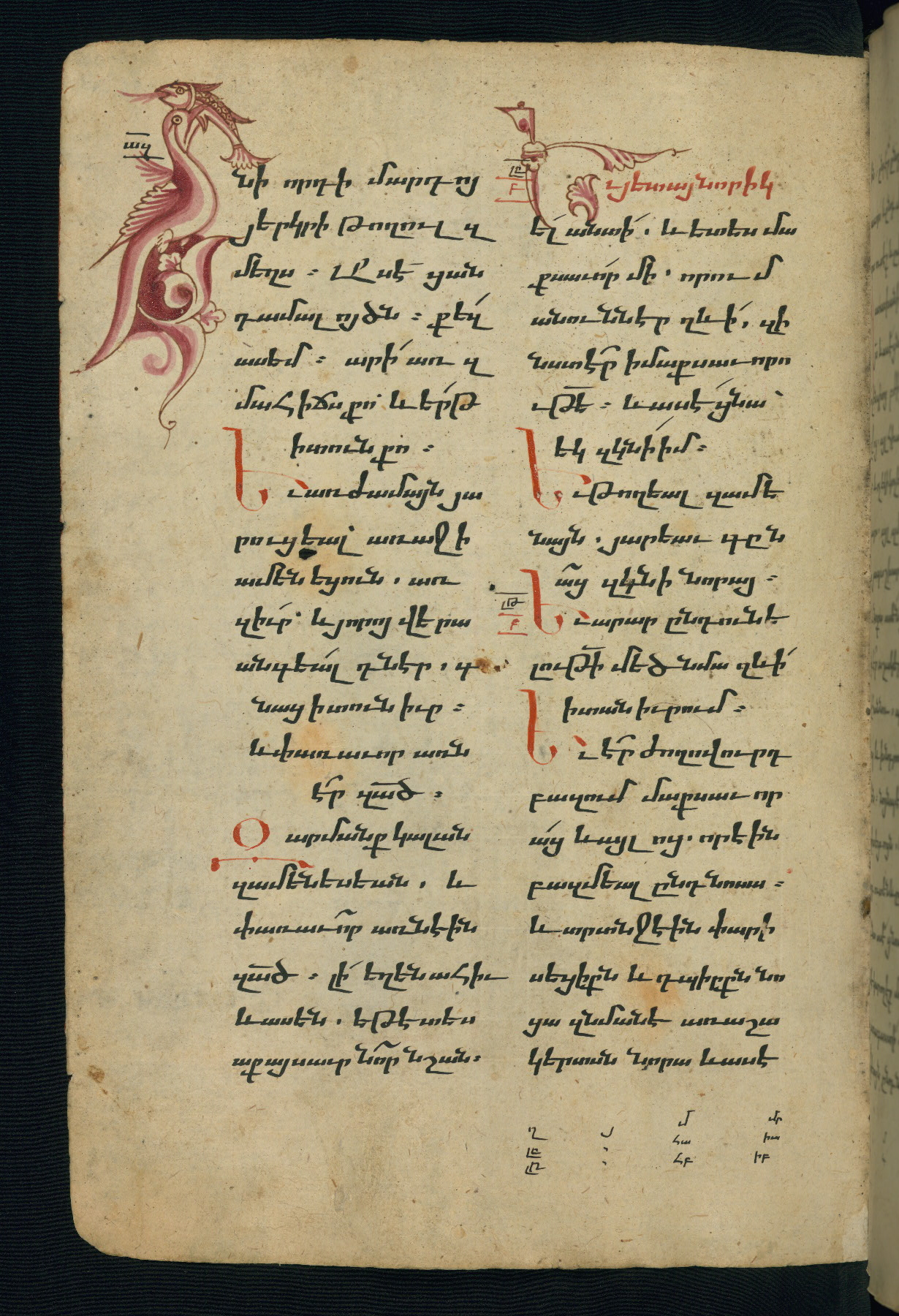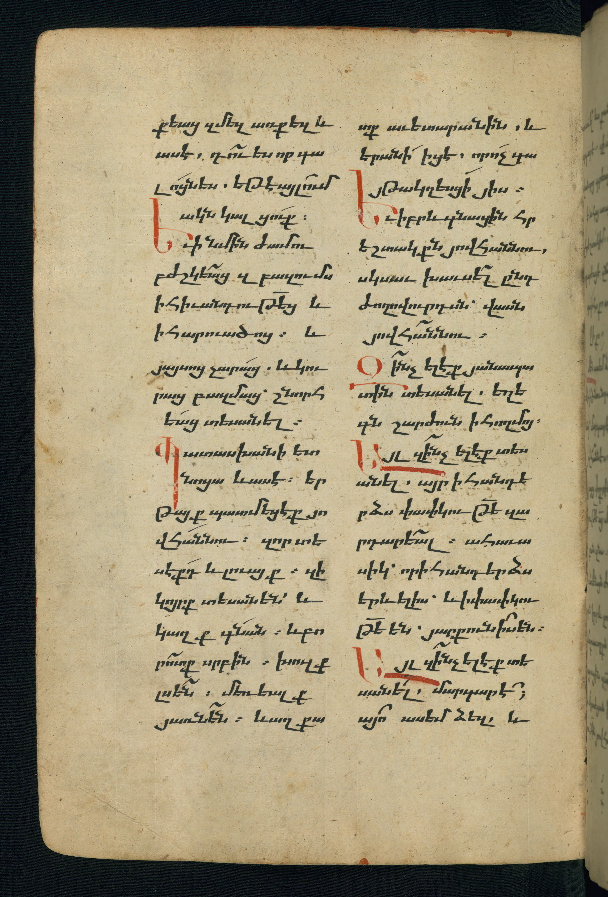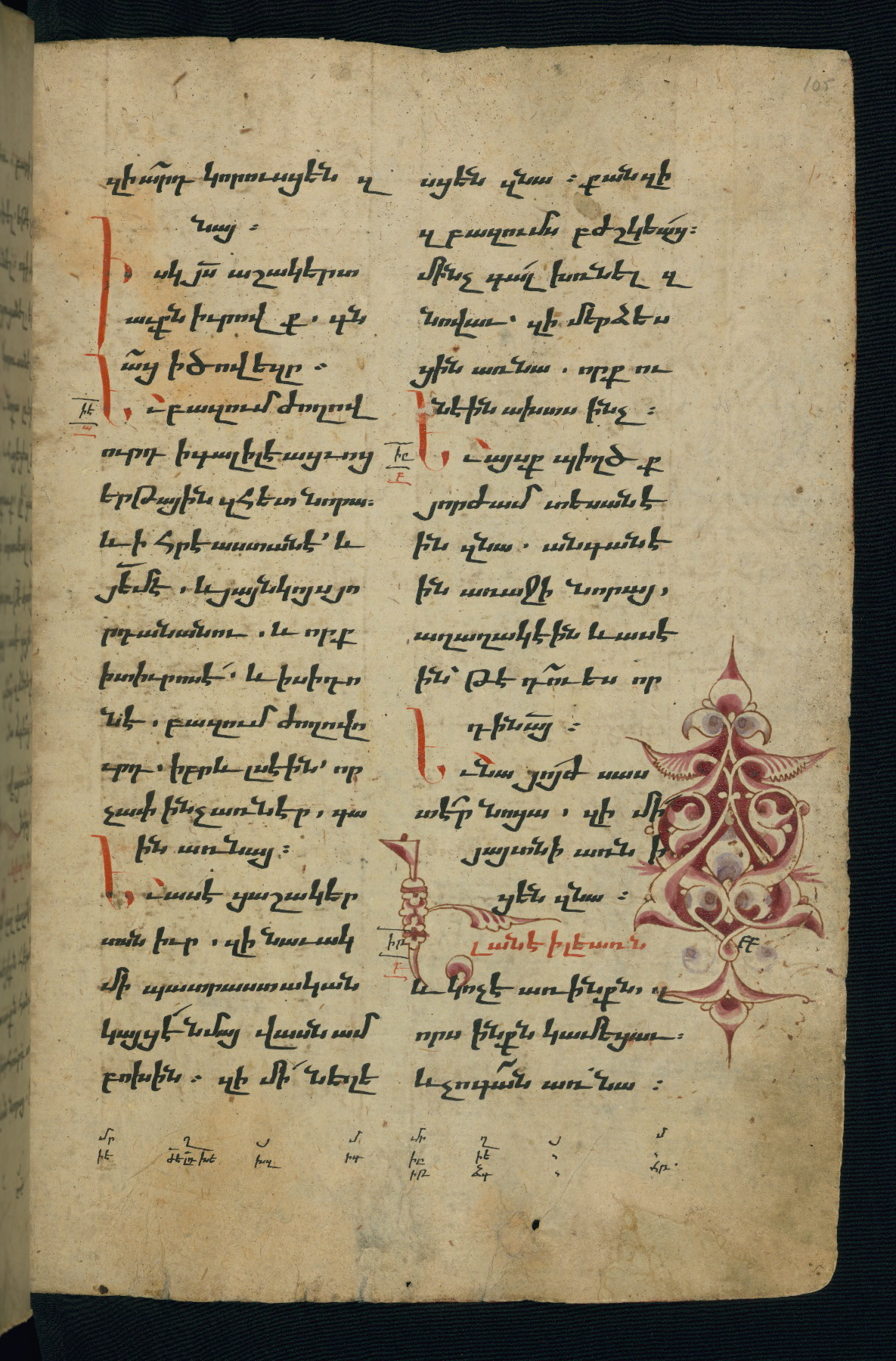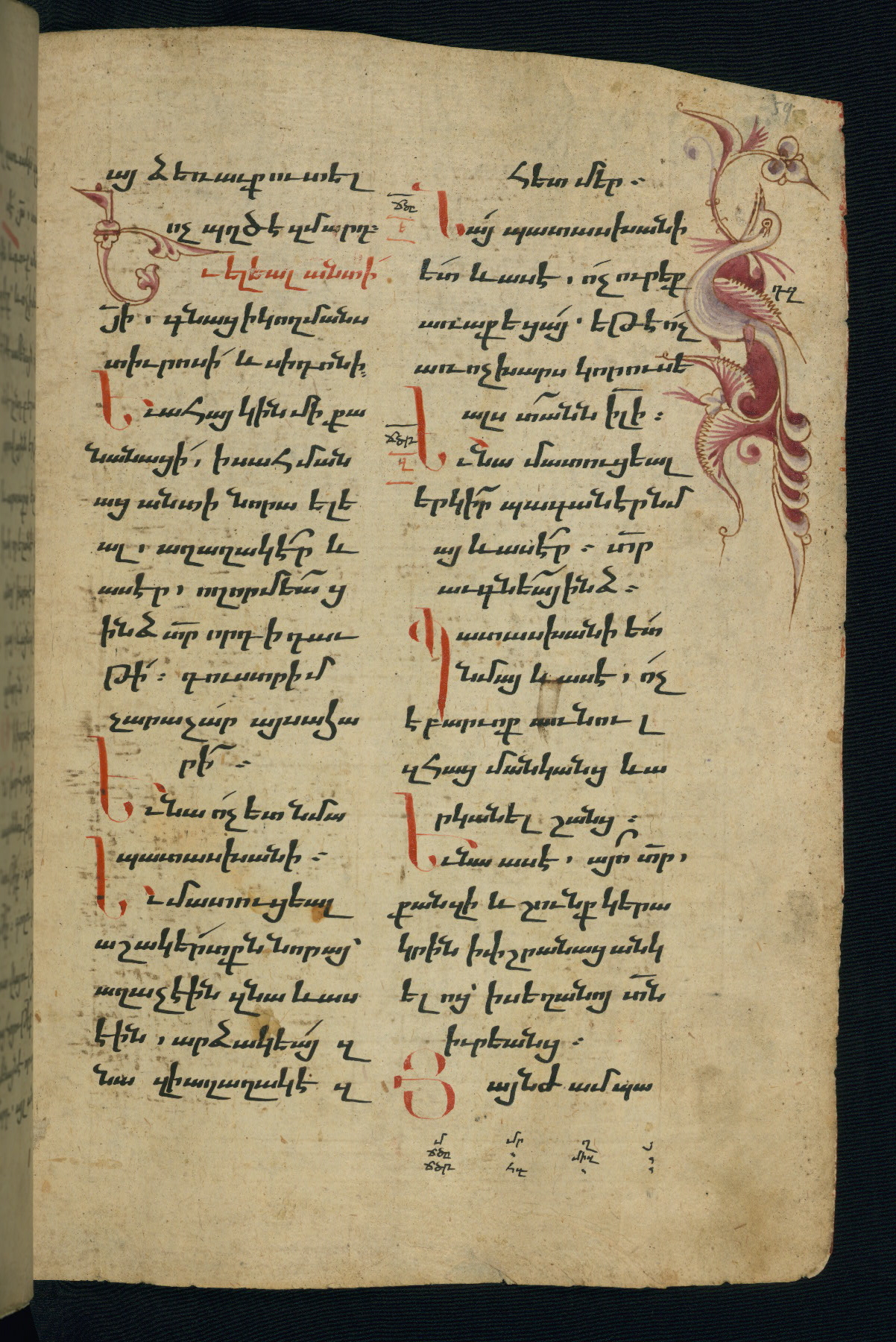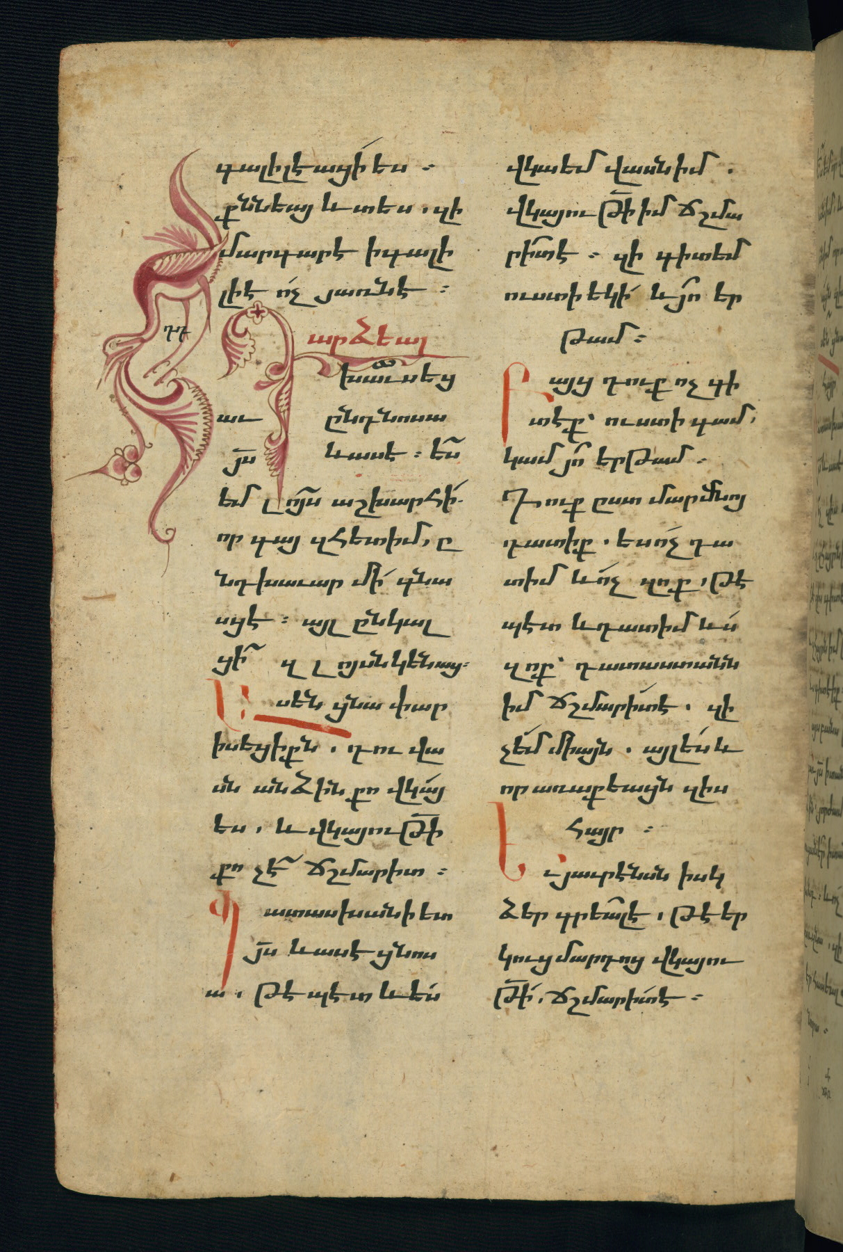 This Armenian Gospel book was produced in 904 of the Armenian era (1455 CE) at the monastery of Gamałiēl in Xizan by the scribe Yohannēs Vardapet, son of Vardan and Dilšat, and was illuminated by the priest Xačʿatur. The priest Pʿilipos commissioned the manuscript as a memorial to himself, his parents Łazar and Xutʿlumēlikʿ, and other relatives listed in the colophon on fols. 300r to 301v. Pʿilipos is depicted on fol. 14v alongside his brothers Yusēpʿ and Sultanša, as they kneel before the Virgin and Child enthroned (Theotokos). The book contains twenty-six full-page polychrome miniatures, including four Evangelist portraits; ornately designed canon tables; four decorated incipit pages; numerous marginal miniatures of floral and faunal motifs; and nineteen marginal miniatures of biblical characters or allusions to biblical narratives.
