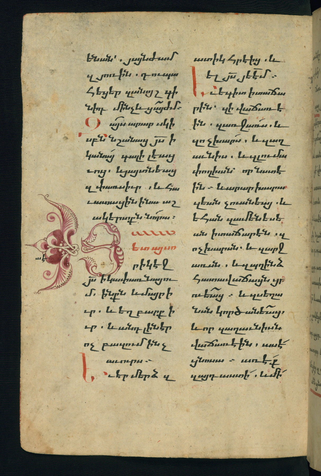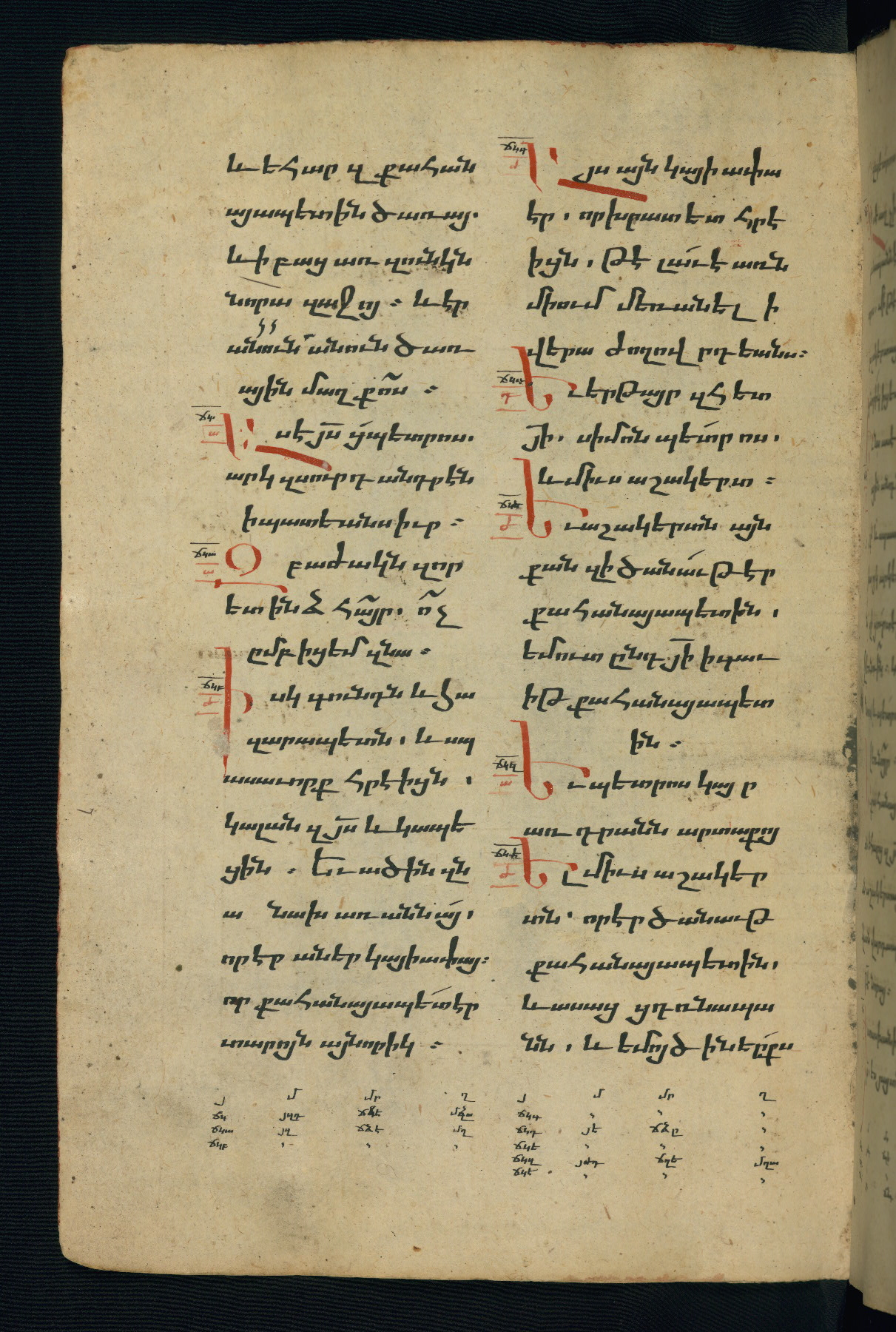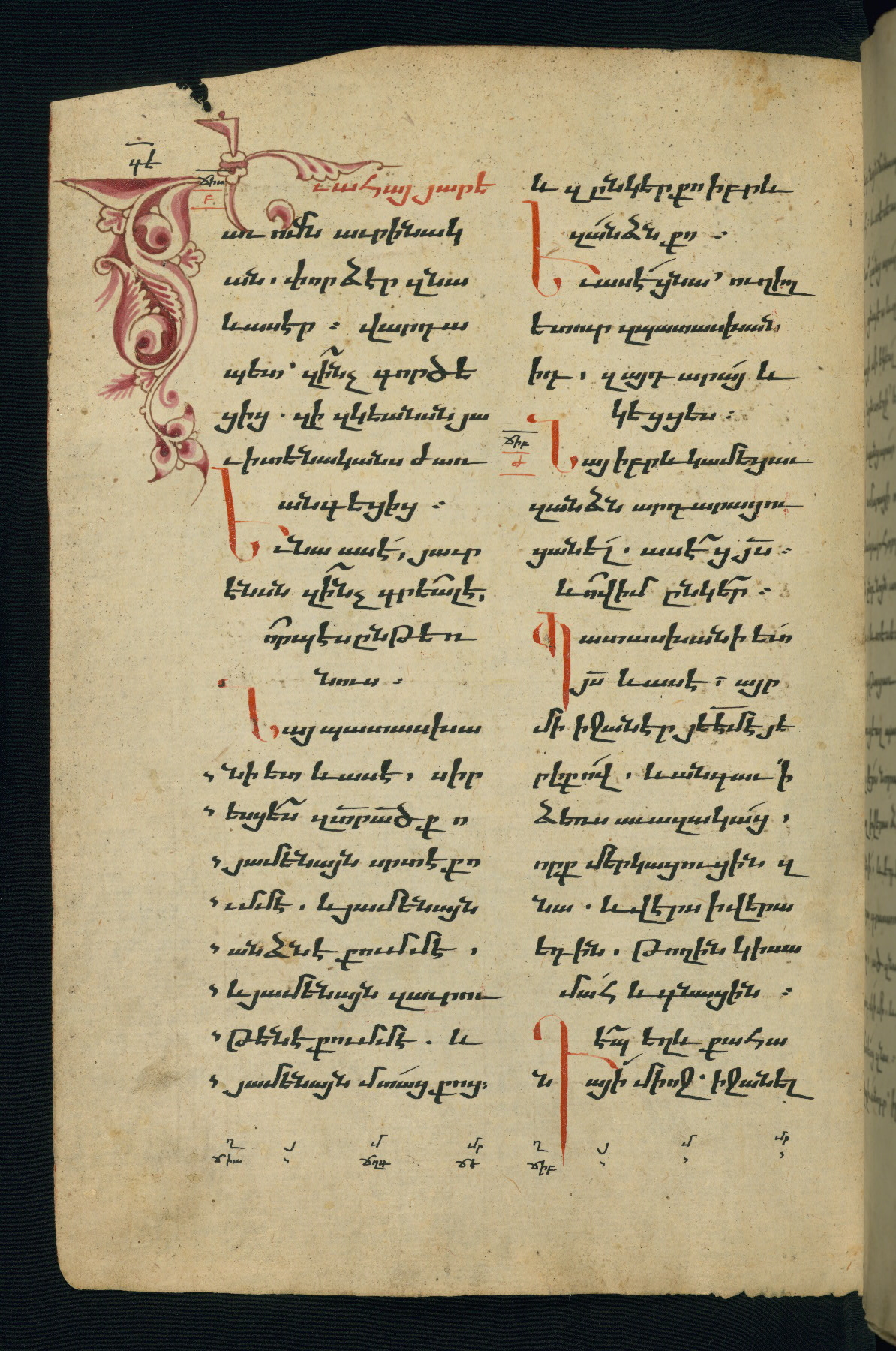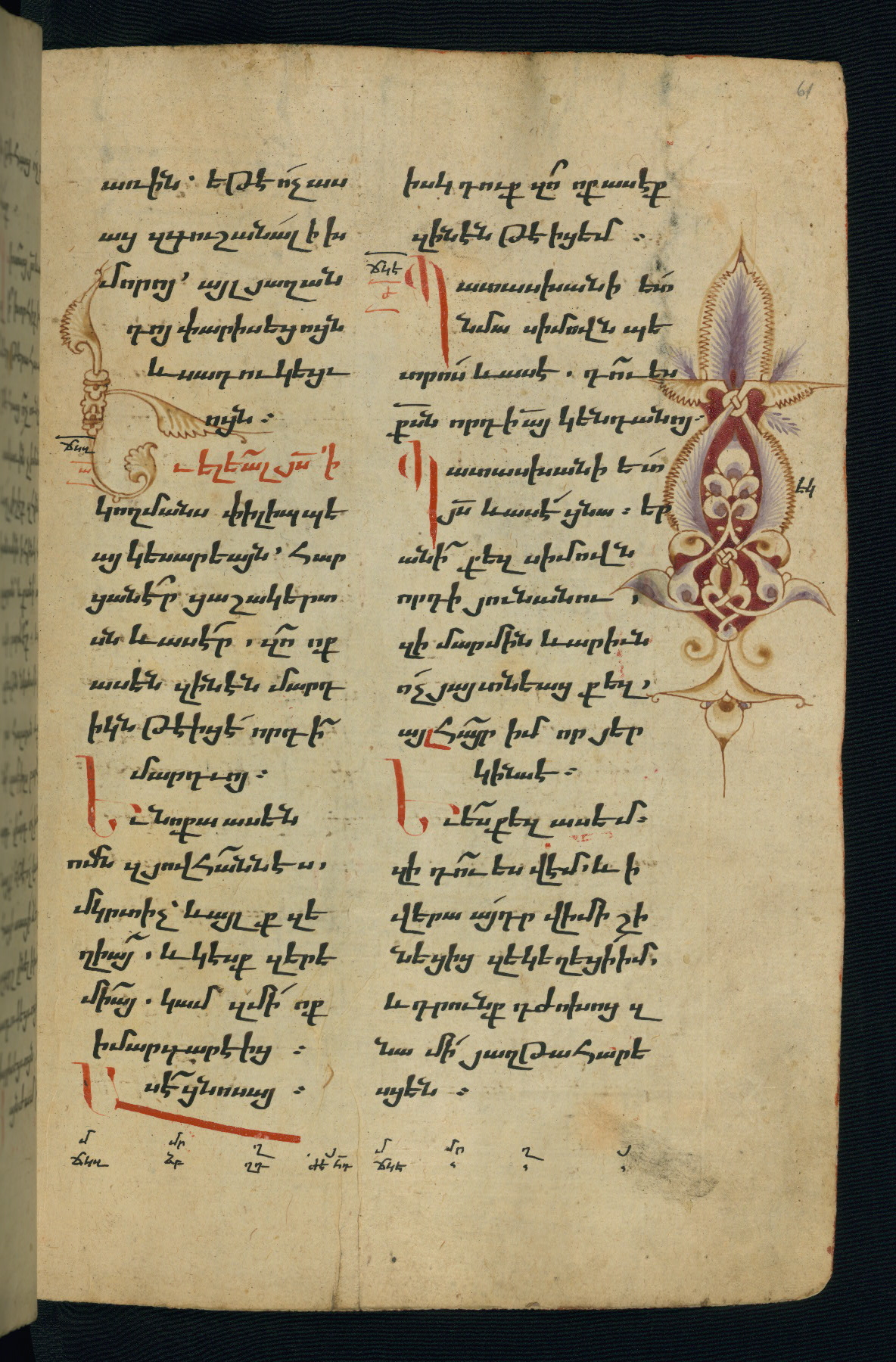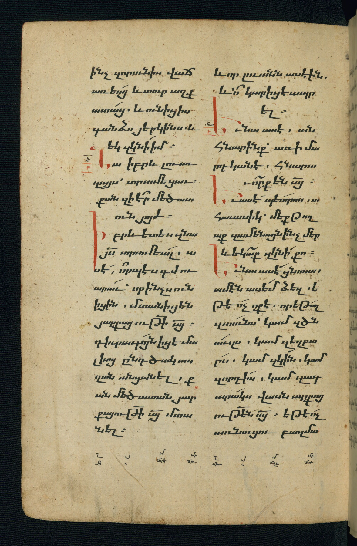 This Armenian Gospel book was produced in 904 of the Armenian era (1455 CE) at the monastery of Gamałiēl in Xizan by the scribe Yohannēs Vardapet, son of Vardan and Dilšat, and was illuminated by the priest Xačʿatur. The priest Pʿilipos commissioned the manuscript as a memorial to himself, his parents Łazar and Xutʿlumēlikʿ, and other relatives listed in the colophon on fols. 300r to 301v. Pʿilipos is depicted on fol. 14v alongside his brothers Yusēpʿ and Sultanša, as they kneel before the Virgin and Child enthroned (Theotokos). The book contains twenty-six full-page polychrome miniatures, including four Evangelist portraits; ornately designed canon tables; four decorated incipit pages; numerous marginal miniatures of floral and faunal motifs; and nineteen marginal miniatures of biblical characters or allusions to biblical narratives.