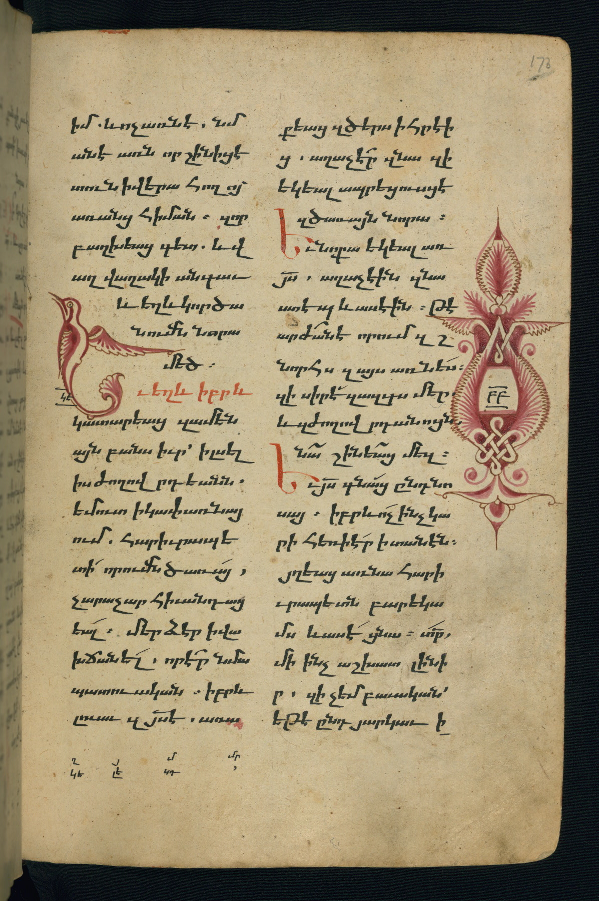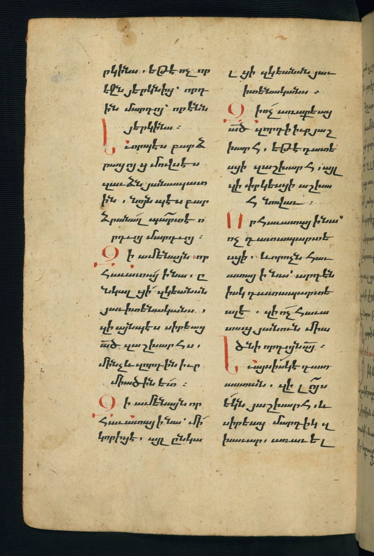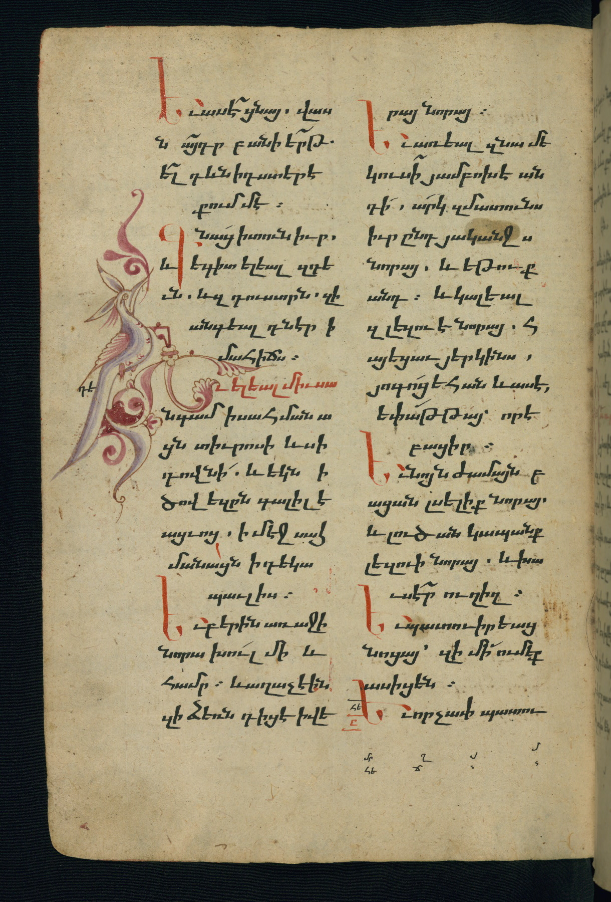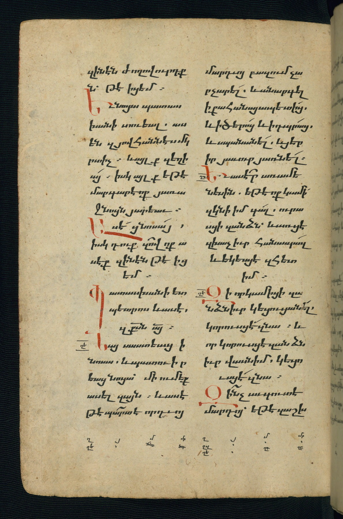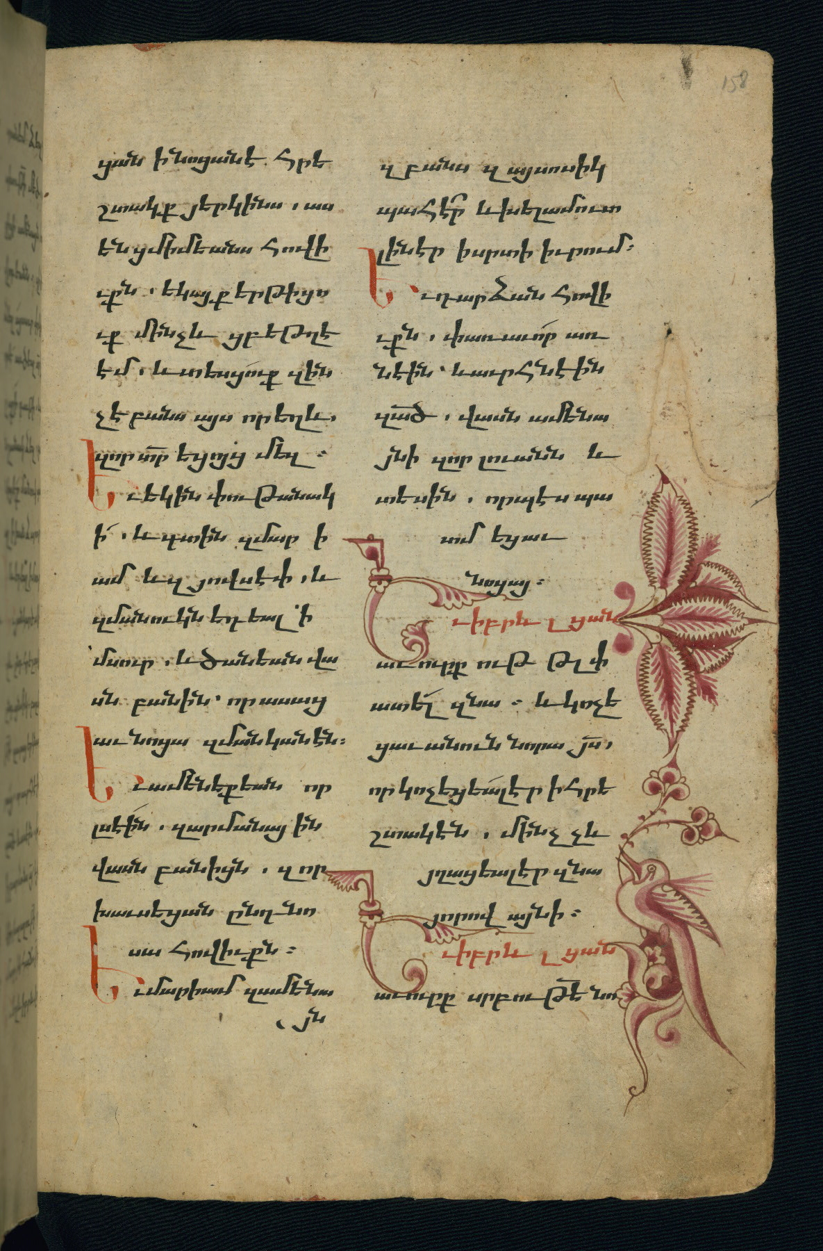 This Armenian Gospel book was produced in 904 of the Armenian era (1455 CE) at the monastery of Gamałiēl in Xizan by the scribe Yohannēs Vardapet, son of Vardan and Dilšat, and was illuminated by the priest Xačʿatur. The priest Pʿilipos commissioned the manuscript as a memorial to himself, his parents Łazar and Xutʿlumēlikʿ, and other relatives listed in the colophon on fols. 300r to 301v. Pʿilipos is depicted on fol. 14v alongside his brothers Yusēpʿ and Sultanša, as they kneel before the Virgin and Child enthroned (Theotokos). The book contains twenty-six full-page polychrome miniatures, including four Evangelist portraits; ornately designed canon tables; four decorated incipit pages; numerous marginal miniatures of floral and faunal motifs; and nineteen marginal miniatures of biblical characters or allusions to biblical narratives.