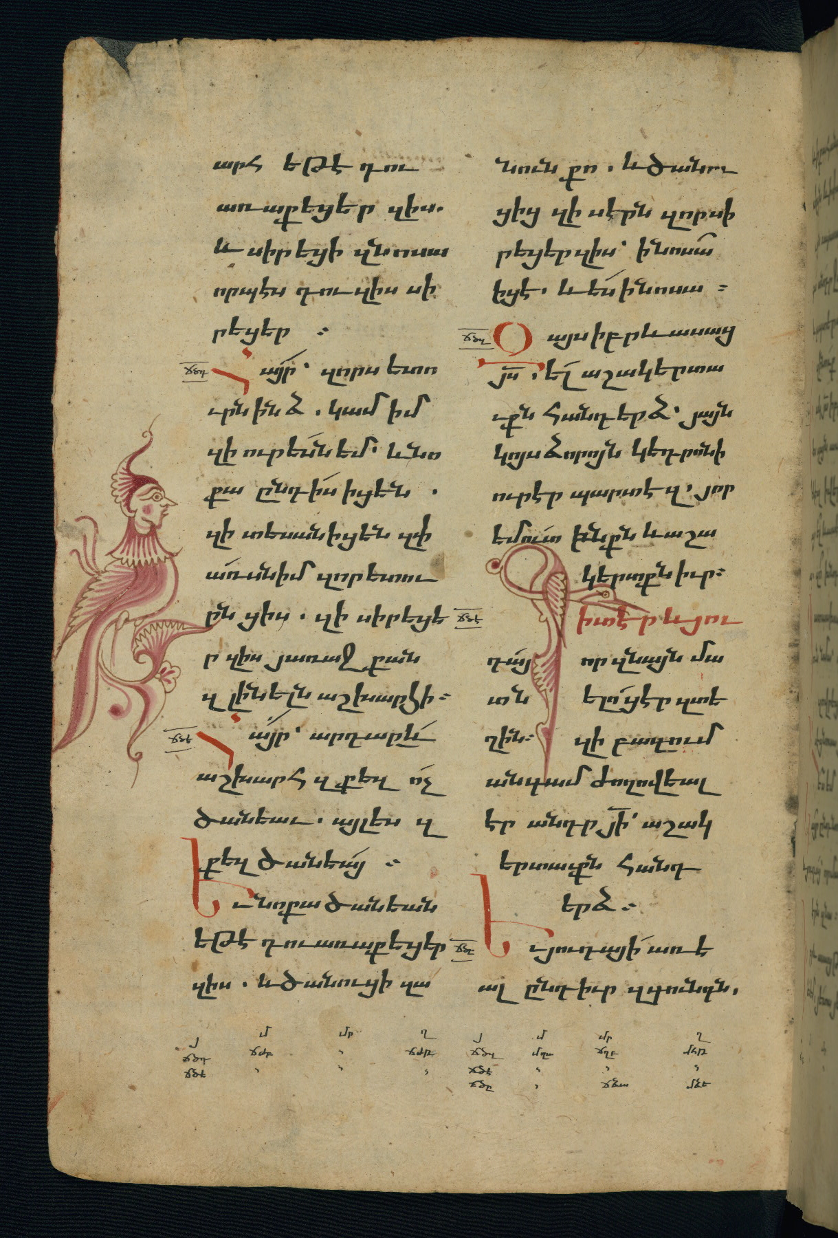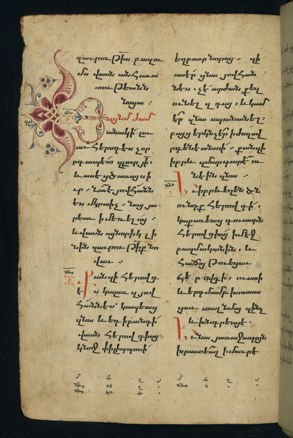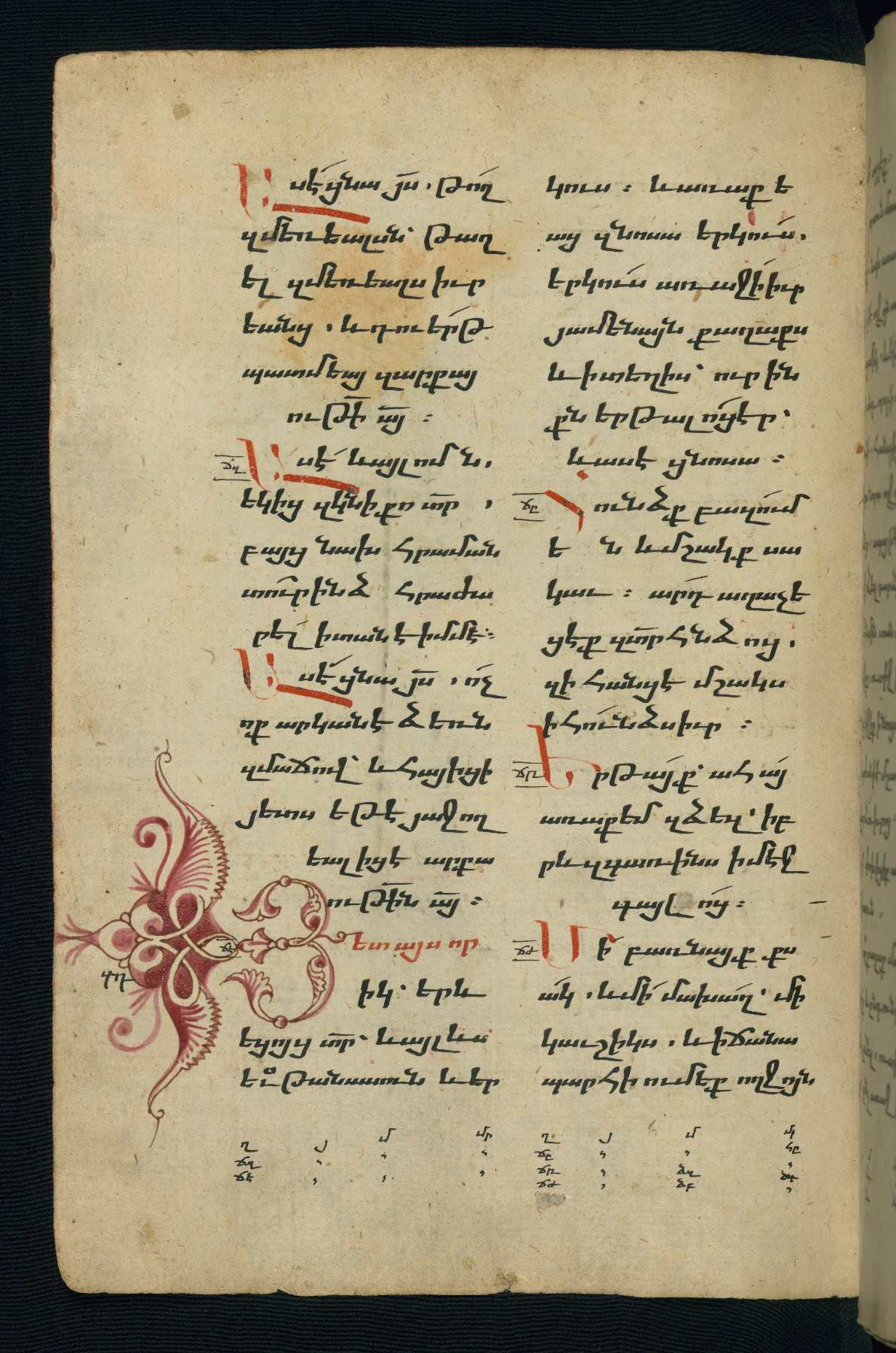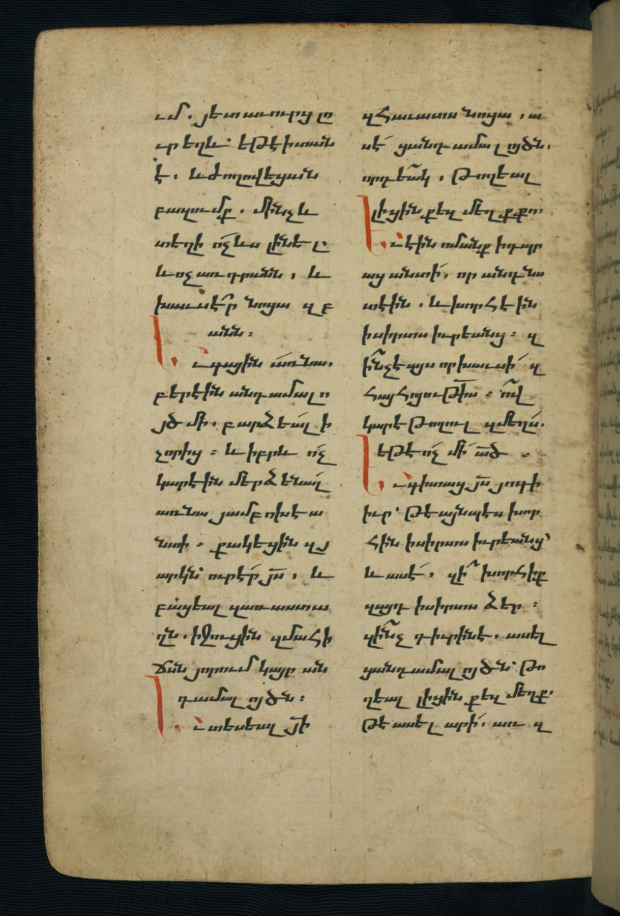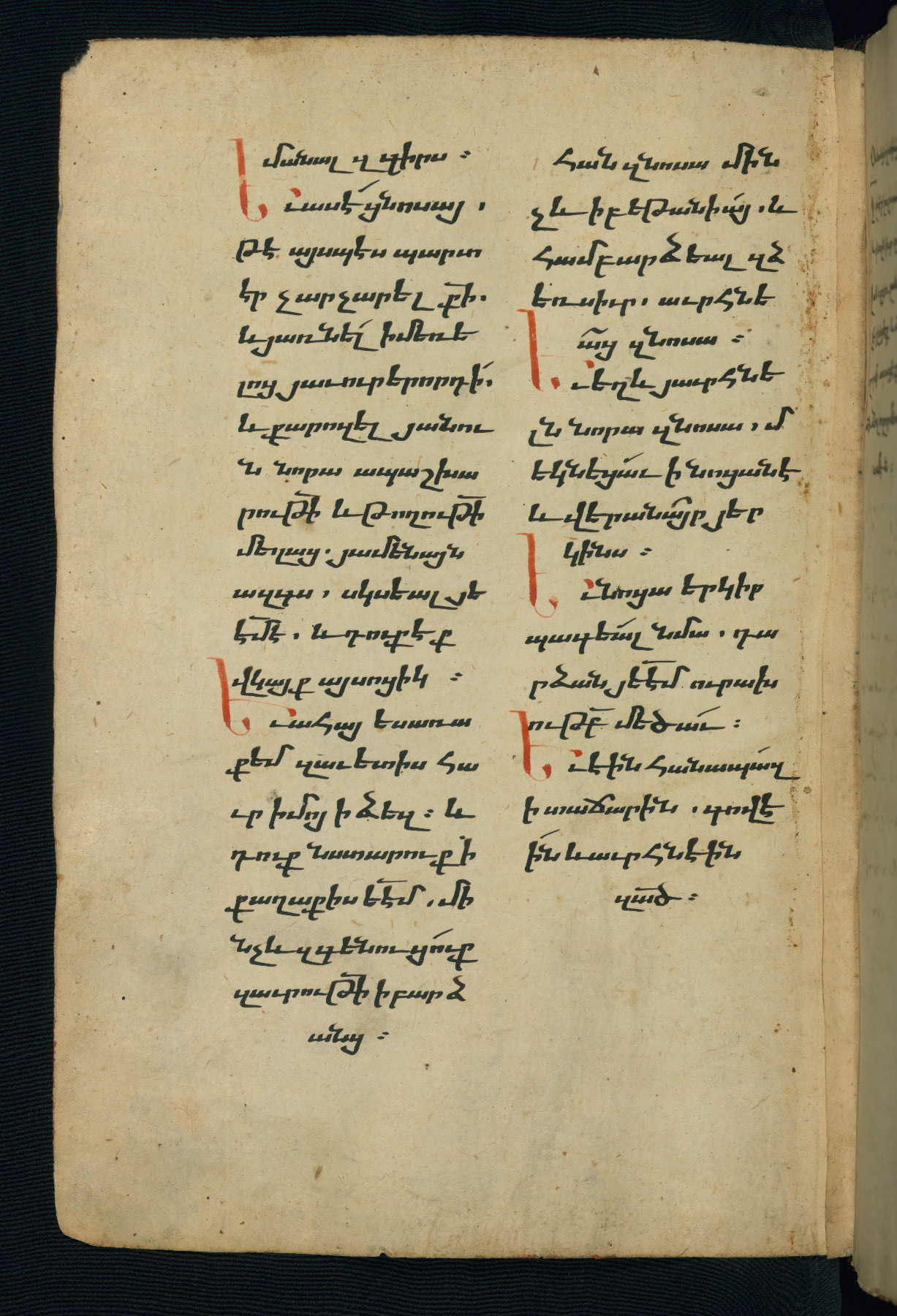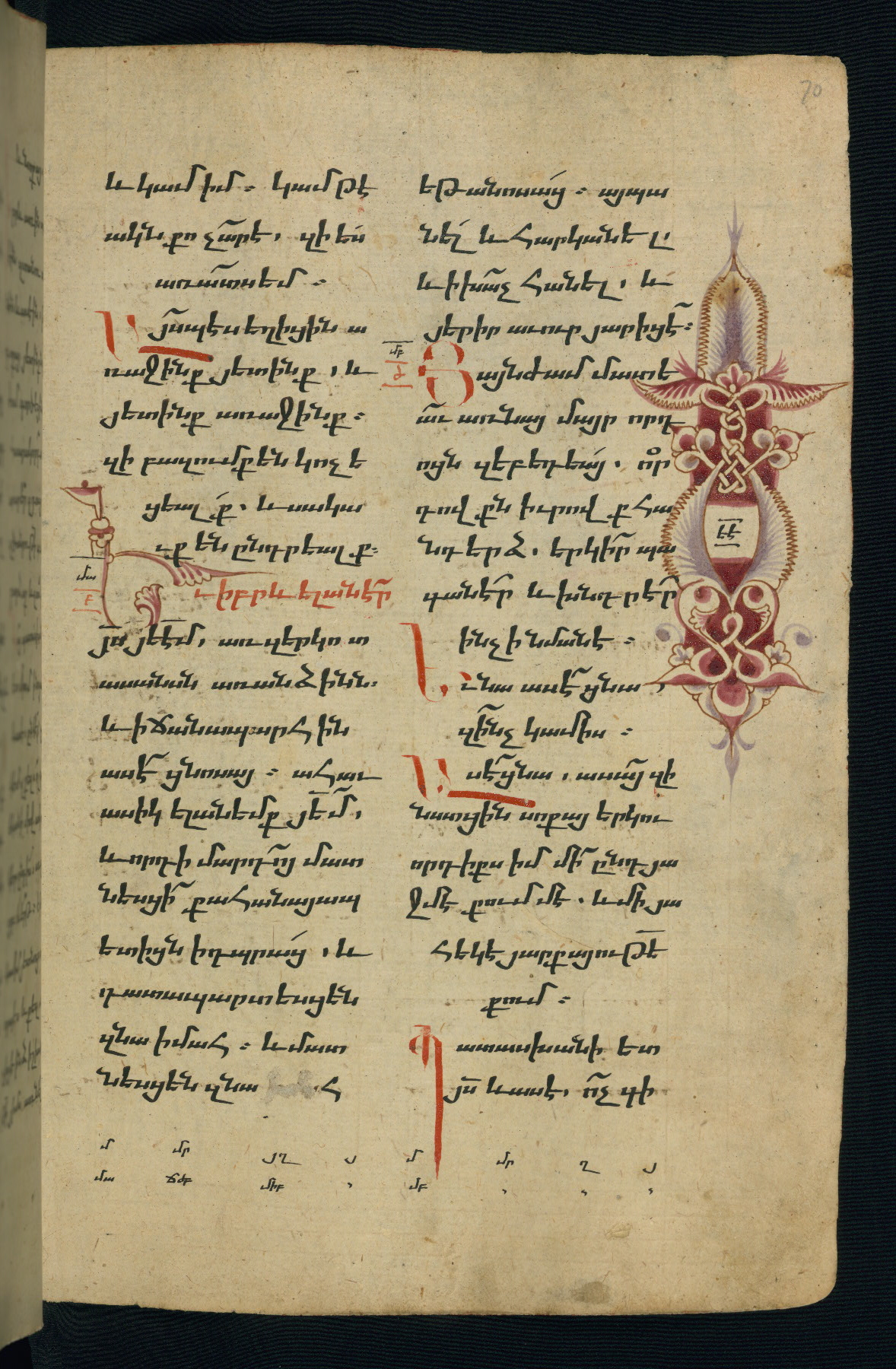 This Armenian Gospel book was produced in 904 of the Armenian era (1455 CE) at the monastery of Gamałiēl in Xizan by the scribe Yohannēs Vardapet, son of Vardan and Dilšat, and was illuminated by the priest Xačʿatur. The priest Pʿilipos commissioned the manuscript as a memorial to himself, his parents Łazar and Xutʿlumēlikʿ, and other relatives listed in the colophon on fols. 300r to 301v. Pʿilipos is depicted on fol. 14v alongside his brothers Yusēpʿ and Sultanša, as they kneel before the Virgin and Child enthroned (Theotokos). The book contains twenty-six full-page polychrome miniatures, including four Evangelist portraits; ornately designed canon tables; four decorated incipit pages; numerous marginal miniatures of floral and faunal motifs; and nineteen marginal miniatures of biblical characters or allusions to biblical narratives.