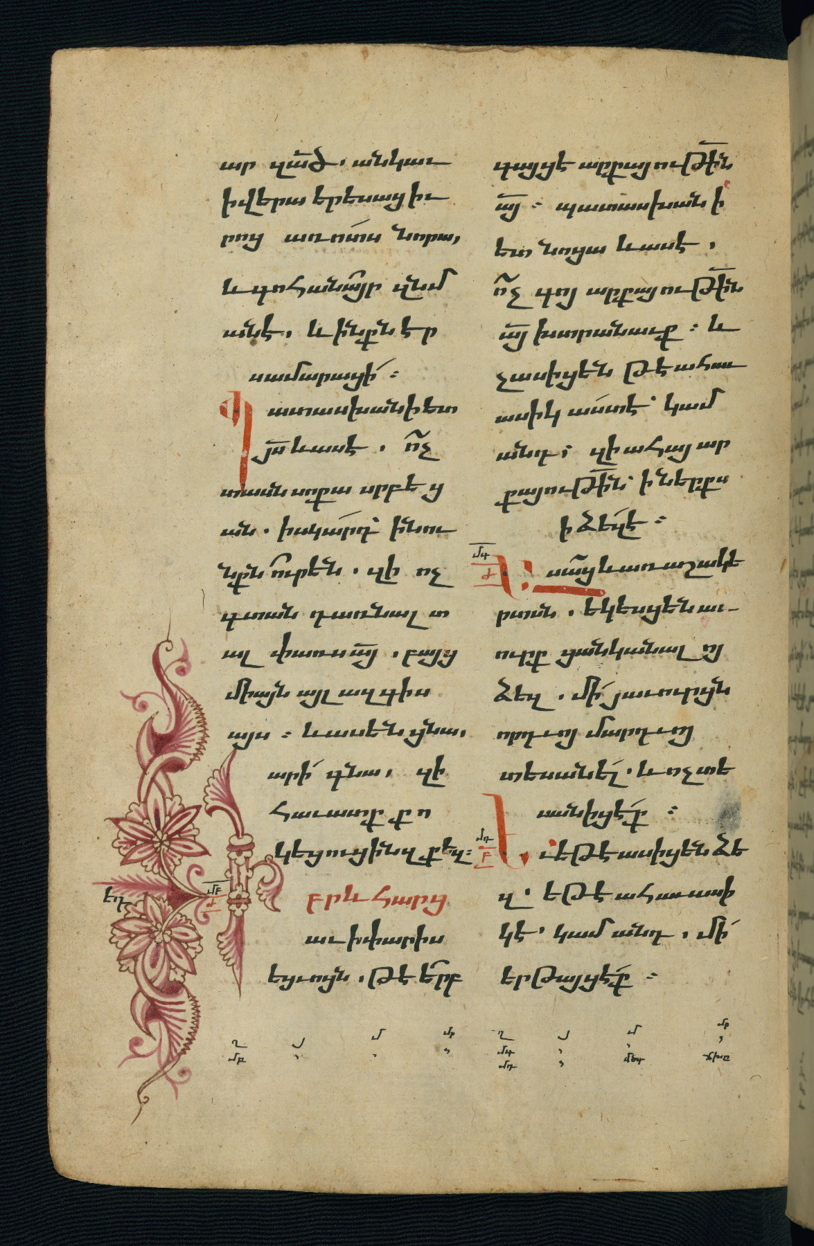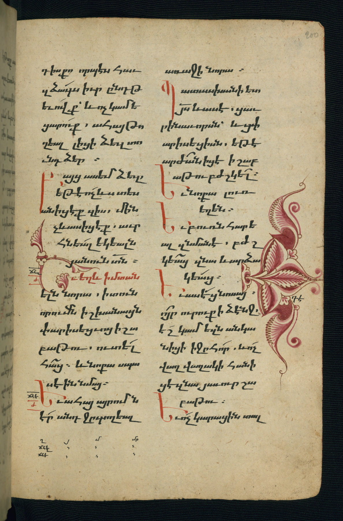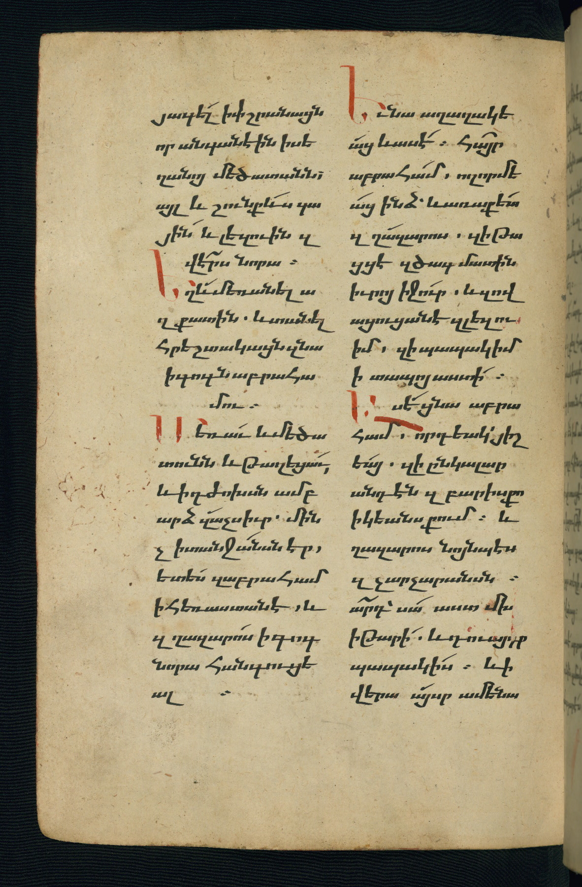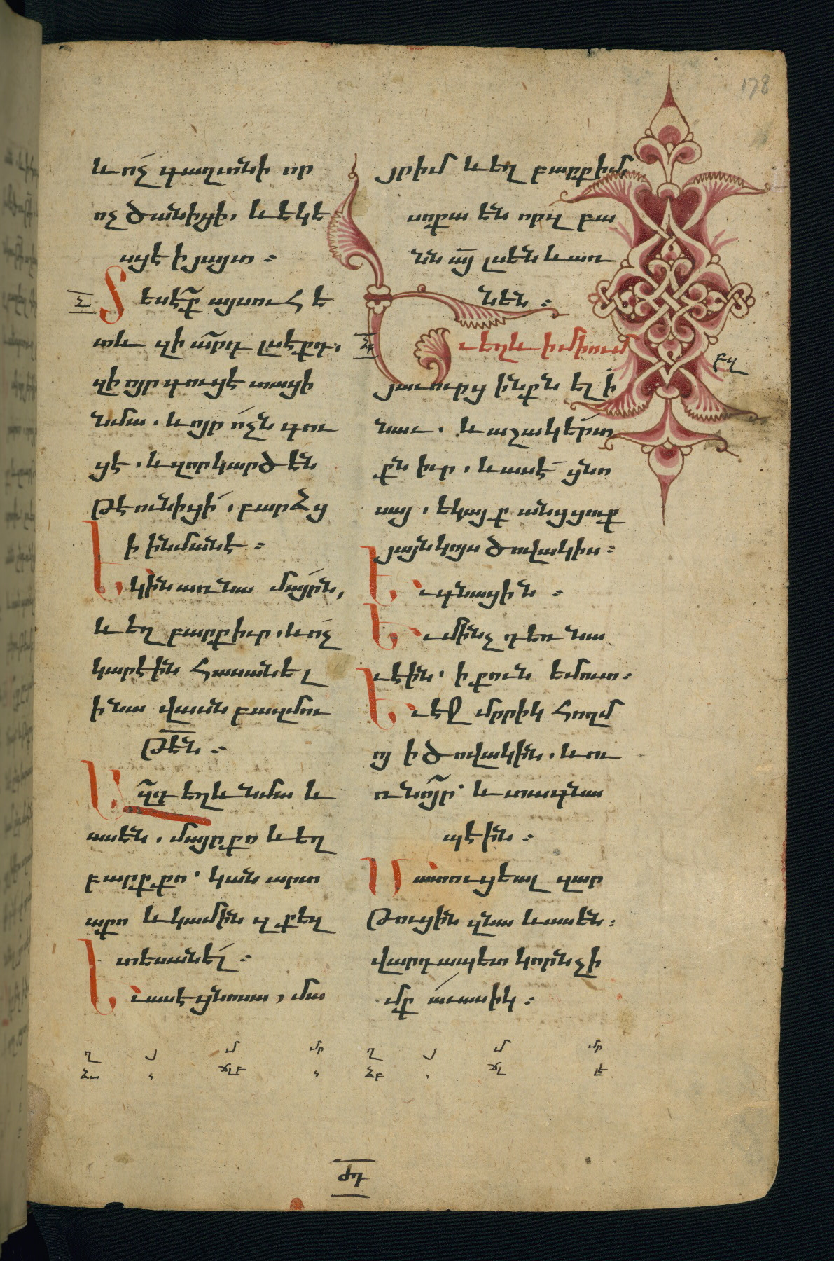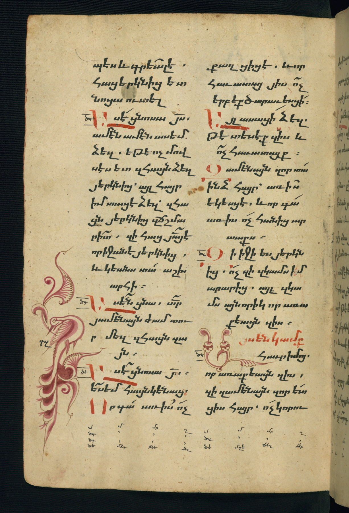 This Armenian Gospel book was produced in 904 of the Armenian era (1455 CE) at the monastery of Gamałiēl in Xizan by the scribe Yohannēs Vardapet, son of Vardan and Dilšat, and was illuminated by the priest Xačʿatur. The priest Pʿilipos commissioned the manuscript as a memorial to himself, his parents Łazar and Xutʿlumēlikʿ, and other relatives listed in the colophon on fols. 300r to 301v. Pʿilipos is depicted on fol. 14v alongside his brothers Yusēpʿ and Sultanša, as they kneel before the Virgin and Child enthroned (Theotokos). The book contains twenty-six full-page polychrome miniatures, including four Evangelist portraits; ornately designed canon tables; four decorated incipit pages; numerous marginal miniatures of floral and faunal motifs; and nineteen marginal miniatures of biblical characters or allusions to biblical narratives.
